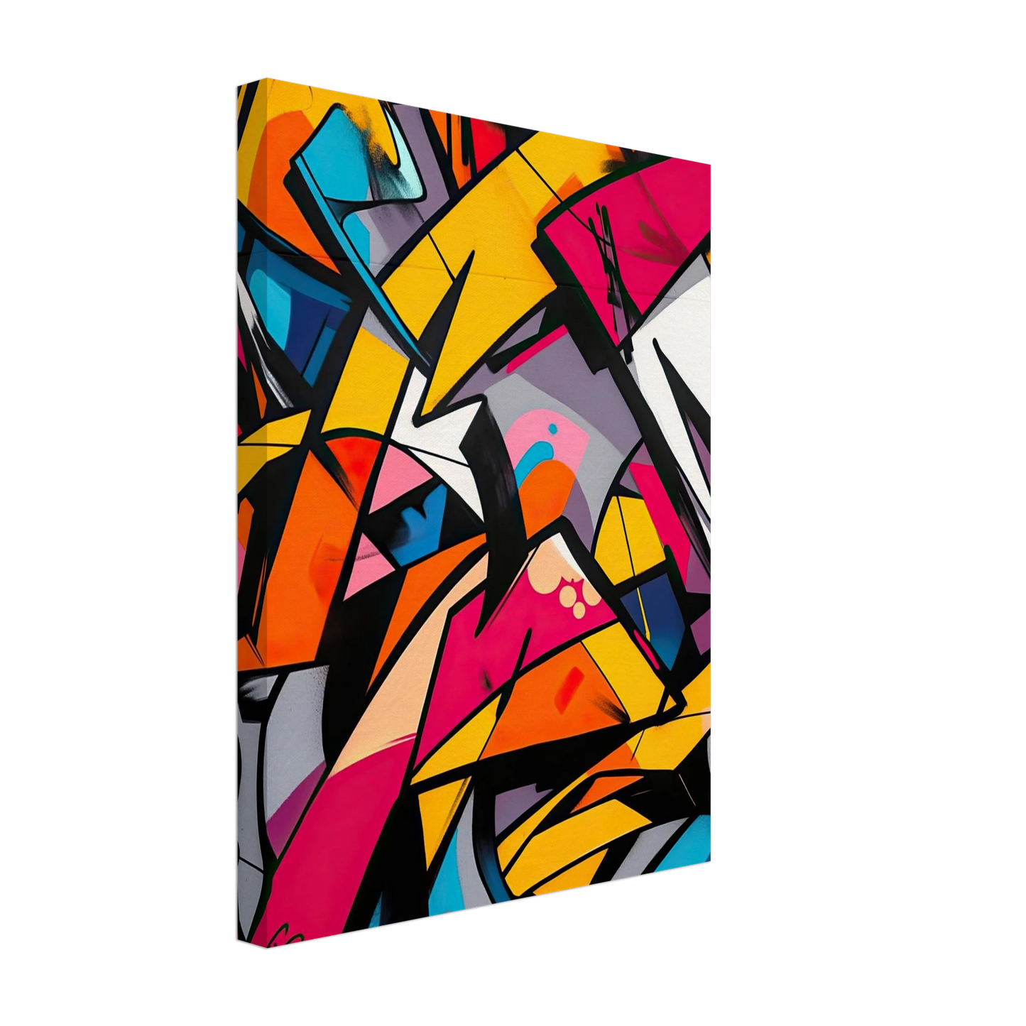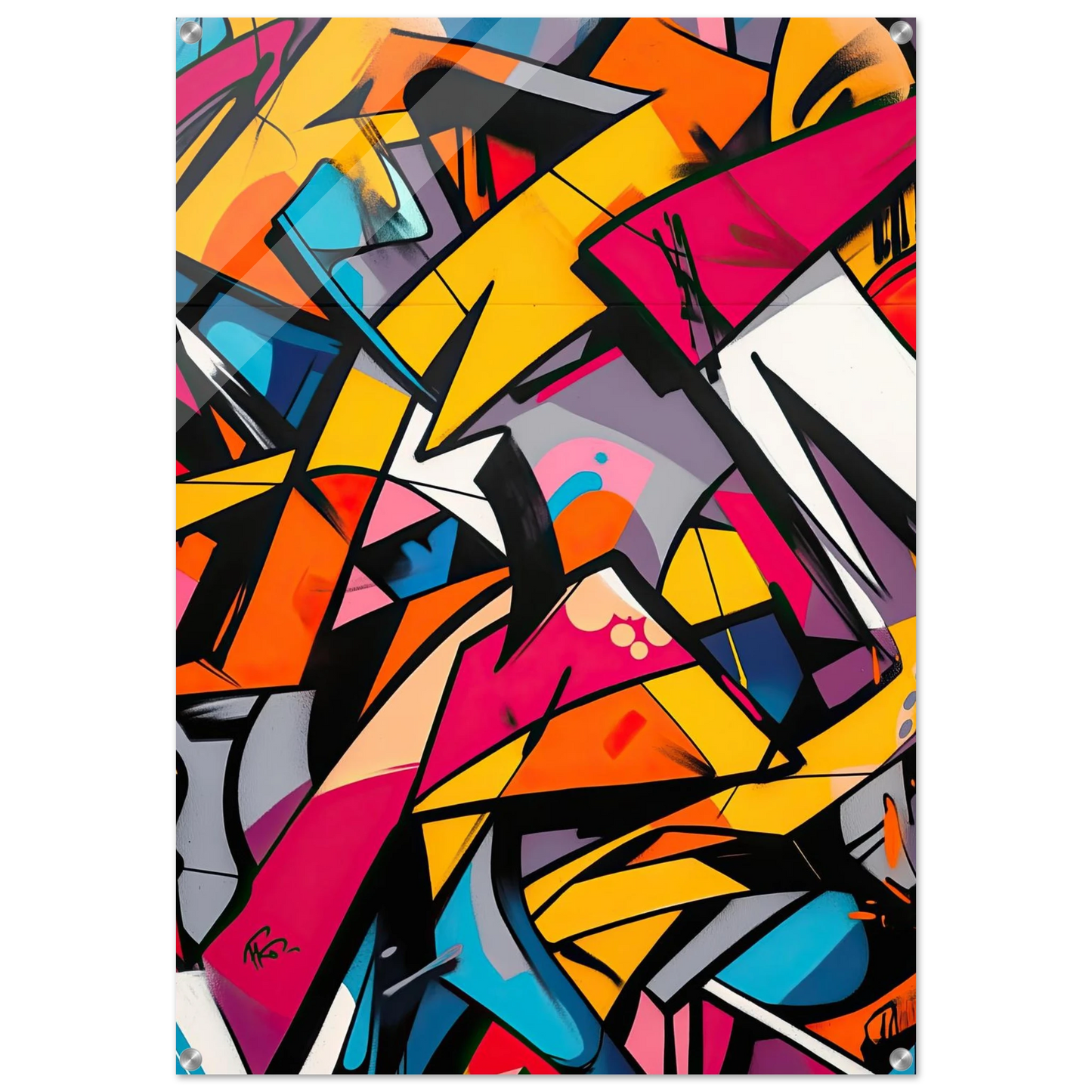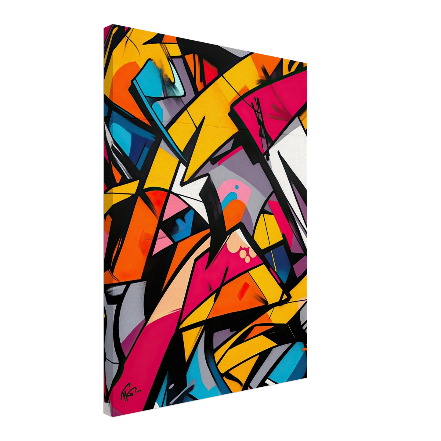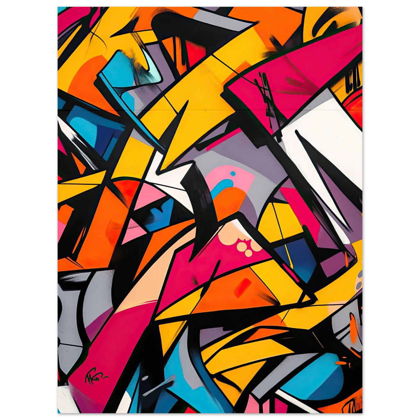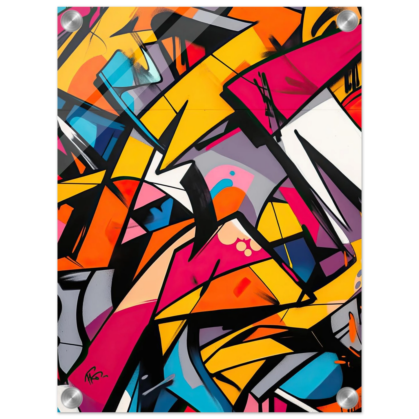 Et energisk og eksplosivt street art-verk fylt med skarpe linjer, kontrastfarger og urbane rytmer. De sterke oransje, rosa og blåtonene kolliderer i en kaotisk harmoni som symboliserer bylivets puls og kreativ frihet. Perfekt for å tilføre et rom attitude, fargerik dynamikk og moderne kunstnerisk uttrykk.