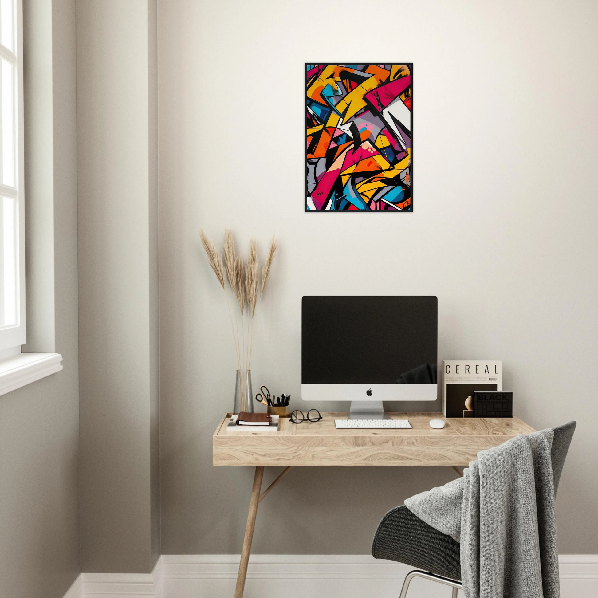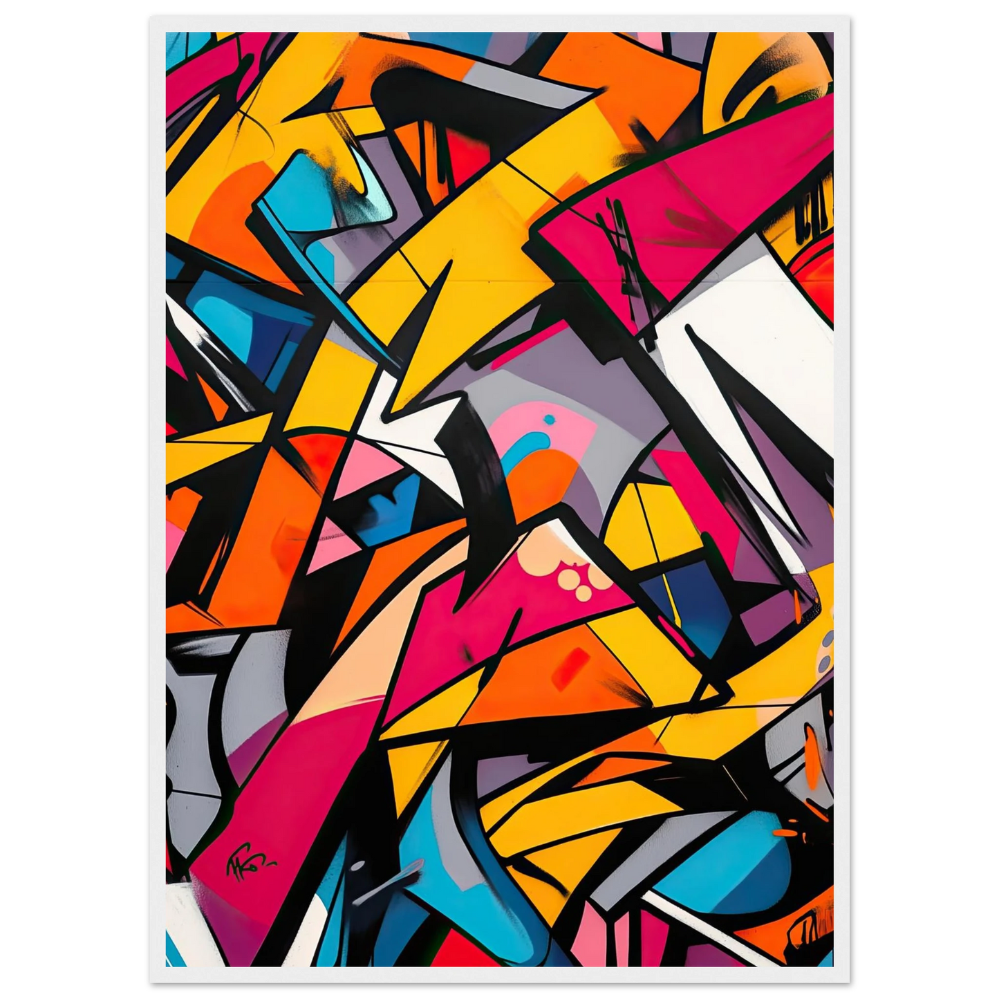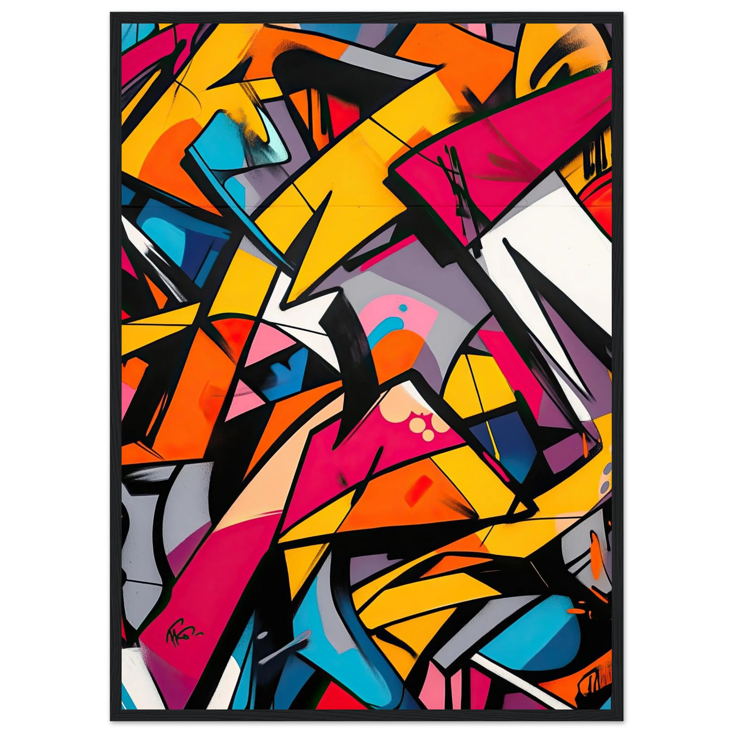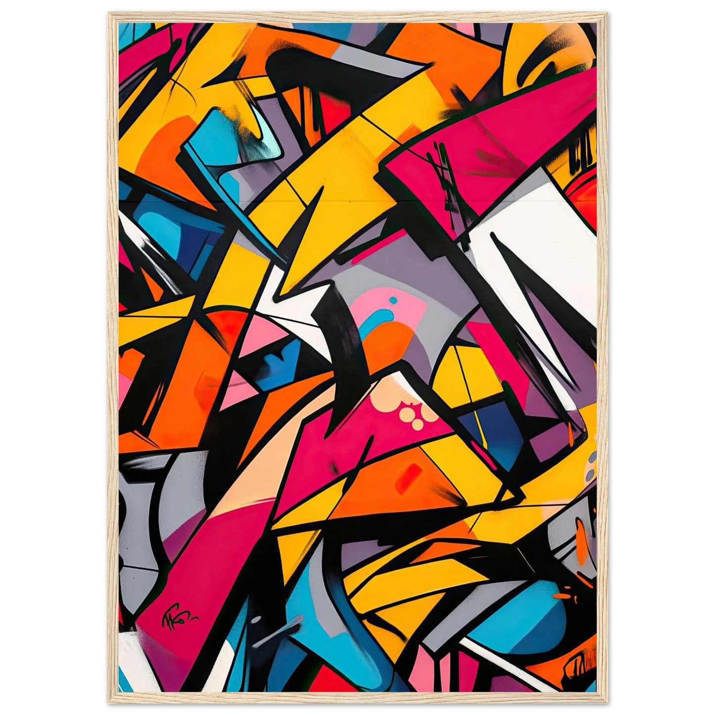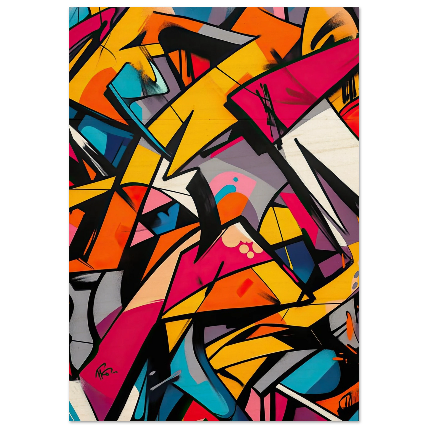 Et energisk og eksplosivt street art-verk fylt med skarpe linjer, kontrastfarger og urbane rytmer. De sterke oransje, rosa og blåtonene kolliderer i en kaotisk harmoni som symboliserer bylivets puls og kreativ frihet. Perfekt for å tilføre et rom attitude, fargerik dynamikk og moderne kunstnerisk uttrykk.