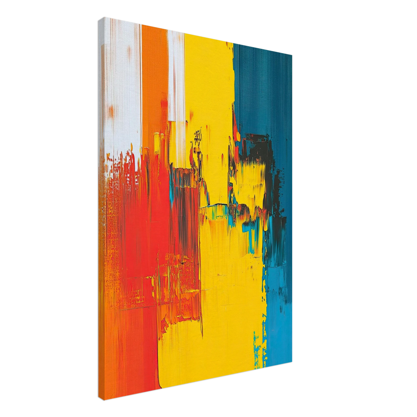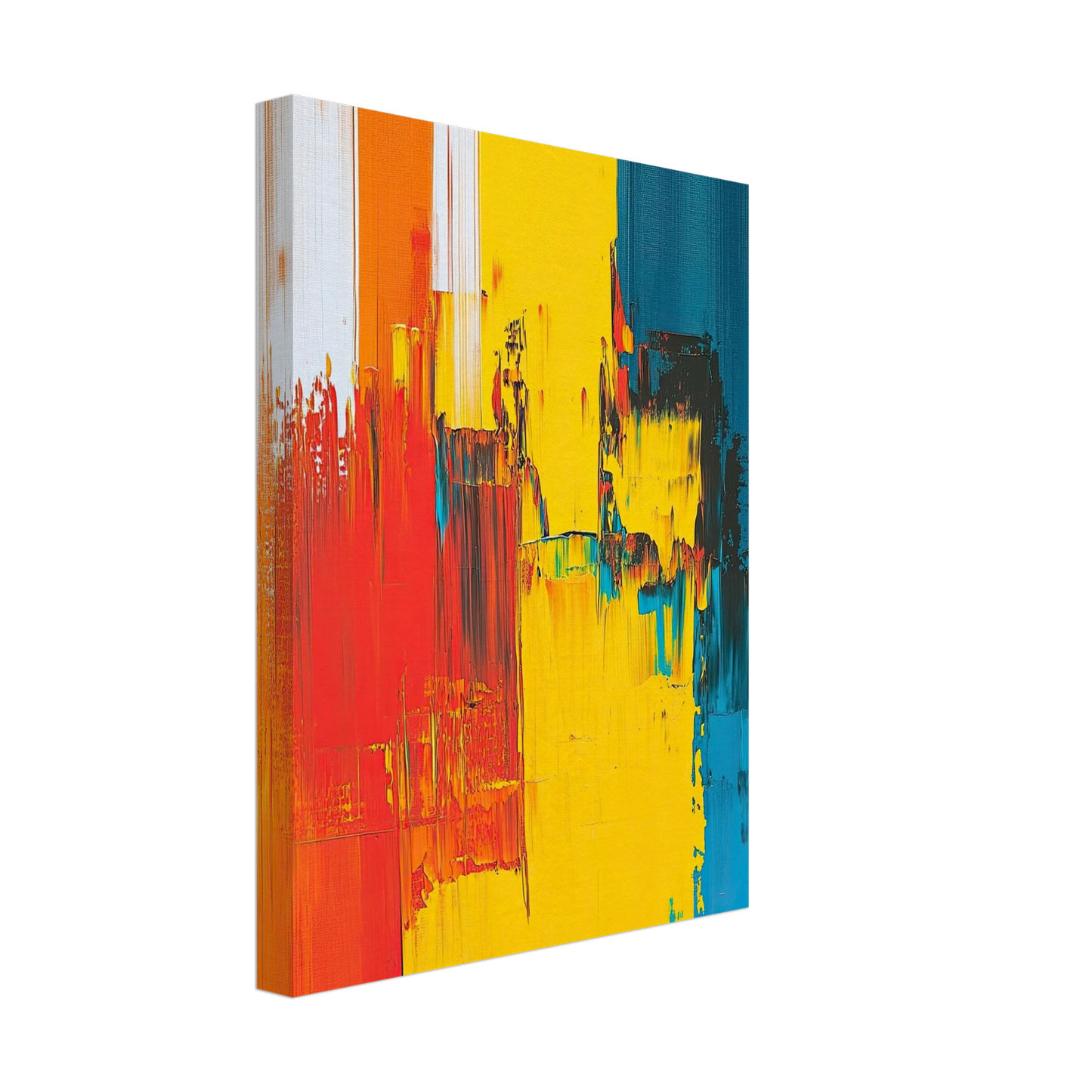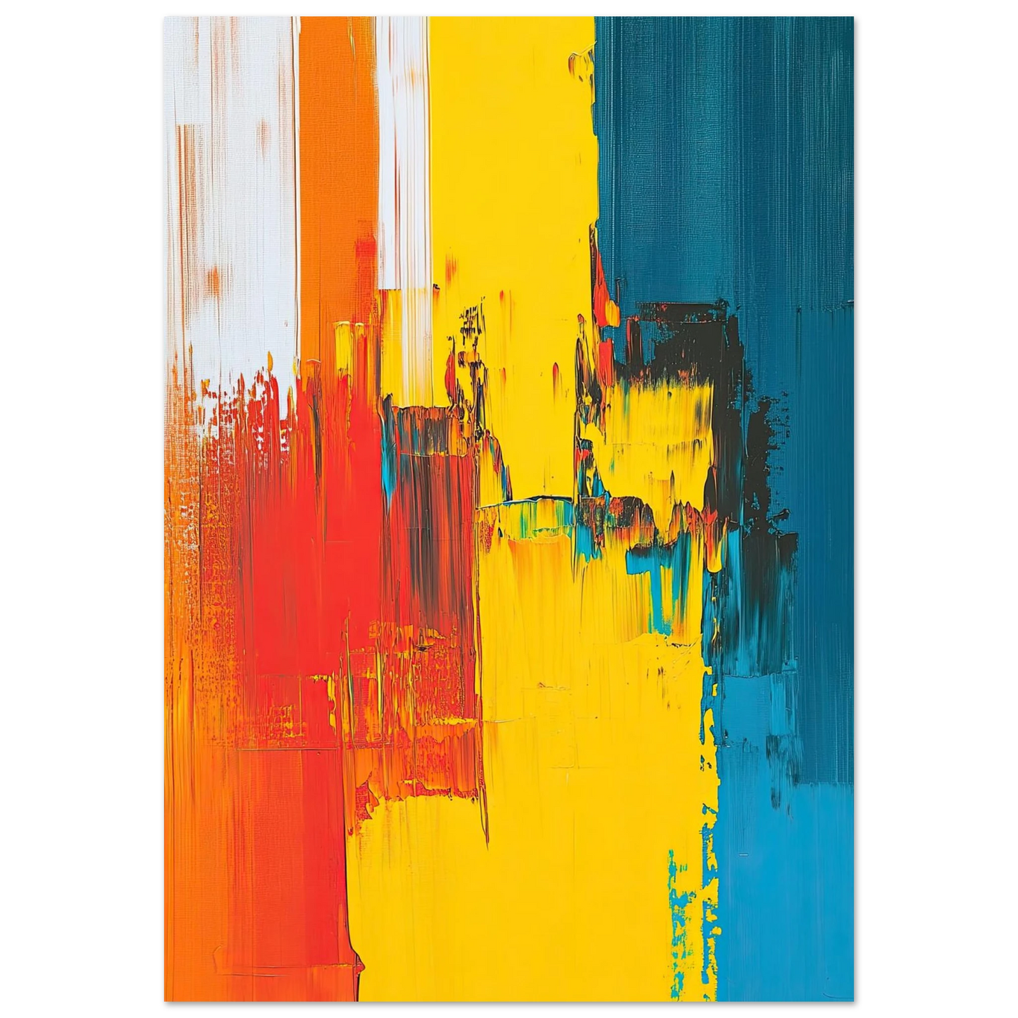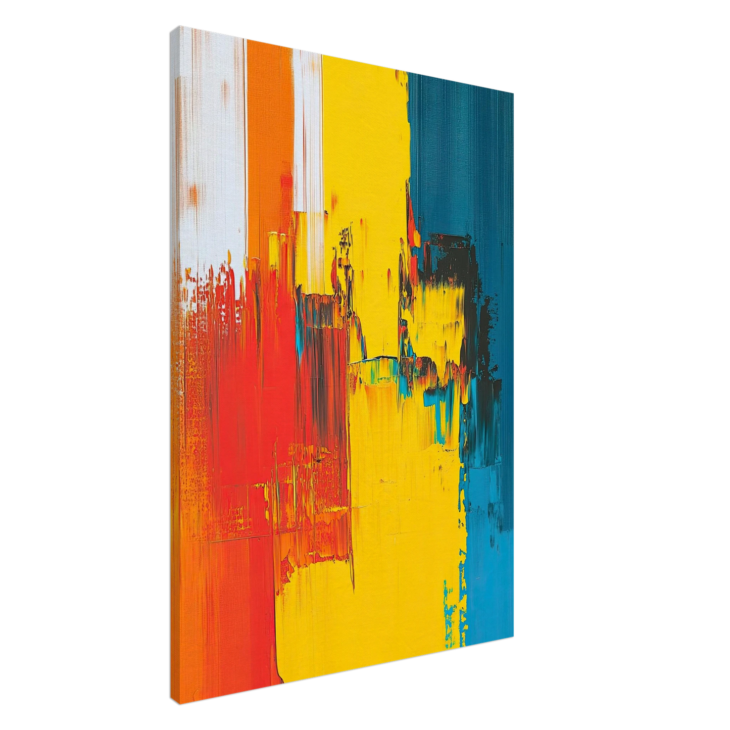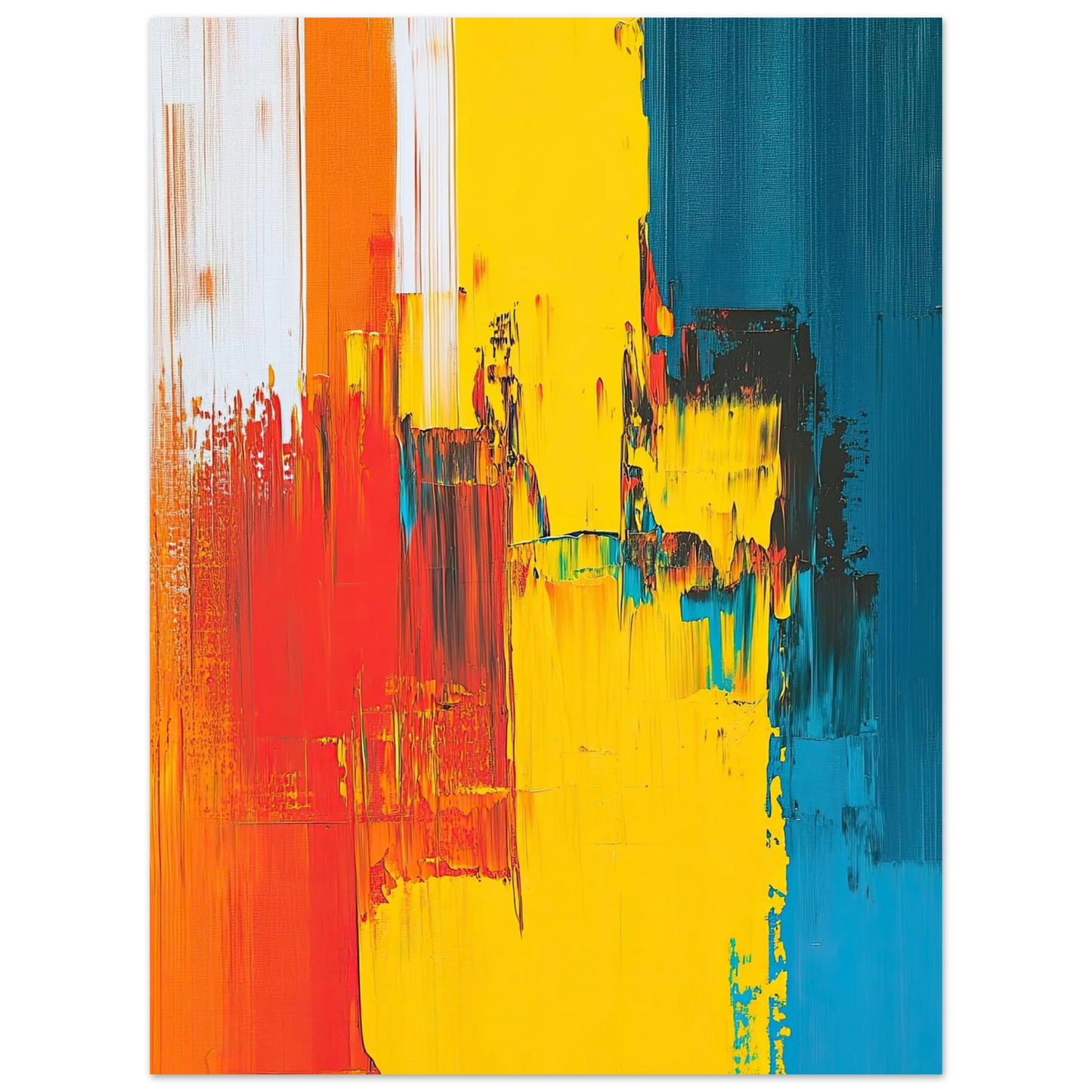 Et moderne og kraftfullt uttrykk av rene fargeflater og energiske teksturer. Gule, røde og blå nyanser smelter sammen i et urbant og lekent møte – perfekt for deg som vil gi rommet et kreativt løft.