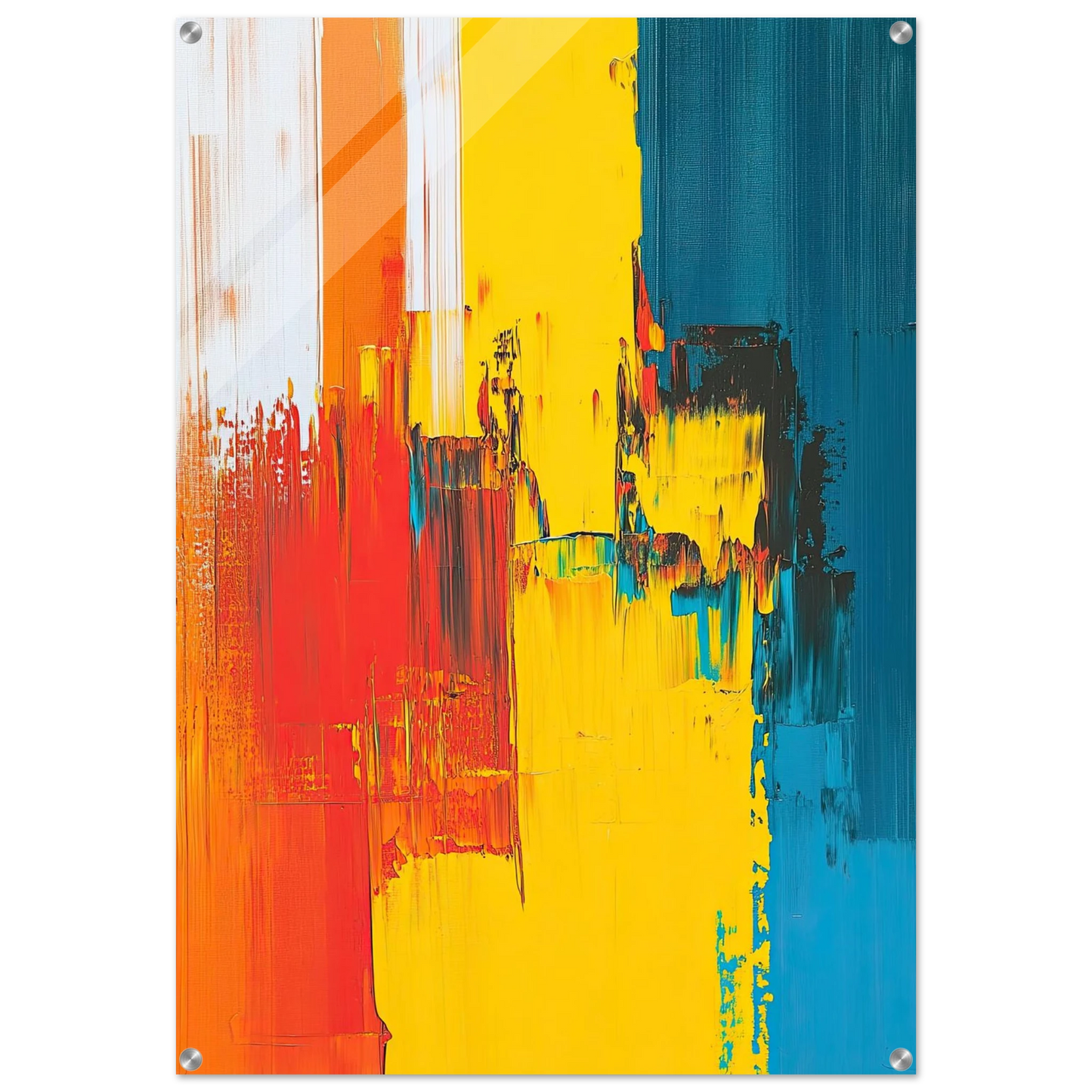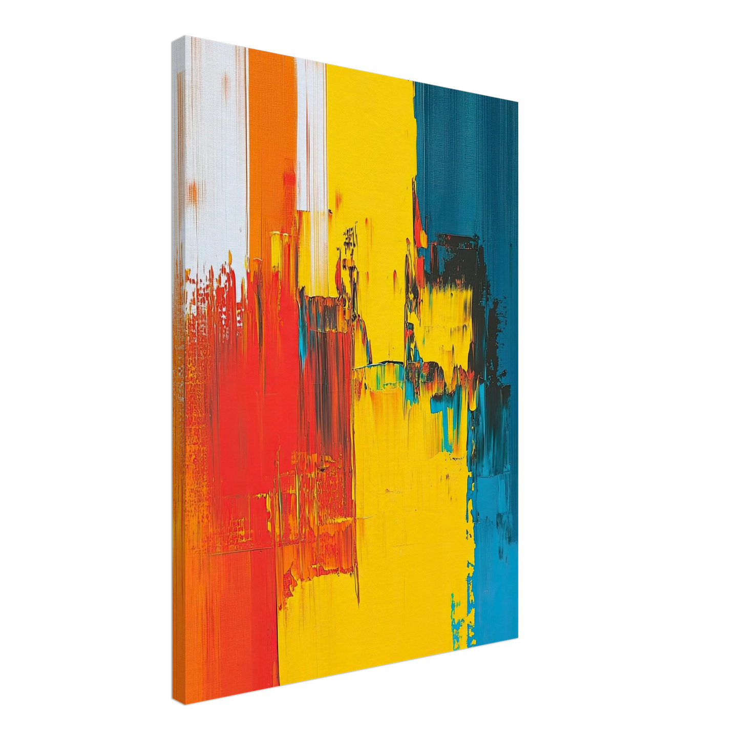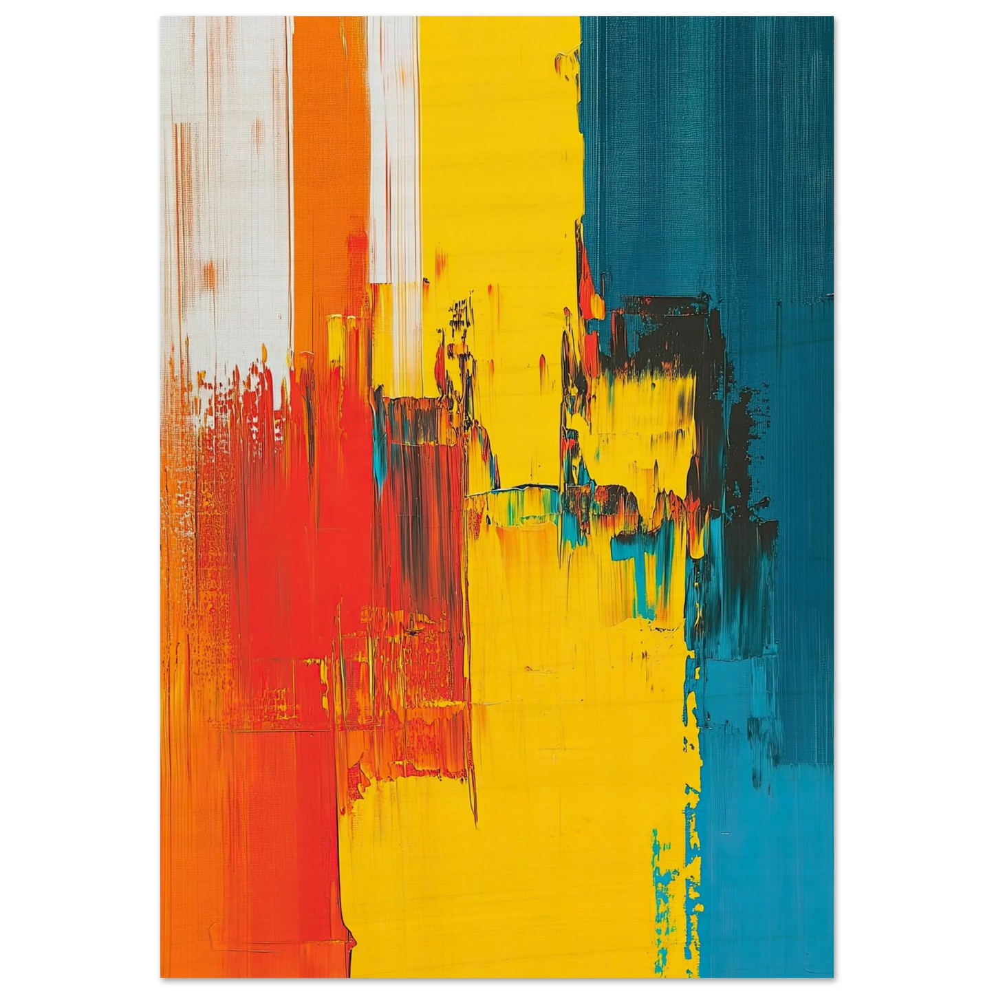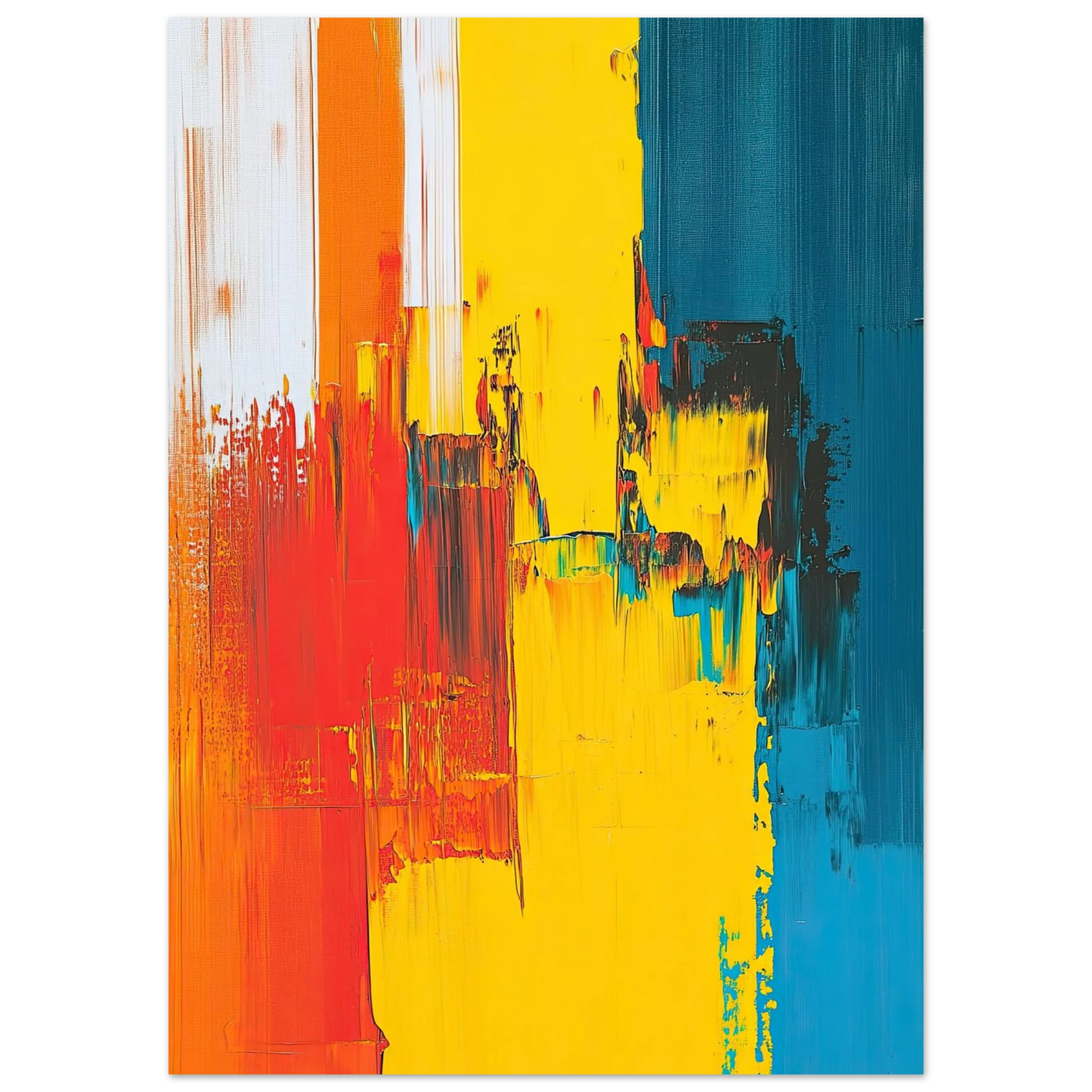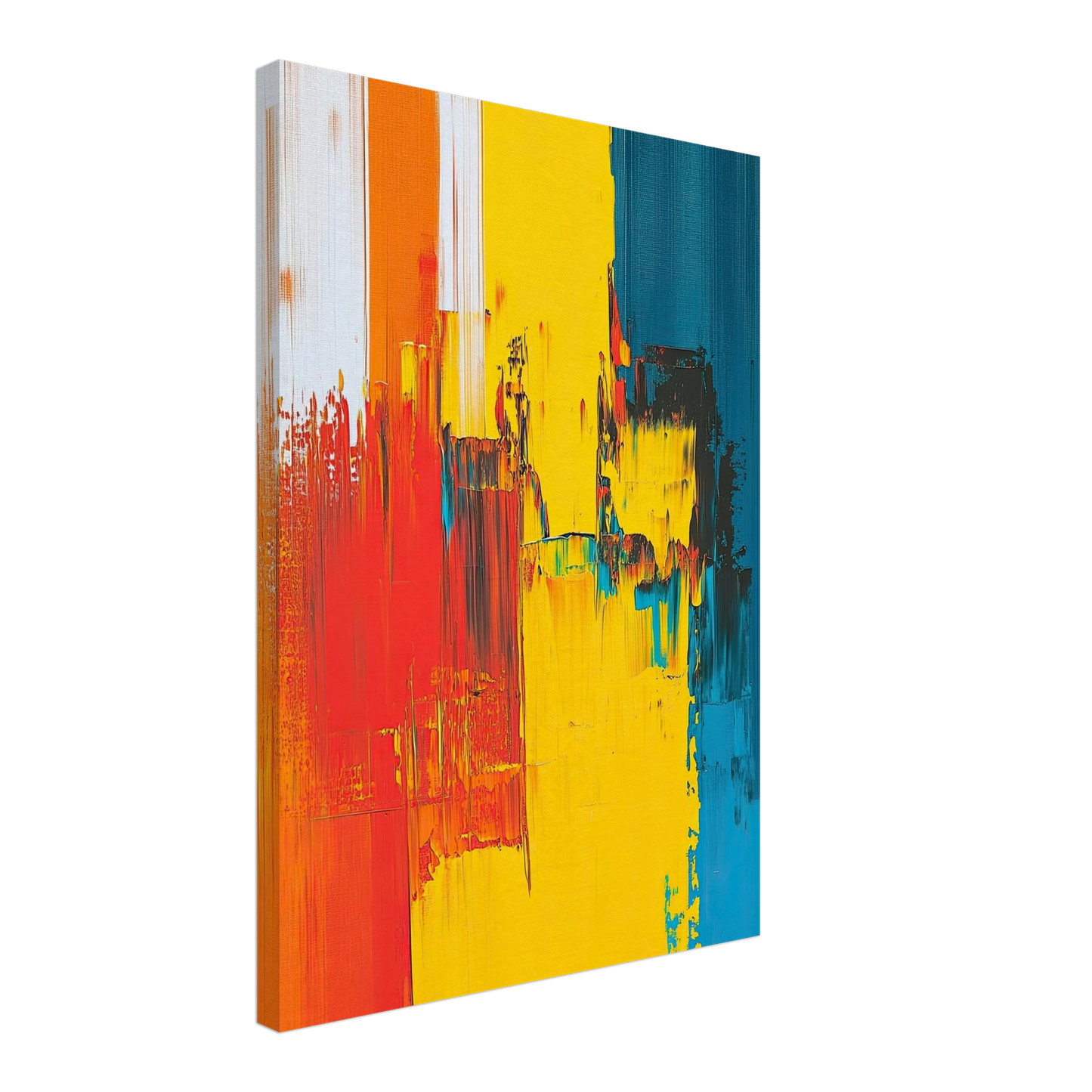 Et moderne og kraftfullt uttrykk av rene fargeflater og energiske teksturer. Gule, røde og blå nyanser smelter sammen i et urbant og lekent møte – perfekt for deg som vil gi rommet et kreativt løft.