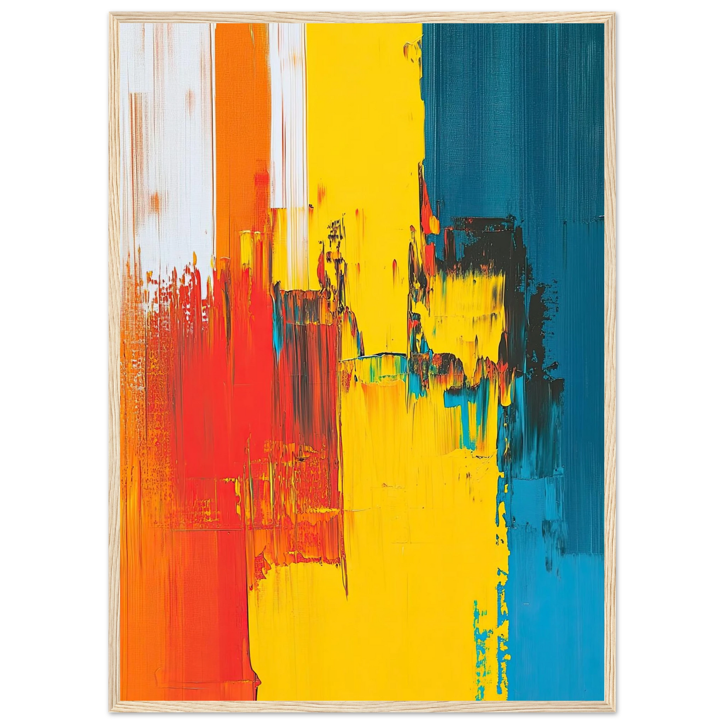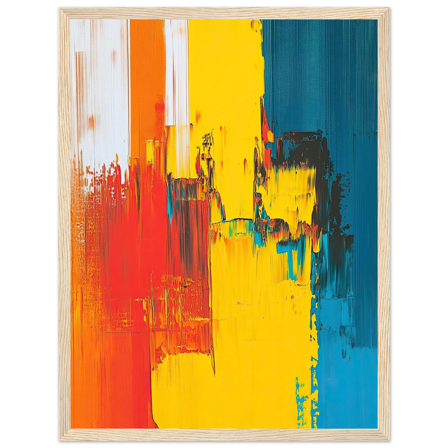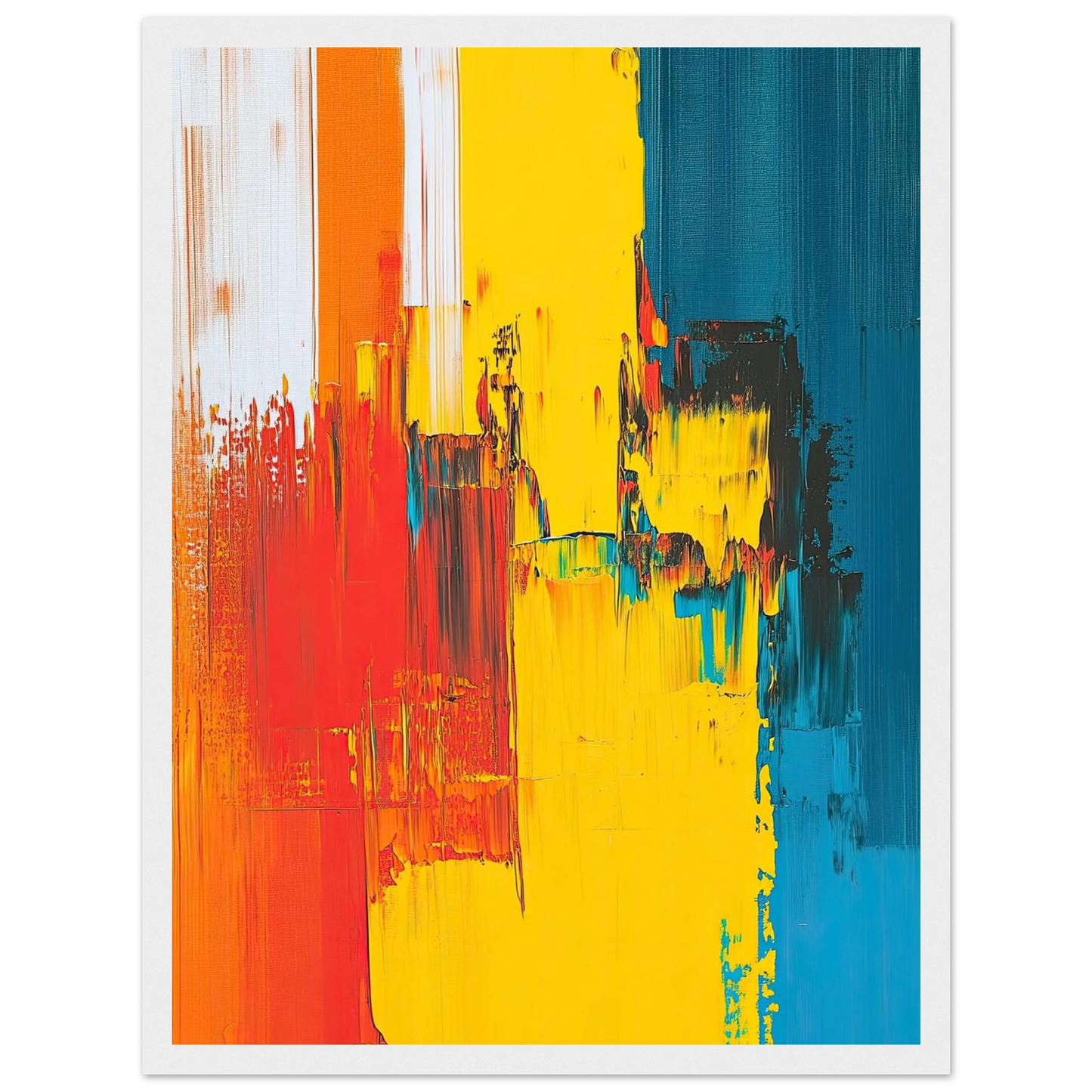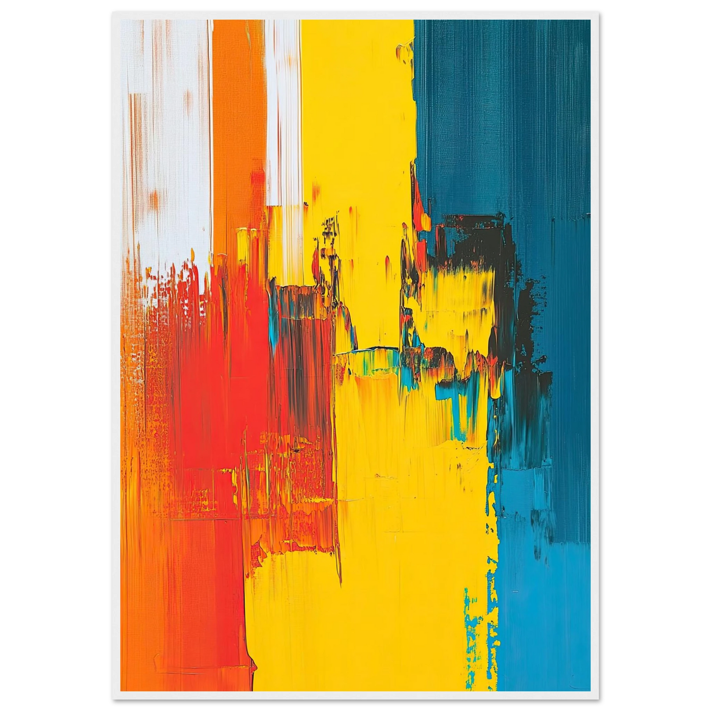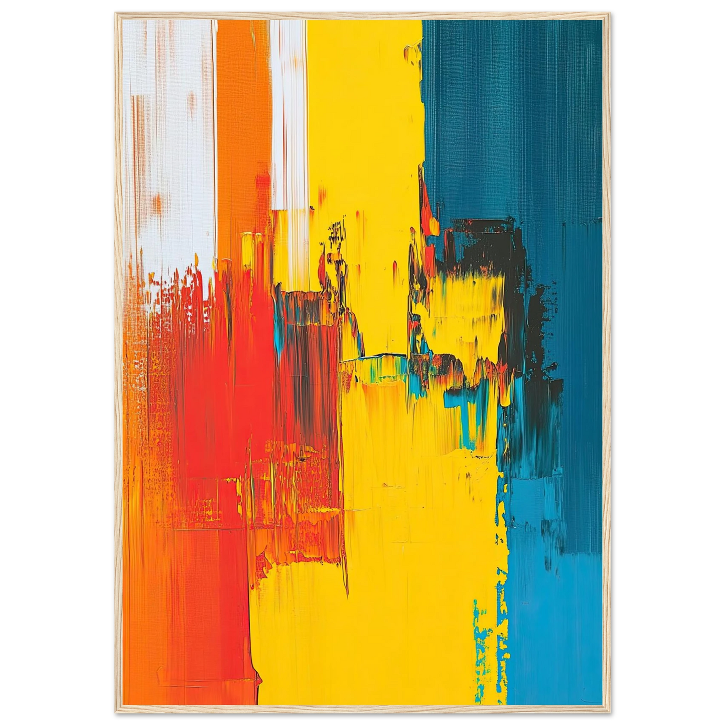 Et moderne og kraftfullt uttrykk av rene fargeflater og energiske teksturer. Gule, røde og blå nyanser smelter sammen i et urbant og lekent møte – perfekt for deg som vil gi rommet et kreativt løft.