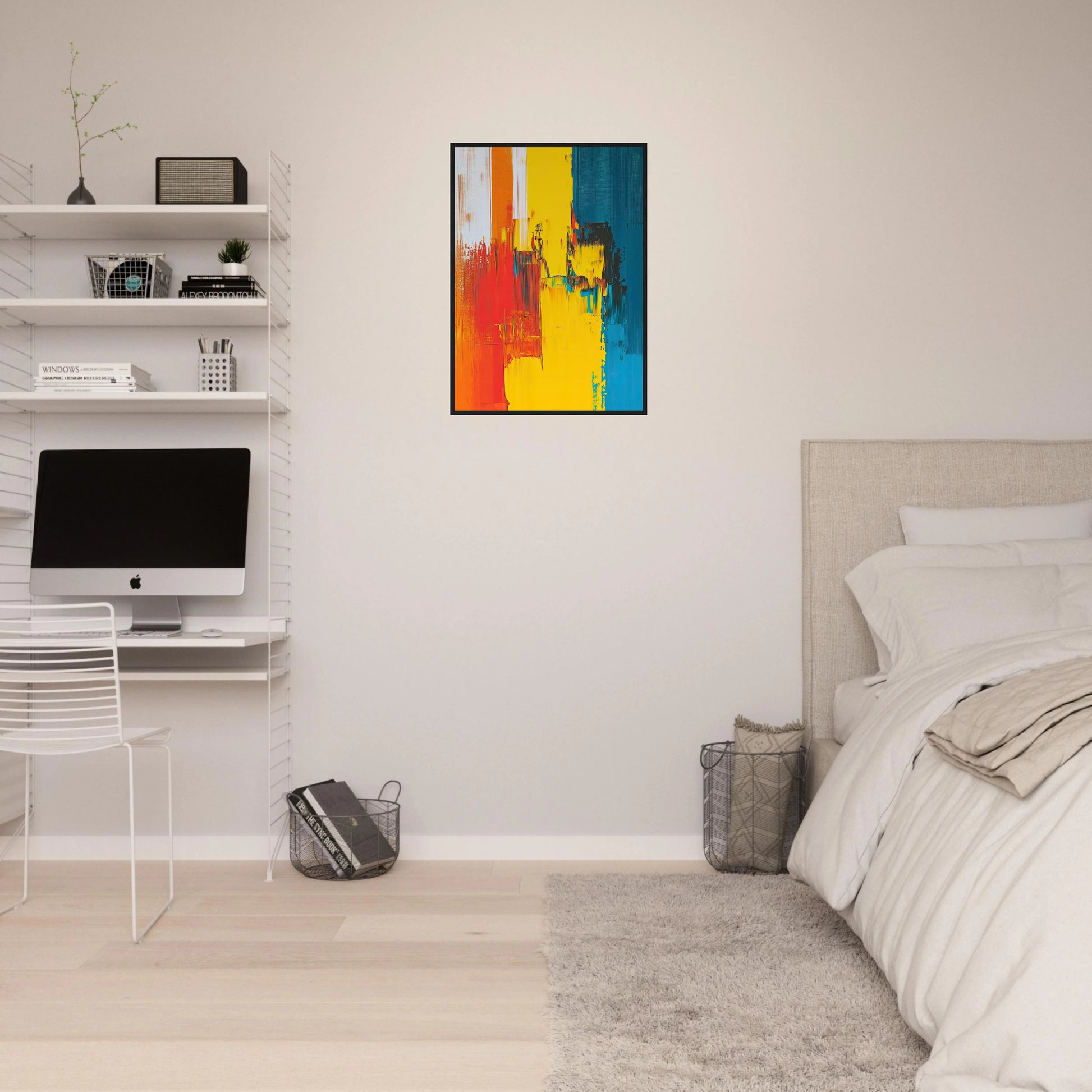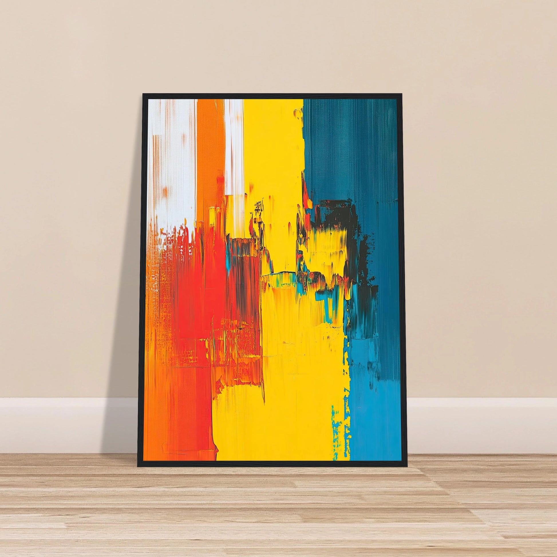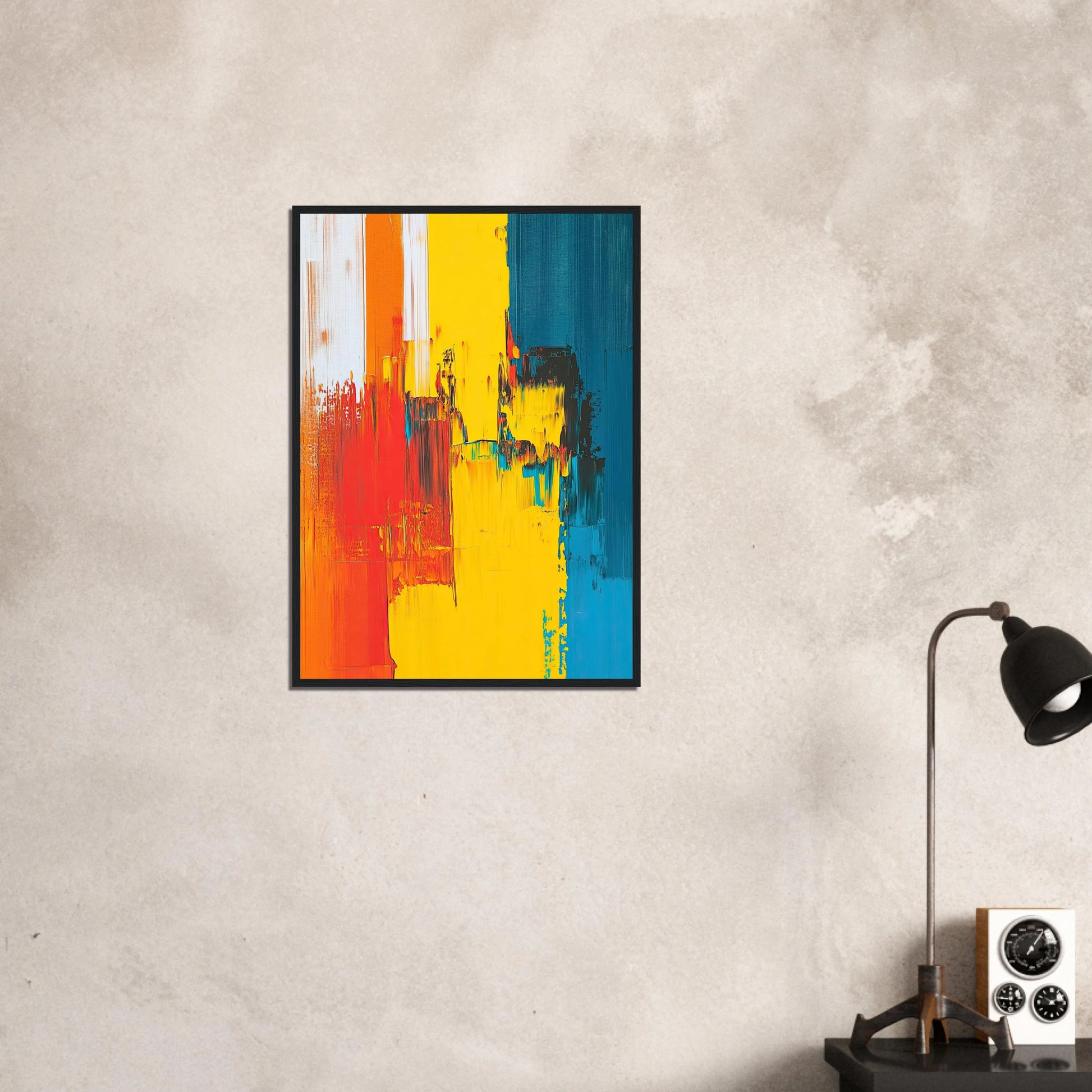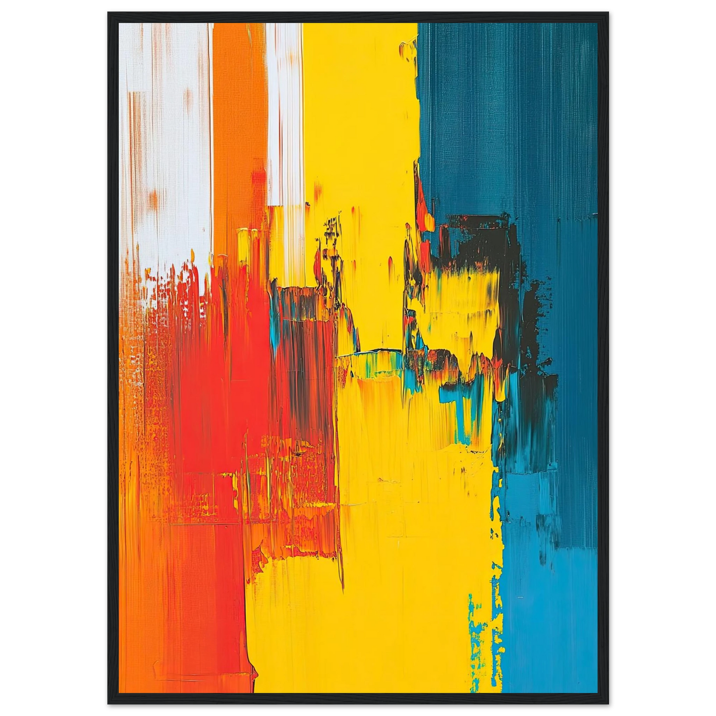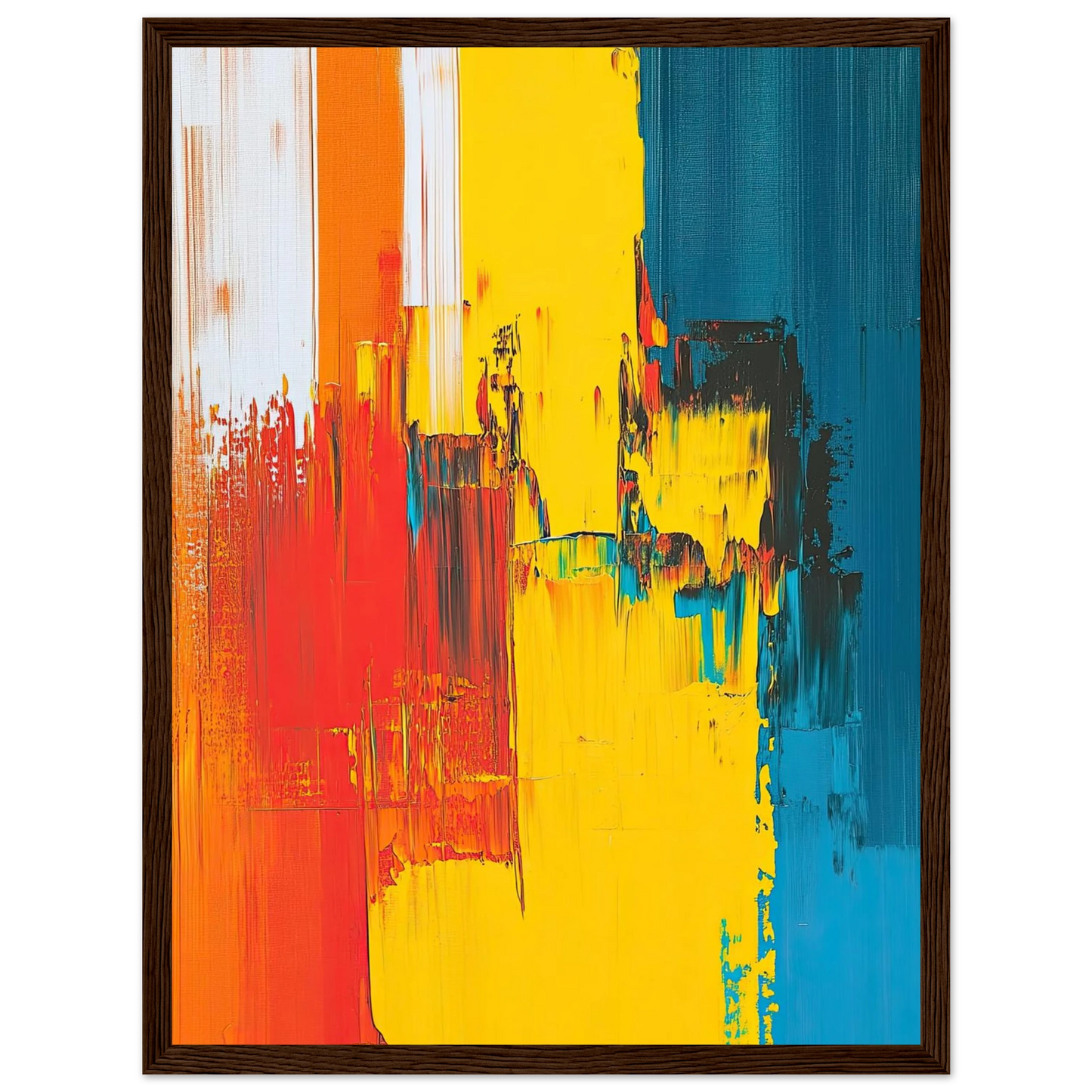 Et moderne og kraftfullt uttrykk av rene fargeflater og energiske teksturer. Gule, røde og blå nyanser smelter sammen i et urbant og lekent møte – perfekt for deg som vil gi rommet et kreativt løft.