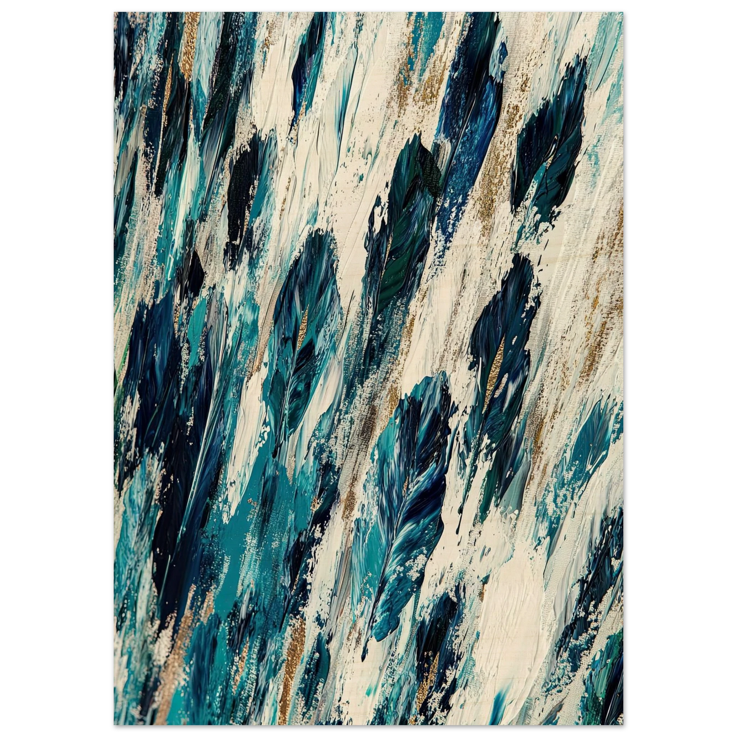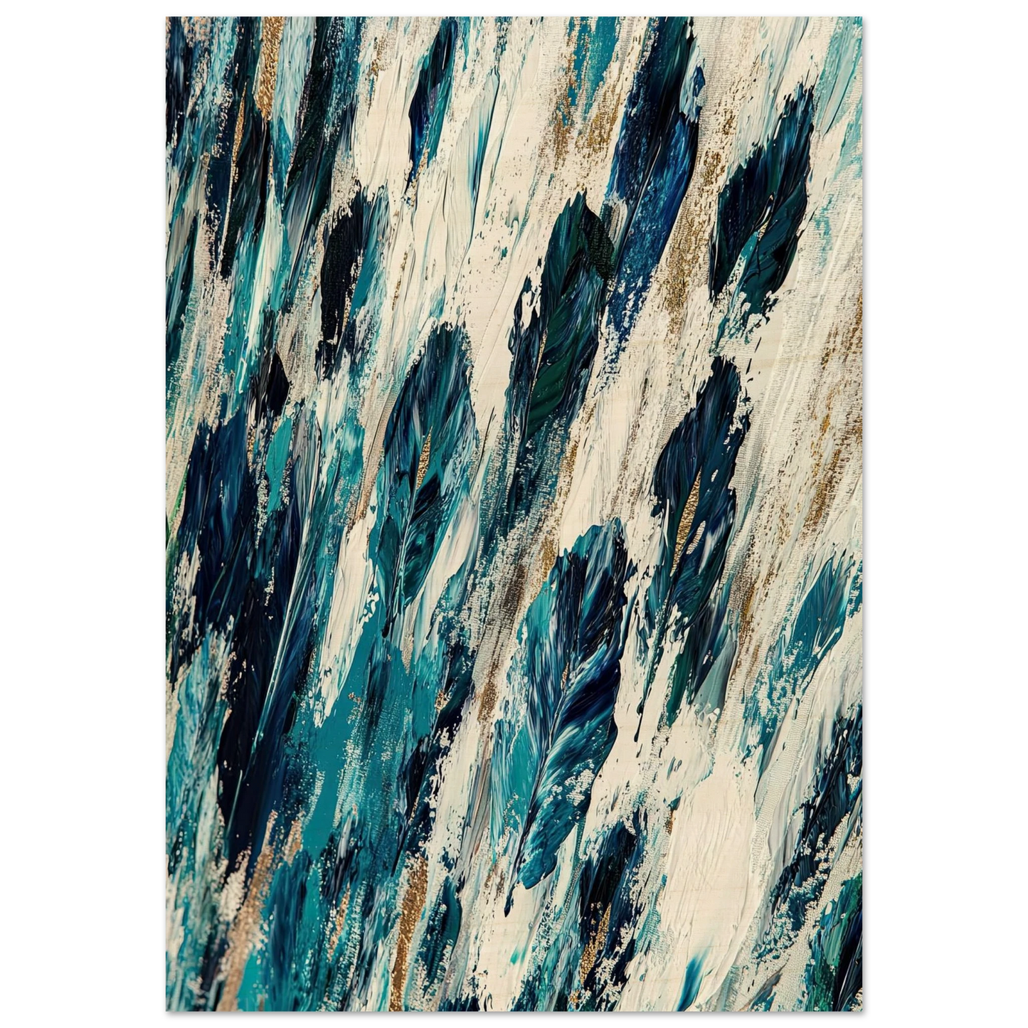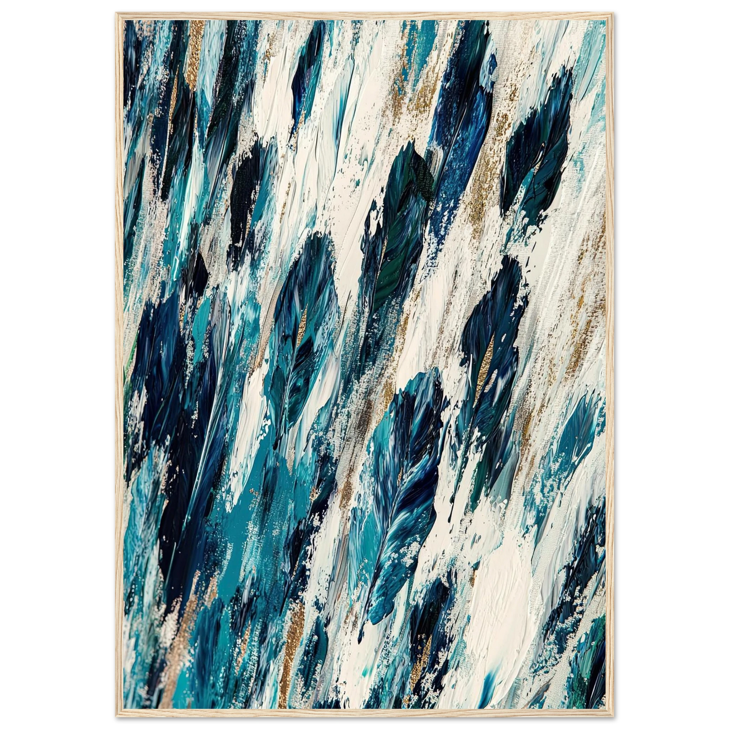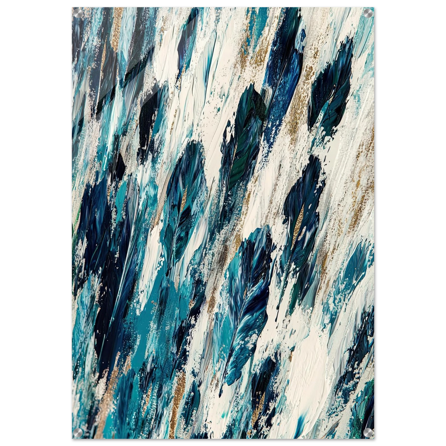 Dynamiske penselstrøk i blått og gull skaper en kraftfull illusjon av svevende fjær i bevegelse. Et kunstverk som utstråler energi og eleganse.