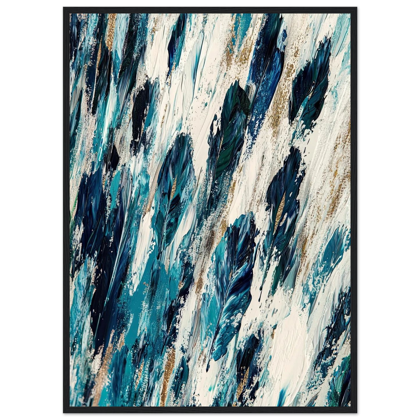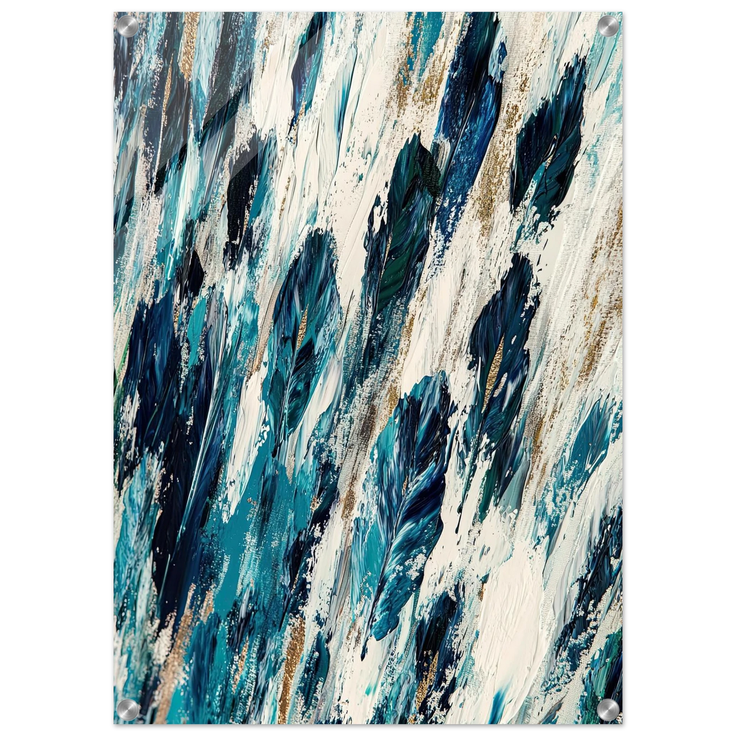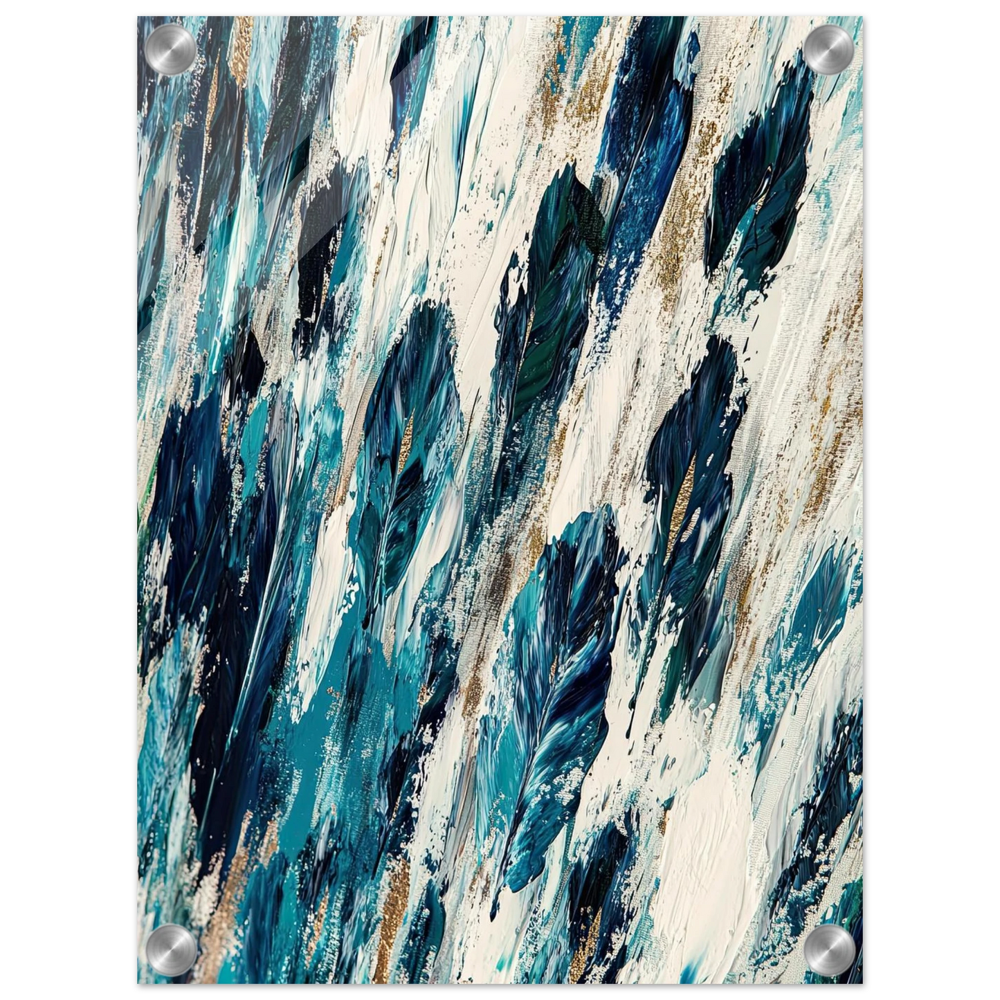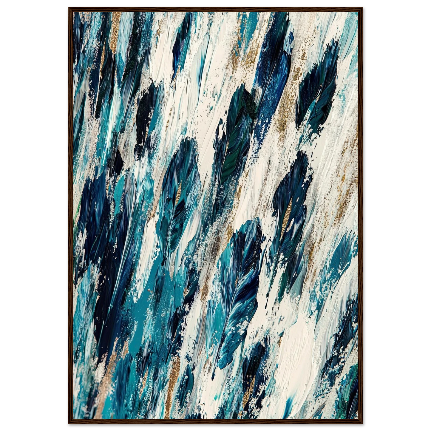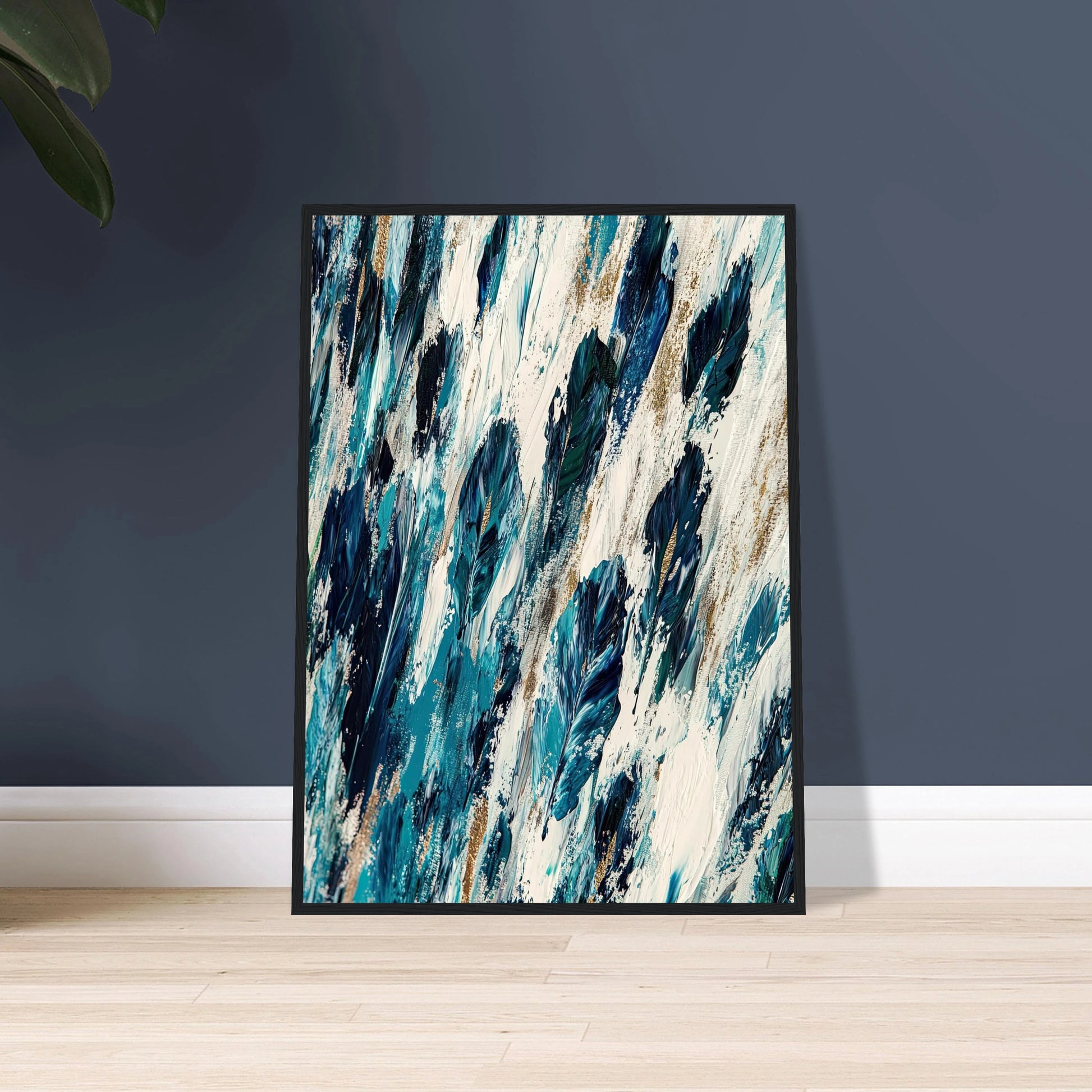 Dynamiske penselstrøk i blått og gull skaper en kraftfull illusjon av svevende fjær i bevegelse. Et kunstverk som utstråler energi og eleganse.