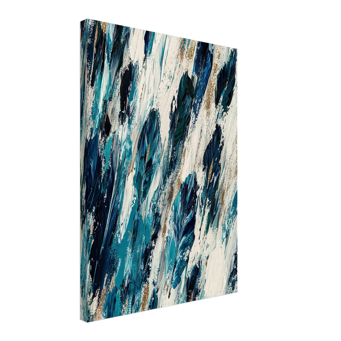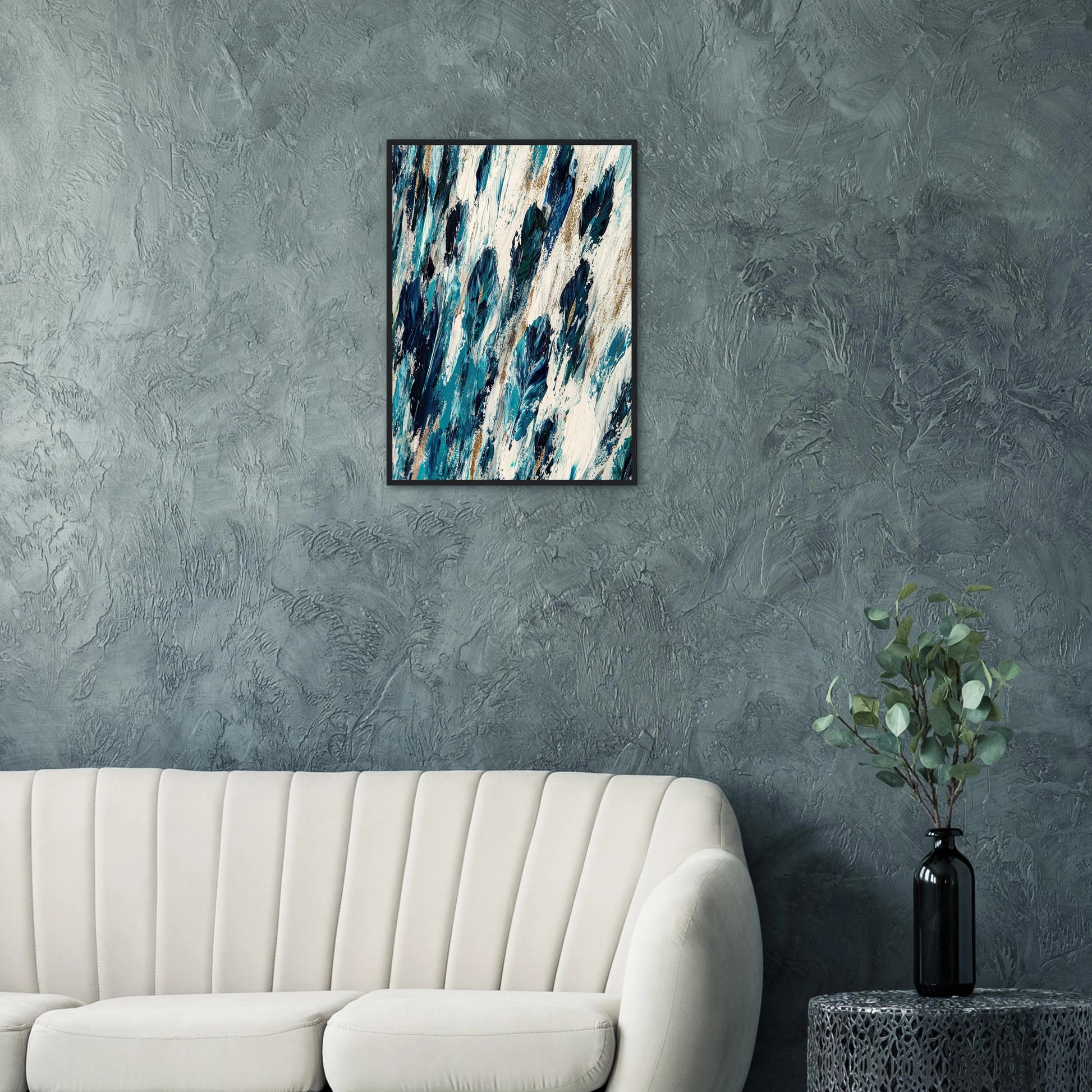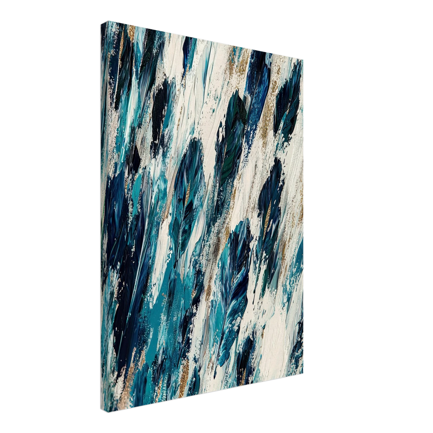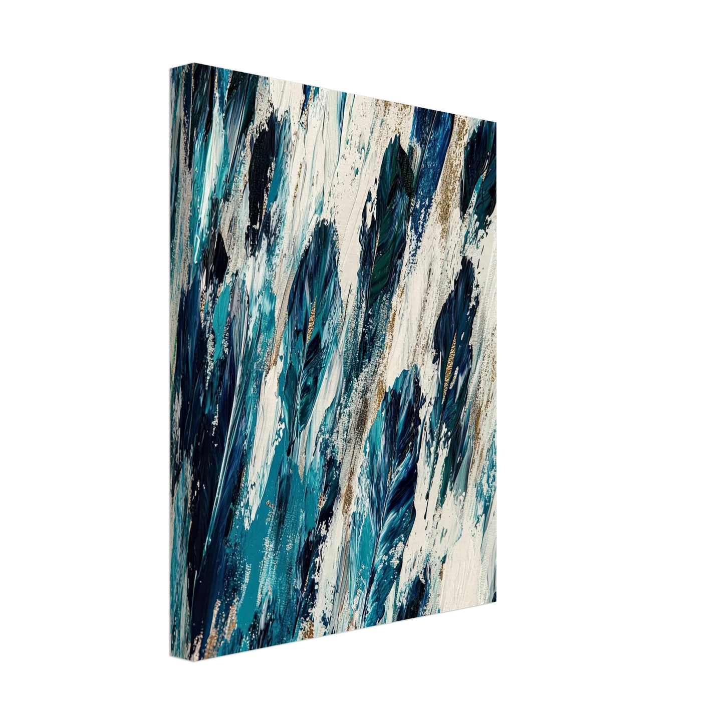 Dynamiske penselstrøk i blått og gull skaper en kraftfull illusjon av svevende fjær i bevegelse. Et kunstverk som utstråler energi og eleganse.