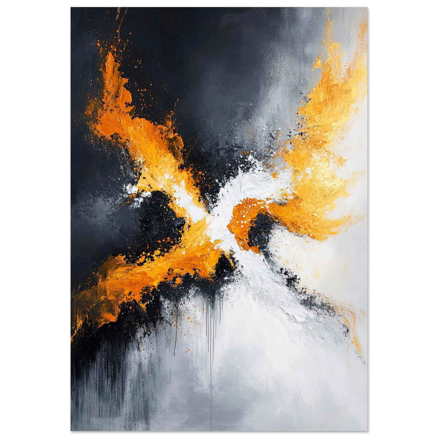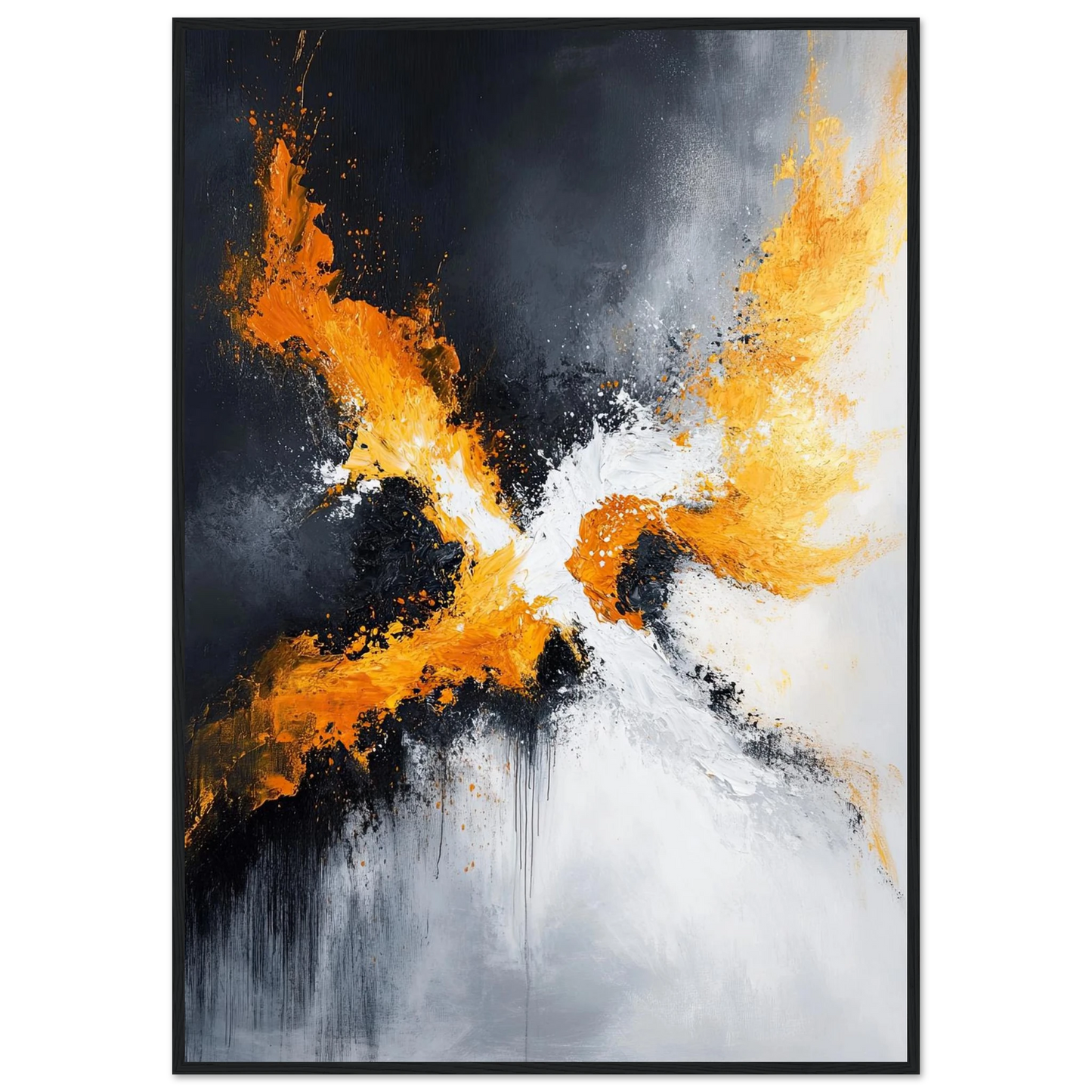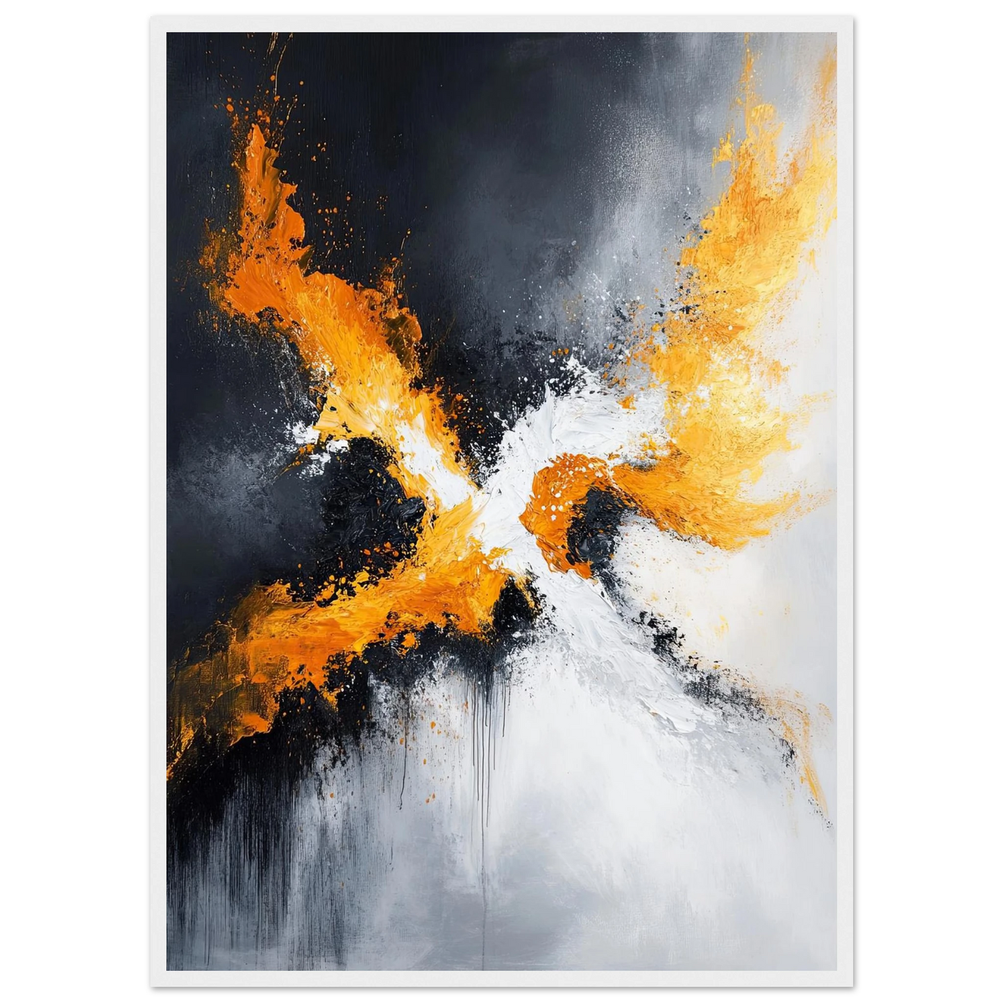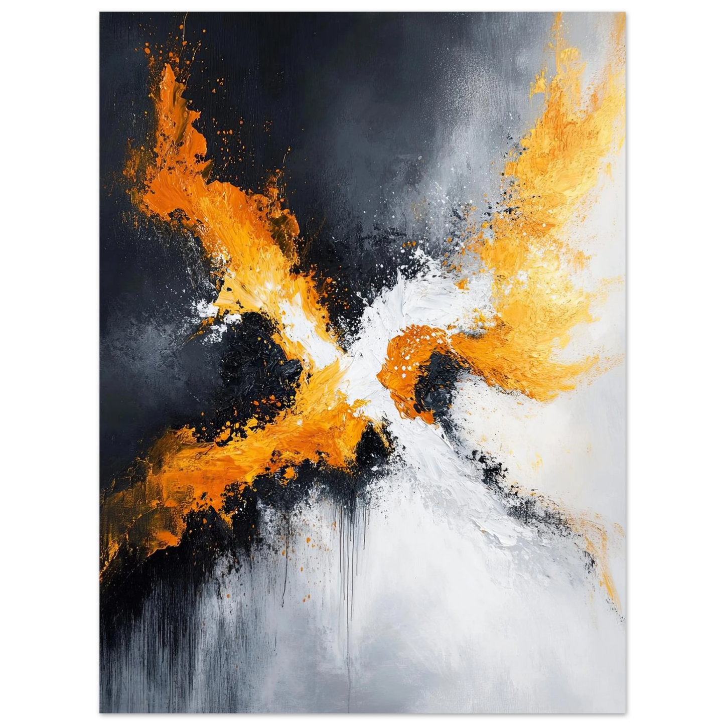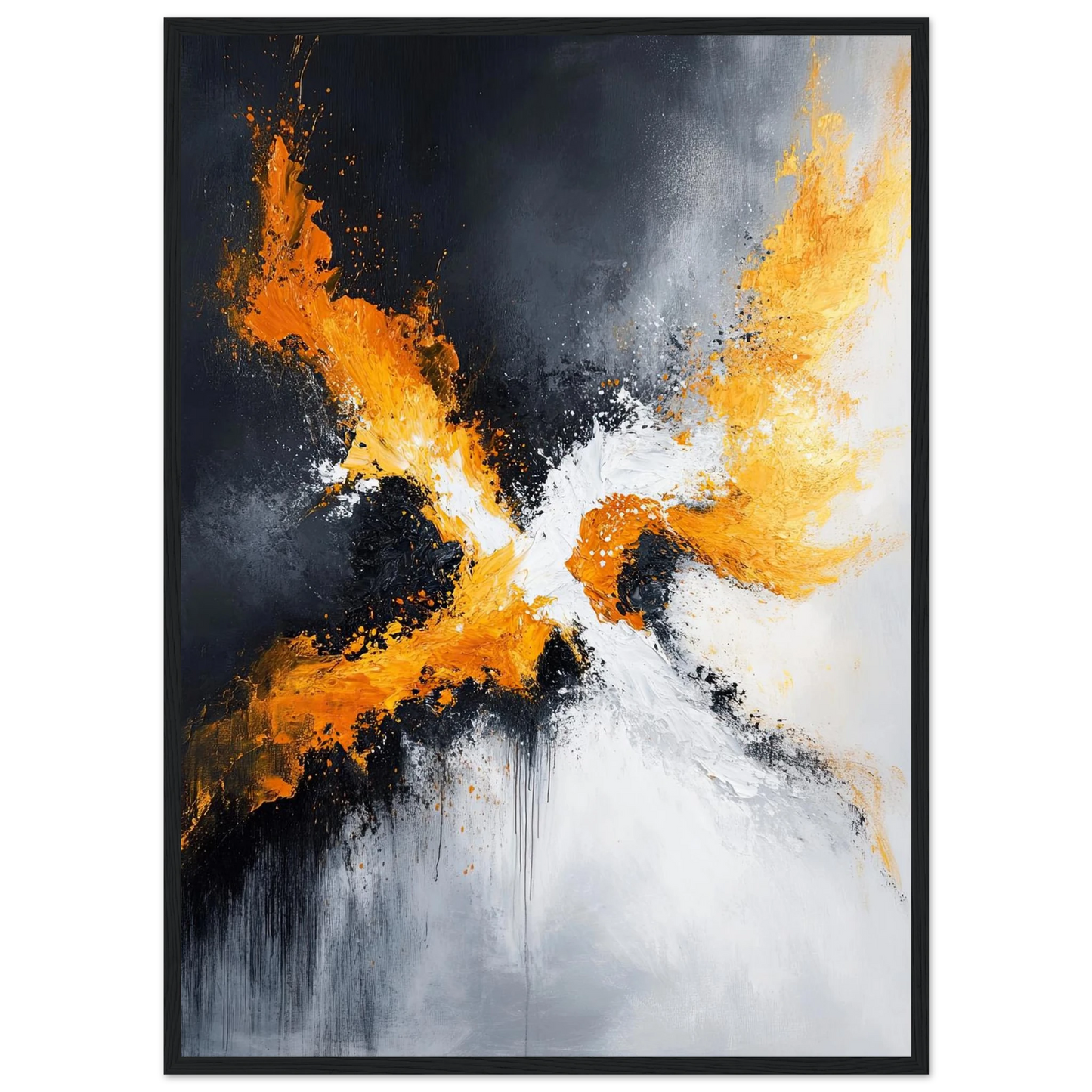 Et dramatisk møte mellom ild og is, fanget i eksplosive penselstrøk av oransje, svart og hvitt. Dette kraftfulle kunstverket sprer energi og bevegelse – perfekt som et statement-piece i et moderne hjem.