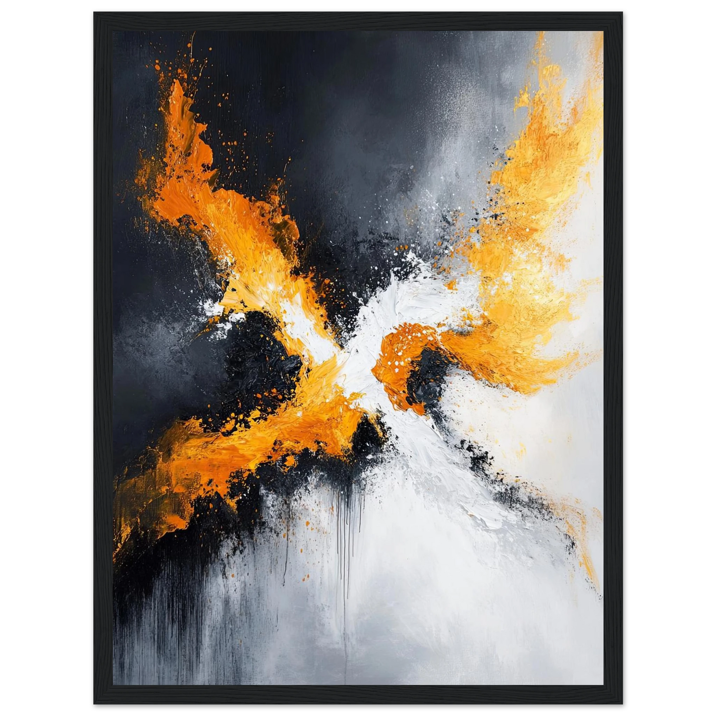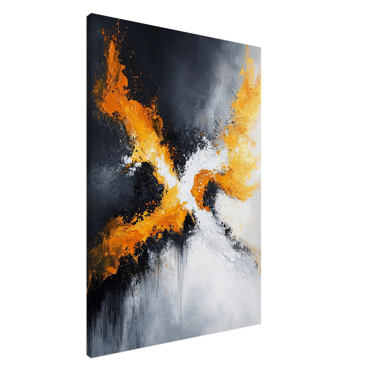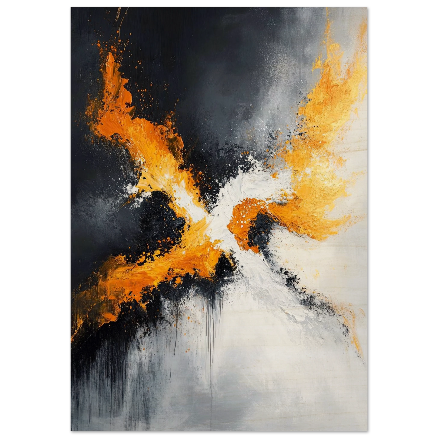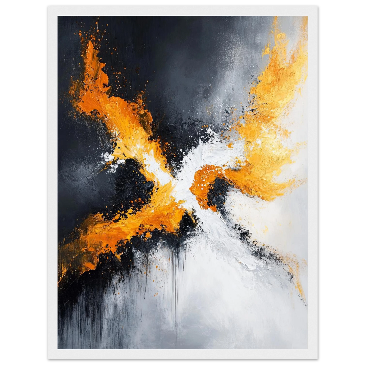 Et dramatisk møte mellom ild og is, fanget i eksplosive penselstrøk av oransje, svart og hvitt. Dette kraftfulle kunstverket sprer energi og bevegelse – perfekt som et statement-piece i et moderne hjem.