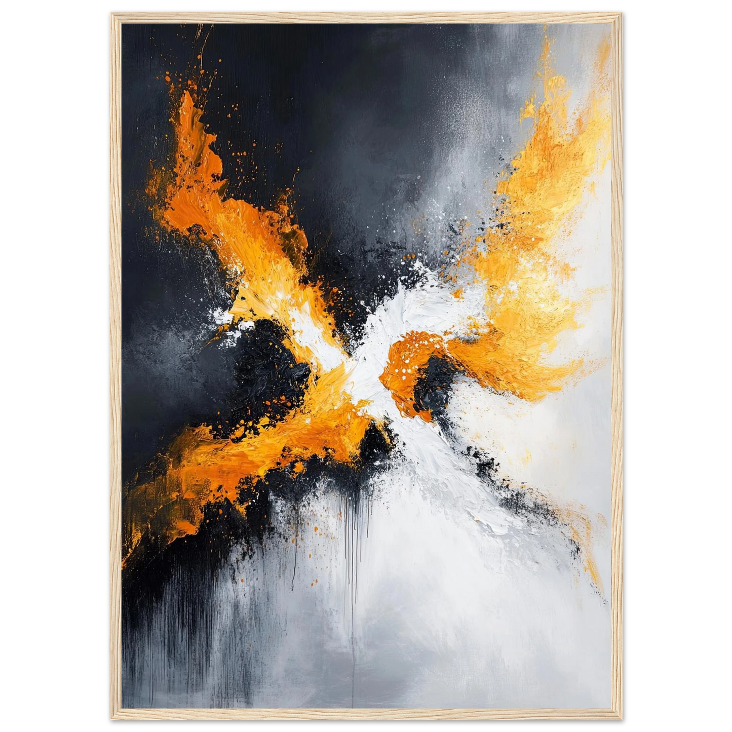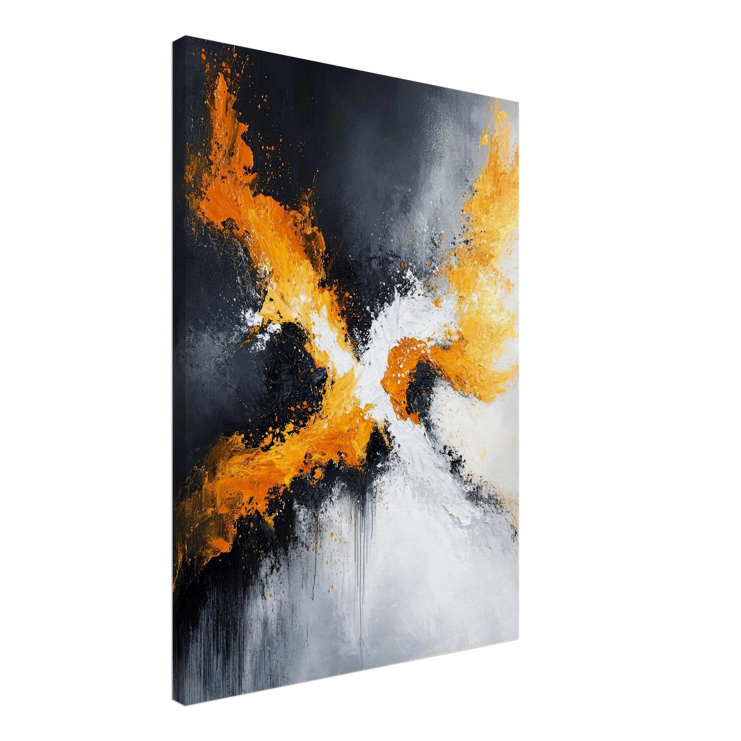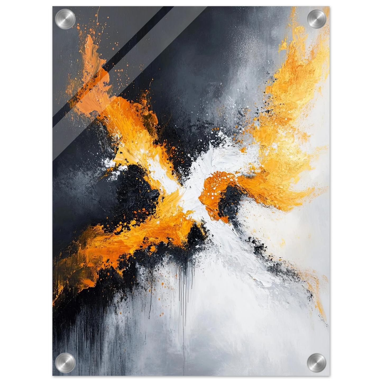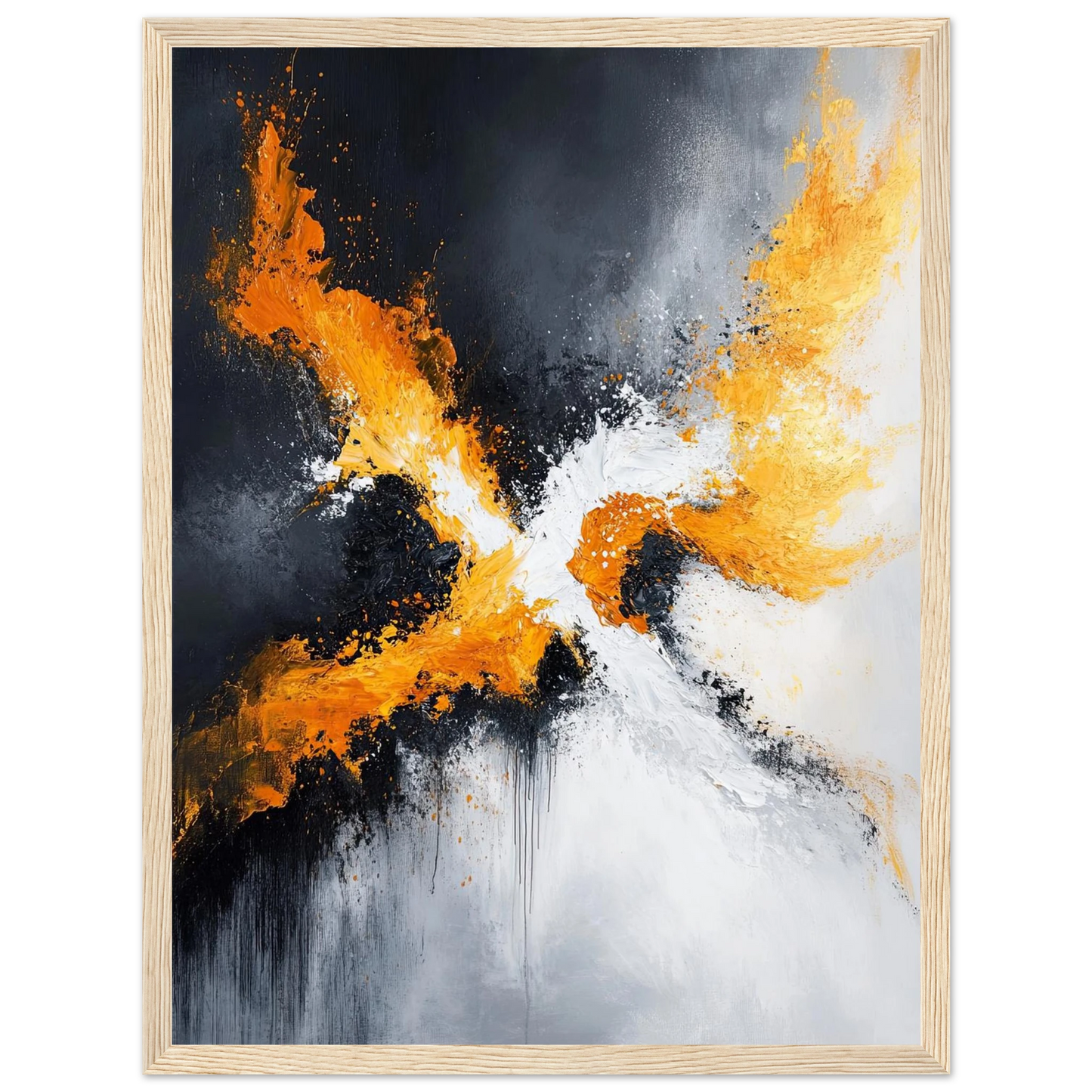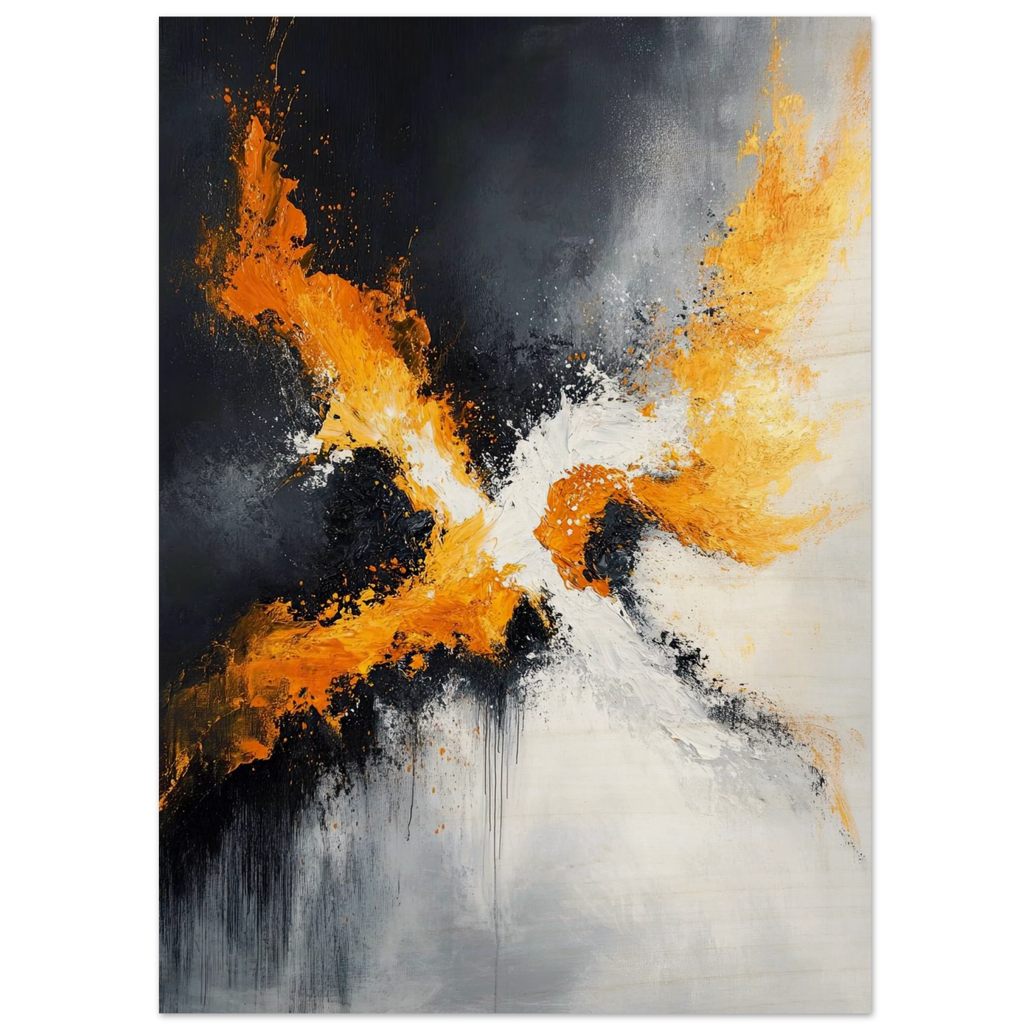 Et dramatisk møte mellom ild og is, fanget i eksplosive penselstrøk av oransje, svart og hvitt. Dette kraftfulle kunstverket sprer energi og bevegelse – perfekt som et statement-piece i et moderne hjem.