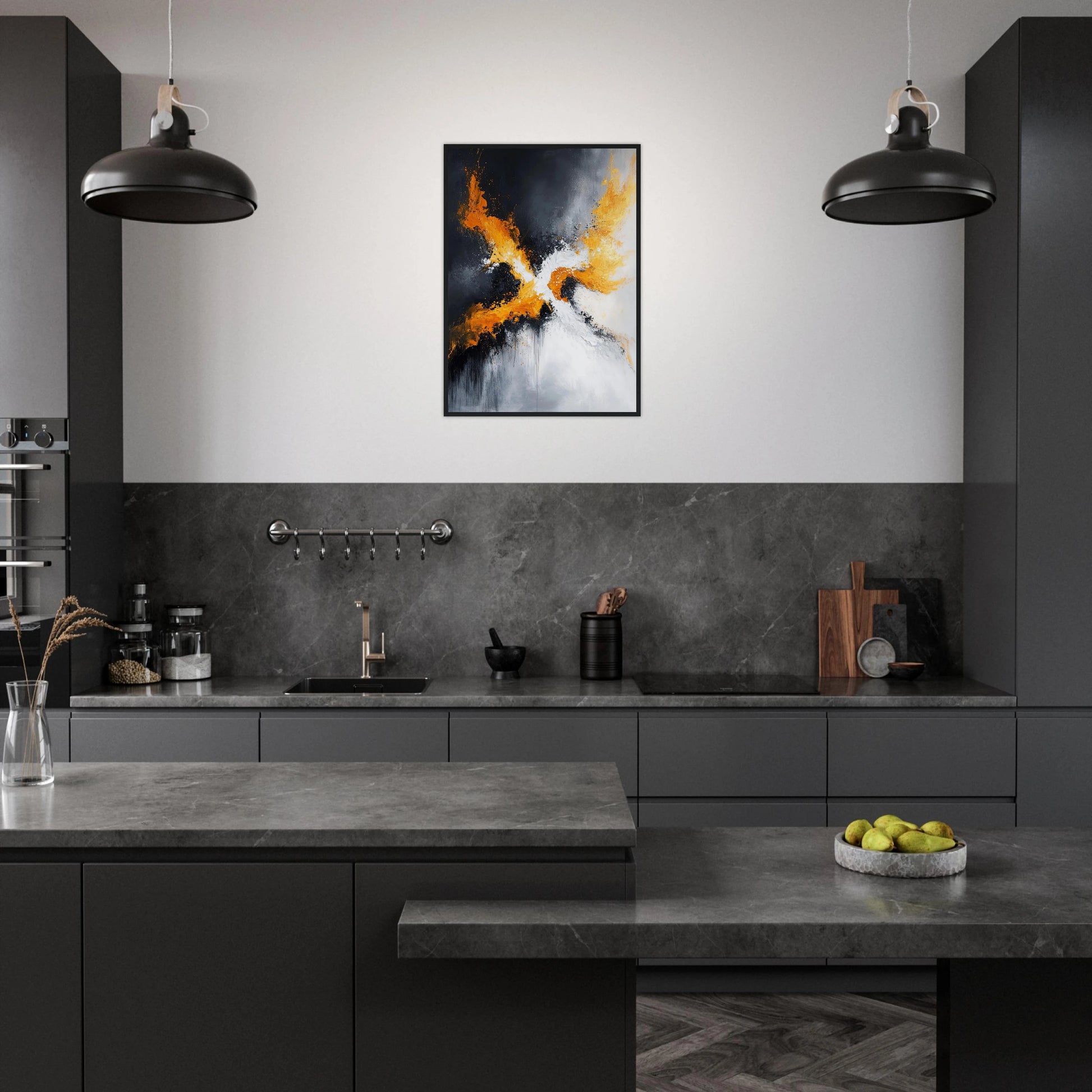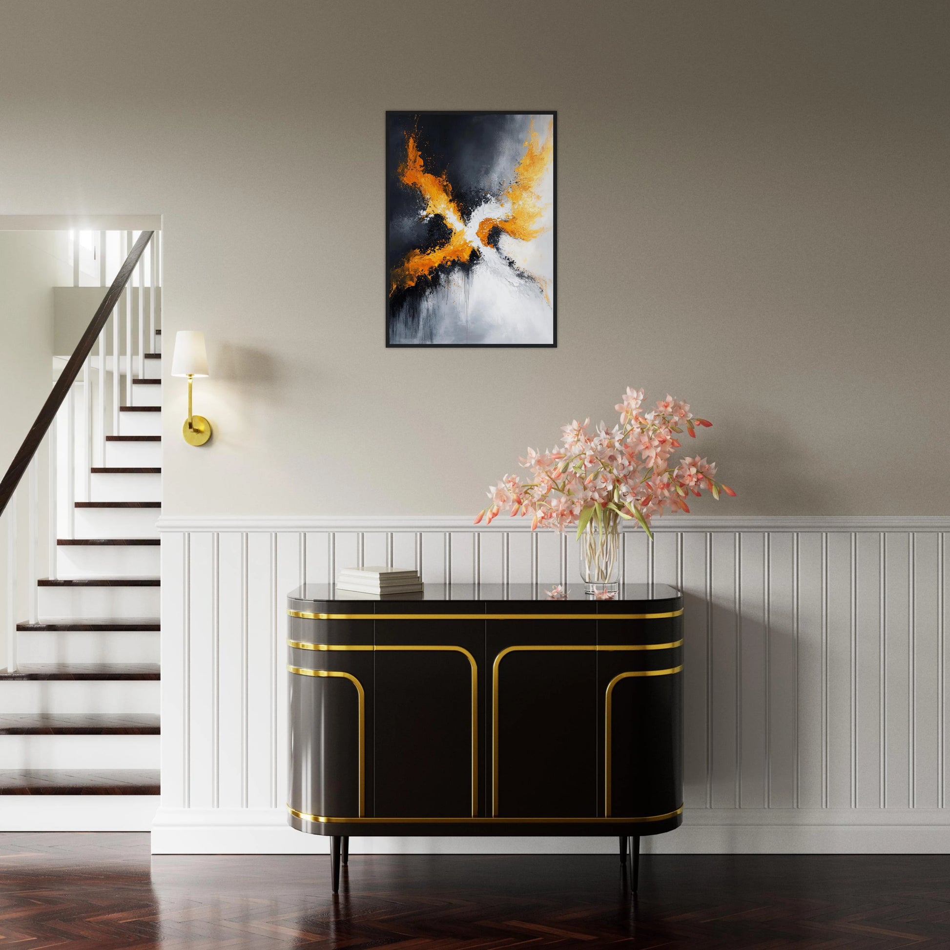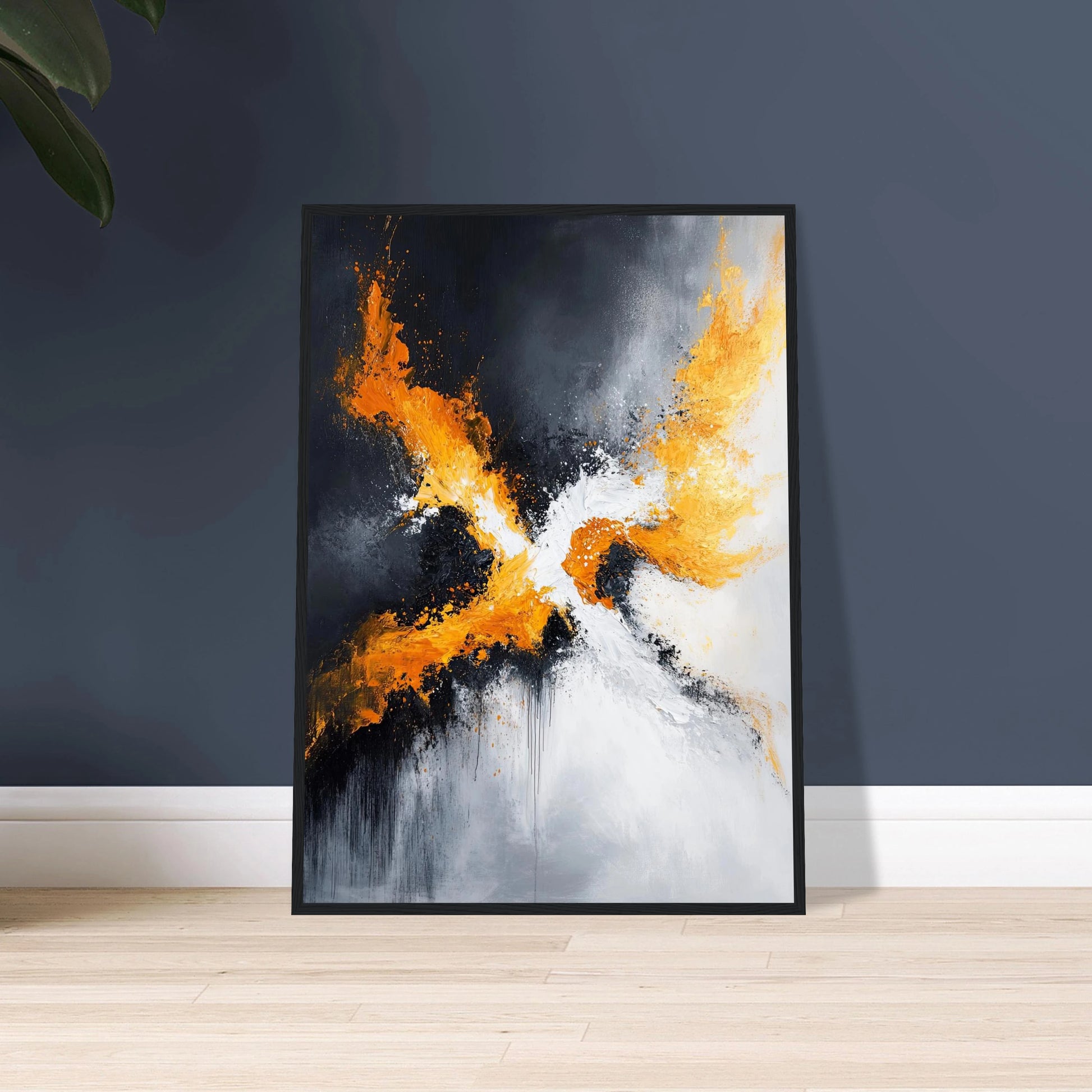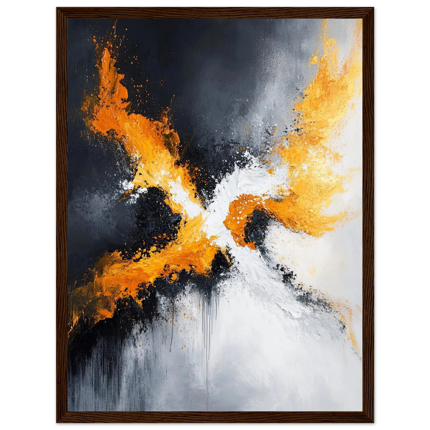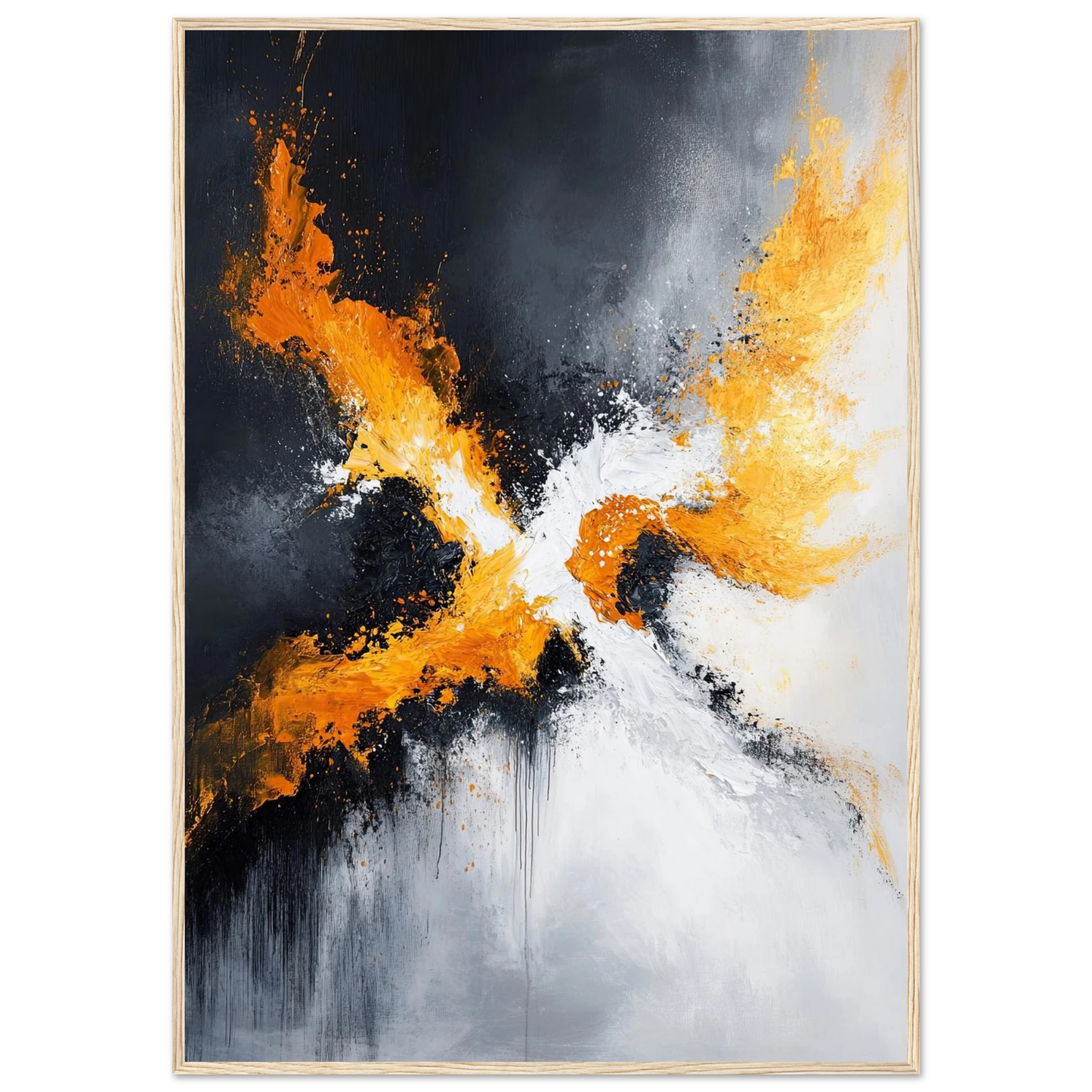 Et dramatisk møte mellom ild og is, fanget i eksplosive penselstrøk av oransje, svart og hvitt. Dette kraftfulle kunstverket sprer energi og bevegelse – perfekt som et statement-piece i et moderne hjem.