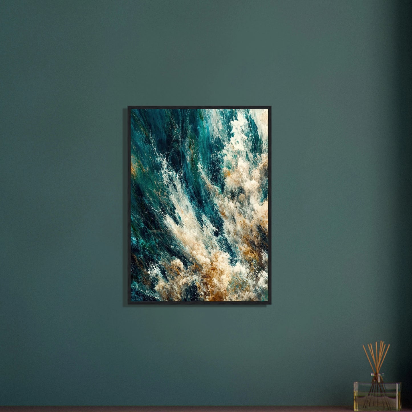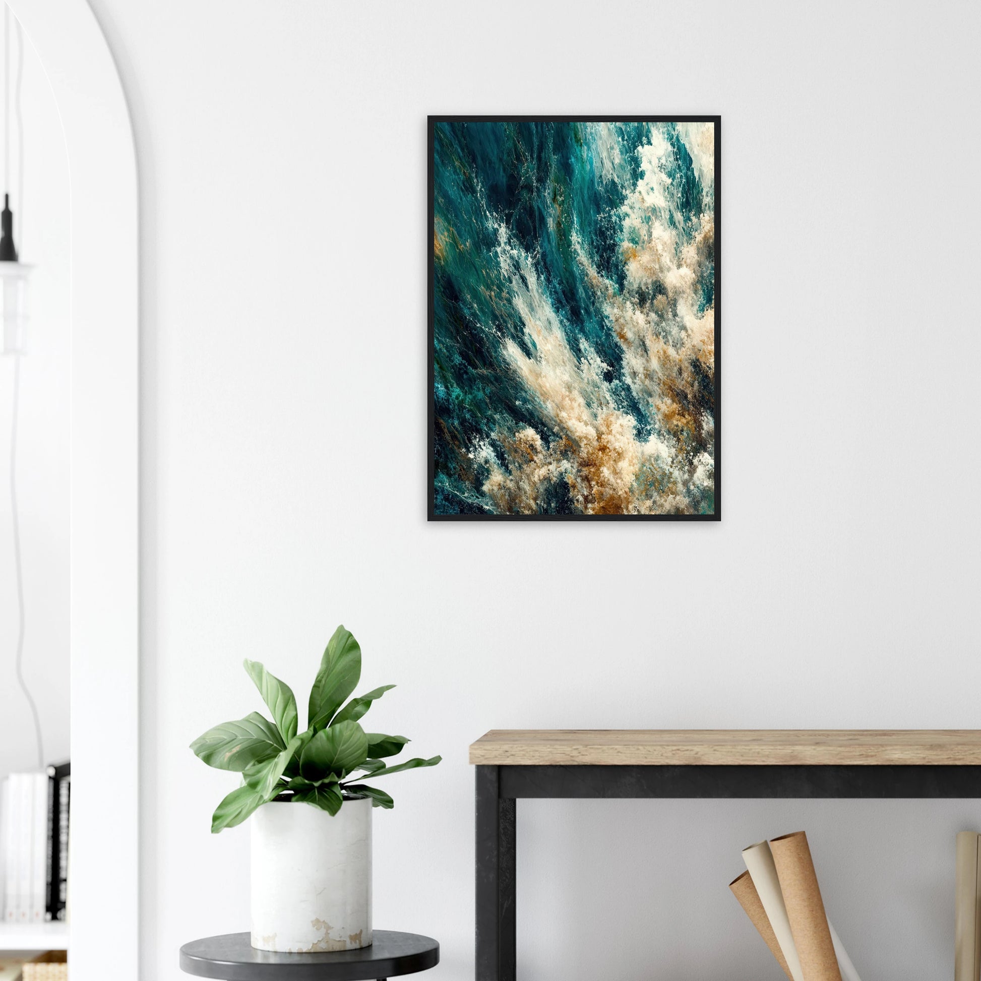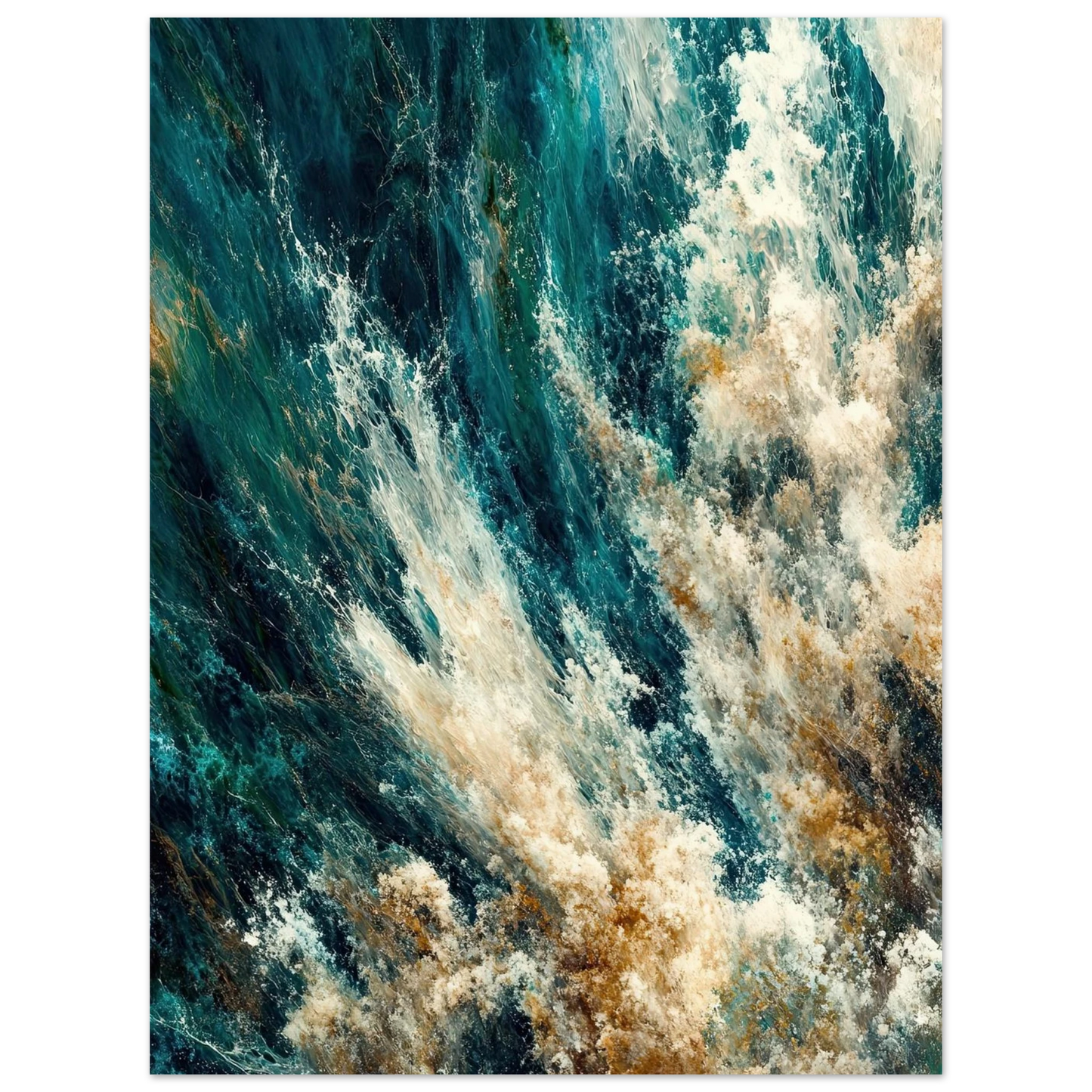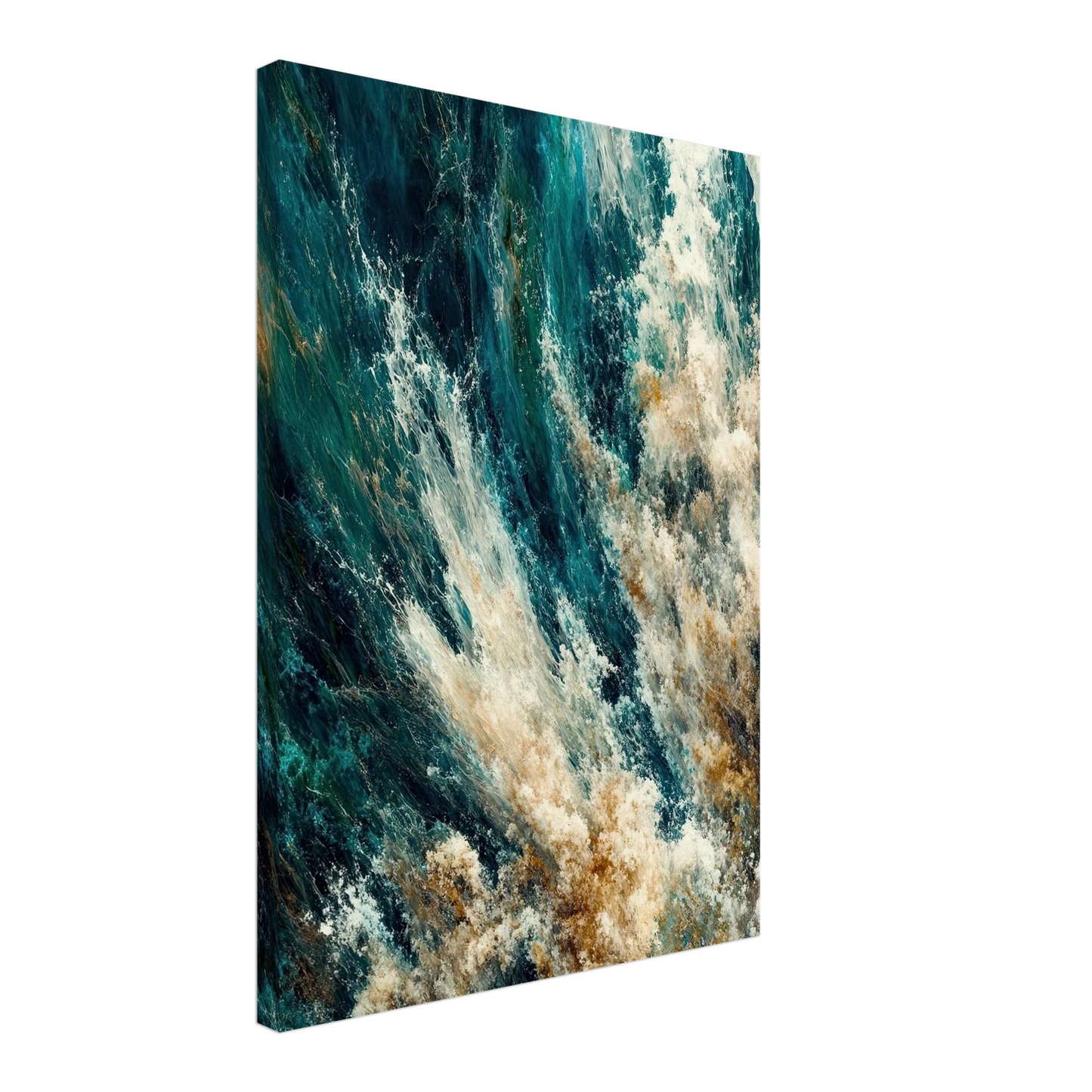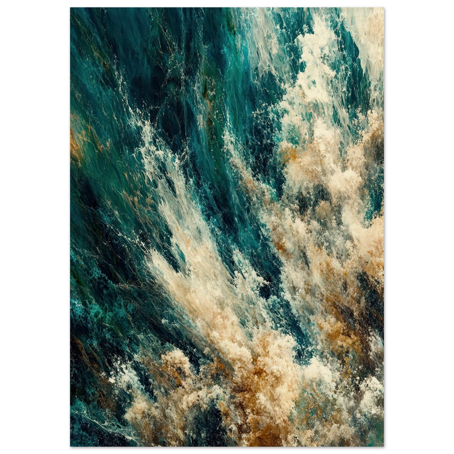 En intens eksplosjon av farger og bevegelse, der turkis, hvitt og brunt smelter sammen som en bølge i full kraft. Et visuelt adrenalinkick som gir rommet energi og dybde.