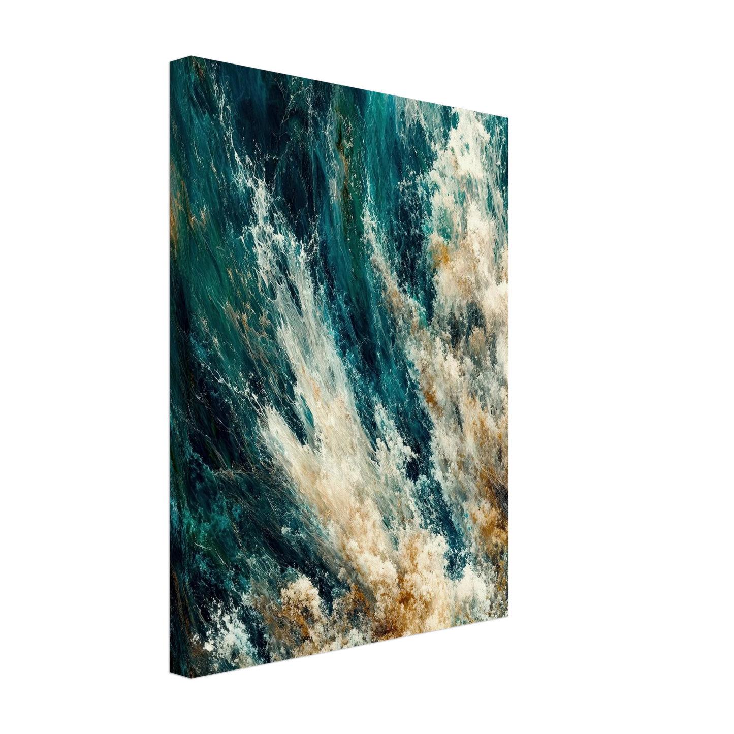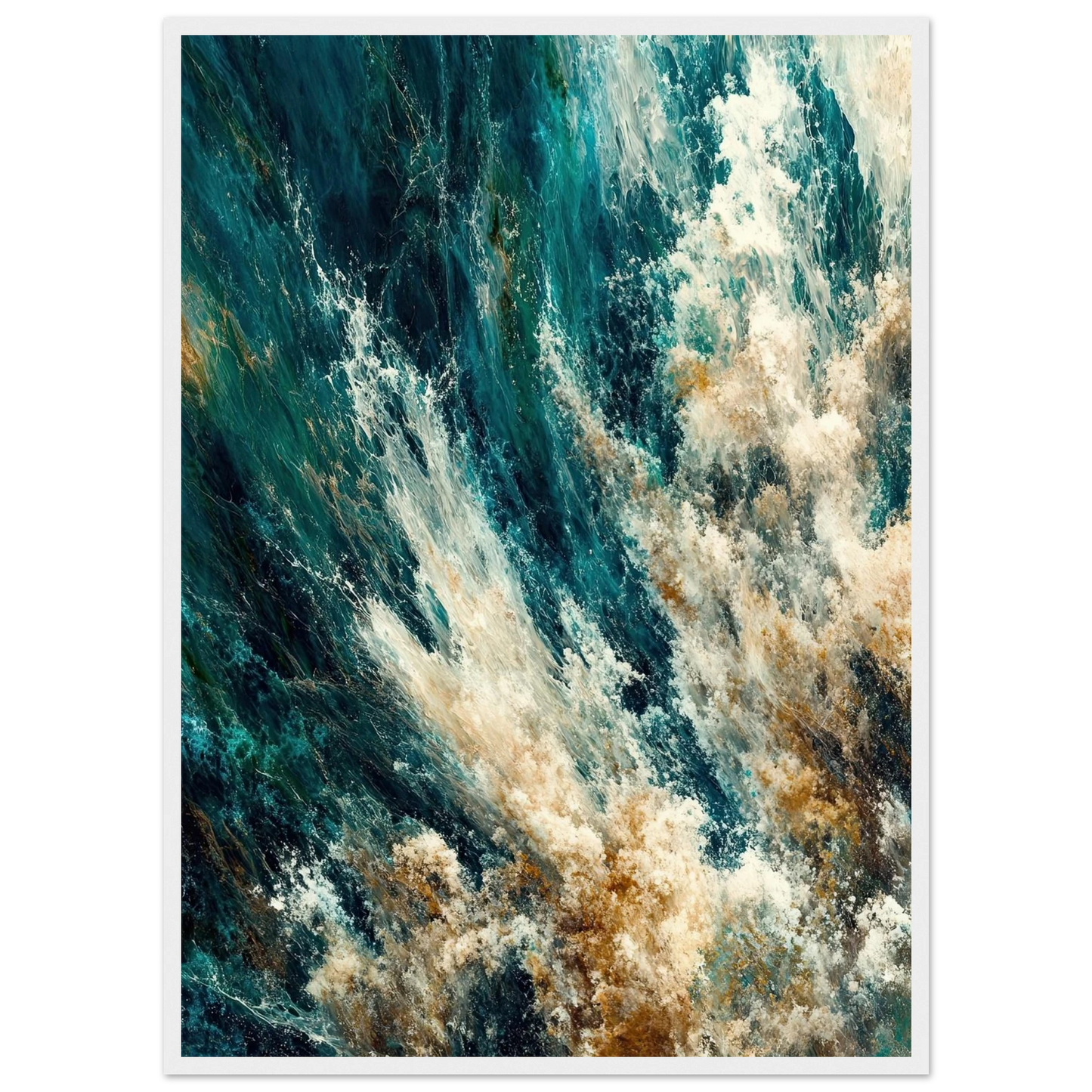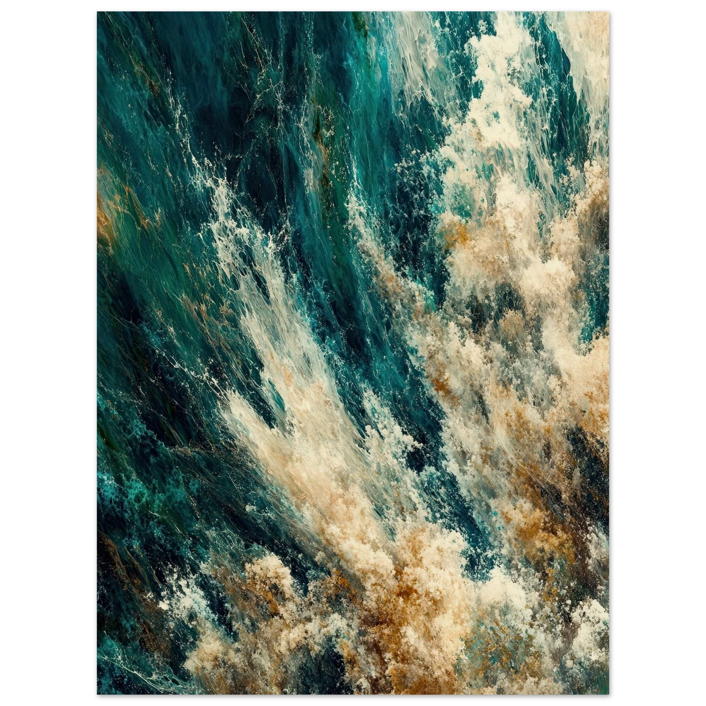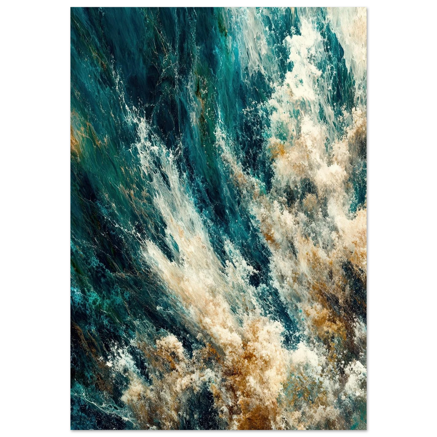 En intens eksplosjon av farger og bevegelse, der turkis, hvitt og brunt smelter sammen som en bølge i full kraft. Et visuelt adrenalinkick som gir rommet energi og dybde.