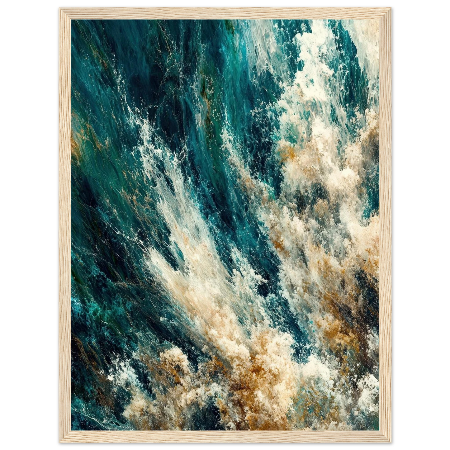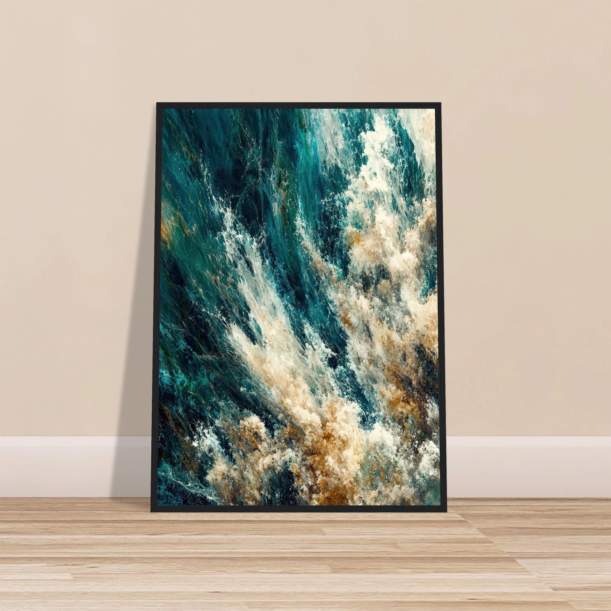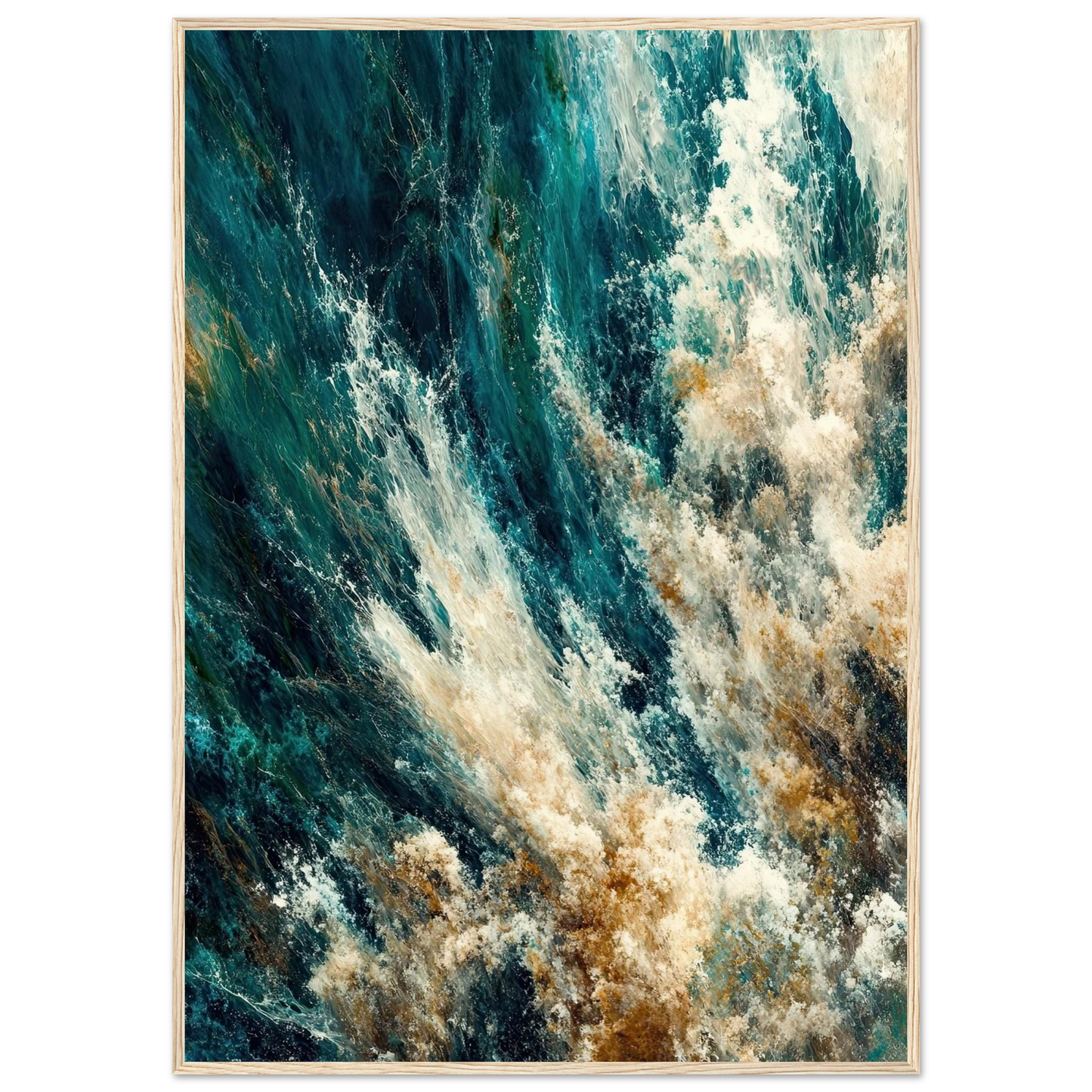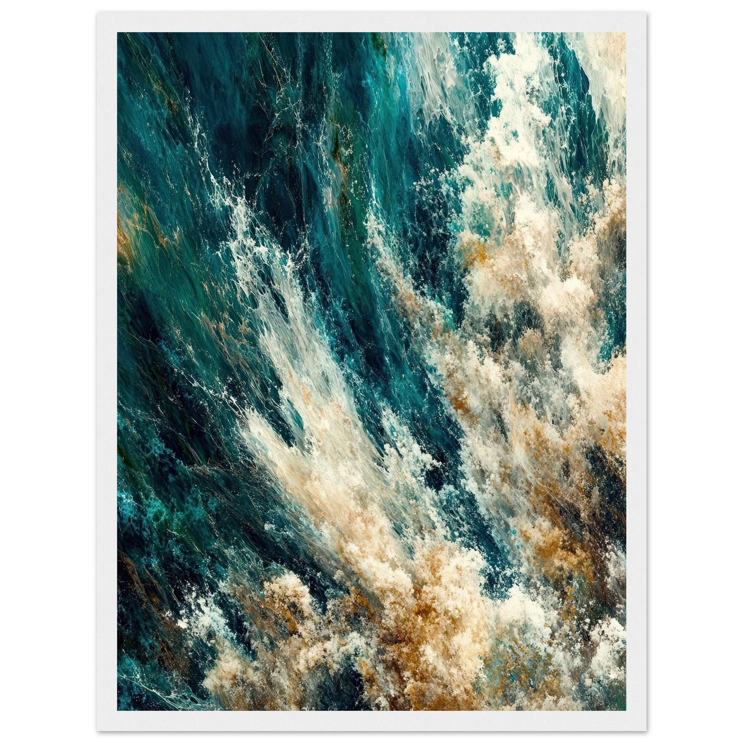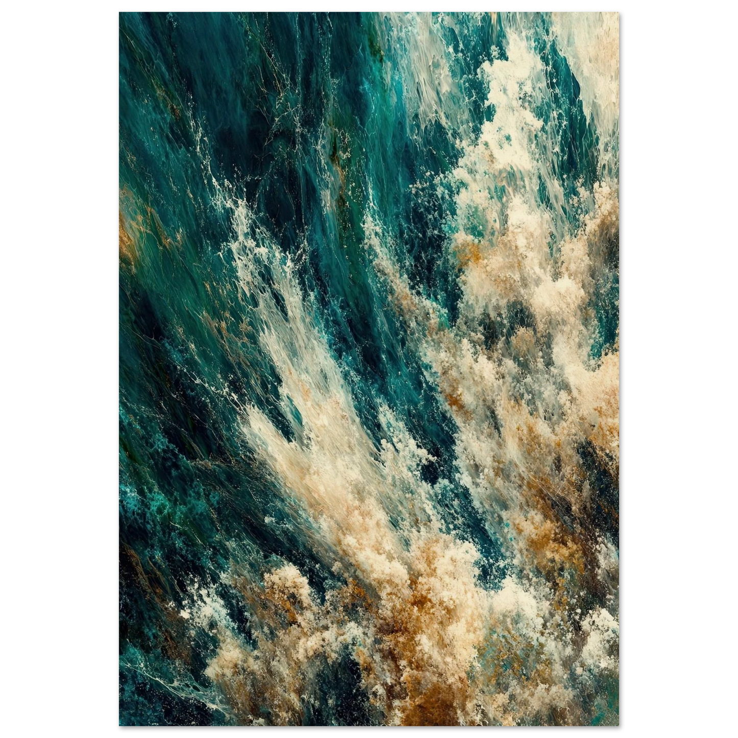 En intens eksplosjon av farger og bevegelse, der turkis, hvitt og brunt smelter sammen som en bølge i full kraft. Et visuelt adrenalinkick som gir rommet energi og dybde.
