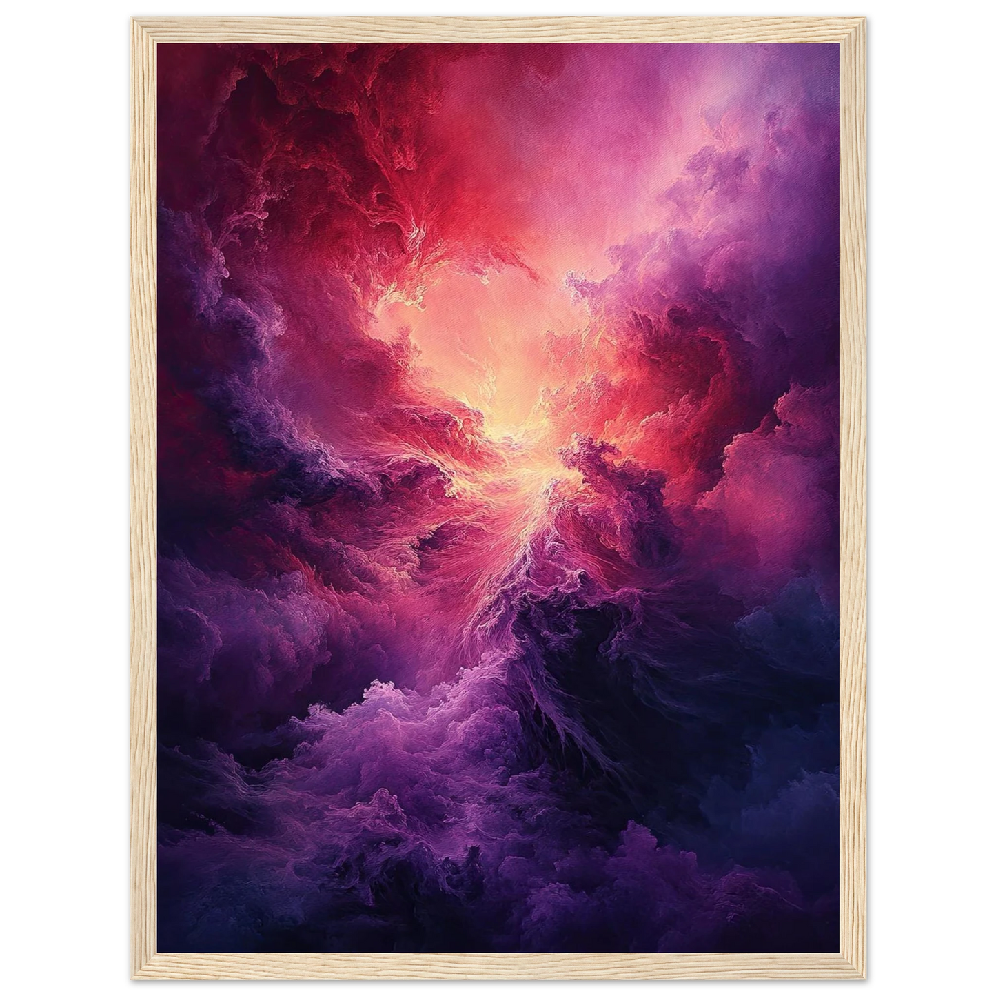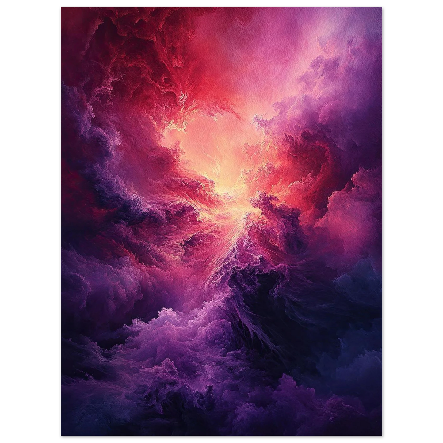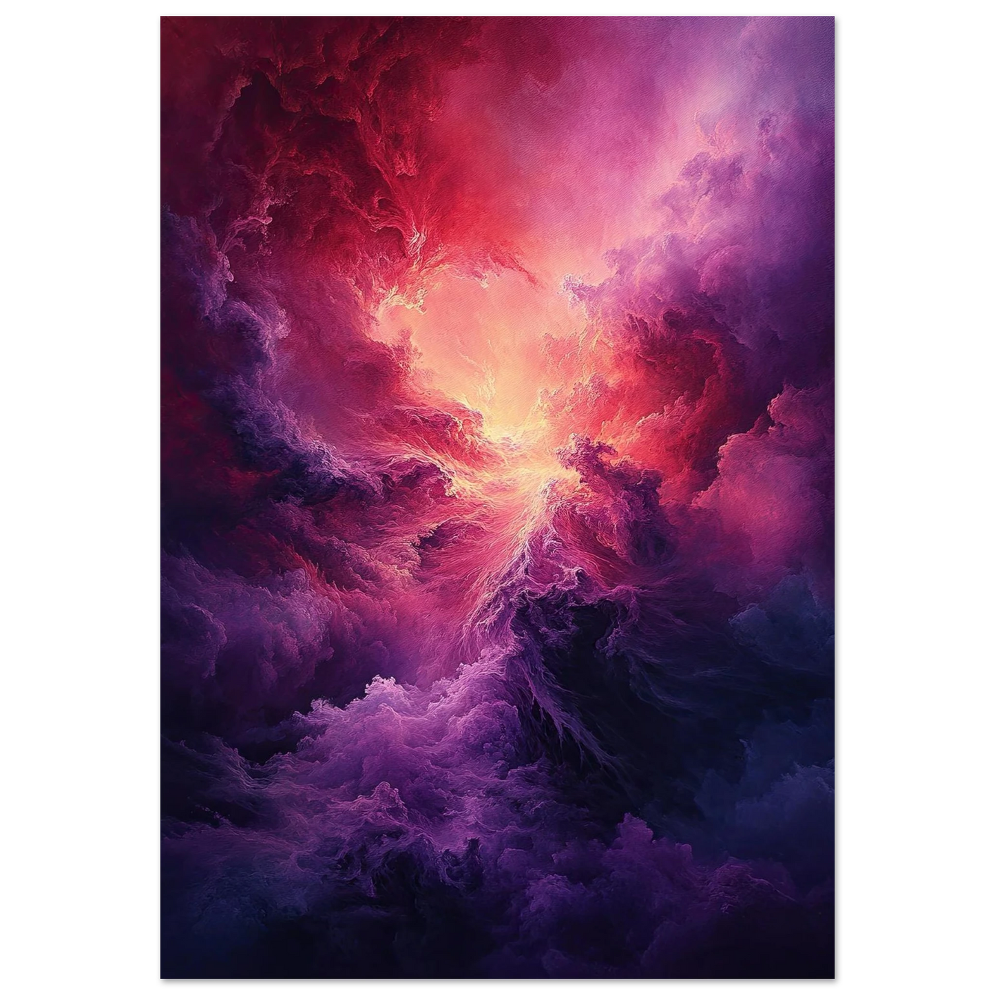 Et episk og drømmende kunstverk som skildrer en eksplosjon av lys midt i et hav av lilla og røde skyformasjoner. Bildet føles som et glimt av universets kraft – mystisk, vakkert og uendelig.