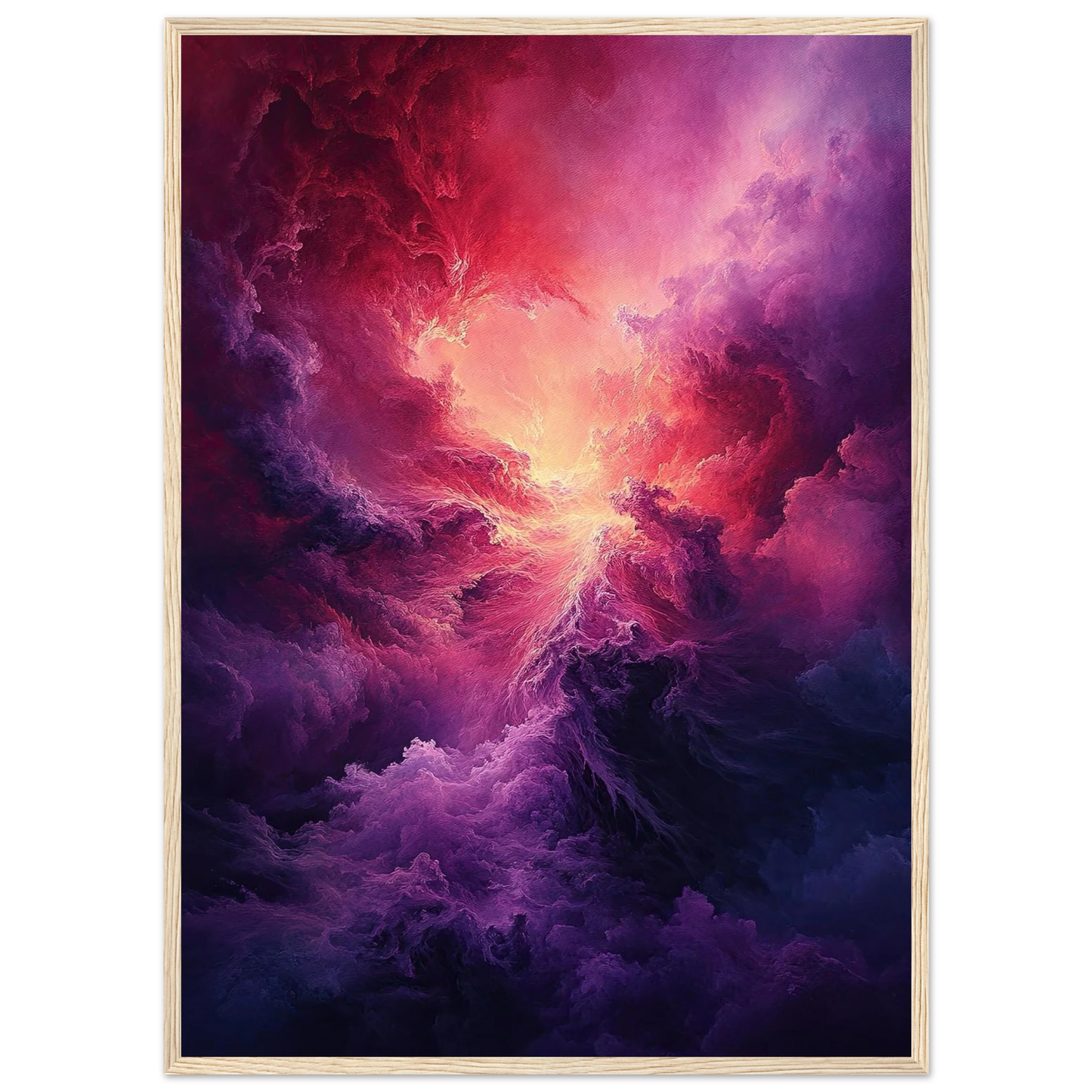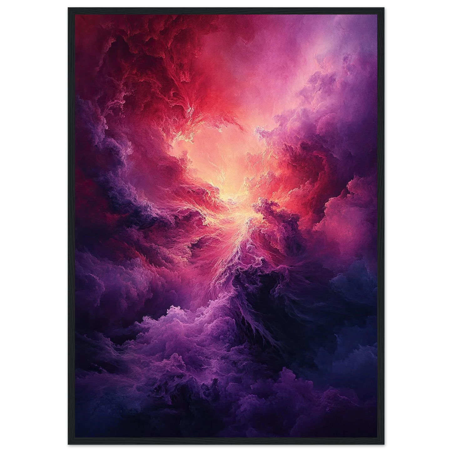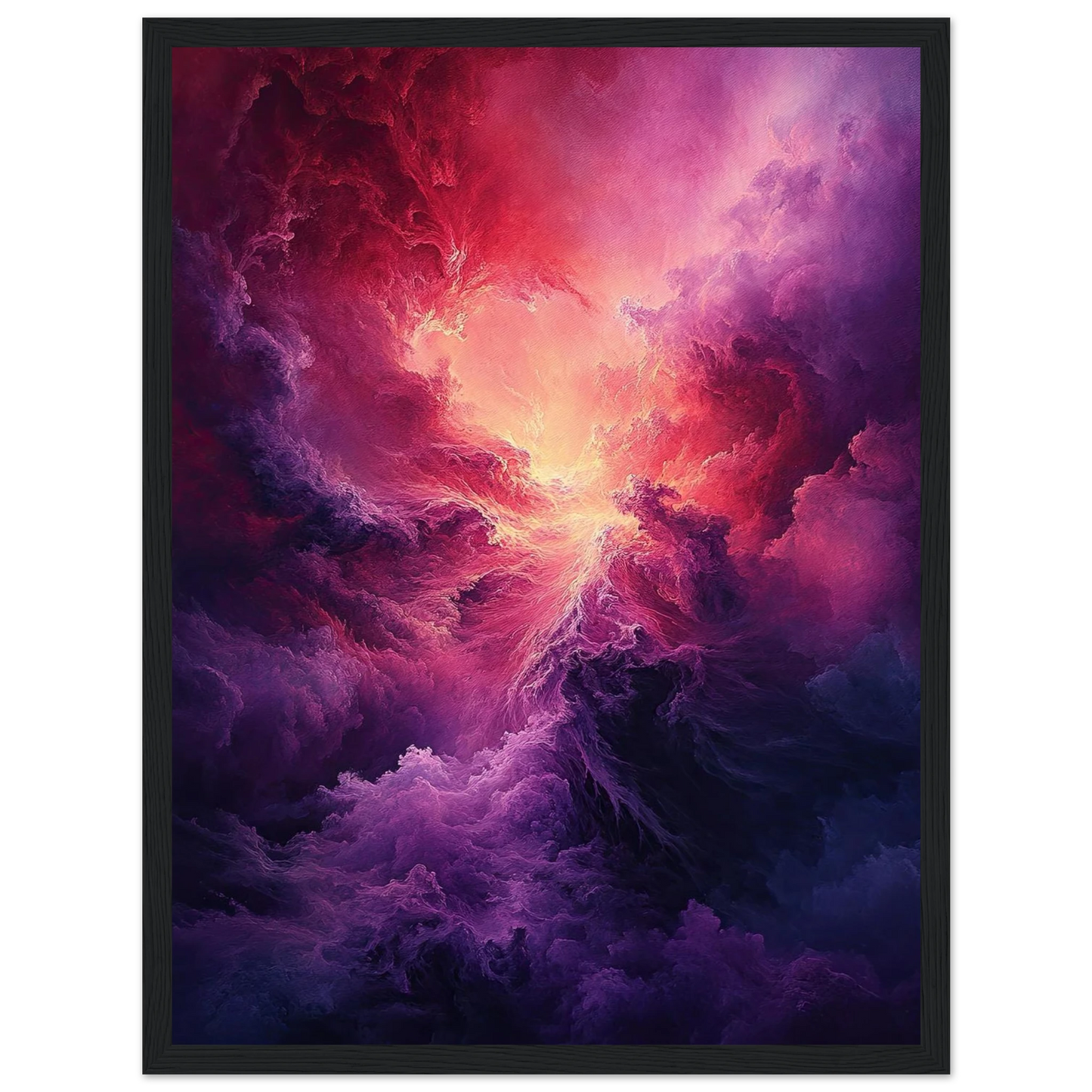 Et episk og drømmende kunstverk som skildrer en eksplosjon av lys midt i et hav av lilla og røde skyformasjoner. Bildet føles som et glimt av universets kraft – mystisk, vakkert og uendelig.