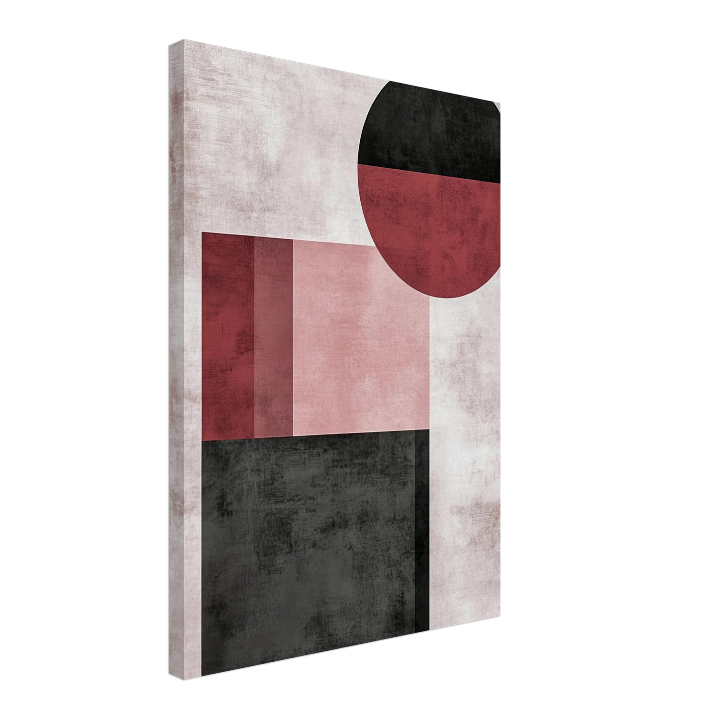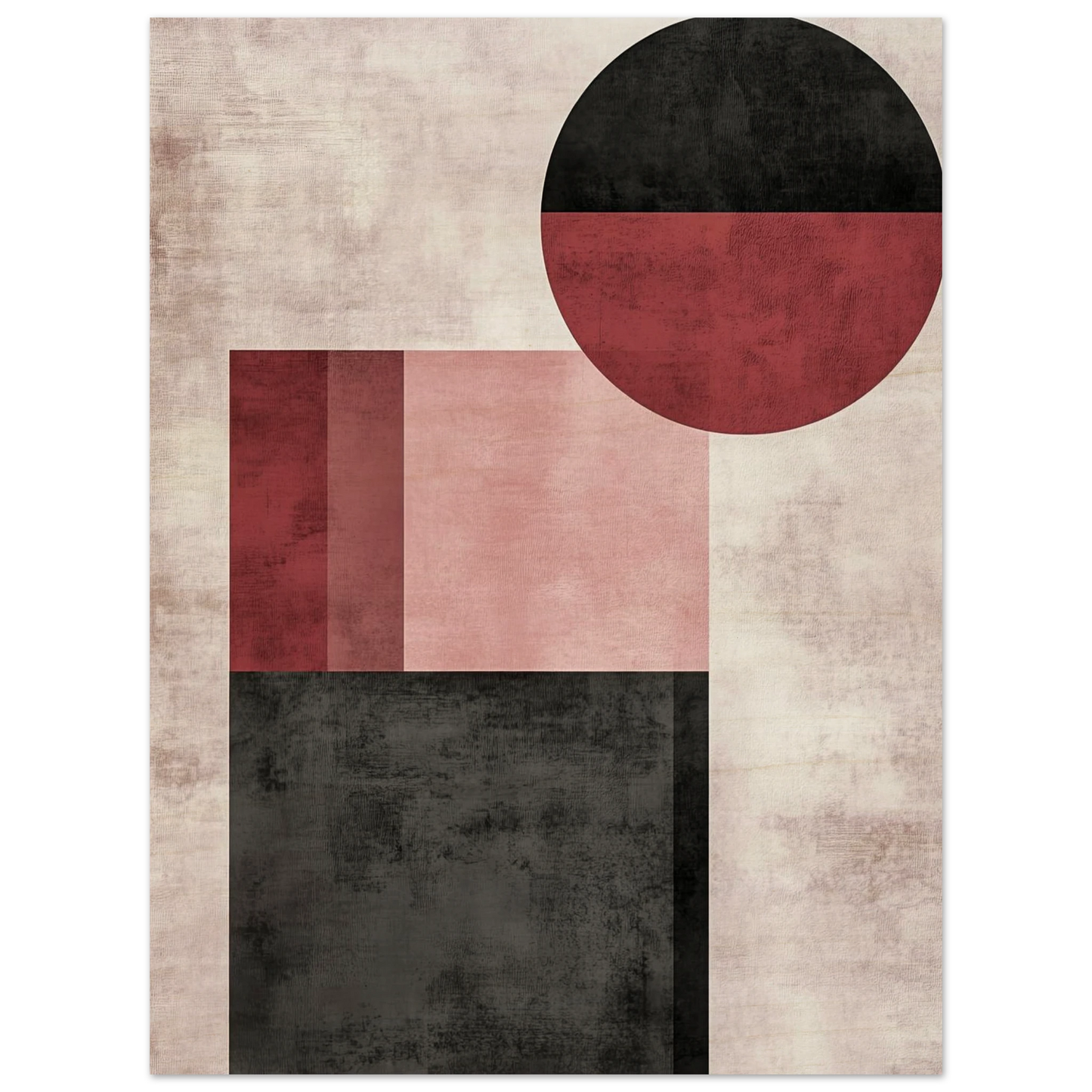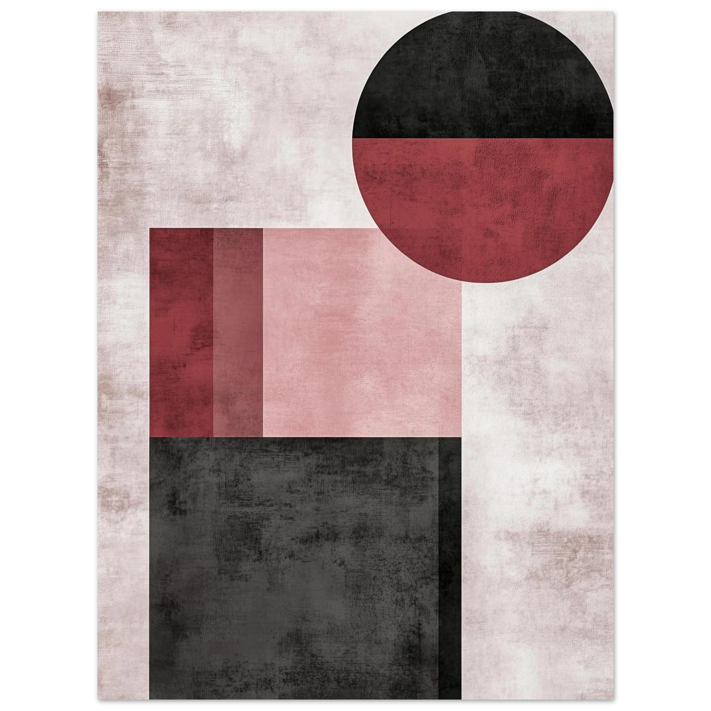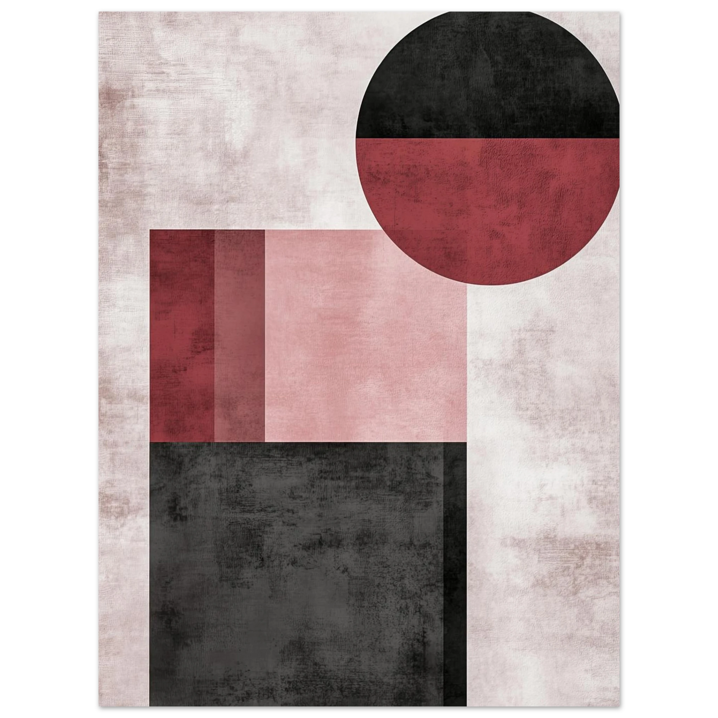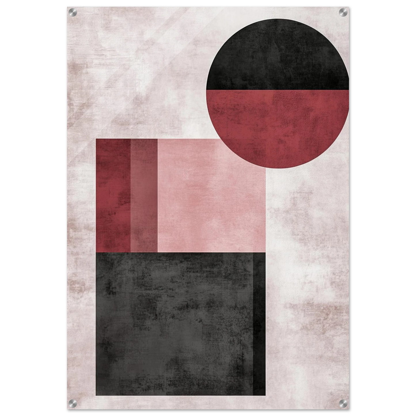 Et moderne geometrisk kunstverk der sirkler og rektangler møtes i røde, rosa og sorte toner. Teksturen gir et håndmalt uttrykk som myker opp de stramme formene, og skaper en følelse av både struktur og varme. Perfekt som et blikkfang i en minimalistisk eller nordisk-inspirert interiørstil.