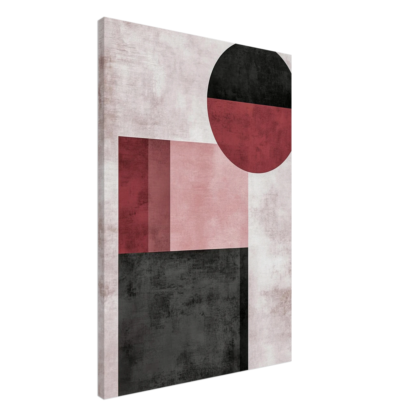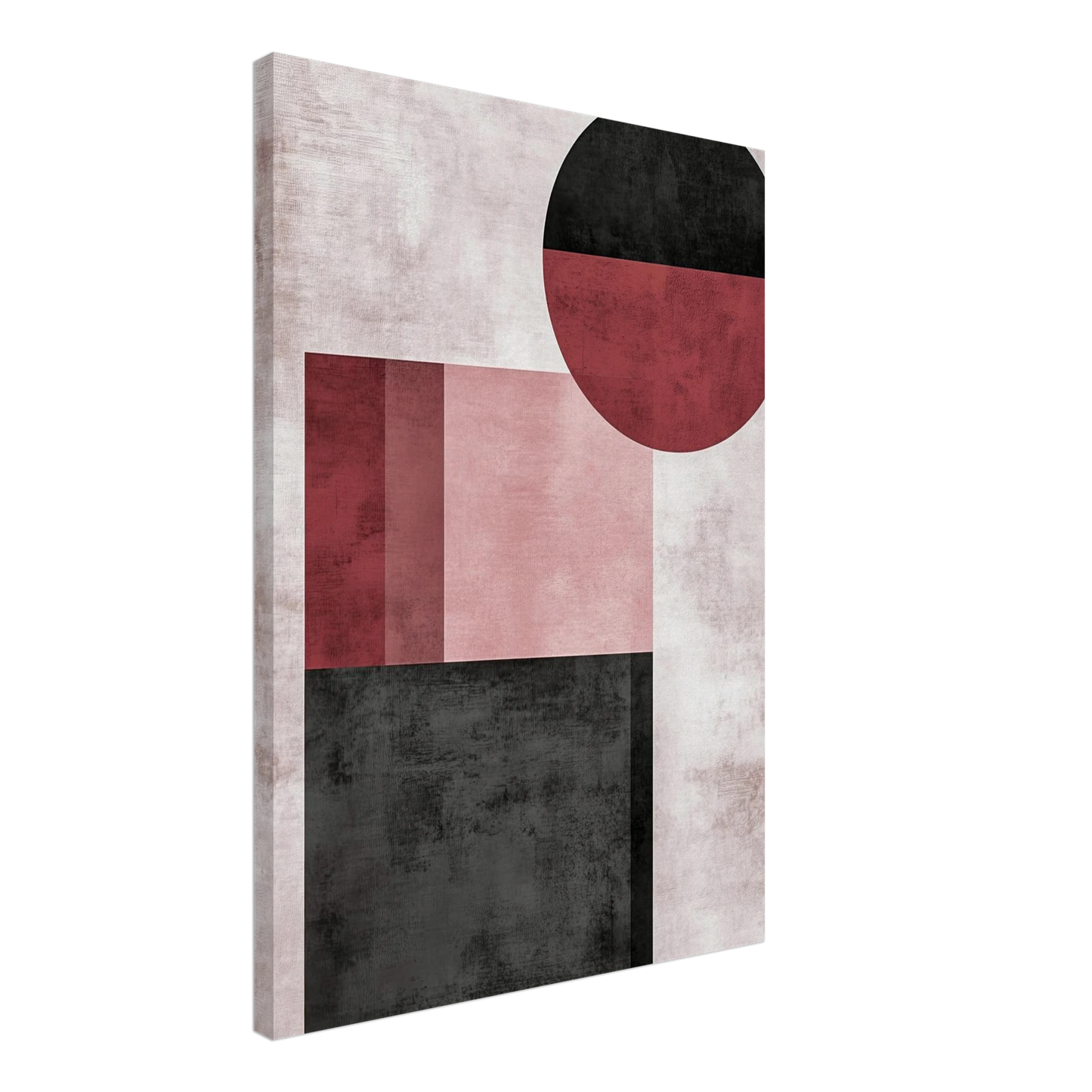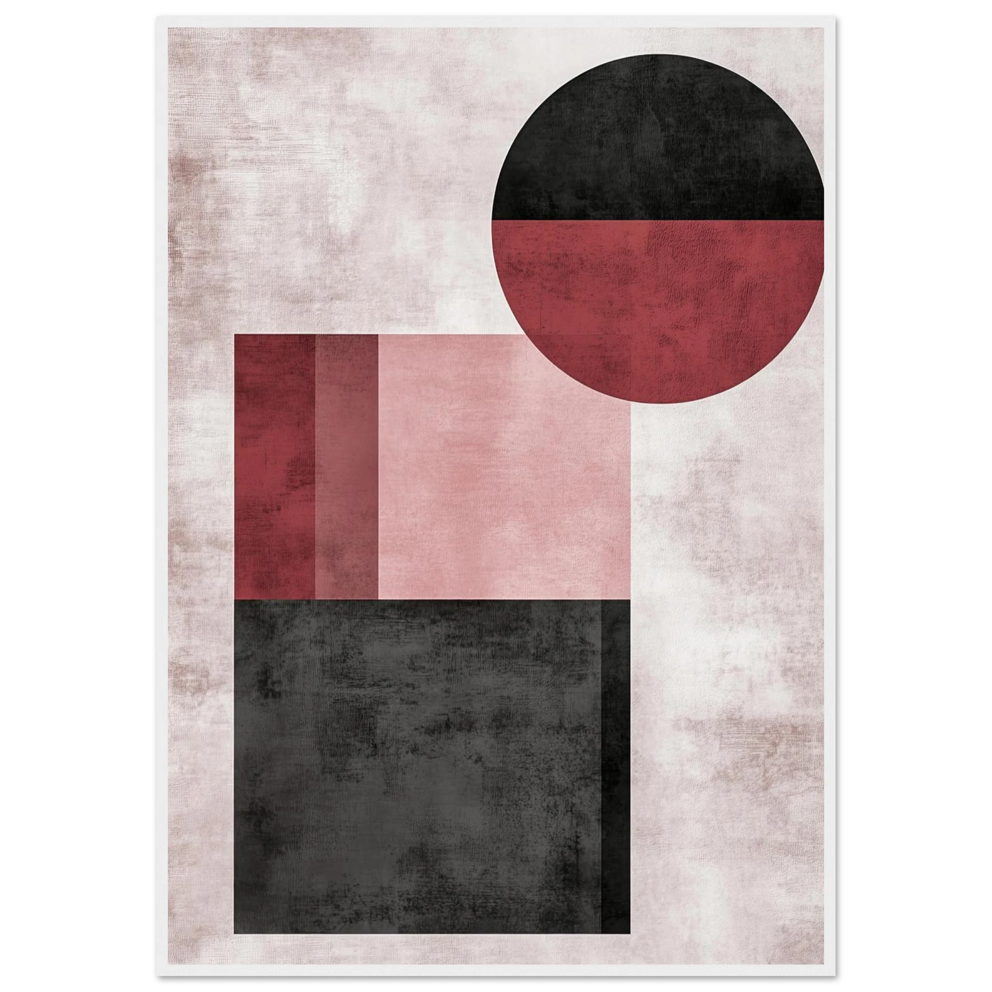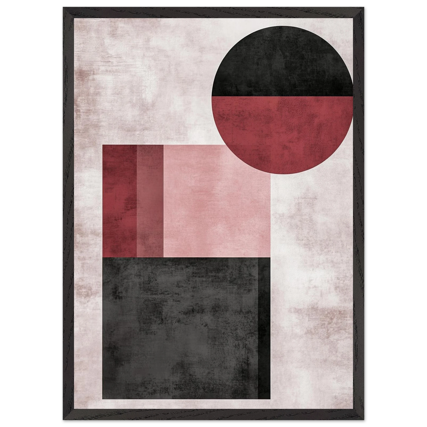 Et moderne geometrisk kunstverk der sirkler og rektangler møtes i røde, rosa og sorte toner. Teksturen gir et håndmalt uttrykk som myker opp de stramme formene, og skaper en følelse av både struktur og varme. Perfekt som et blikkfang i en minimalistisk eller nordisk-inspirert interiørstil.