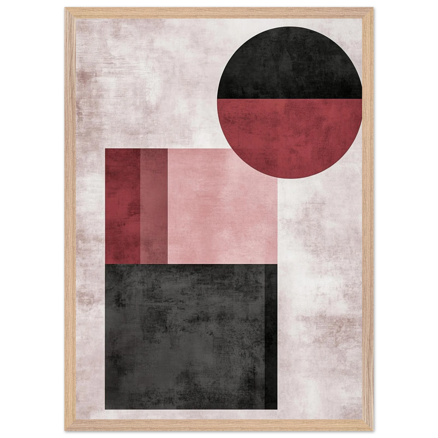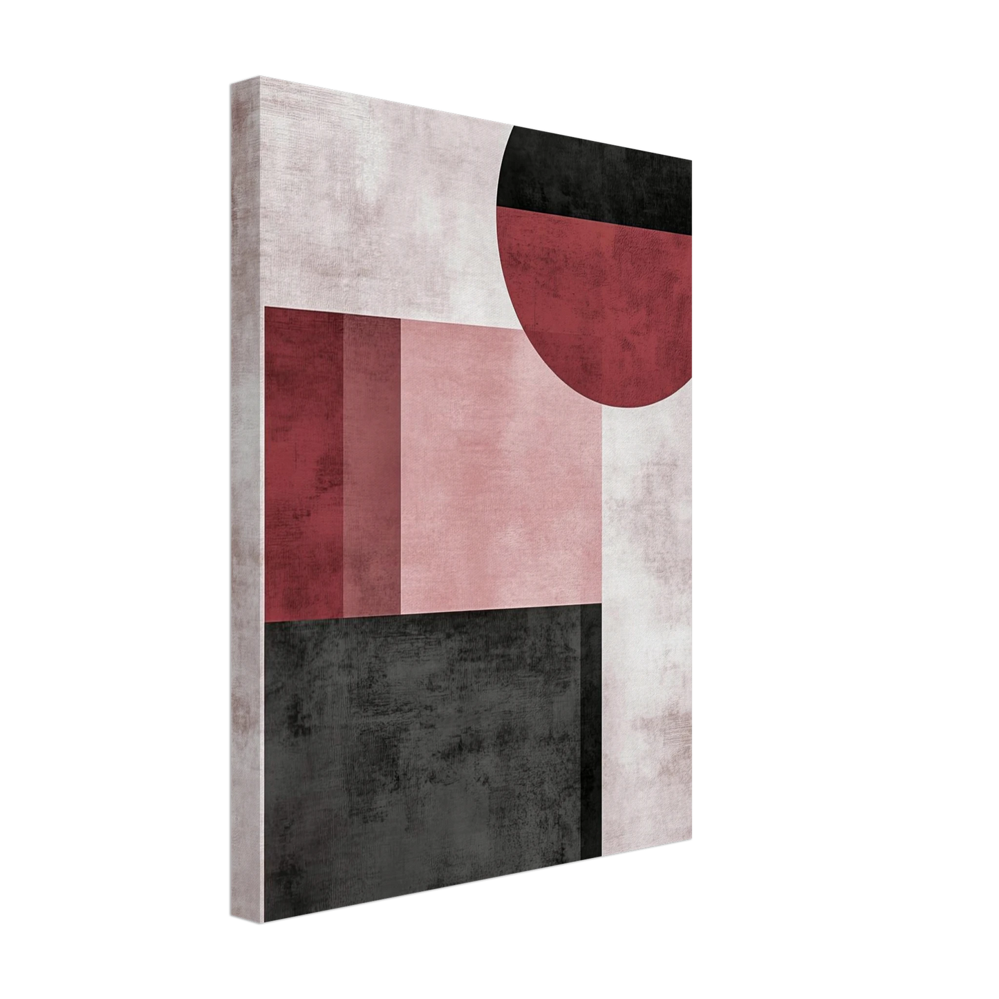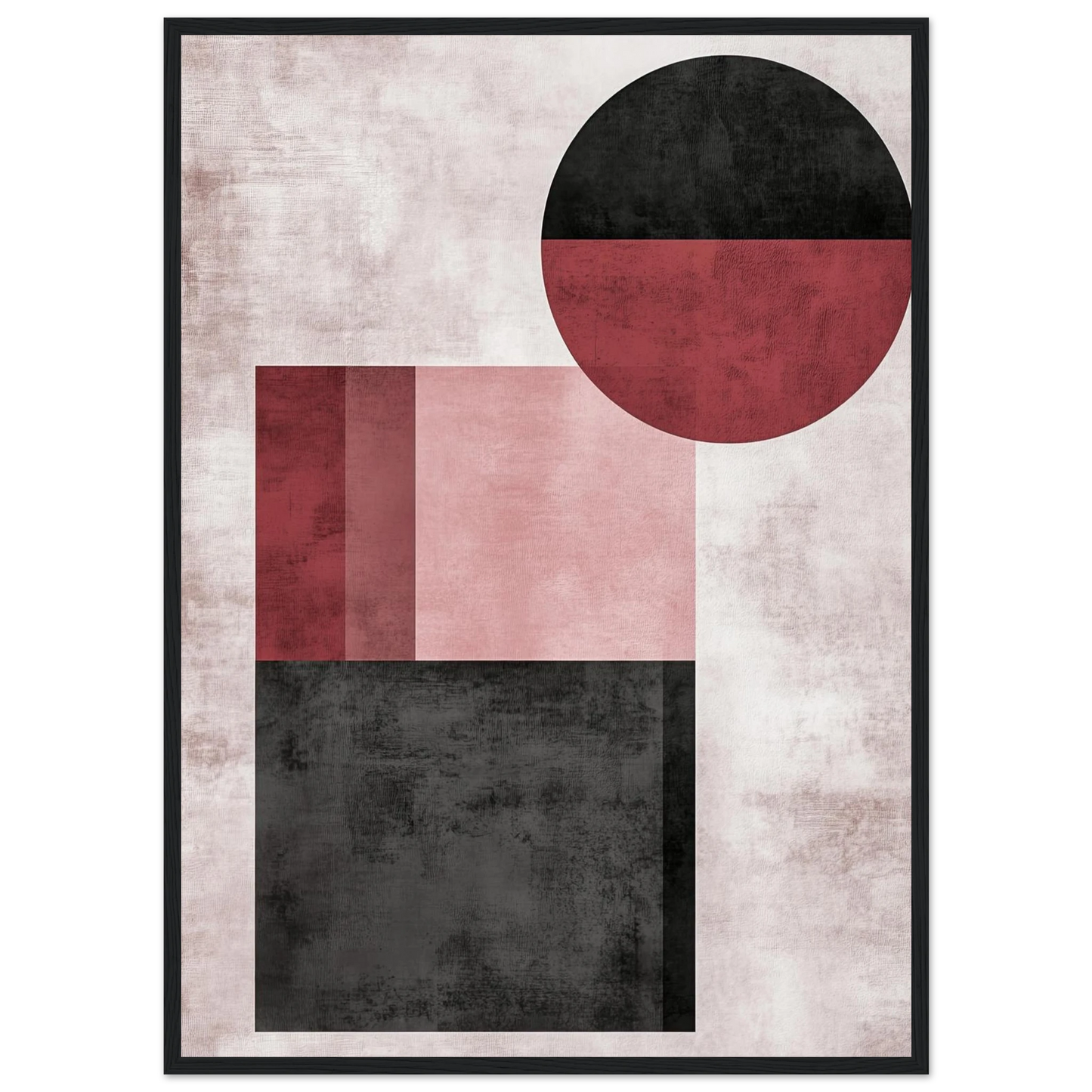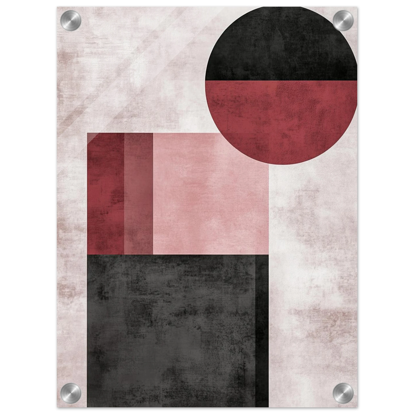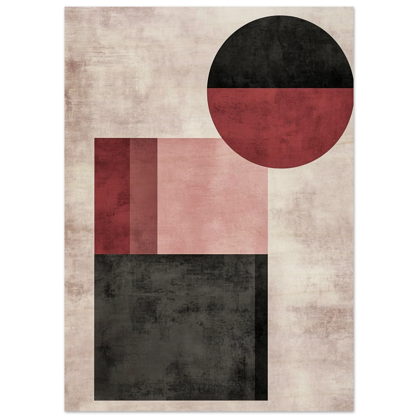 Et moderne geometrisk kunstverk der sirkler og rektangler møtes i røde, rosa og sorte toner. Teksturen gir et håndmalt uttrykk som myker opp de stramme formene, og skaper en følelse av både struktur og varme. Perfekt som et blikkfang i en minimalistisk eller nordisk-inspirert interiørstil.