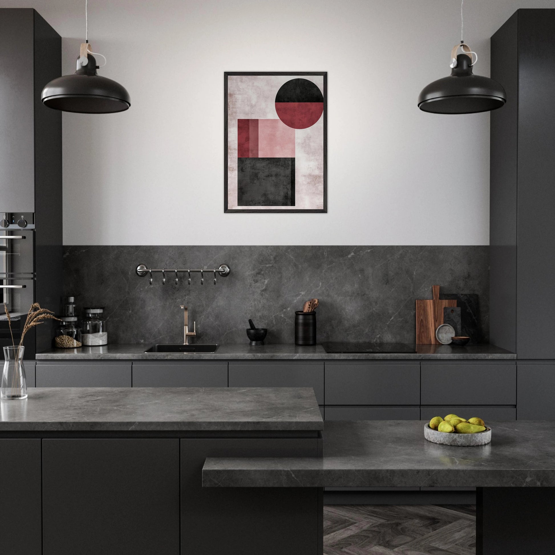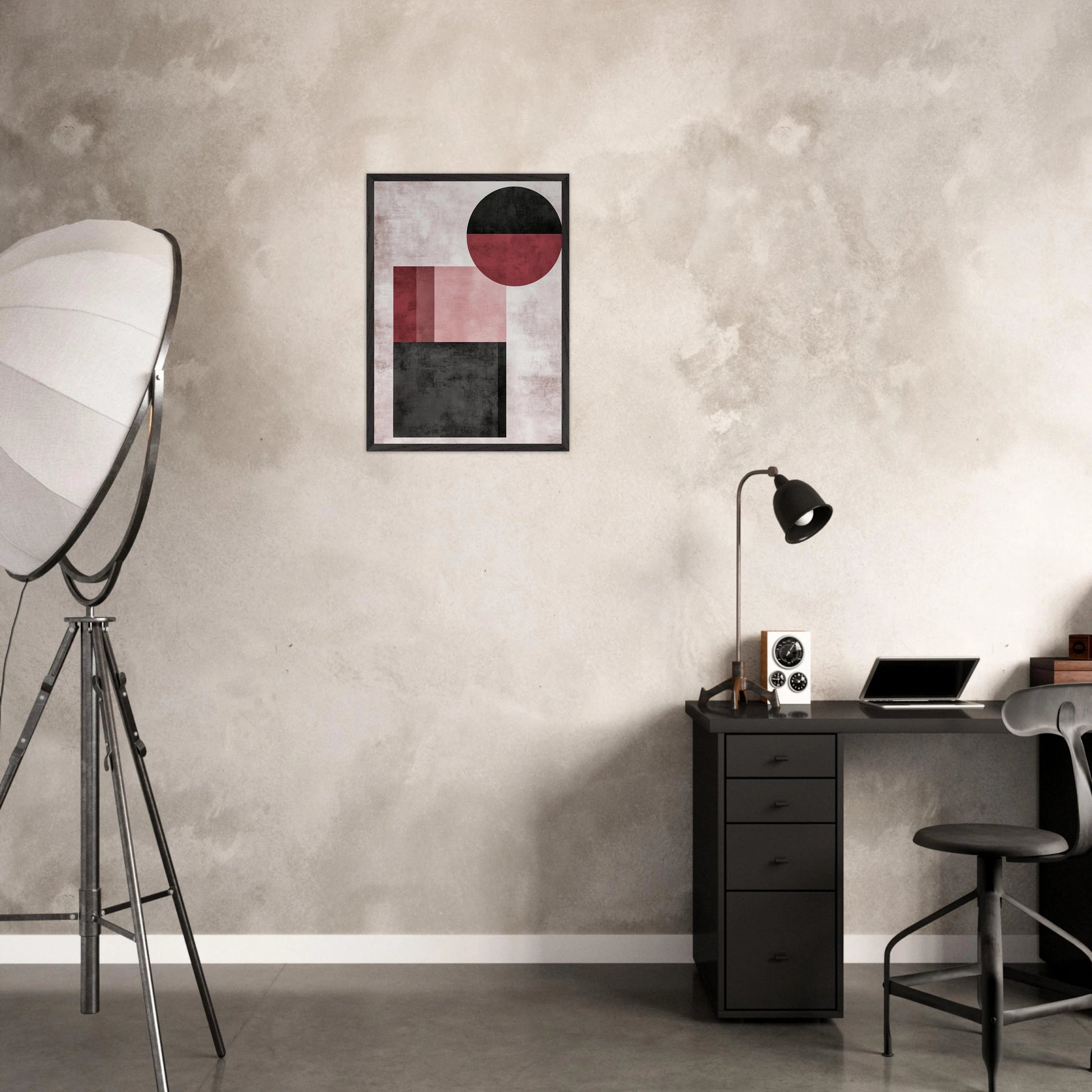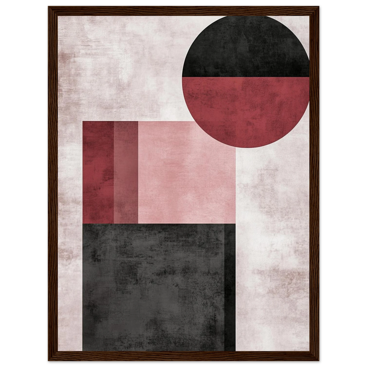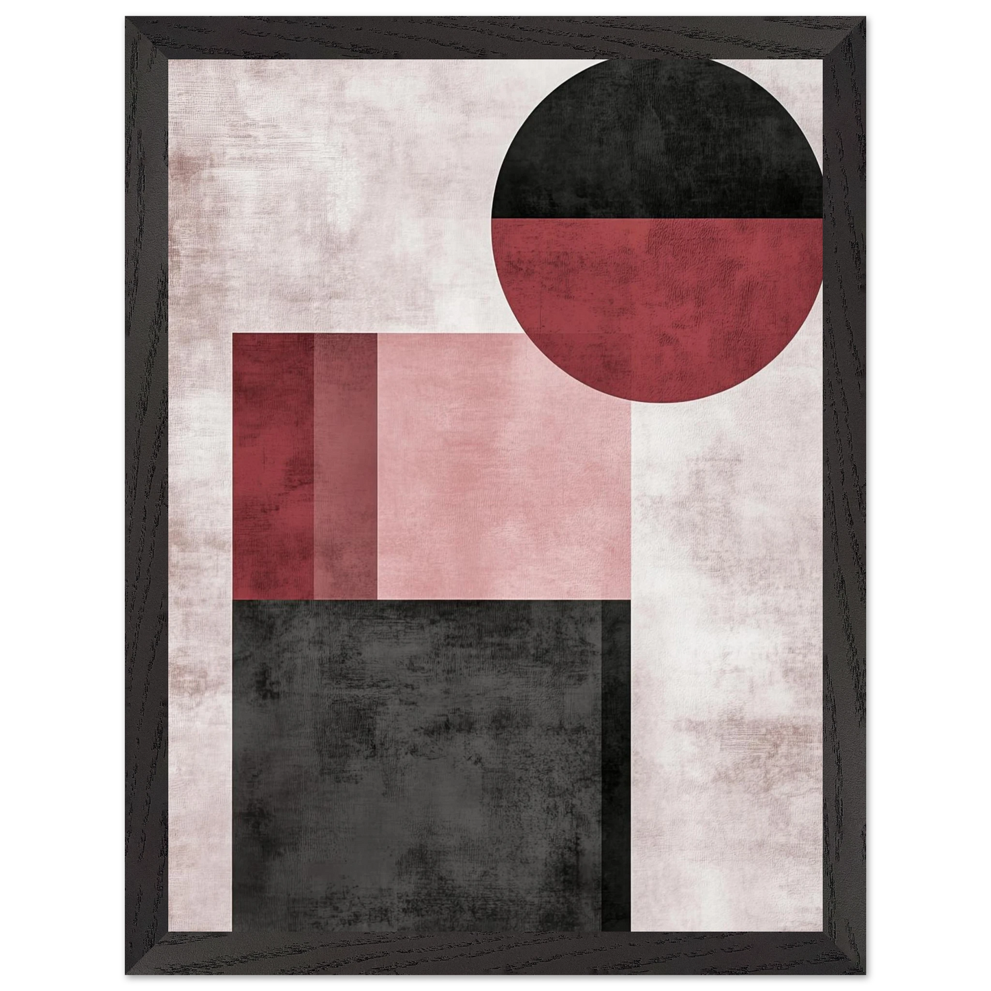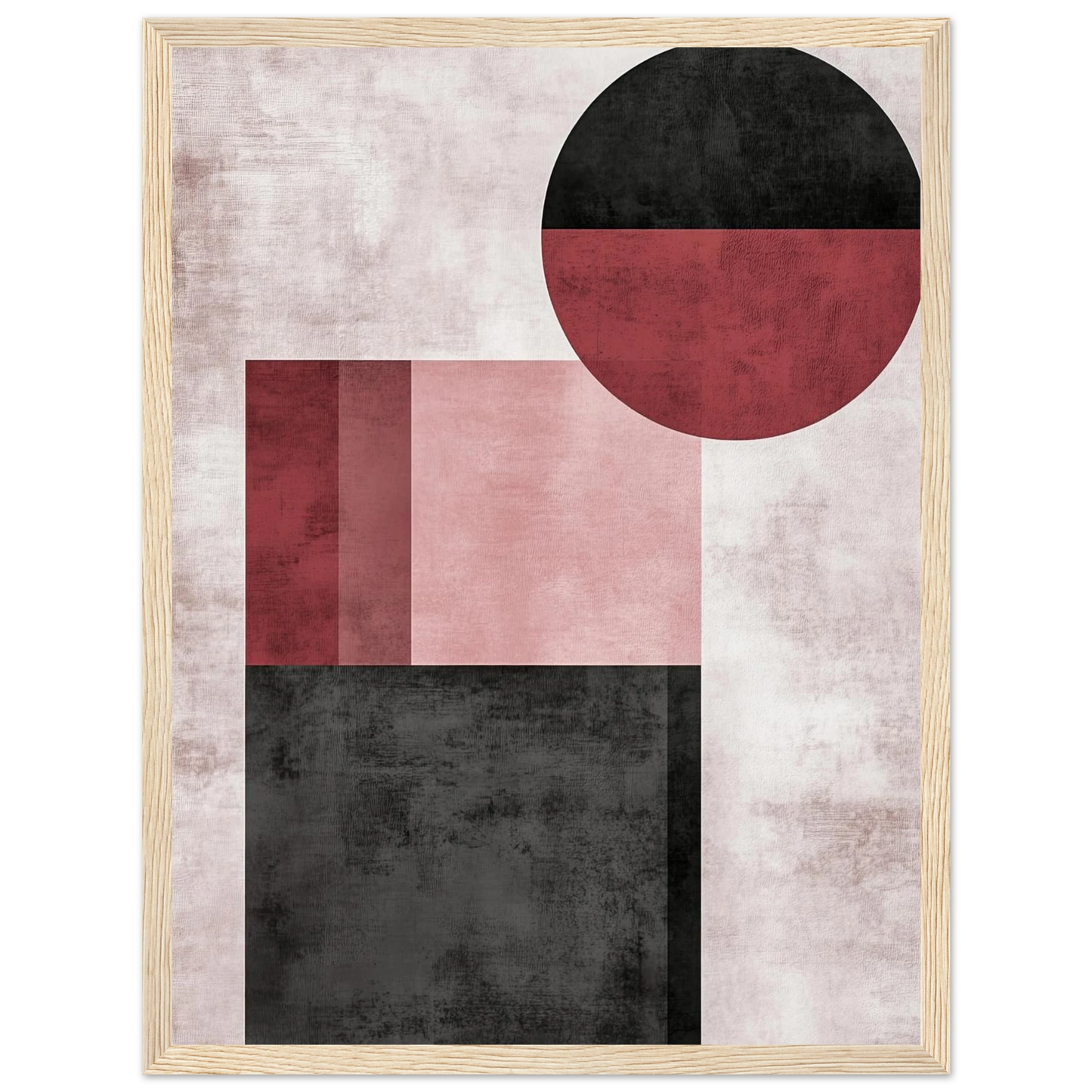 Et moderne geometrisk kunstverk der sirkler og rektangler møtes i røde, rosa og sorte toner. Teksturen gir et håndmalt uttrykk som myker opp de stramme formene, og skaper en følelse av både struktur og varme. Perfekt som et blikkfang i en minimalistisk eller nordisk-inspirert interiørstil.