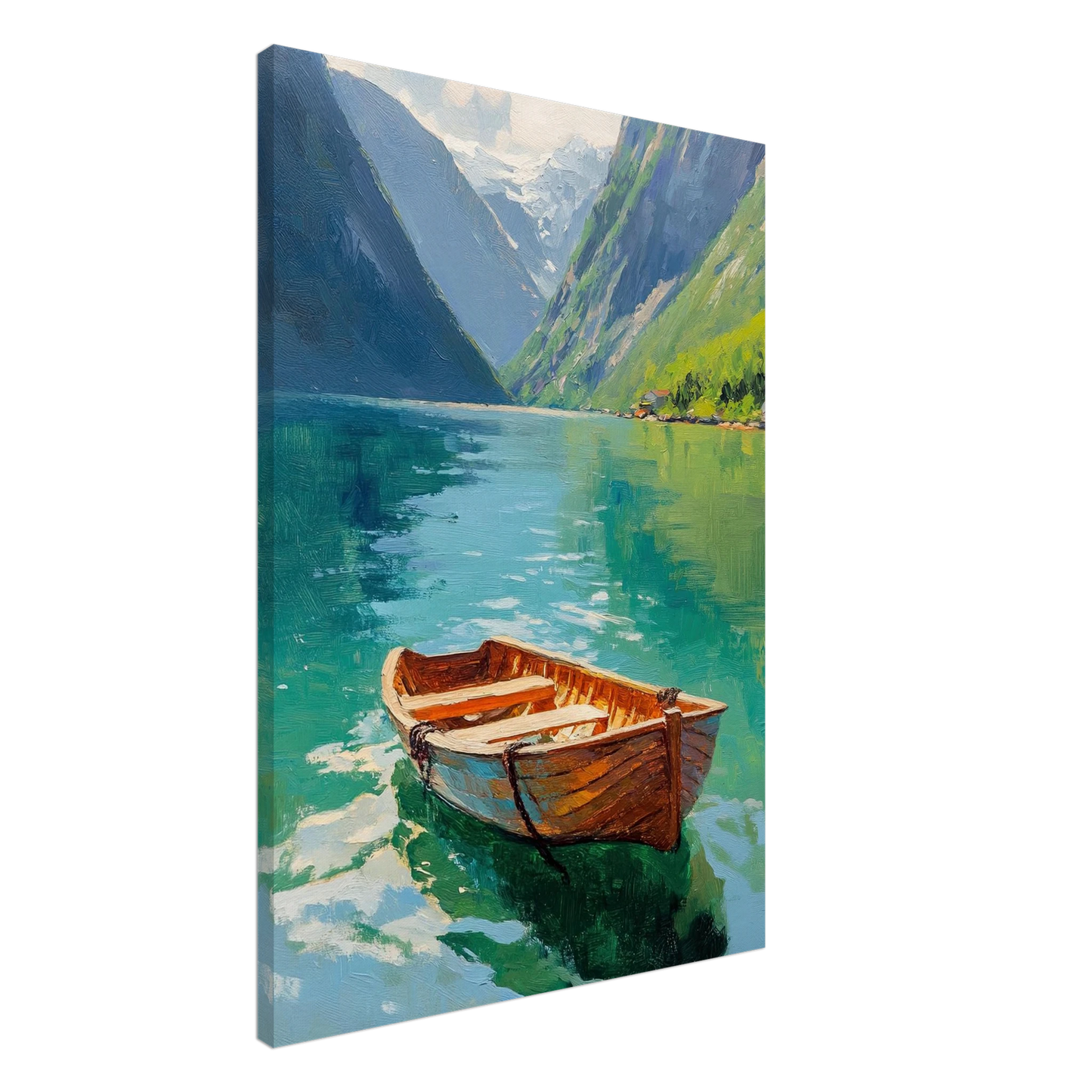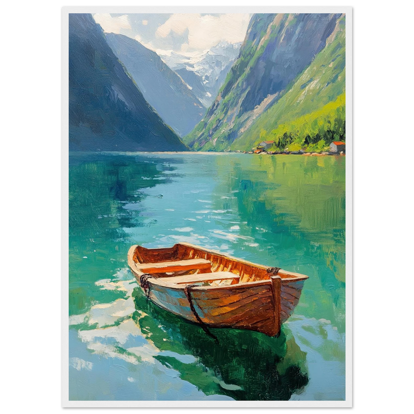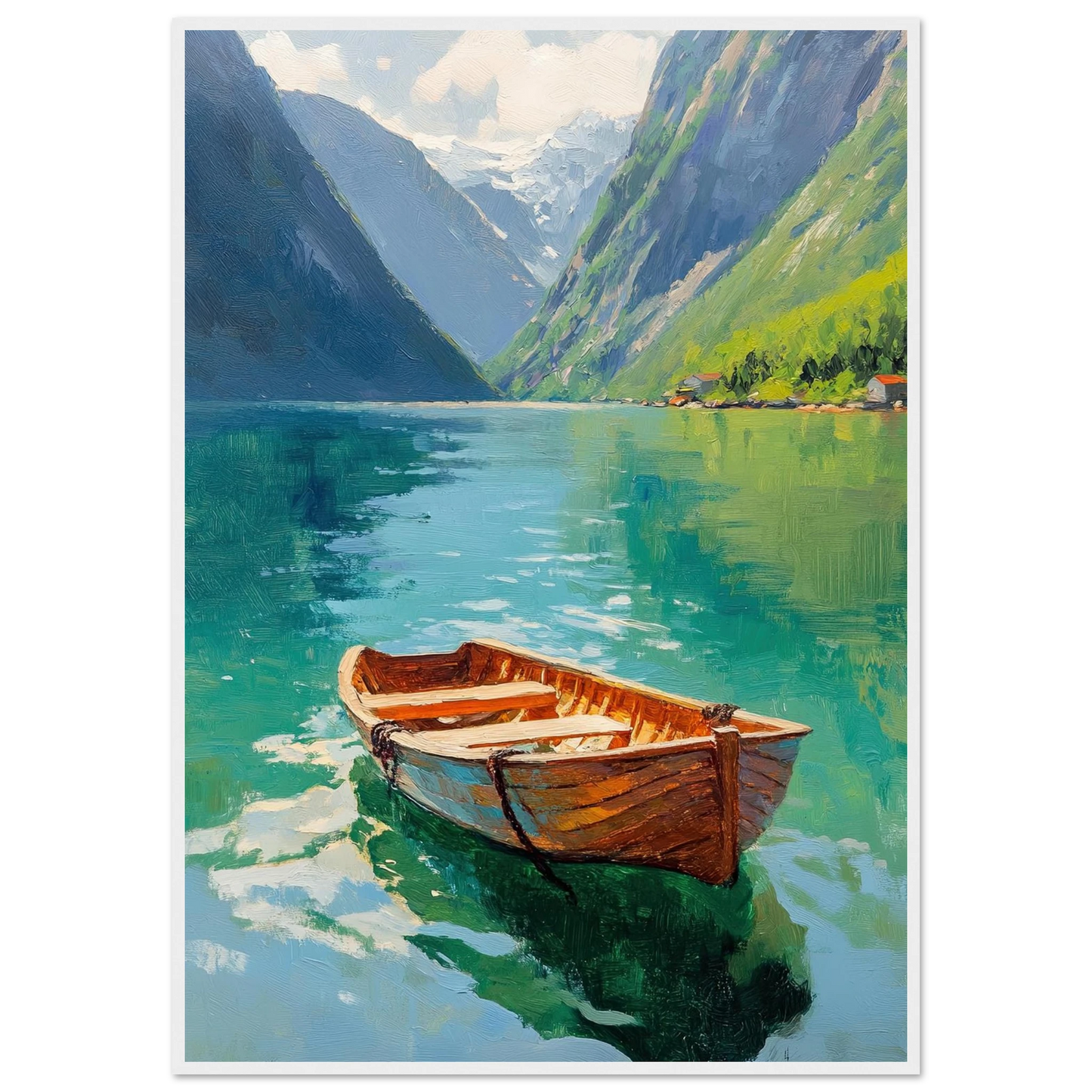Et vakkert motiv der en enkel trebåt flyter rolig på smaragdgrønt fjordvann, omgitt av mektige fjell som speiler seg i overflaten. Bildet formidler en følelse av ro, stillhet og nærhet til naturens essens. En tidløs skildring av norsk sommeridyll og fjordenes magi.