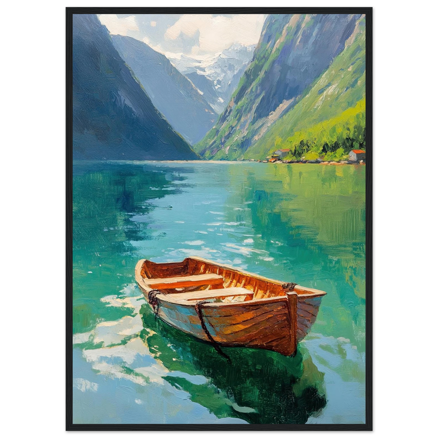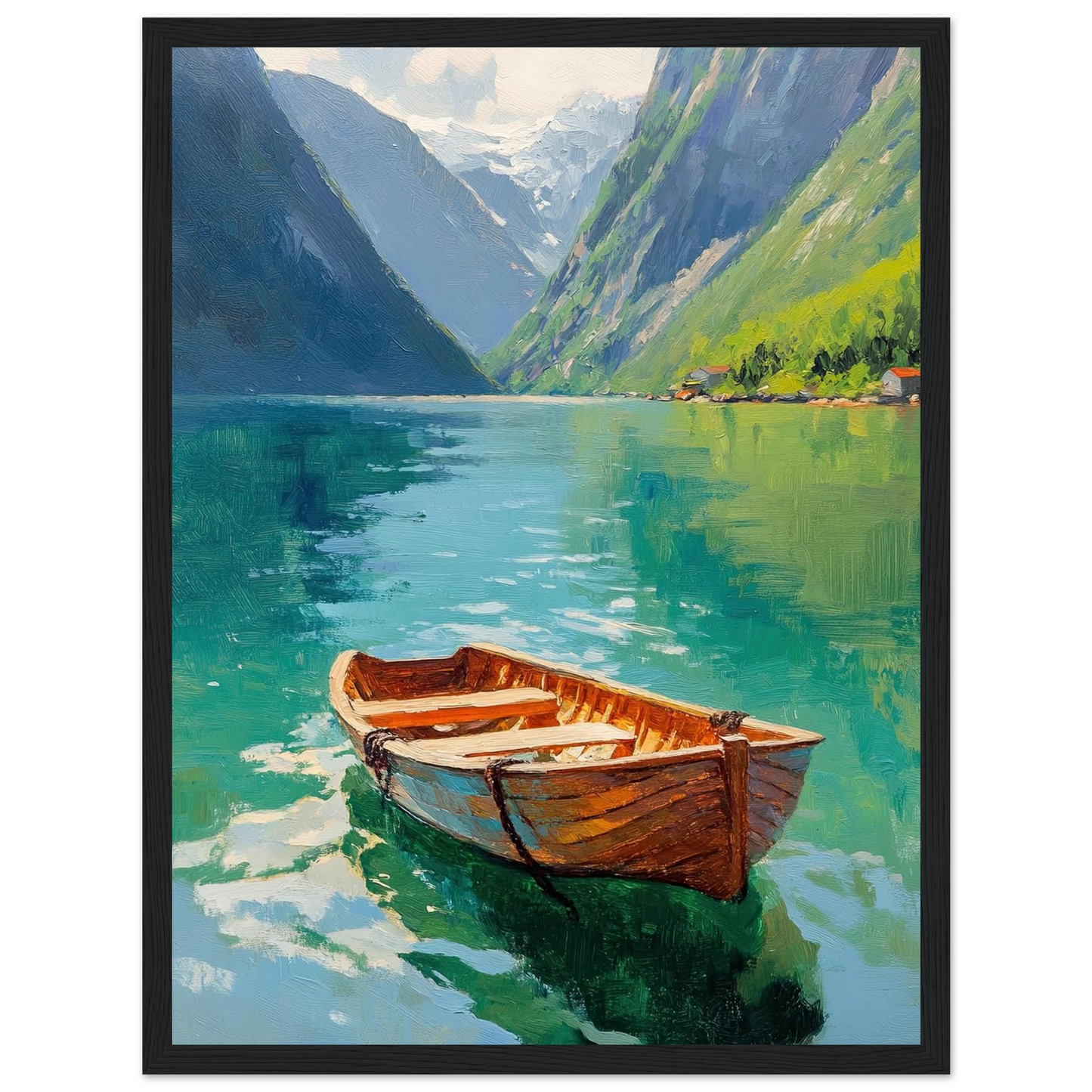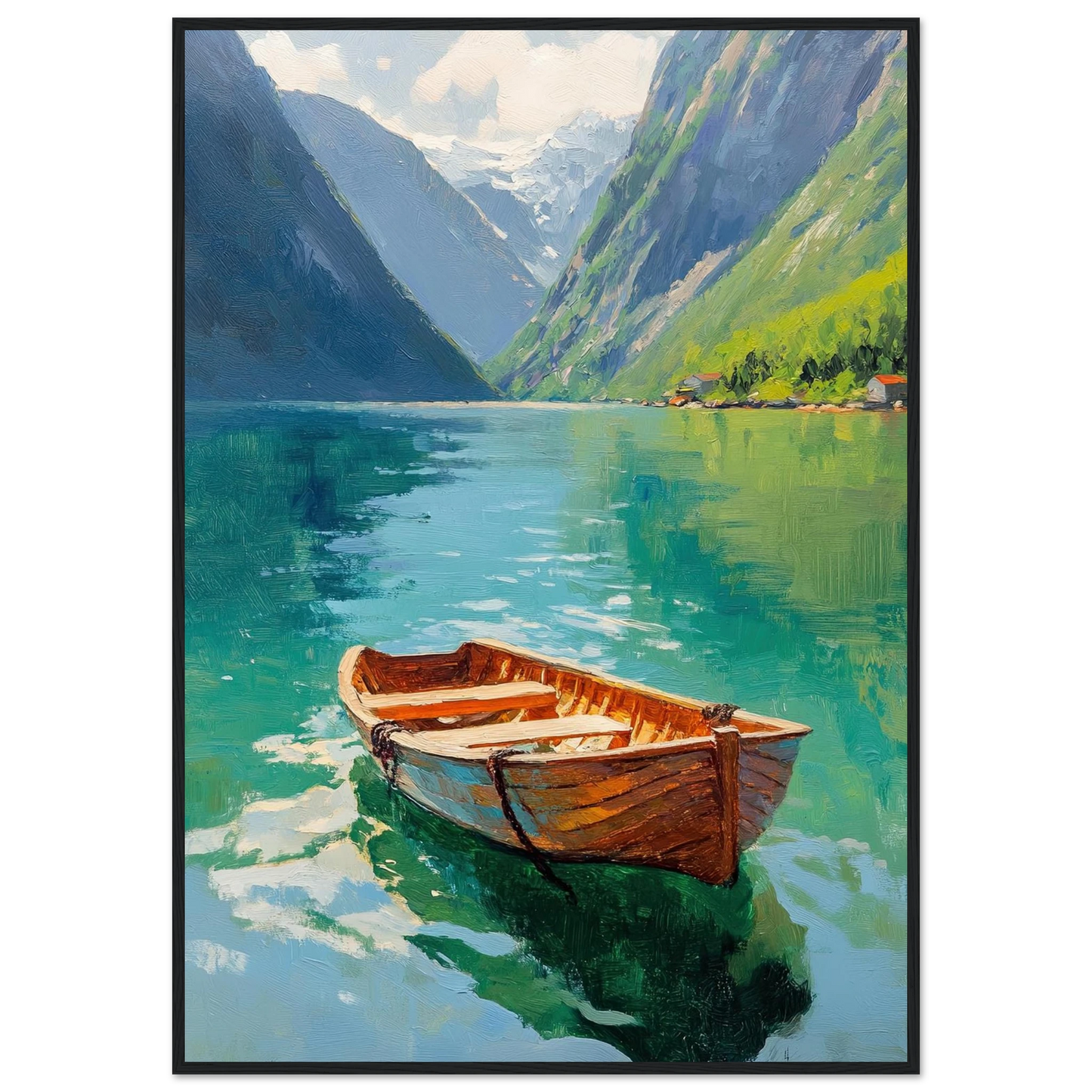 Et vakkert motiv der en enkel trebåt flyter rolig på smaragdgrønt fjordvann, omgitt av mektige fjell som speiler seg i overflaten. Bildet formidler en følelse av ro, stillhet og nærhet til naturens essens. En tidløs skildring av norsk sommeridyll og fjordenes magi.