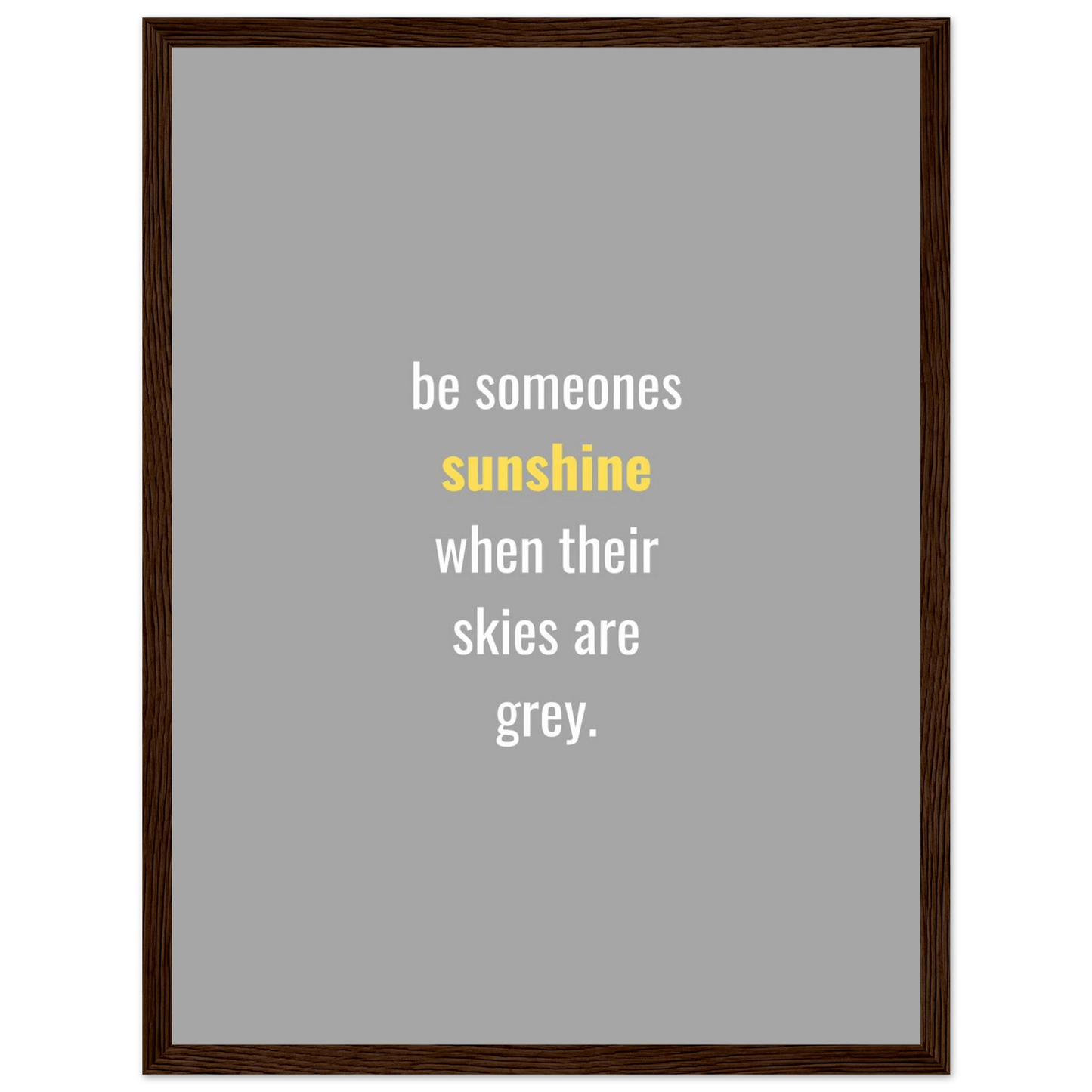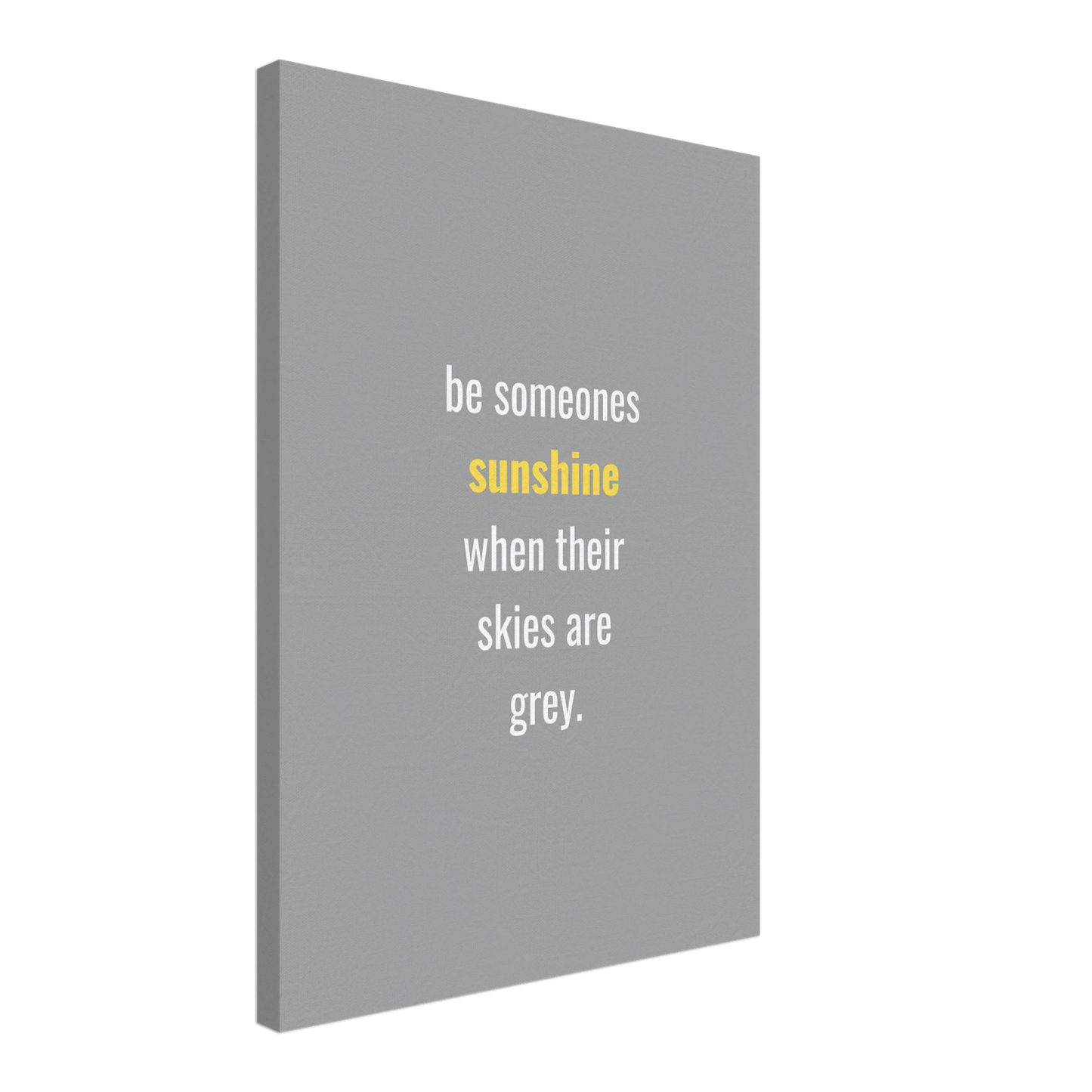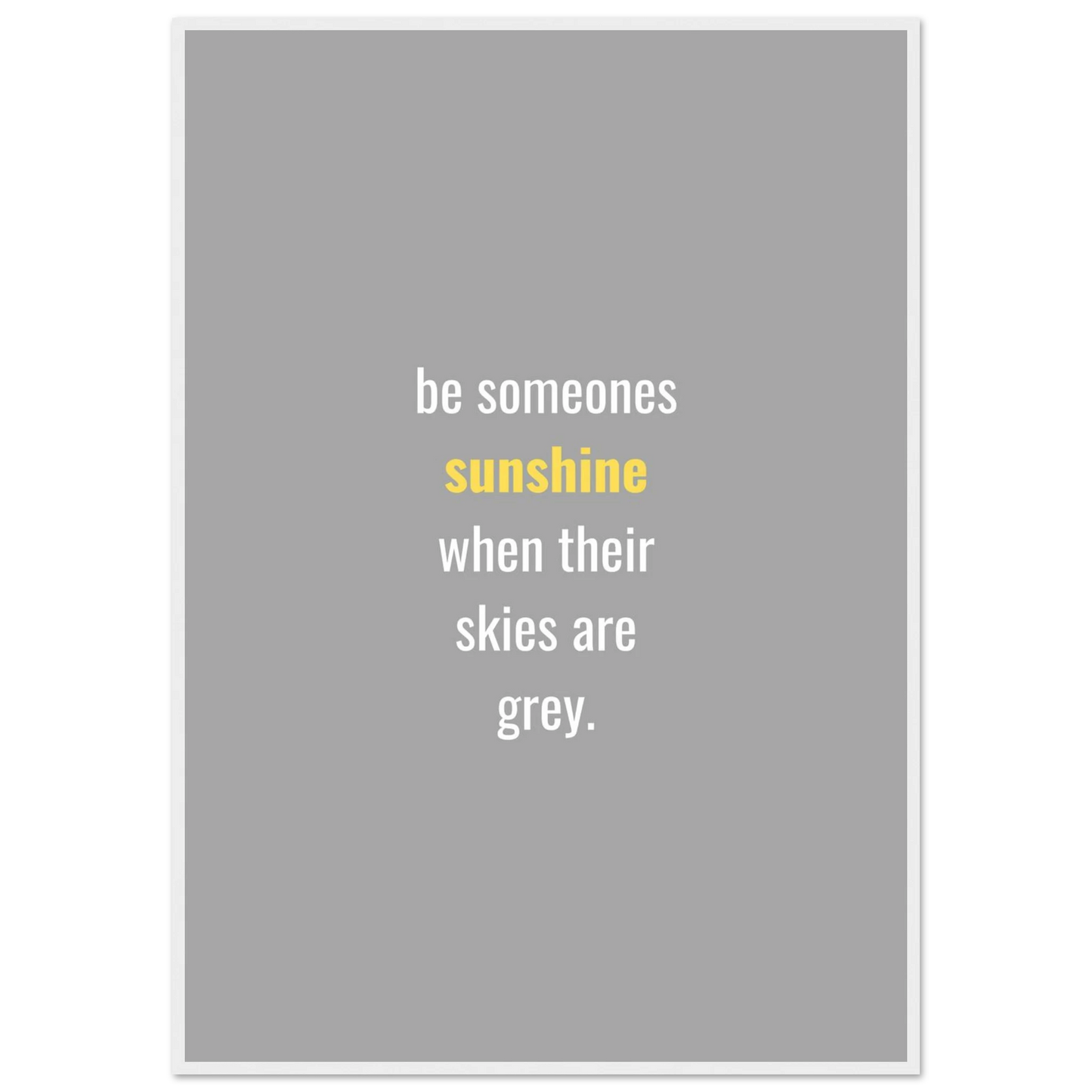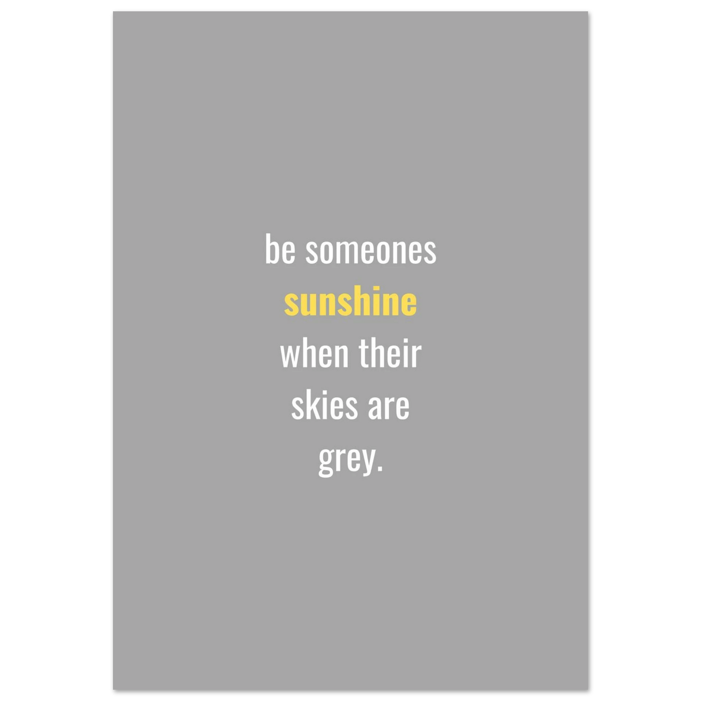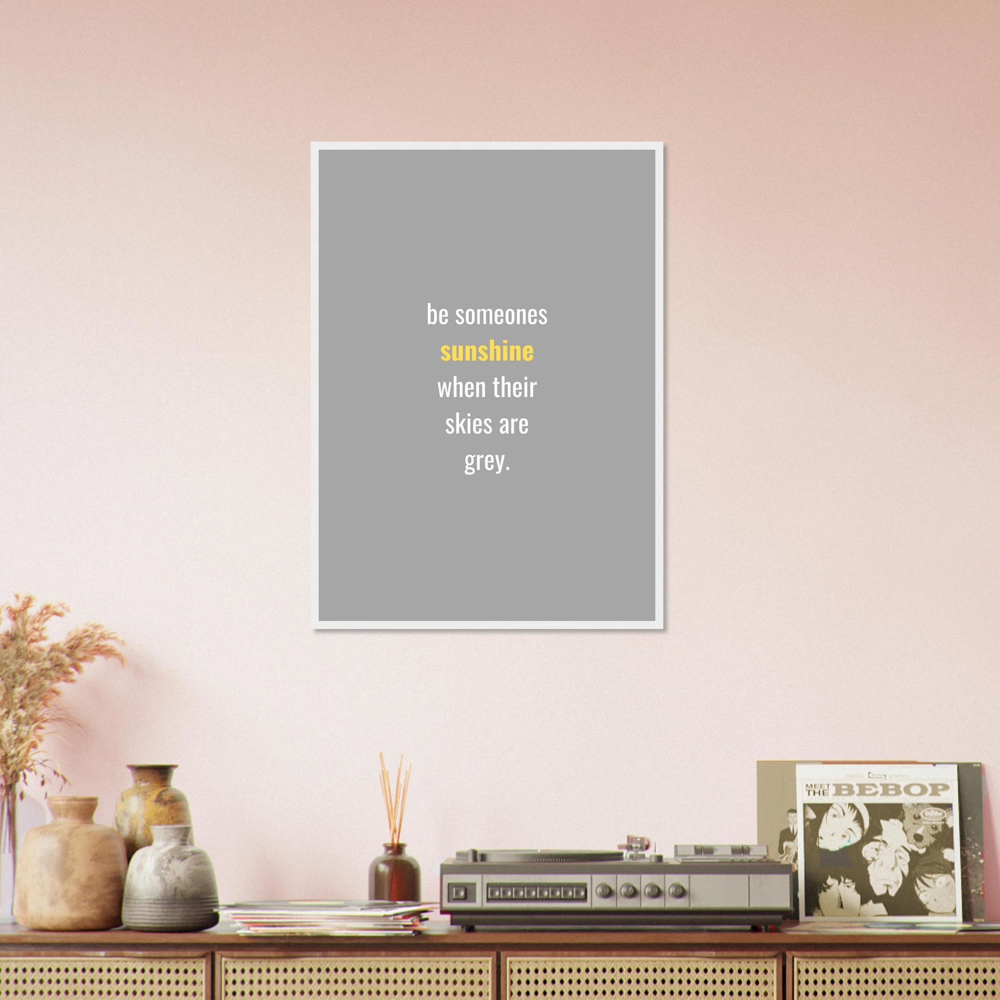 Et varmt og vennlig motiv som minner deg på kraften av små handlinger. Med enkel typografi på grå bakgrunn og ordet sunshine fremhevet i gult, symboliserer bildet hvordan positivitet kan skinne opp selv de mørkeste dager. Perfekt for å spre glede og skape en lysere atmosfære i rommet.