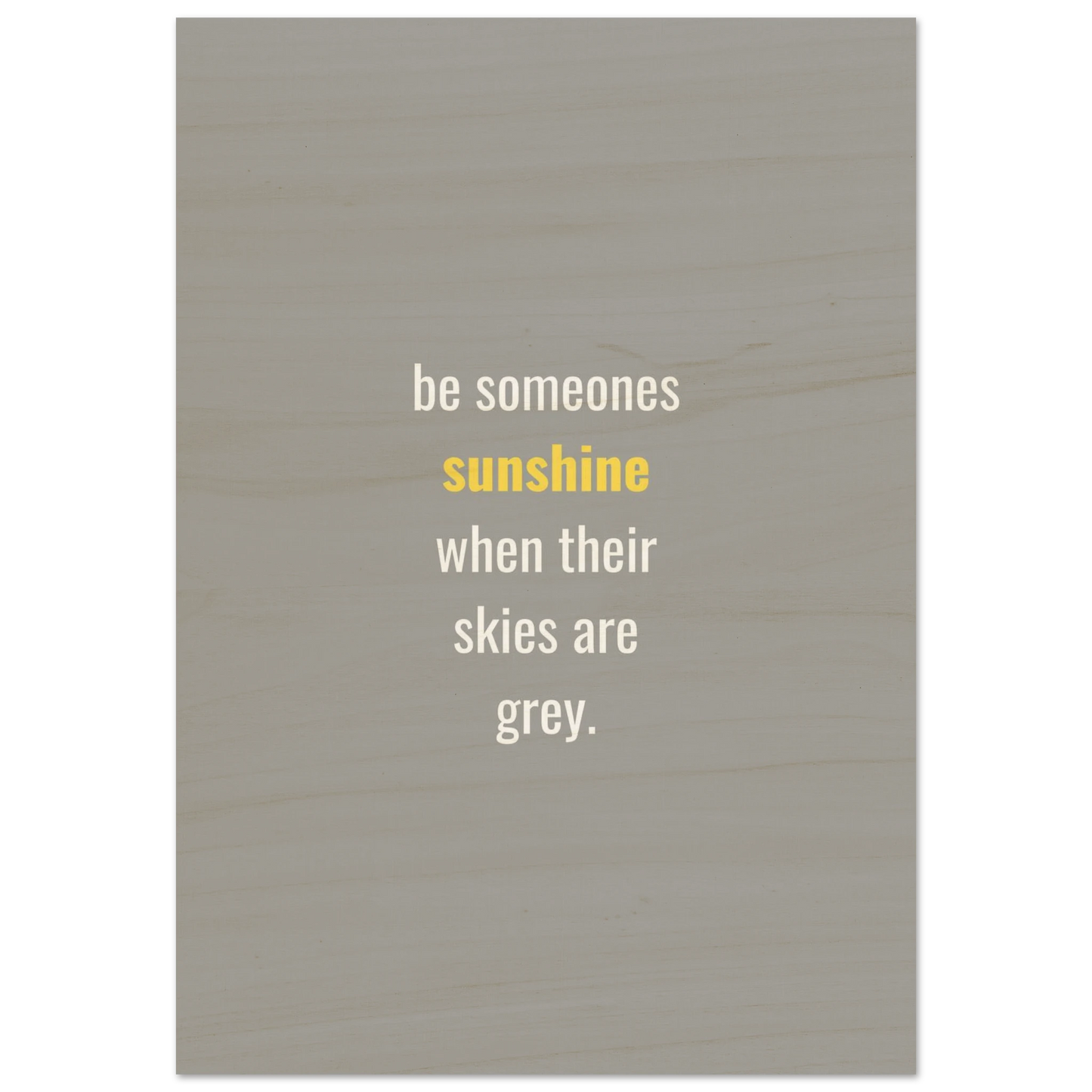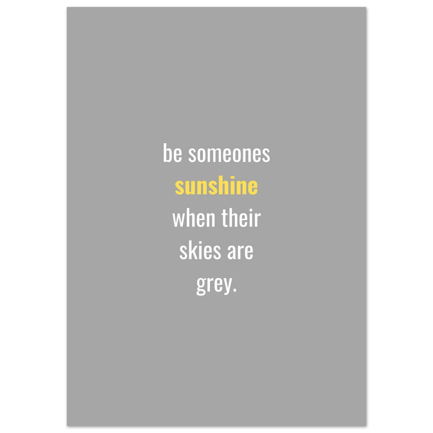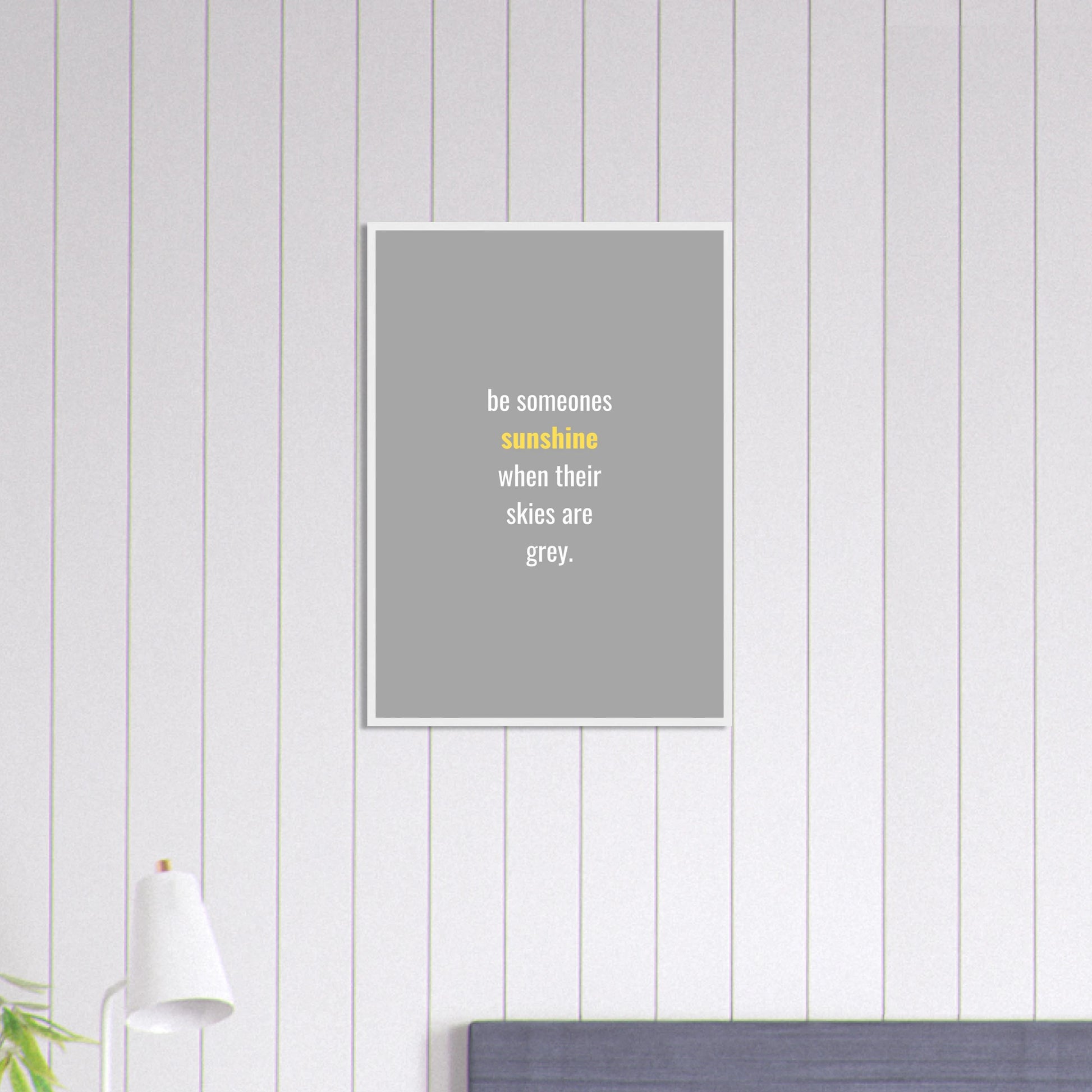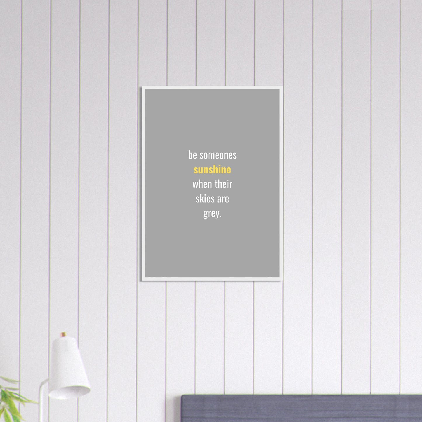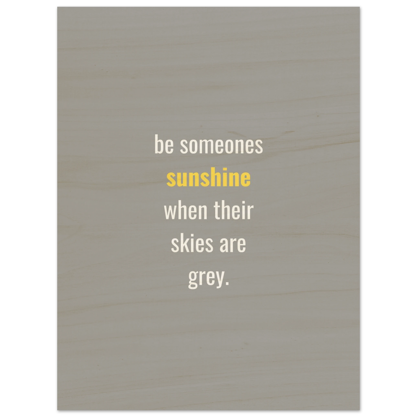 Et varmt og vennlig motiv som minner deg på kraften av små handlinger. Med enkel typografi på grå bakgrunn og ordet sunshine fremhevet i gult, symboliserer bildet hvordan positivitet kan skinne opp selv de mørkeste dager. Perfekt for å spre glede og skape en lysere atmosfære i rommet.