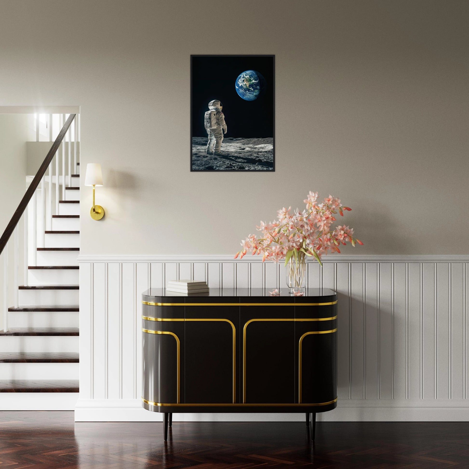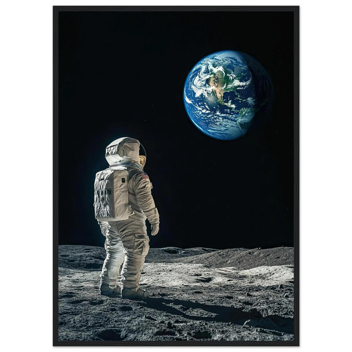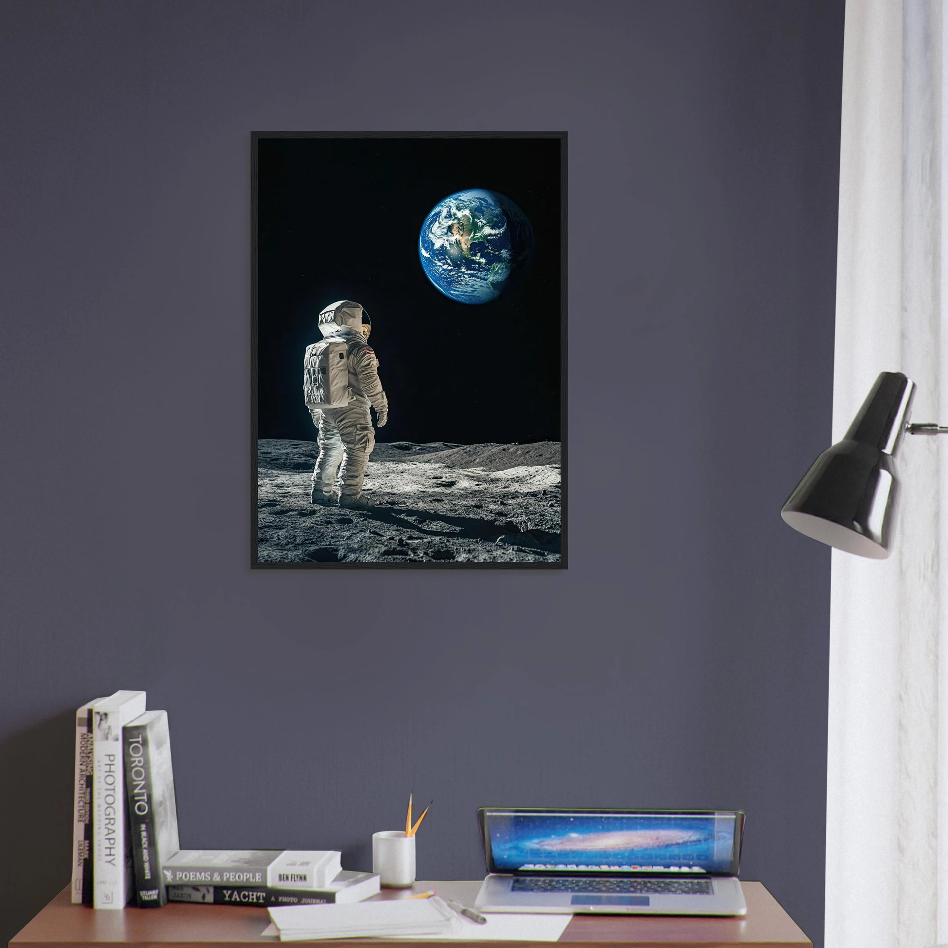 Et storslått kunstverk som fanger øyeblikket der en astronaut står på månens overflate og ser hjemover mot Jorden. Kontrasten mellom det uendelige mørket og den lysende, levende planeten minner oss om både eventyrlyst og sårbarheten til vår egen verden. Perfekt for deg som vil bringe universets storhet inn i hjemmet.