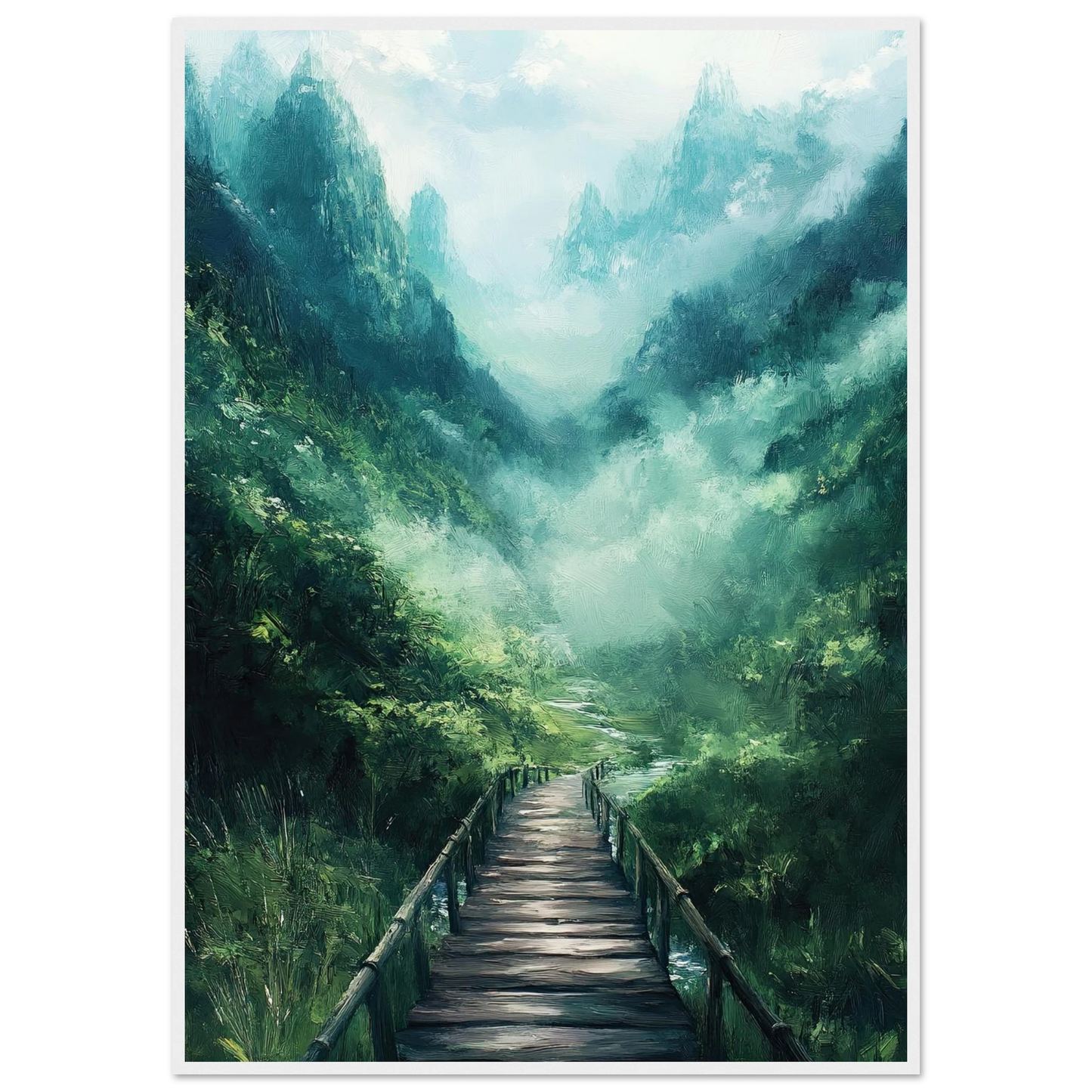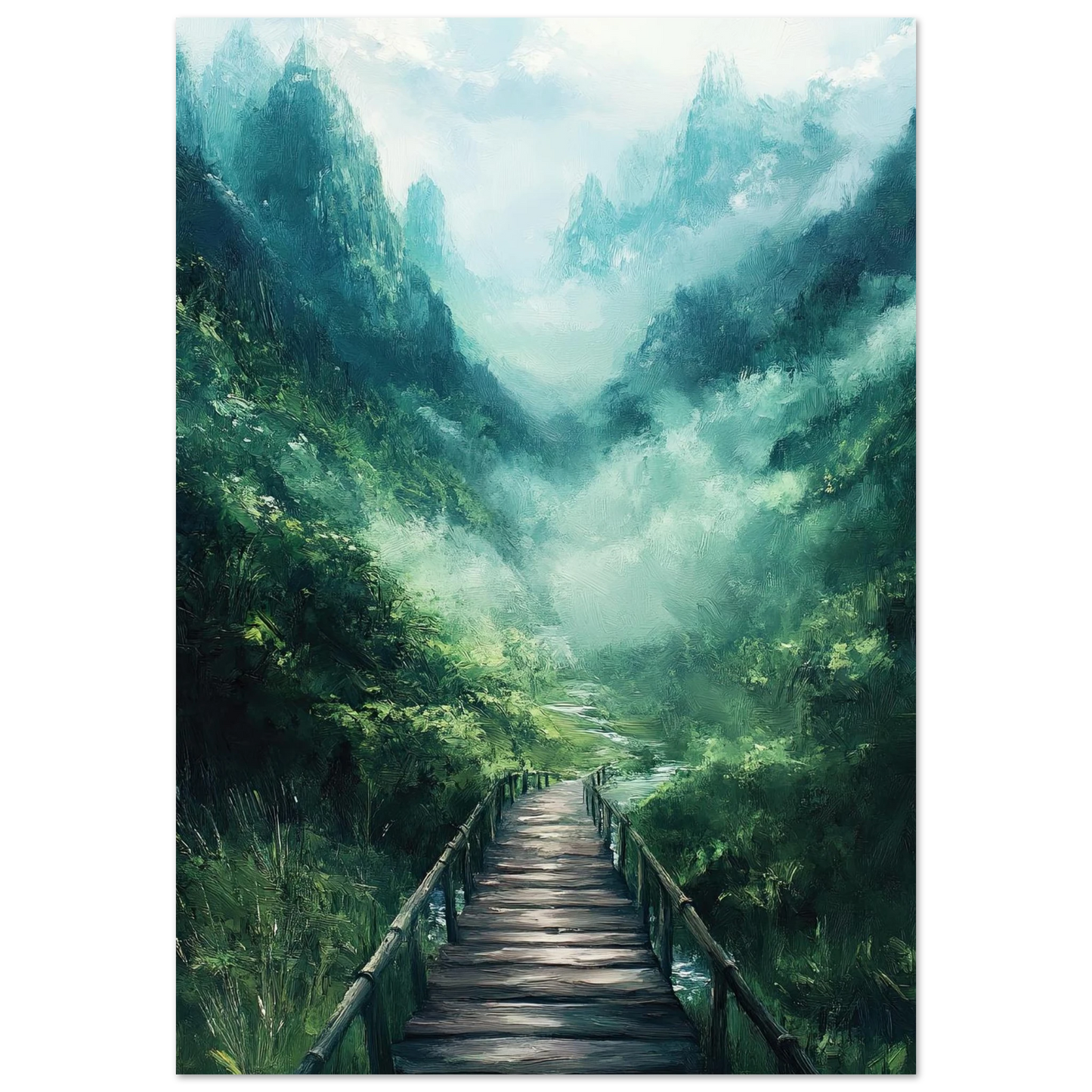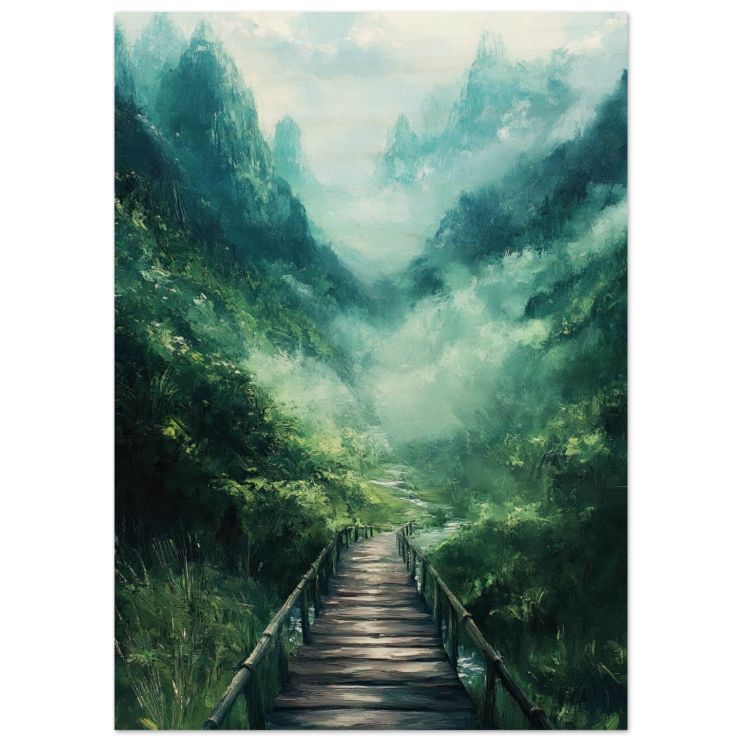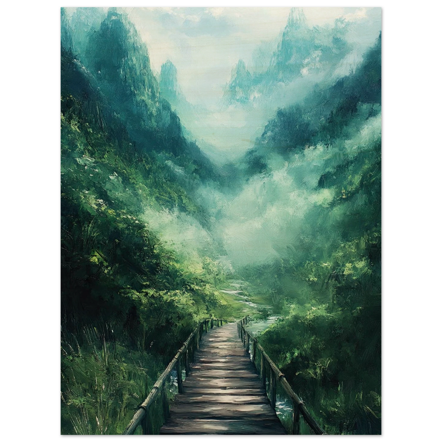 Et mystisk og stemningsfullt landskapsmotiv der en trebro leder inn i en dal omgitt av grønnkledde fjell og tåkedis. Bildet vekker nysgjerrighet og eventyrlyst, som om stien skjuler hemmeligheter lenger fremme. En perfekt påminnelse om å utforske det ukjente og la seg inspirere av naturens magi.