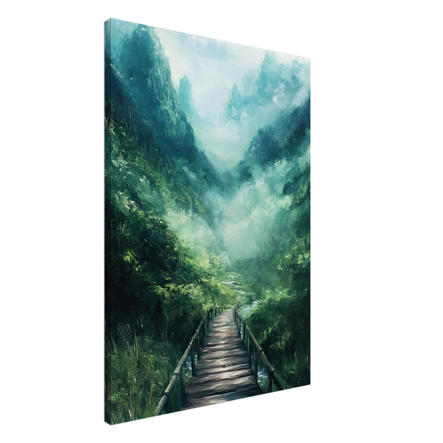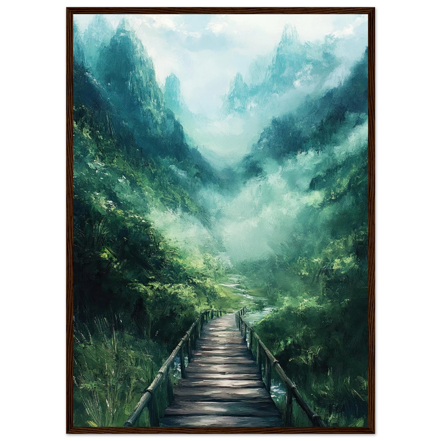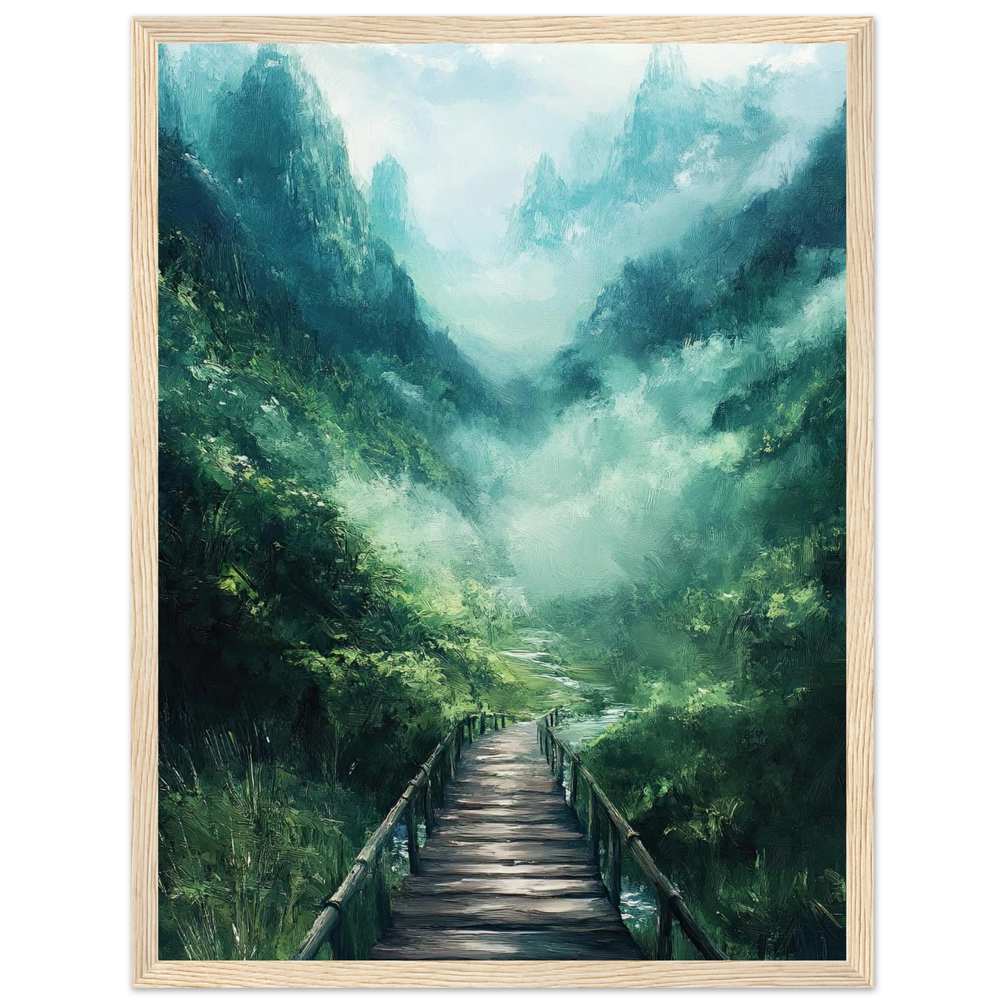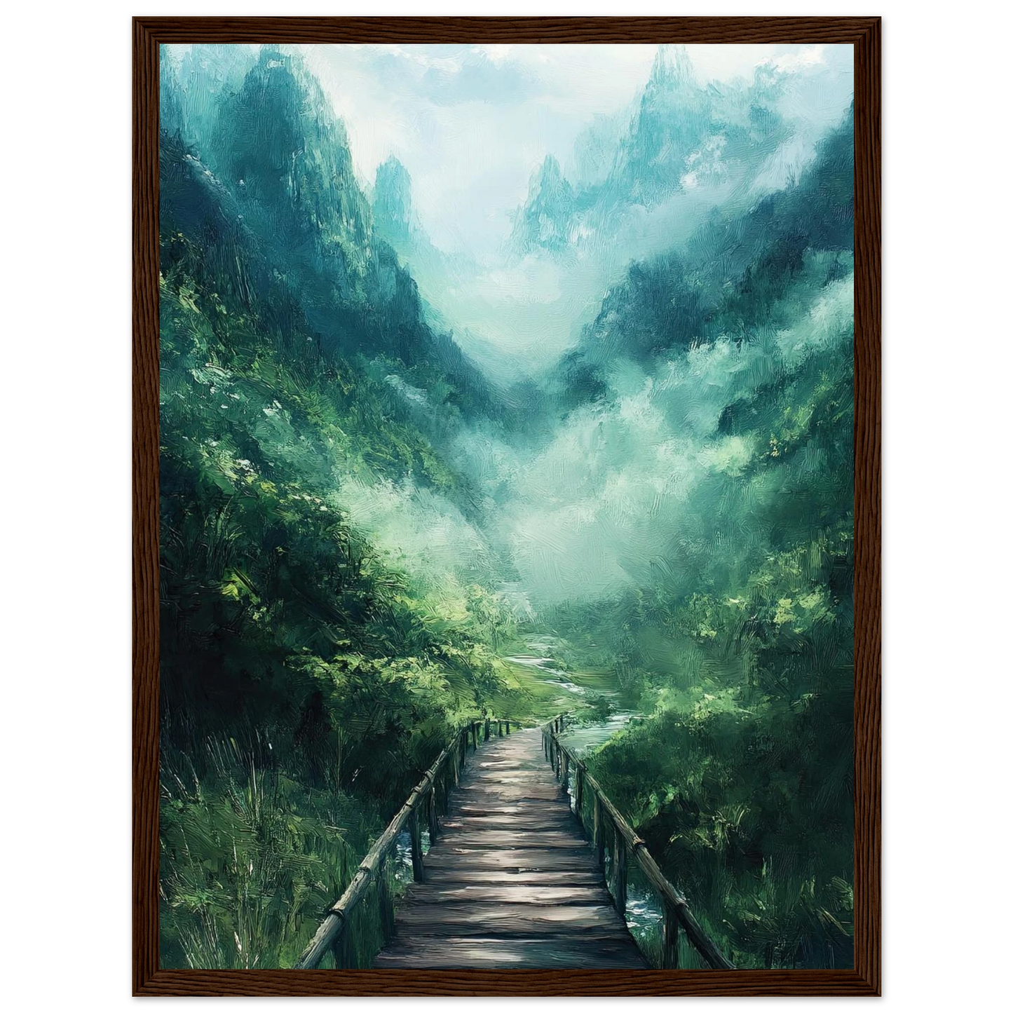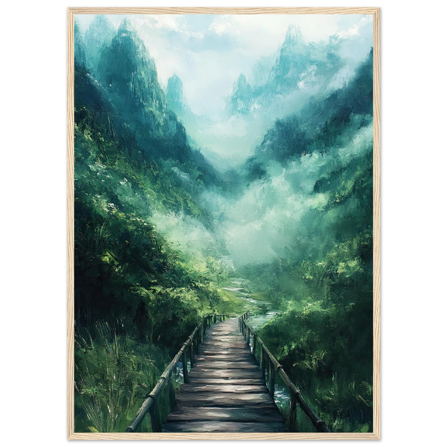 Et mystisk og stemningsfullt landskapsmotiv der en trebro leder inn i en dal omgitt av grønnkledde fjell og tåkedis. Bildet vekker nysgjerrighet og eventyrlyst, som om stien skjuler hemmeligheter lenger fremme. En perfekt påminnelse om å utforske det ukjente og la seg inspirere av naturens magi.
