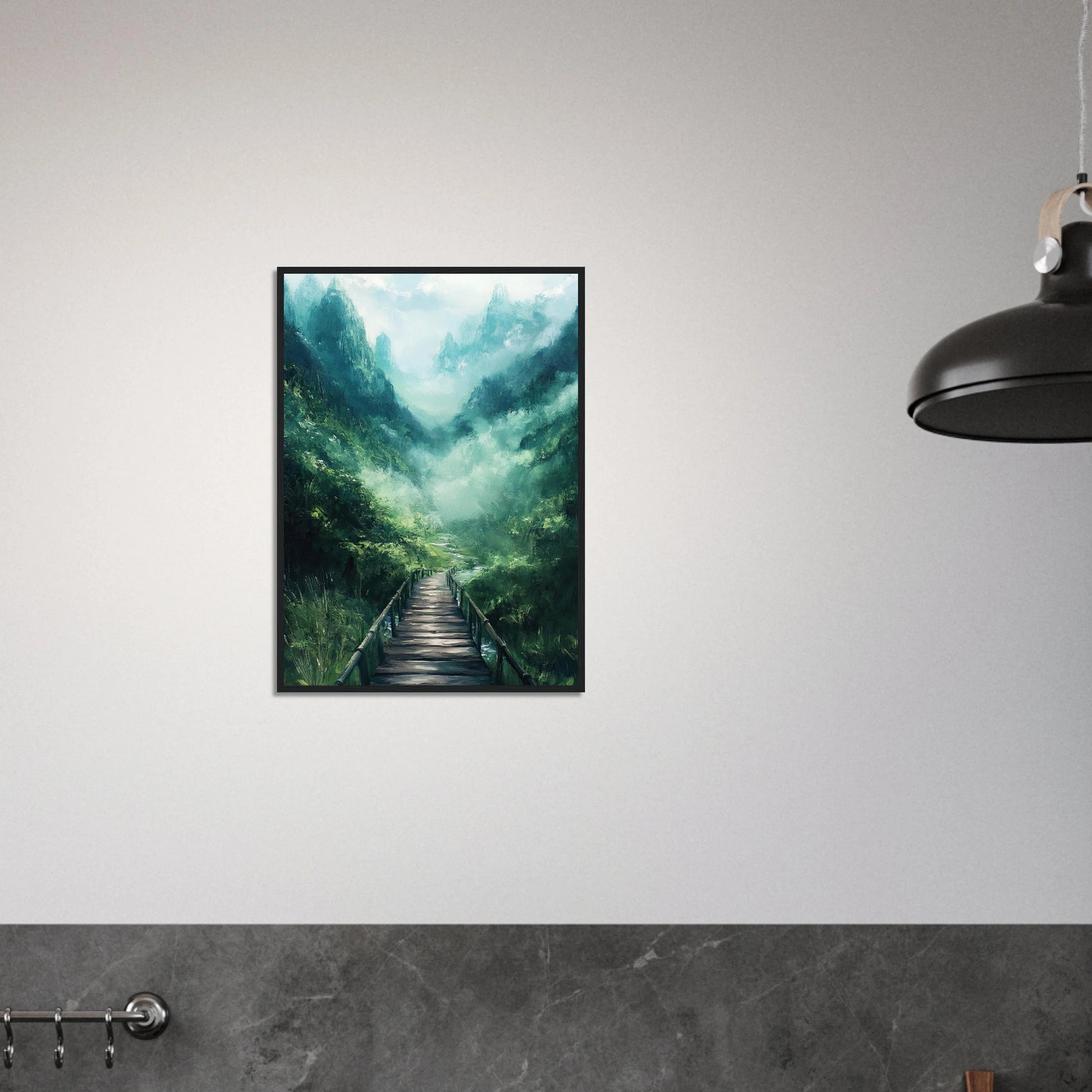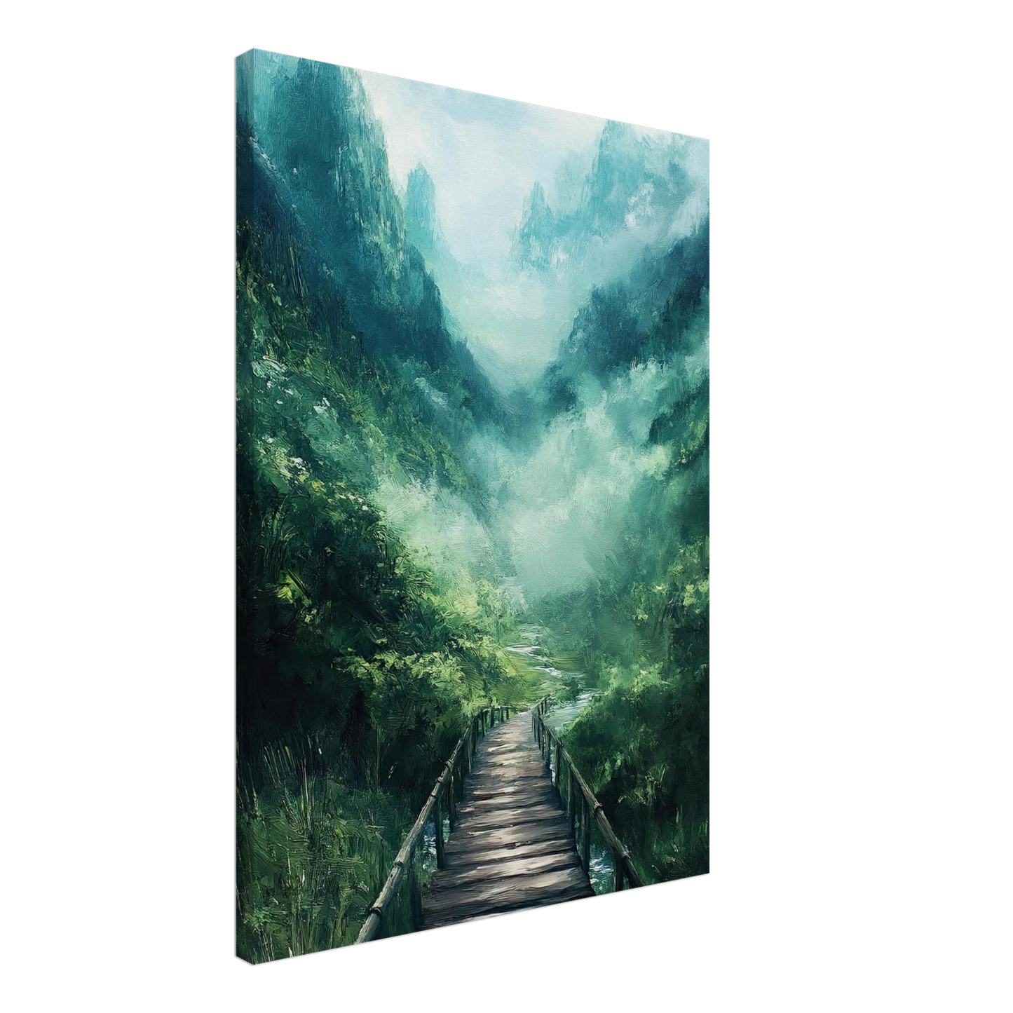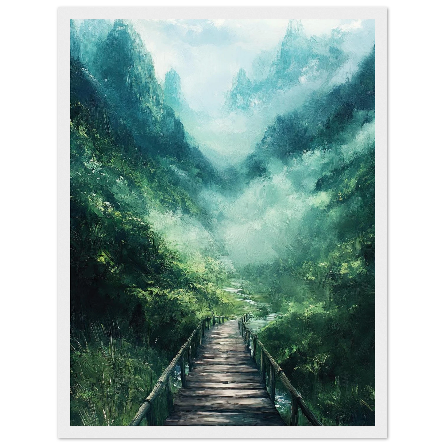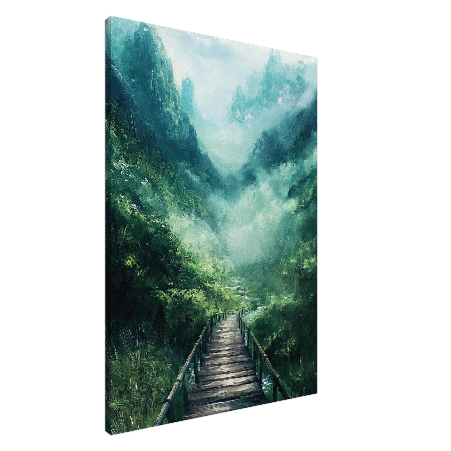 Et mystisk og stemningsfullt landskapsmotiv der en trebro leder inn i en dal omgitt av grønnkledde fjell og tåkedis. Bildet vekker nysgjerrighet og eventyrlyst, som om stien skjuler hemmeligheter lenger fremme. En perfekt påminnelse om å utforske det ukjente og la seg inspirere av naturens magi.