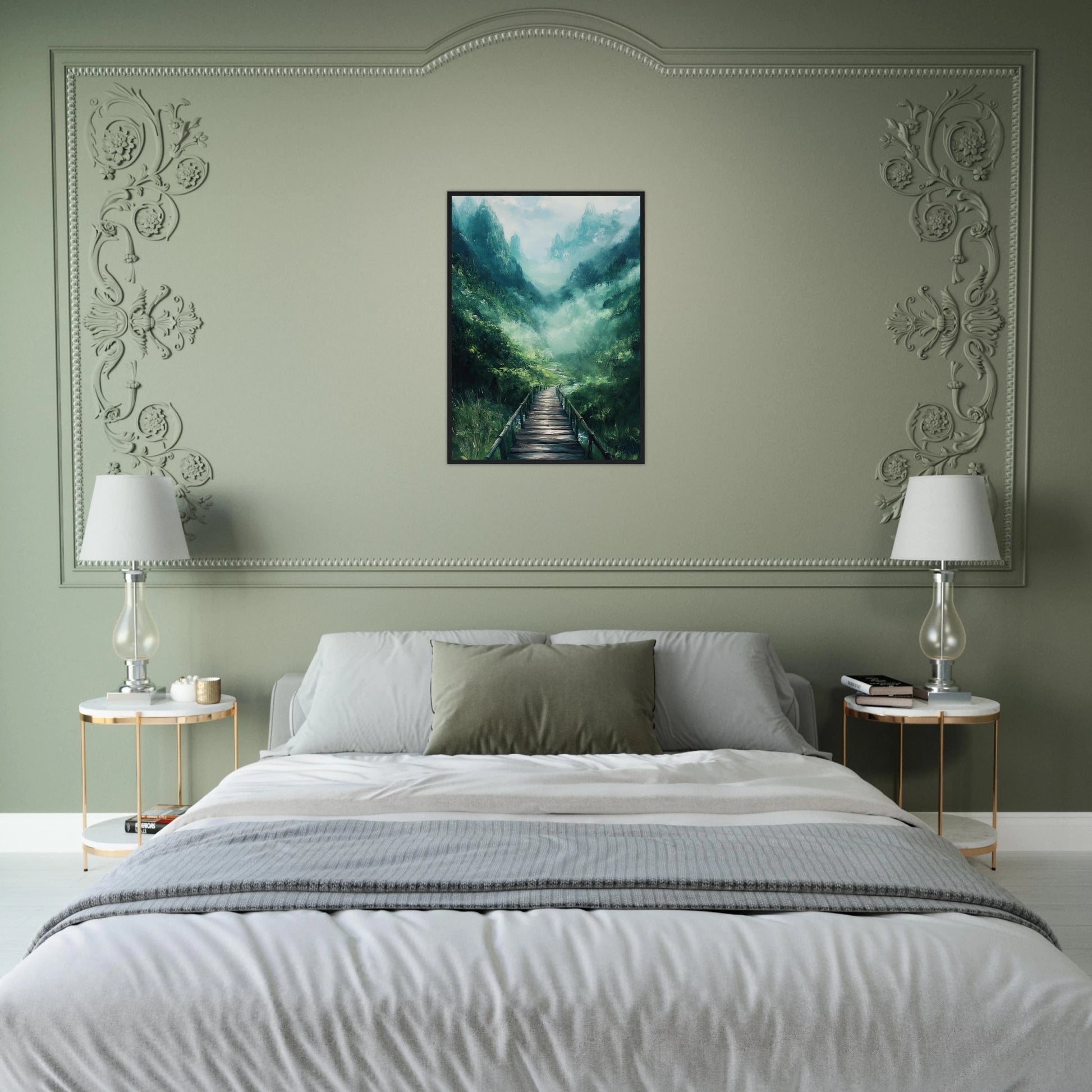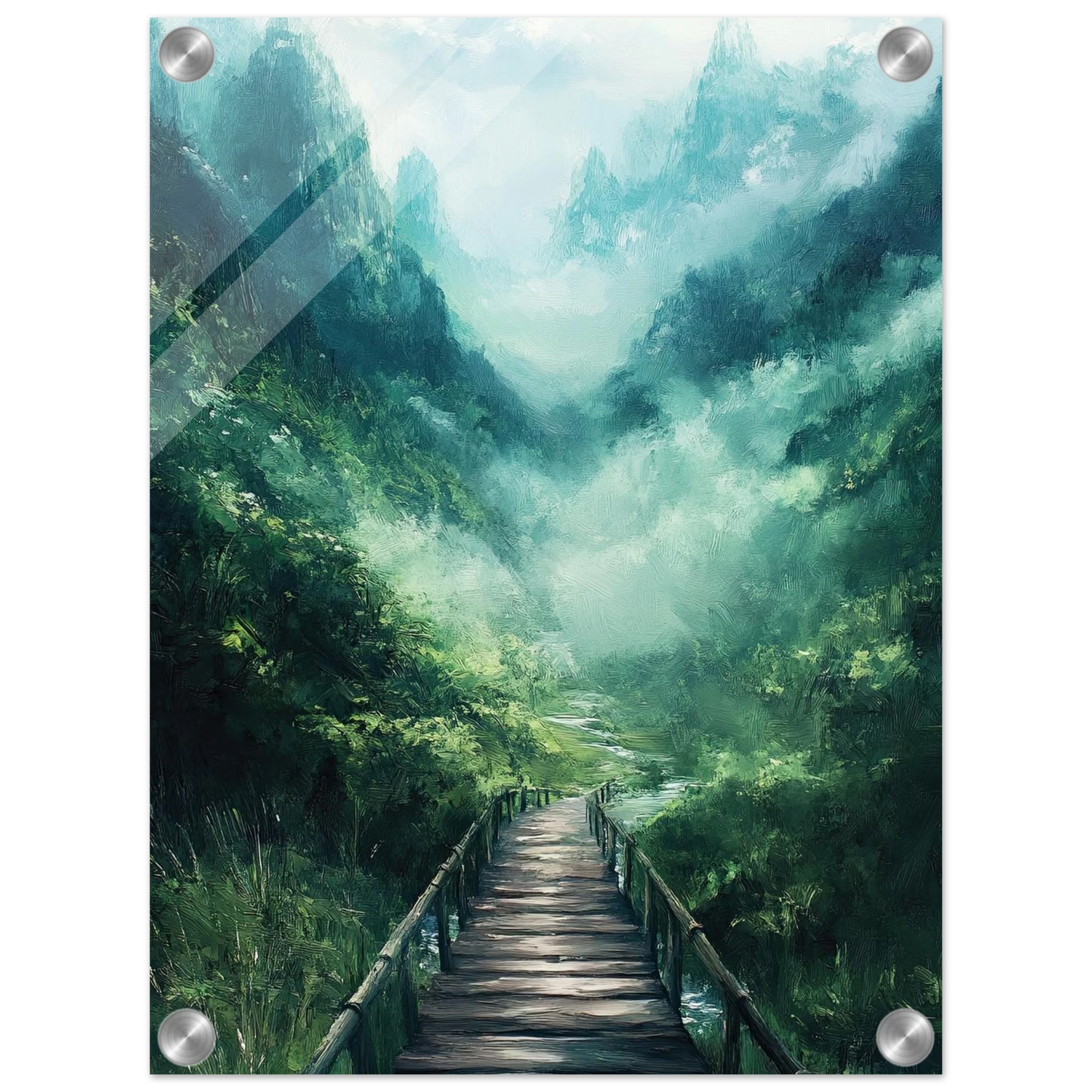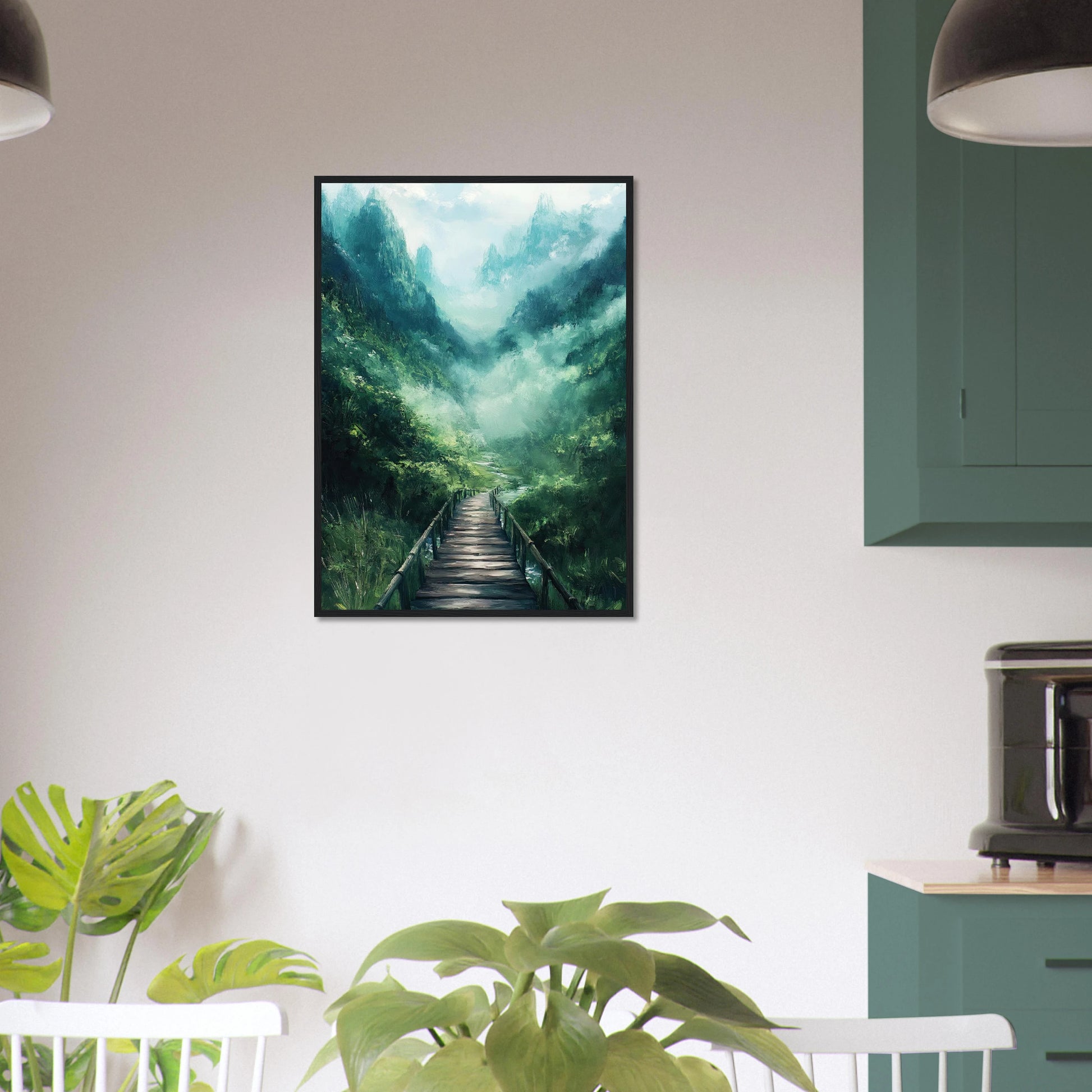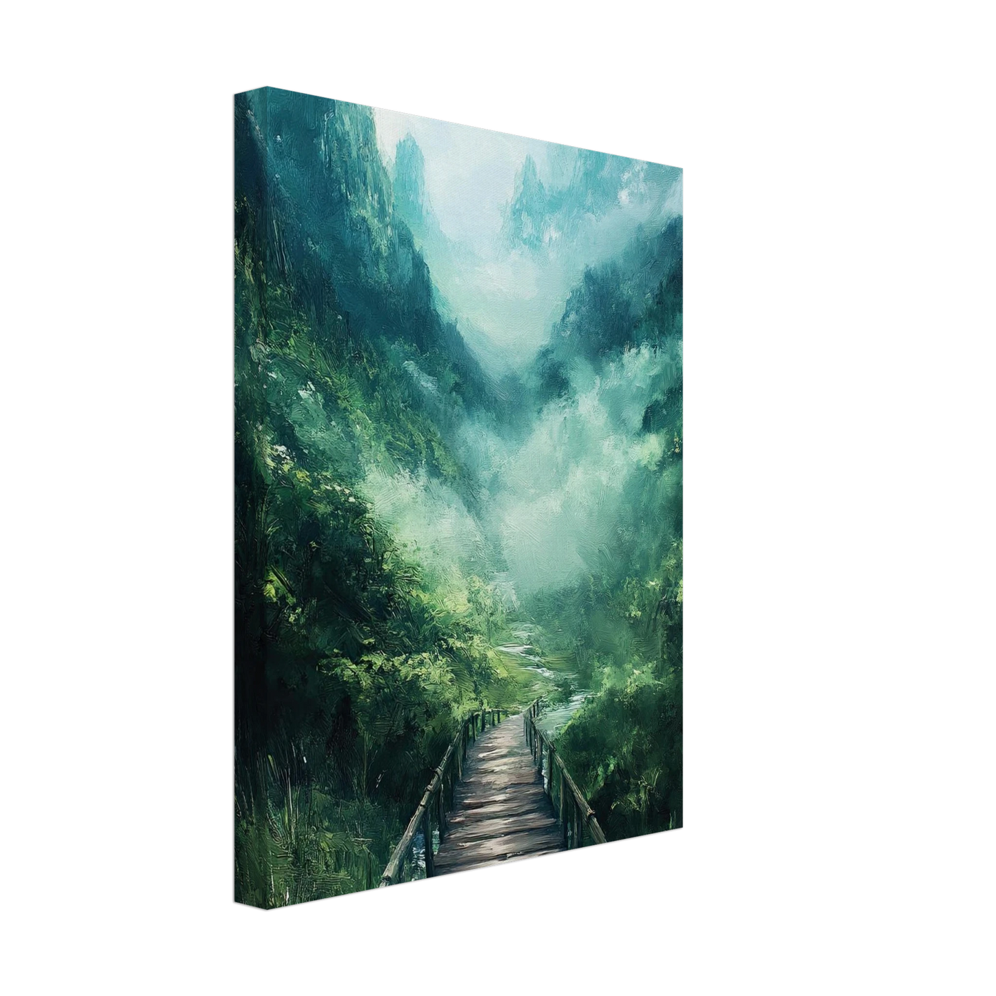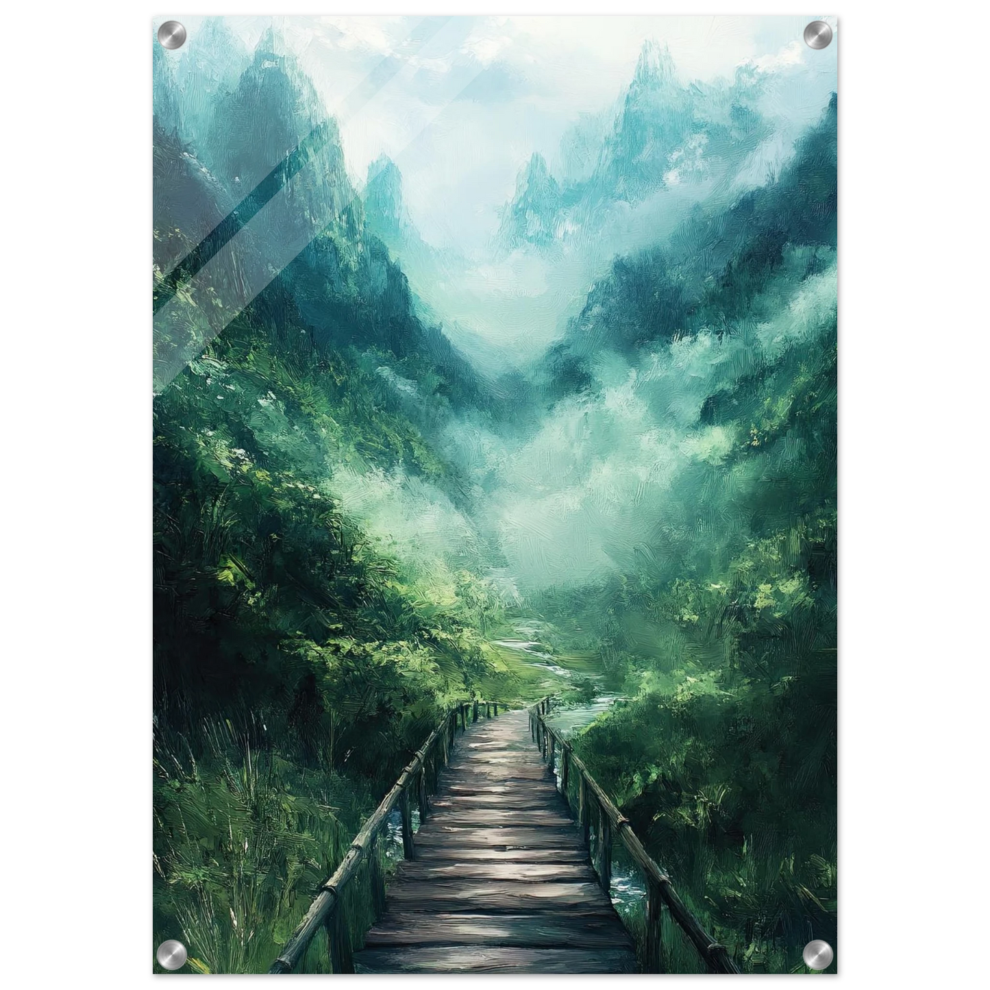 Et mystisk og stemningsfullt landskapsmotiv der en trebro leder inn i en dal omgitt av grønnkledde fjell og tåkedis. Bildet vekker nysgjerrighet og eventyrlyst, som om stien skjuler hemmeligheter lenger fremme. En perfekt påminnelse om å utforske det ukjente og la seg inspirere av naturens magi.