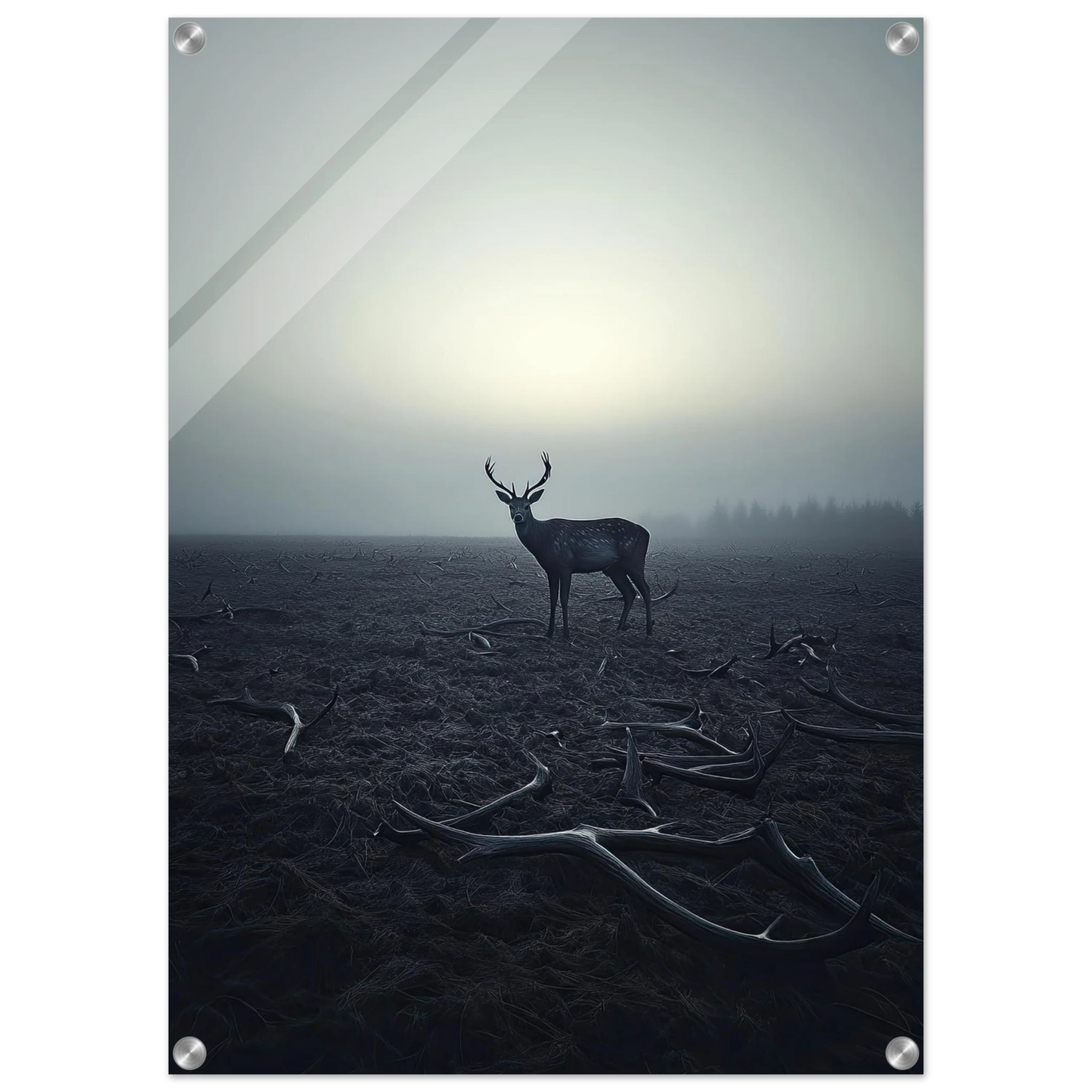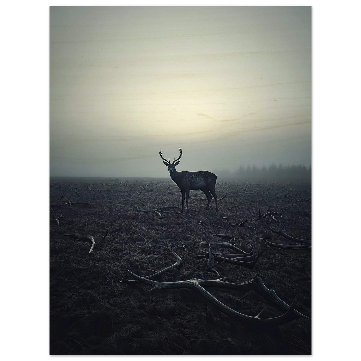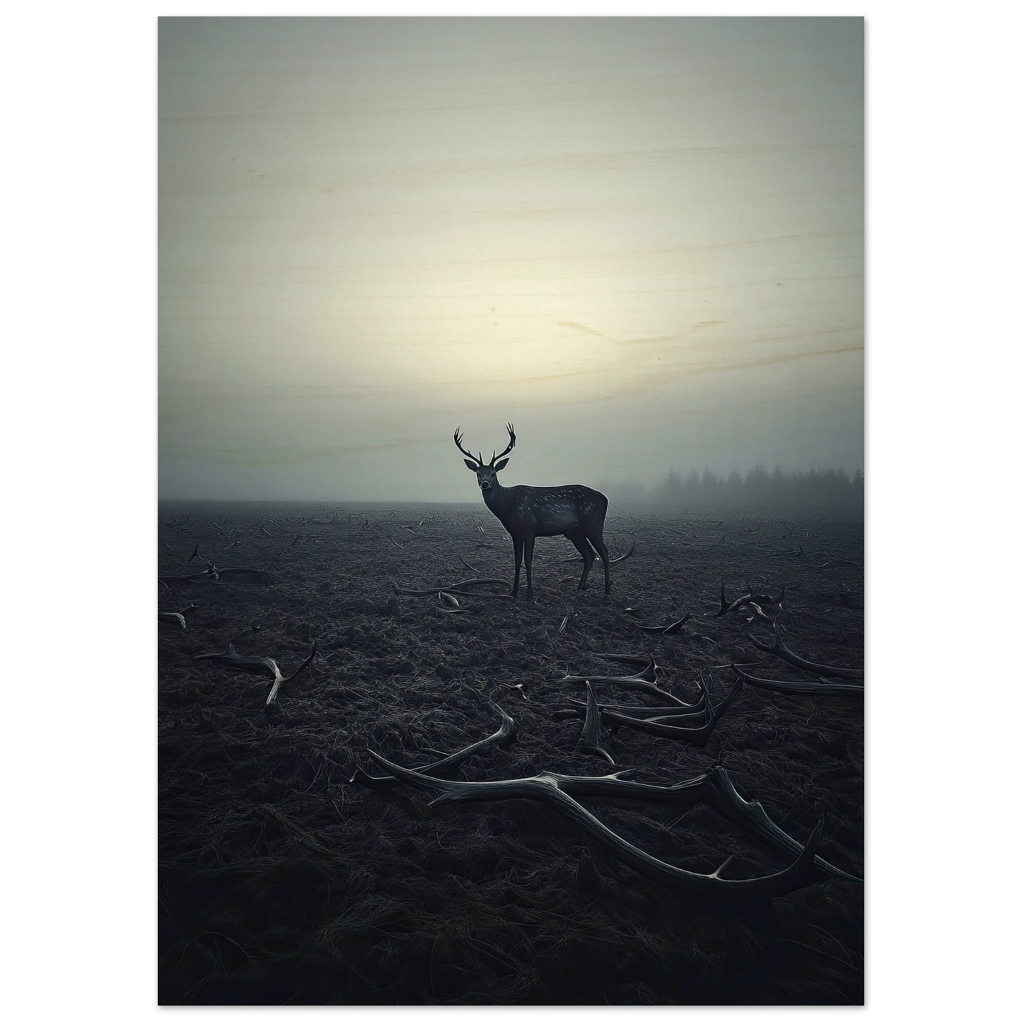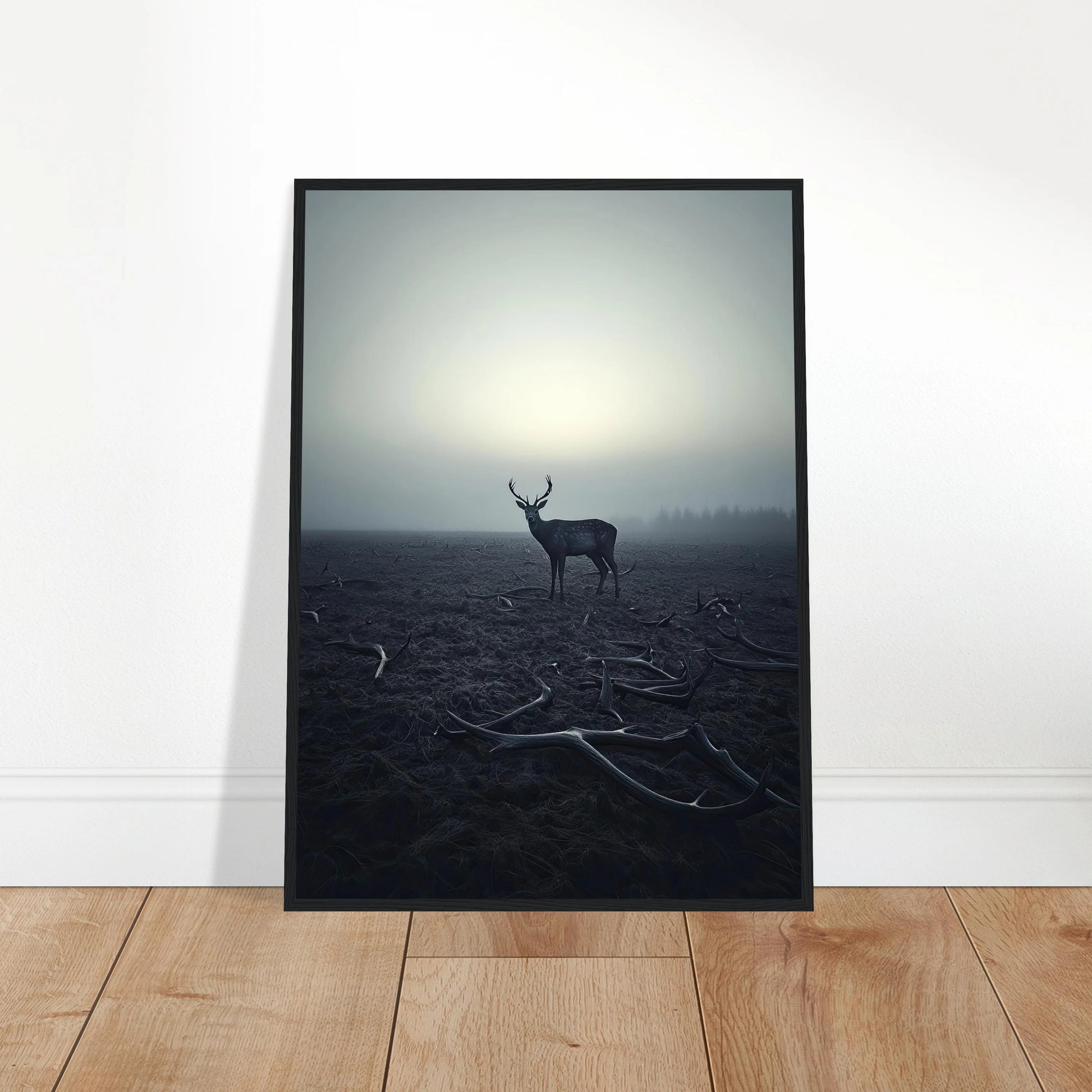 Et kraftfullt og stemningsfullt kunstverk som fanger øyeblikket hvor én står igjen, blant levningene fra de som kom før. De falne gevirene vitner om fortiden, mens den siste hjorten bærer kronen videre – en symbolsk påminnelse om styrke, utholdenhet og verdigheten i å være den siste. Et bilde som både gir rom for ettertanke og blir et sterkt blikkfang i ethvert rom.