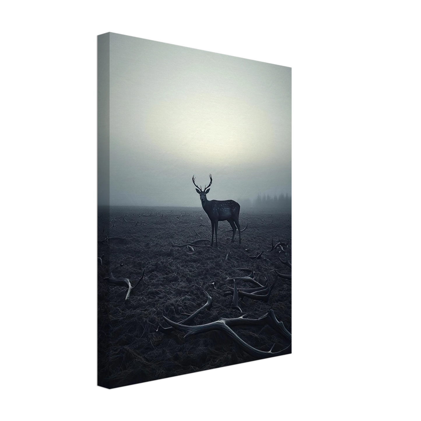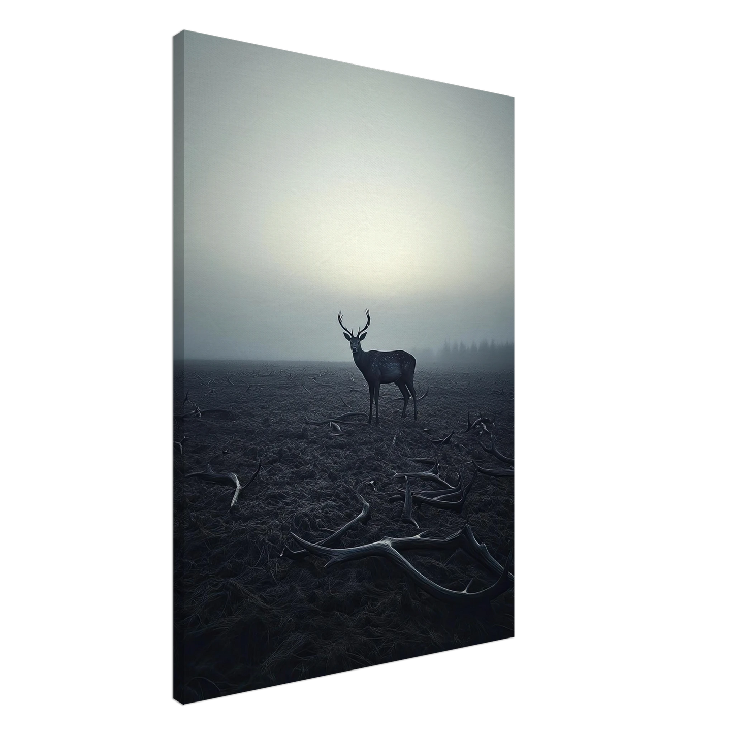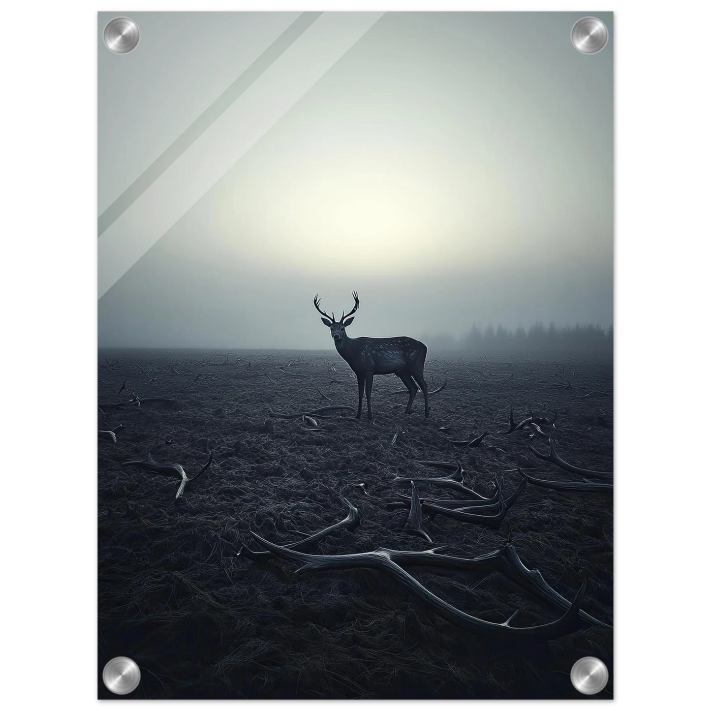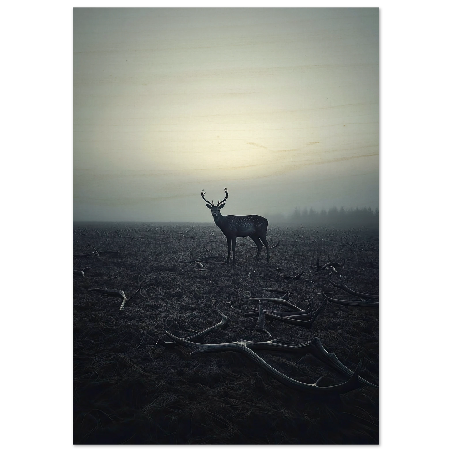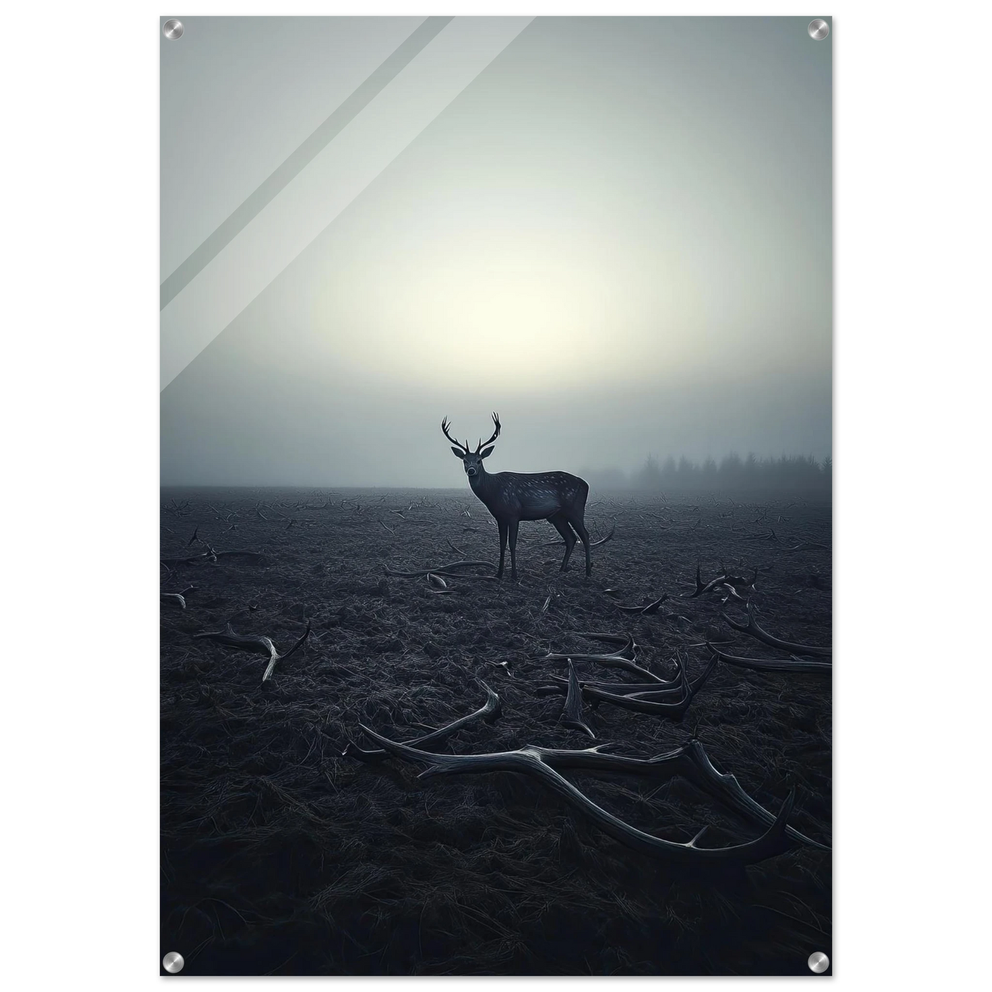 Et kraftfullt og stemningsfullt kunstverk som fanger øyeblikket hvor én står igjen, blant levningene fra de som kom før. De falne gevirene vitner om fortiden, mens den siste hjorten bærer kronen videre – en symbolsk påminnelse om styrke, utholdenhet og verdigheten i å være den siste. Et bilde som både gir rom for ettertanke og blir et sterkt blikkfang i ethvert rom.