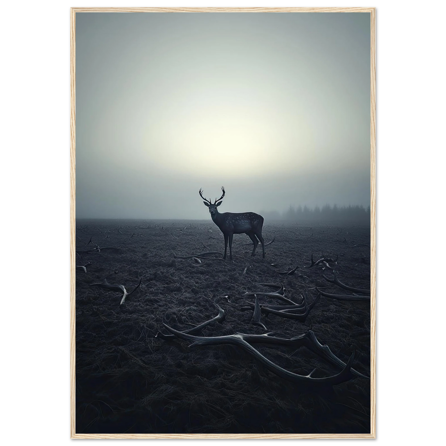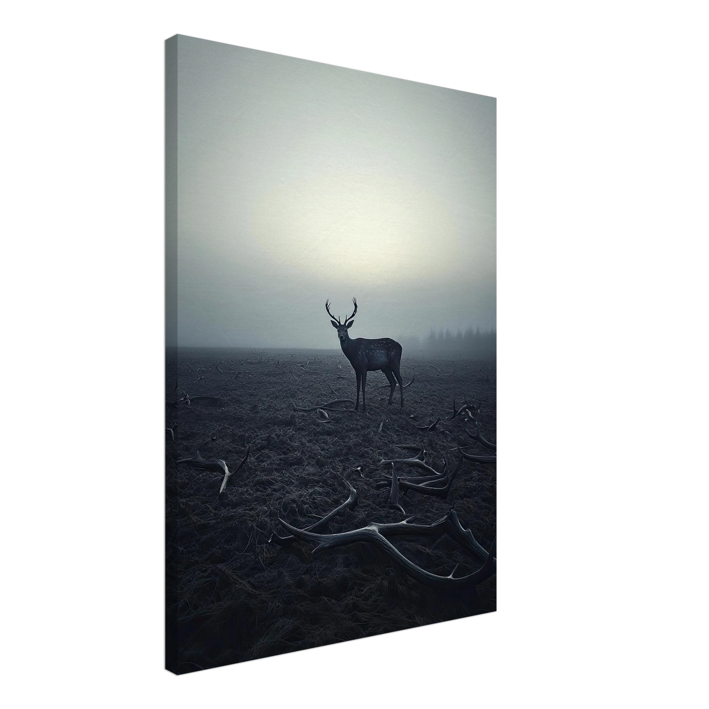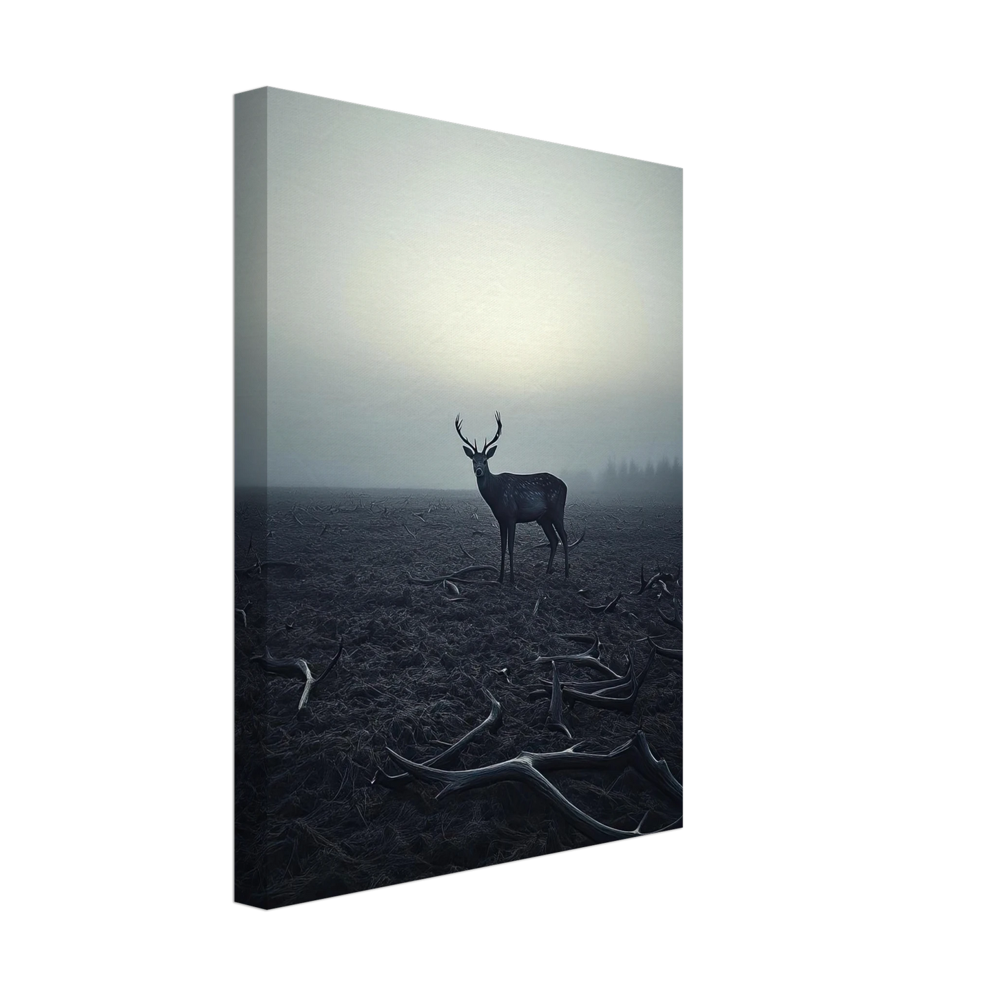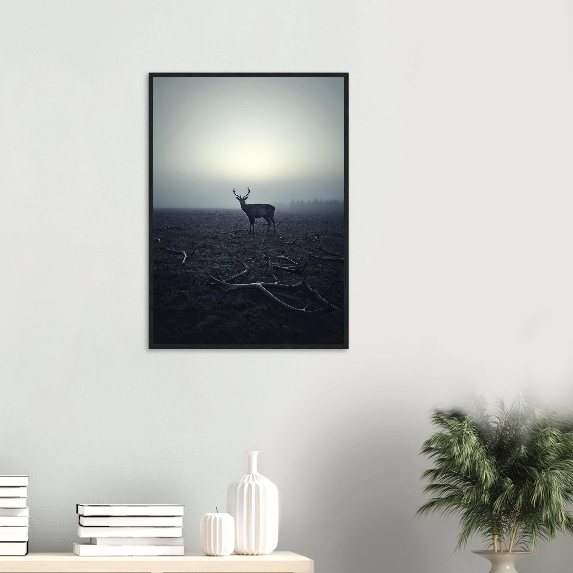 Et kraftfullt og stemningsfullt kunstverk som fanger øyeblikket hvor én står igjen, blant levningene fra de som kom før. De falne gevirene vitner om fortiden, mens den siste hjorten bærer kronen videre – en symbolsk påminnelse om styrke, utholdenhet og verdigheten i å være den siste. Et bilde som både gir rom for ettertanke og blir et sterkt blikkfang i ethvert rom.
