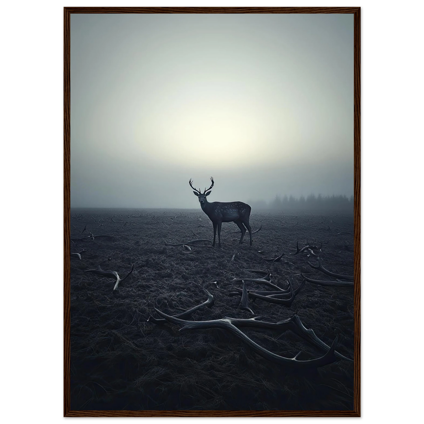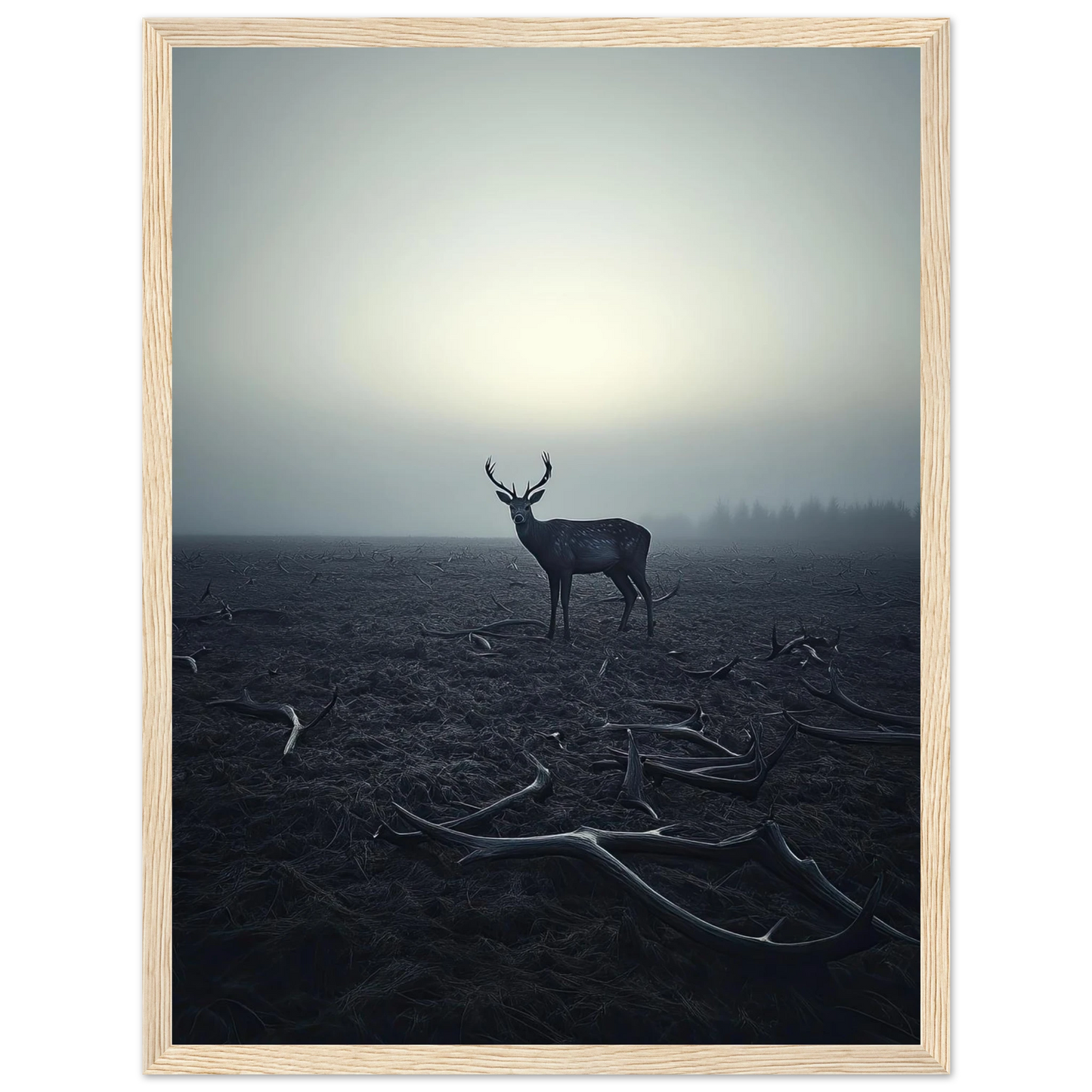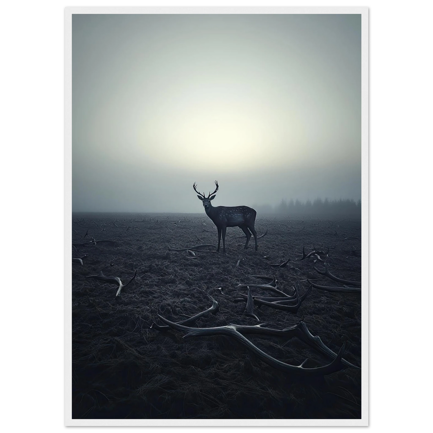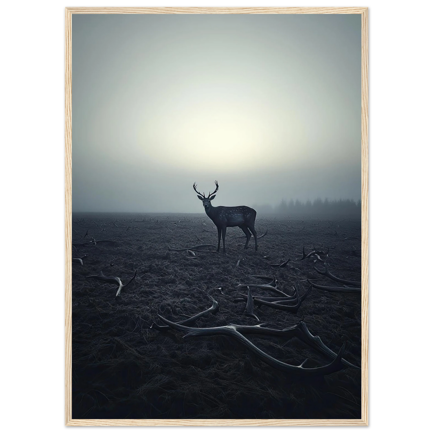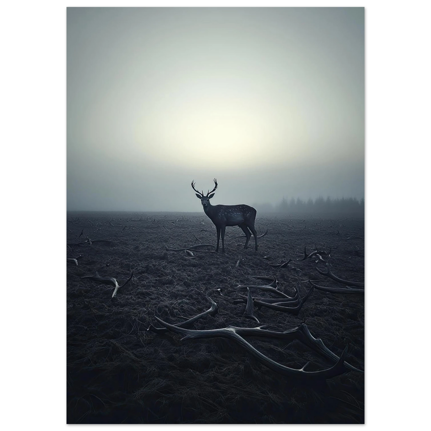 Et kraftfullt og stemningsfullt kunstverk som fanger øyeblikket hvor én står igjen, blant levningene fra de som kom før. De falne gevirene vitner om fortiden, mens den siste hjorten bærer kronen videre – en symbolsk påminnelse om styrke, utholdenhet og verdigheten i å være den siste. Et bilde som både gir rom for ettertanke og blir et sterkt blikkfang i ethvert rom.