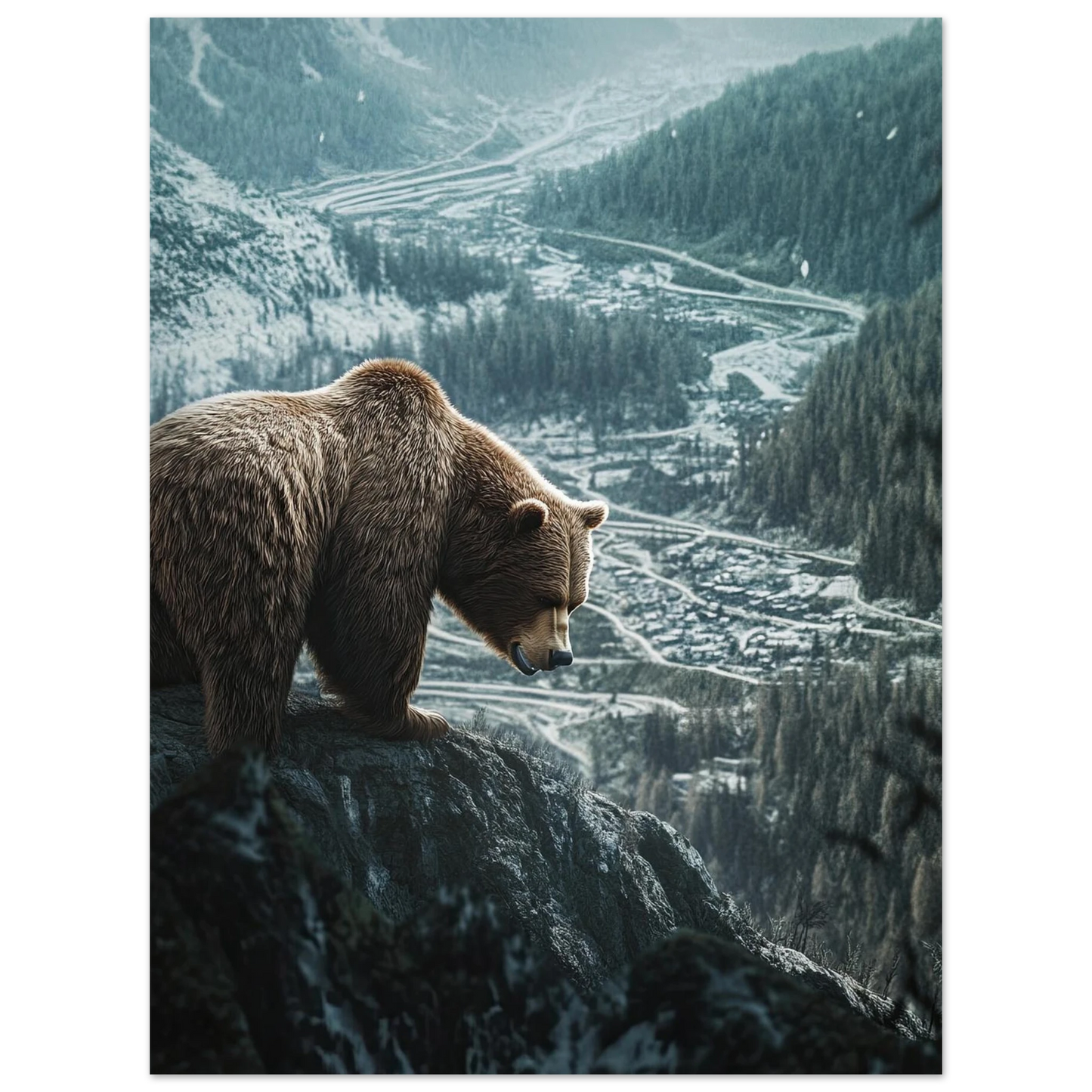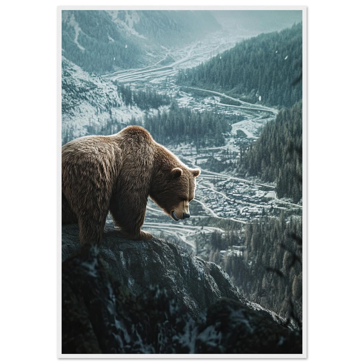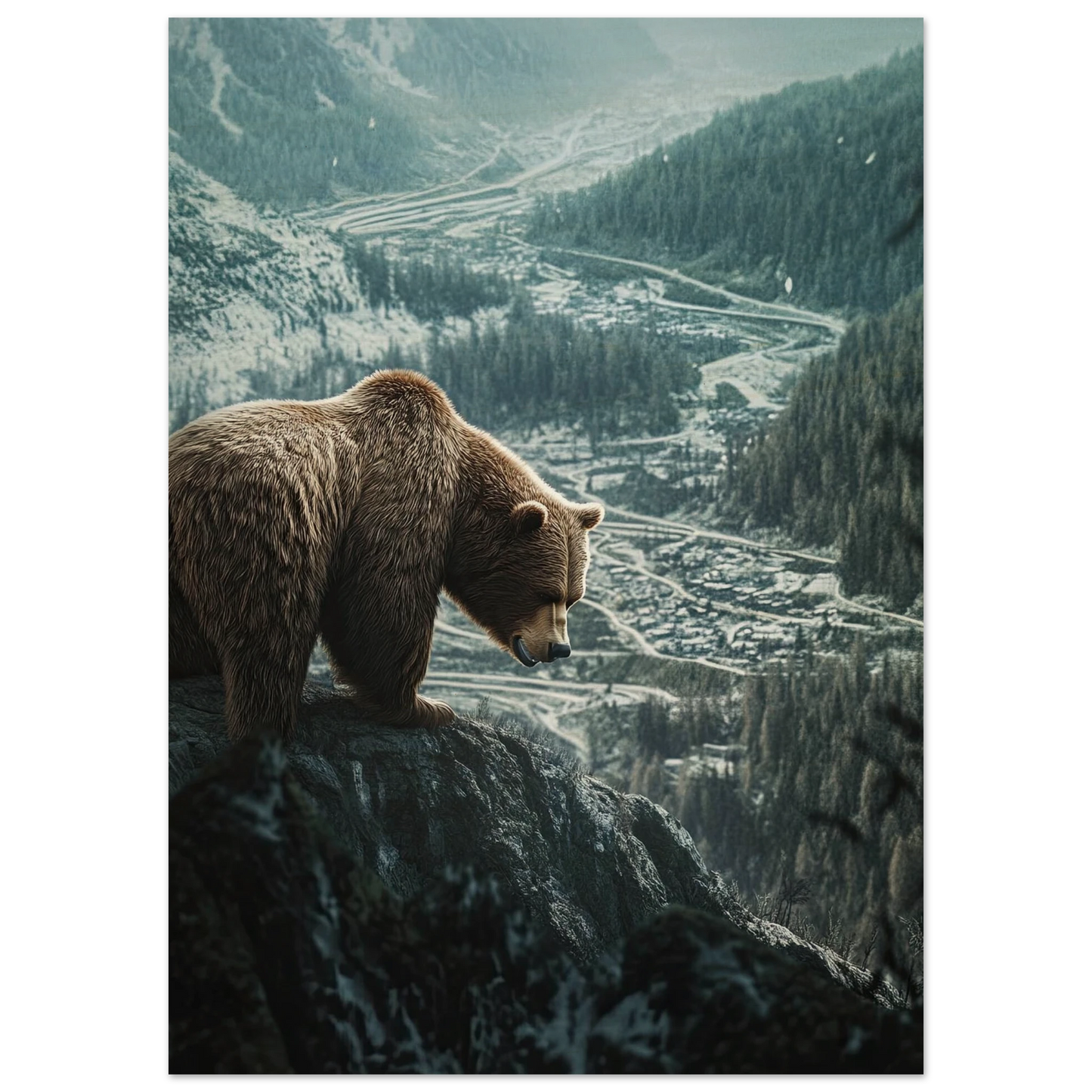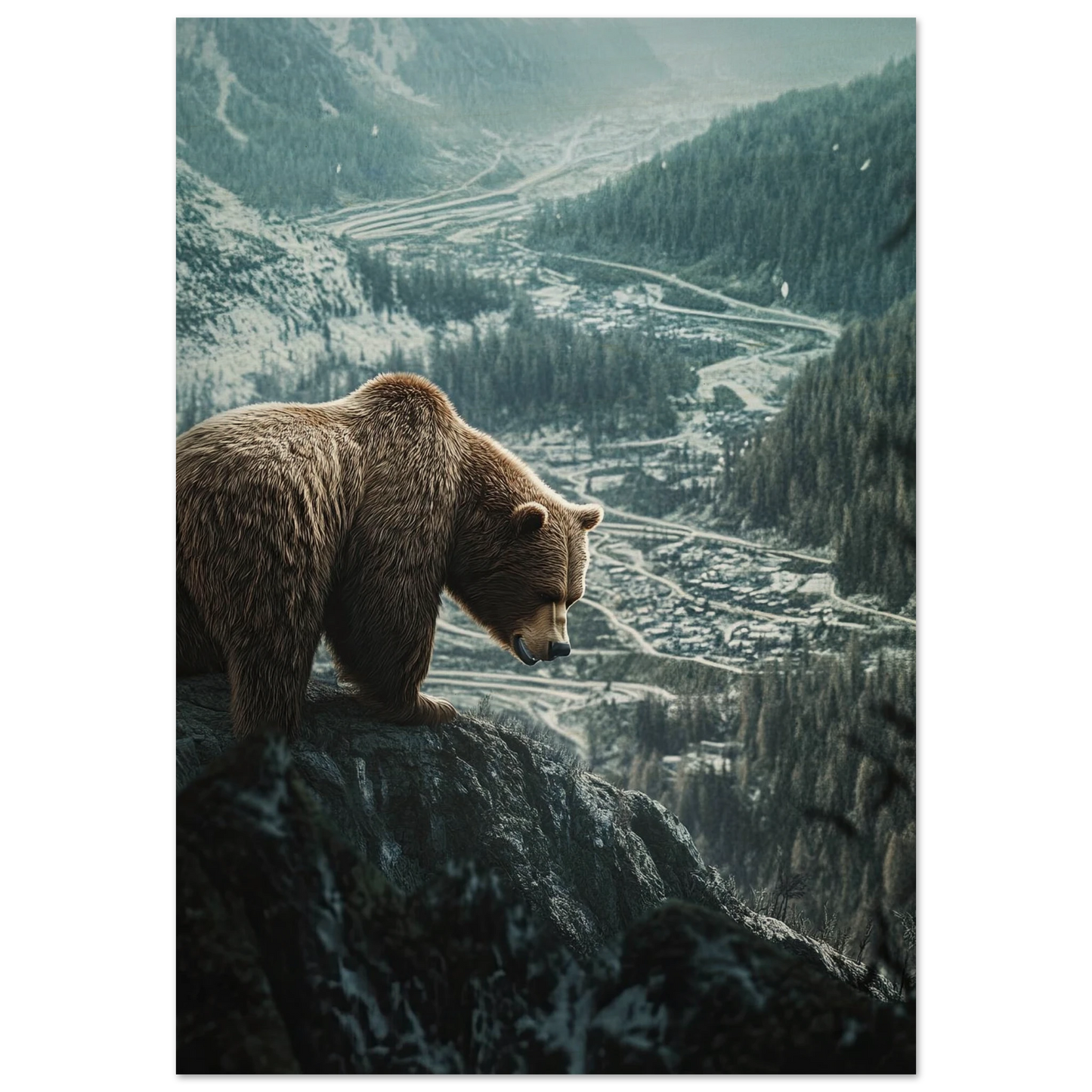 En tankevekkende kunstplakat som fanger øyeblikket der bjørnen betrakter dalen han en gang kalte sitt hjem. Naturens mektige skaper blir til en stille observatør av en verden i endring. Et bilde som minner oss om balansen mellom natur og sivilisasjon — og alt vi en gang tok for gitt.