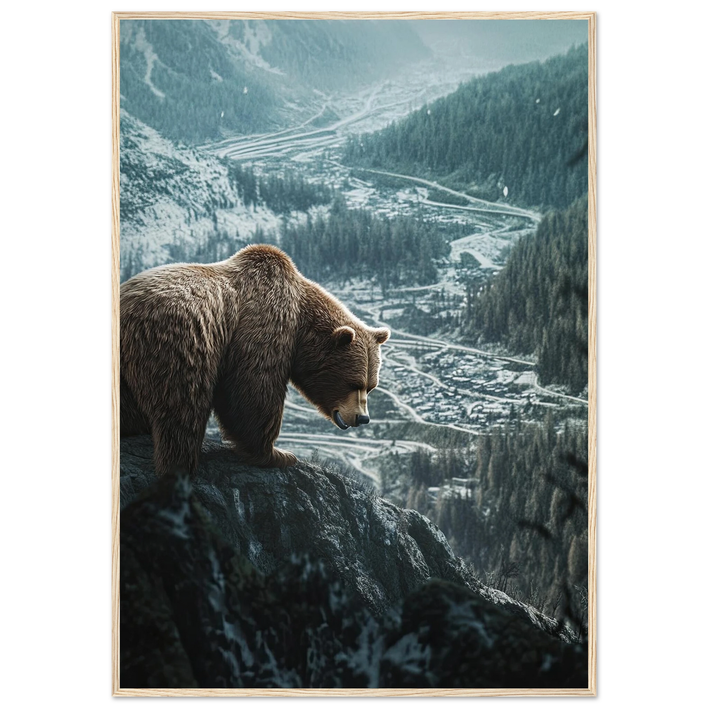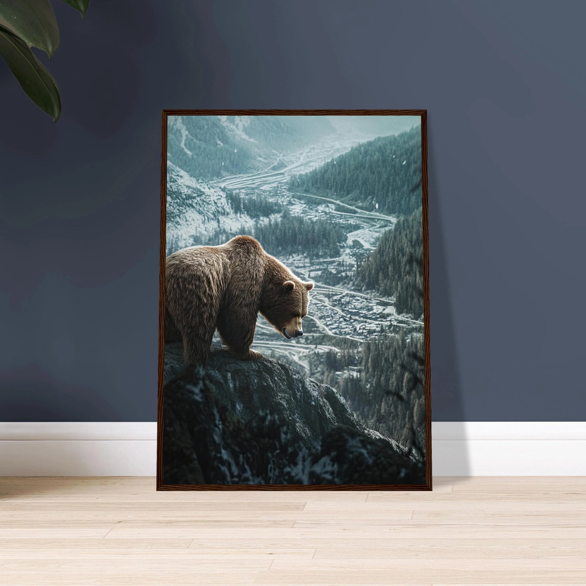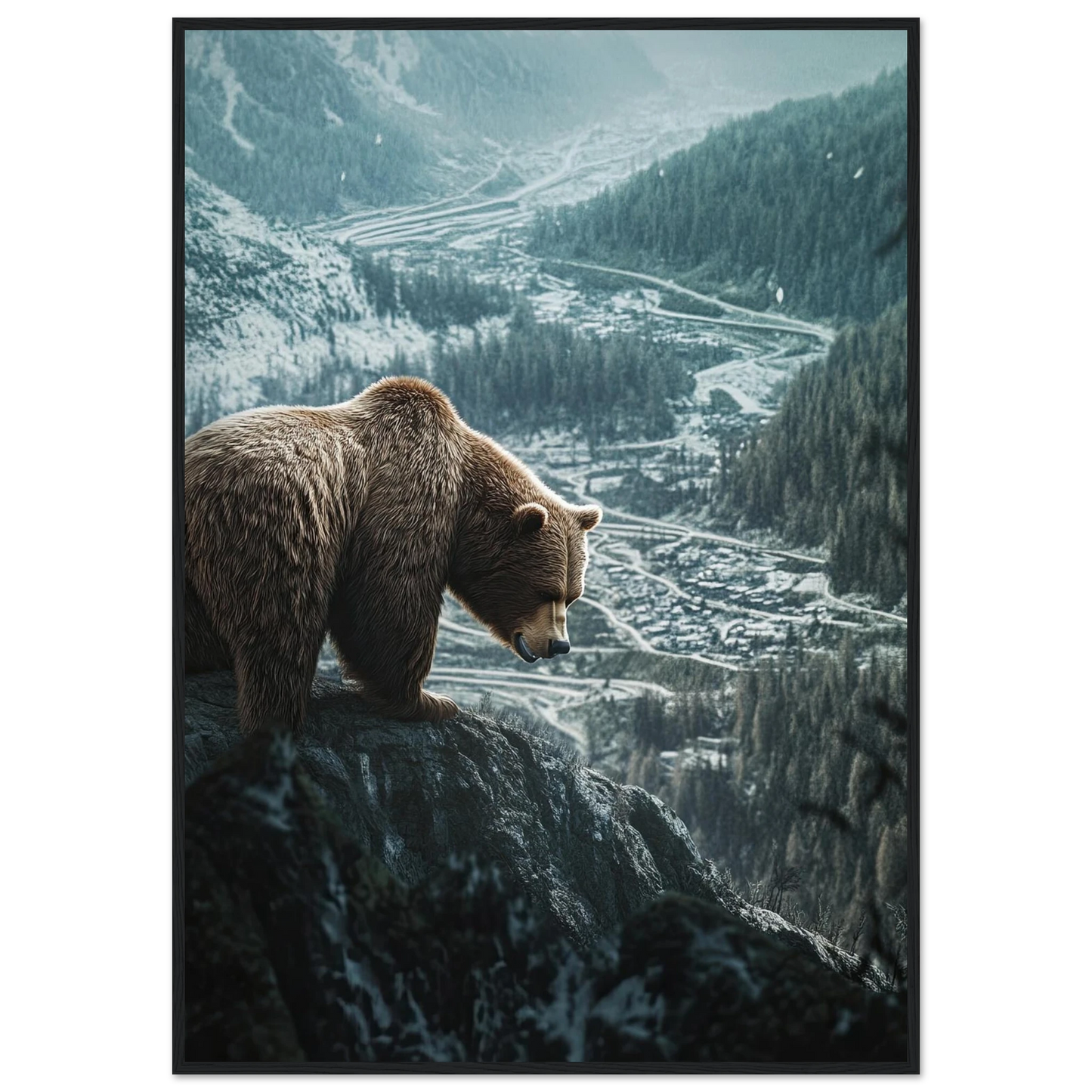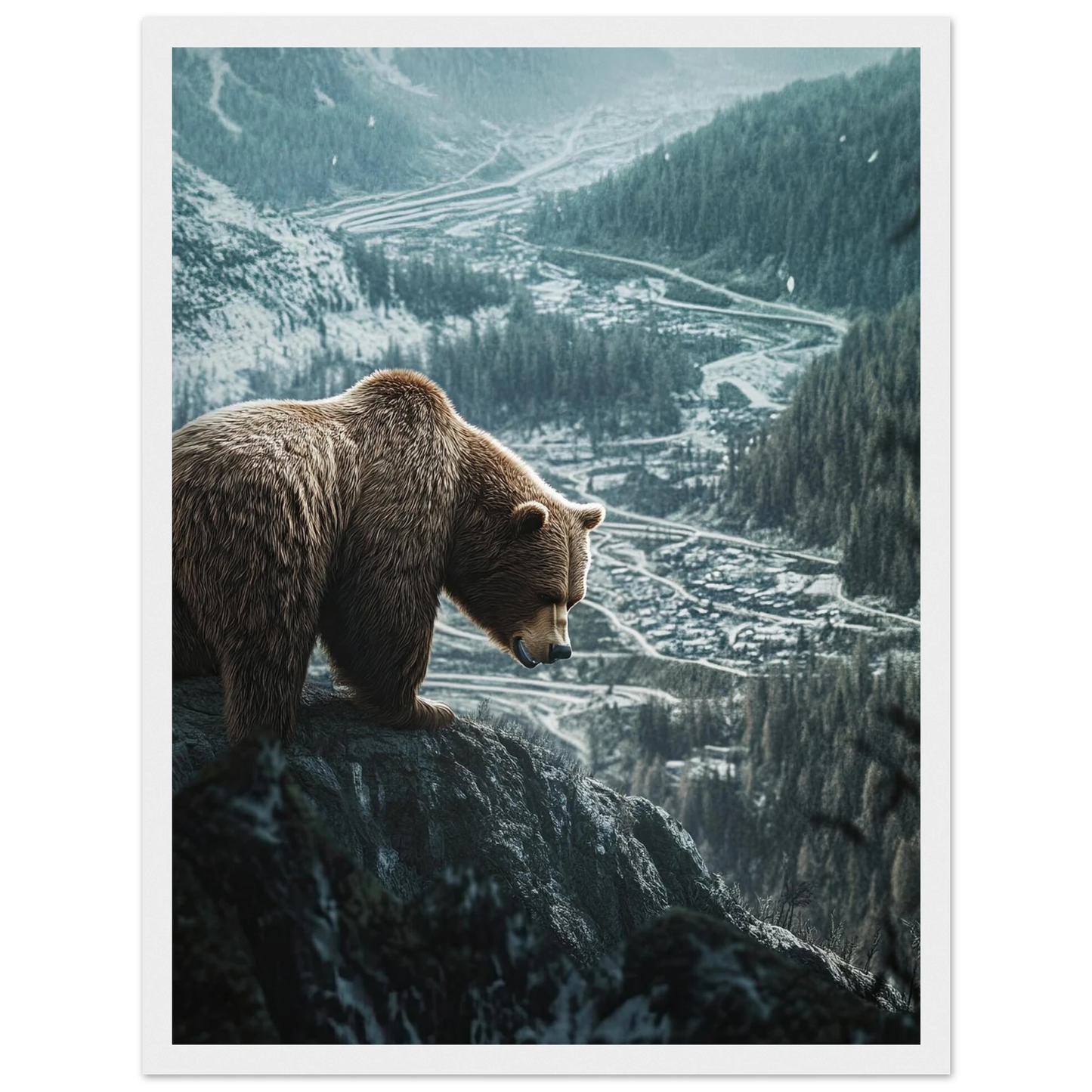 En tankevekkende kunstplakat som fanger øyeblikket der bjørnen betrakter dalen han en gang kalte sitt hjem. Naturens mektige skaper blir til en stille observatør av en verden i endring. Et bilde som minner oss om balansen mellom natur og sivilisasjon — og alt vi en gang tok for gitt.
