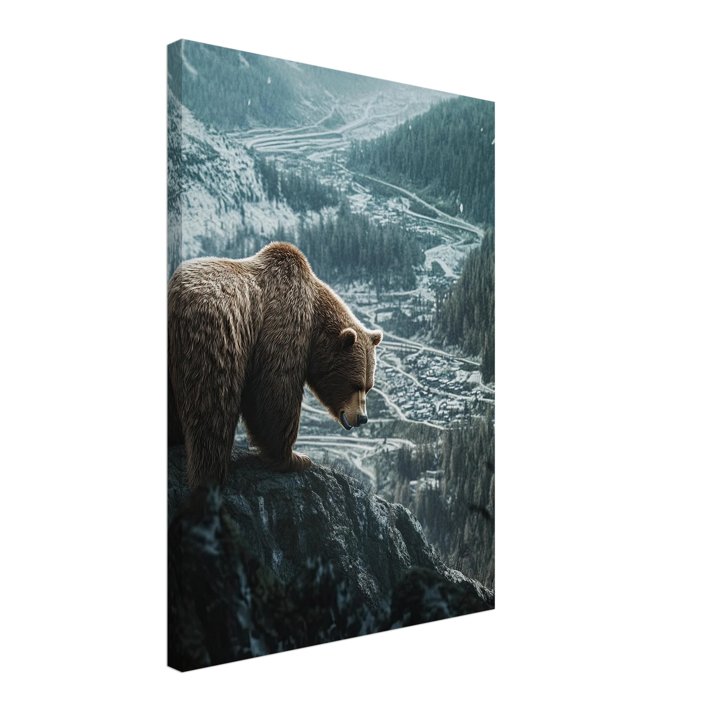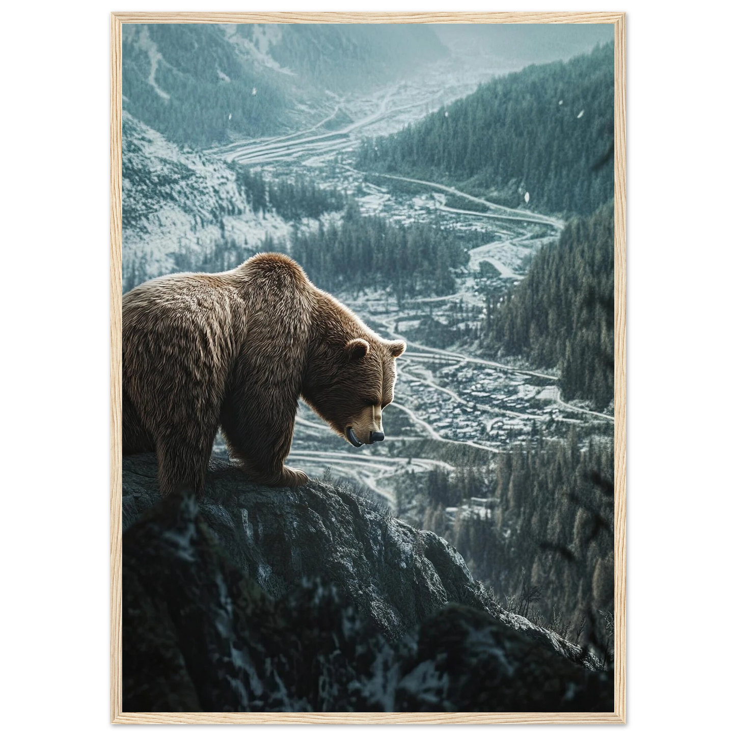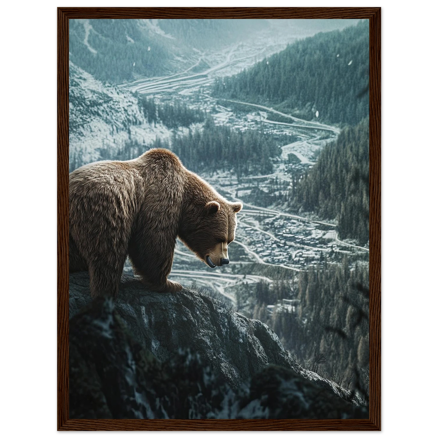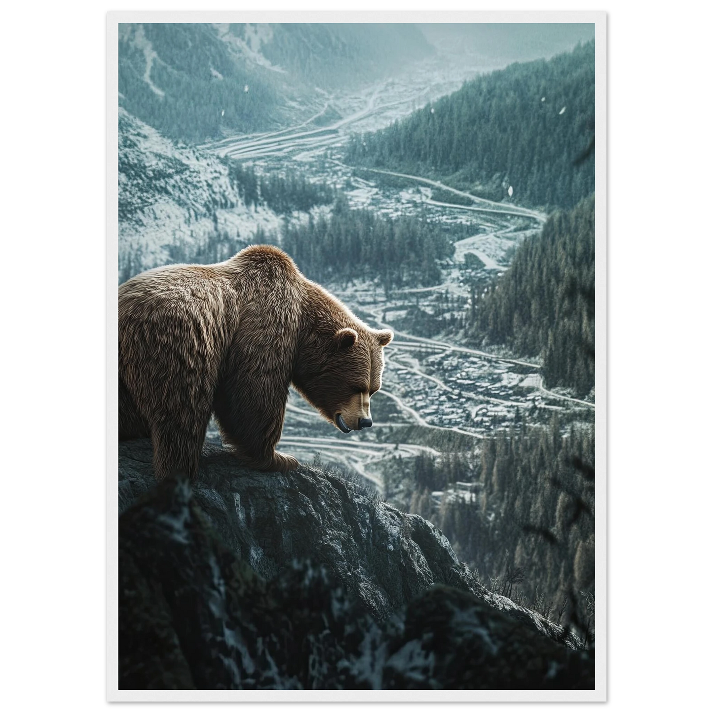 En tankevekkende kunstplakat som fanger øyeblikket der bjørnen betrakter dalen han en gang kalte sitt hjem. Naturens mektige skaper blir til en stille observatør av en verden i endring. Et bilde som minner oss om balansen mellom natur og sivilisasjon — og alt vi en gang tok for gitt.