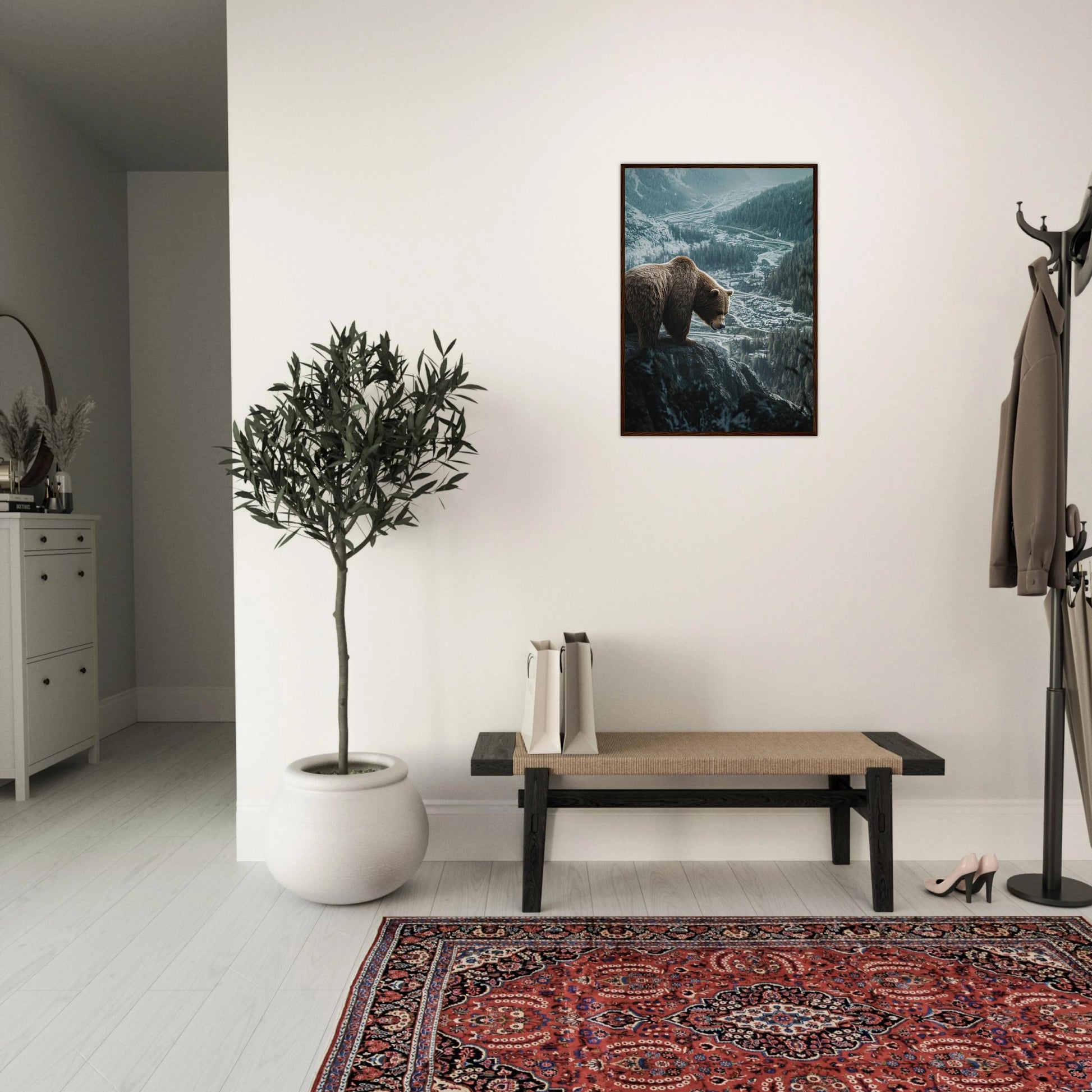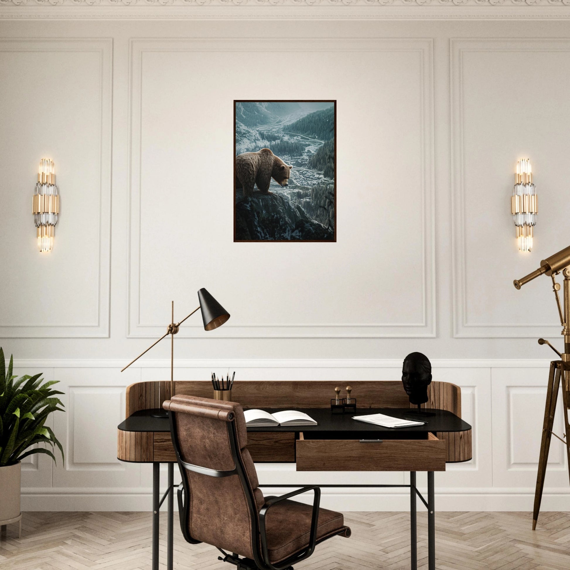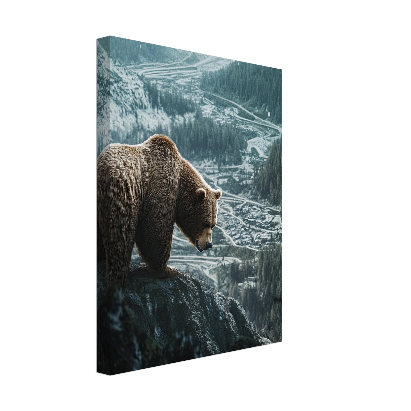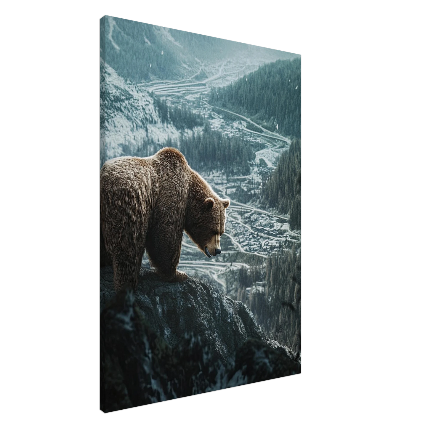 En tankevekkende kunstplakat som fanger øyeblikket der bjørnen betrakter dalen han en gang kalte sitt hjem. Naturens mektige skaper blir til en stille observatør av en verden i endring. Et bilde som minner oss om balansen mellom natur og sivilisasjon — og alt vi en gang tok for gitt.
