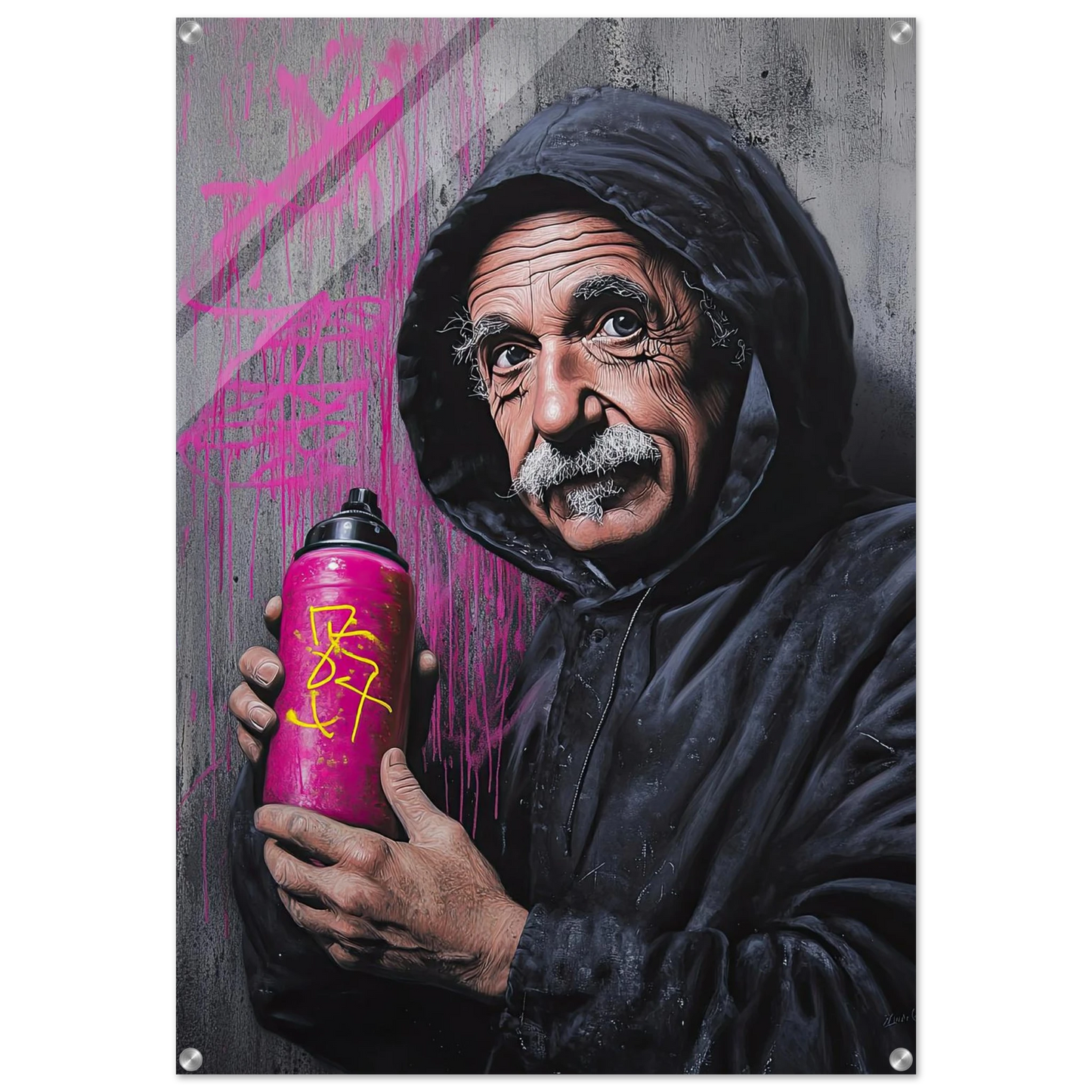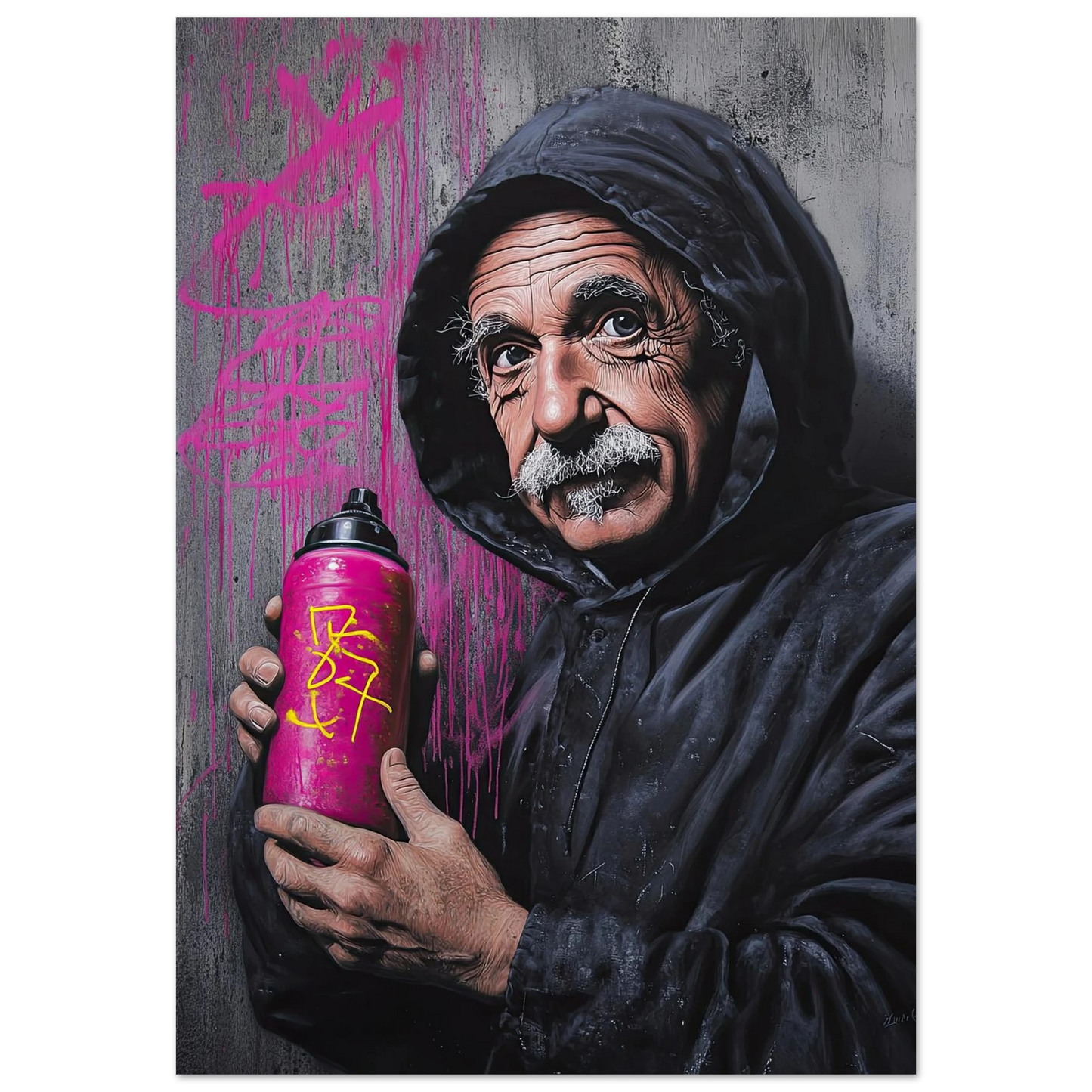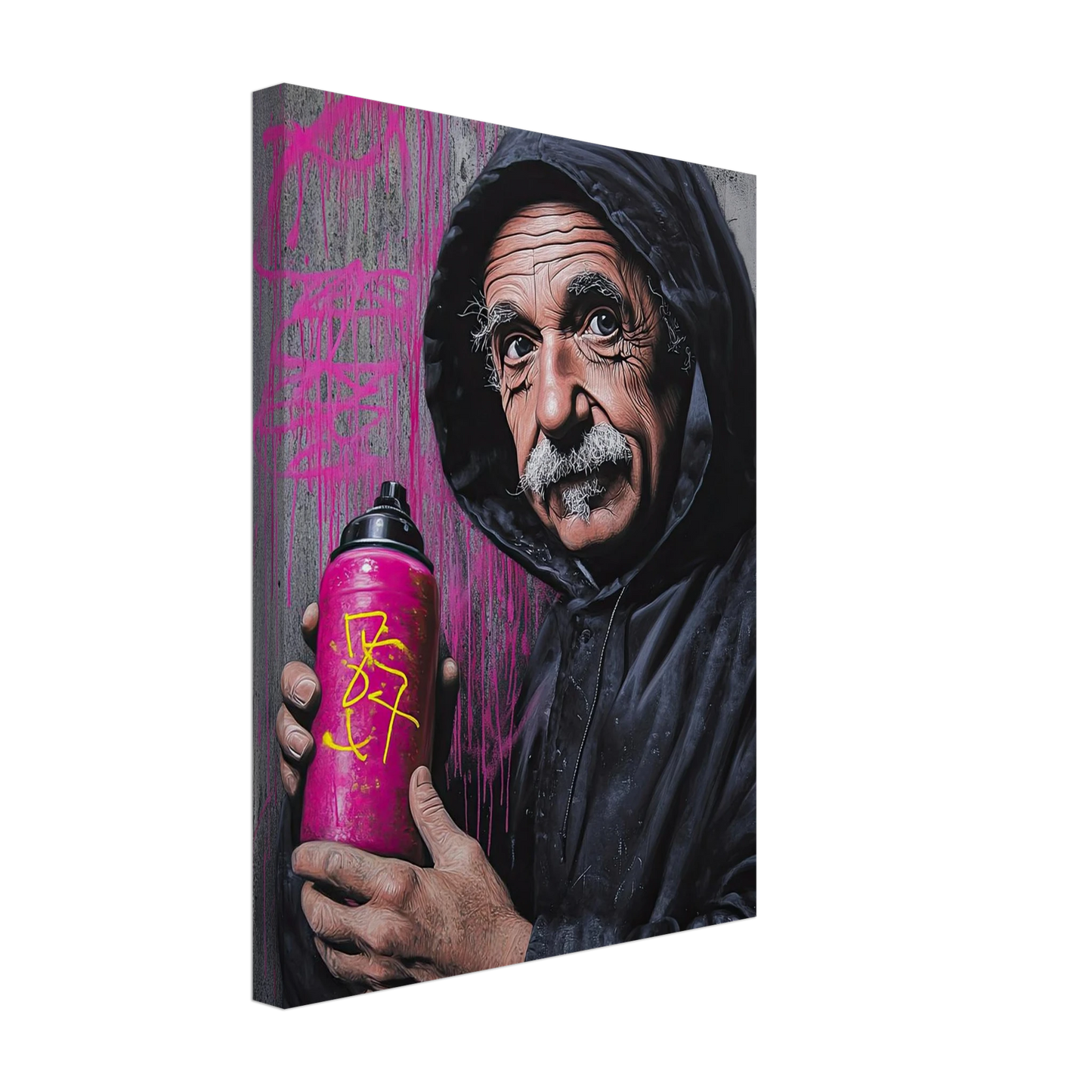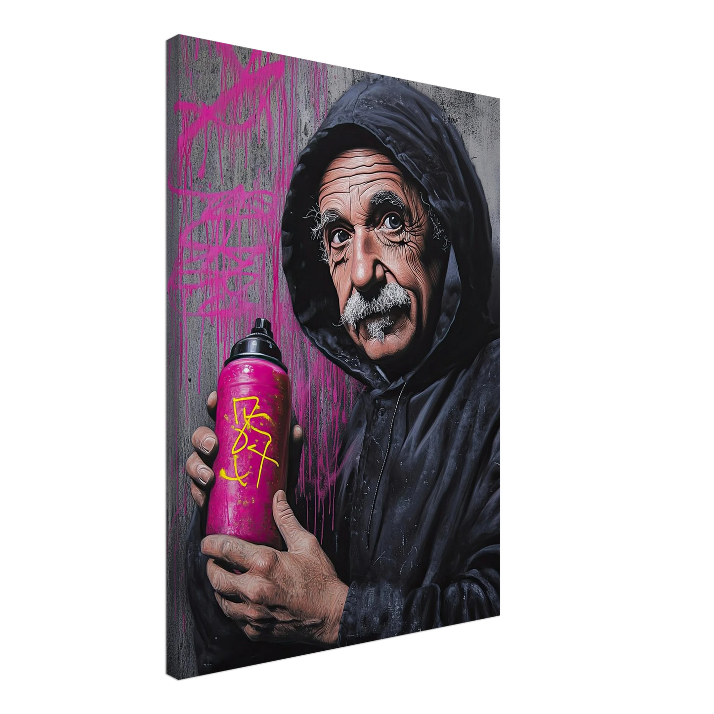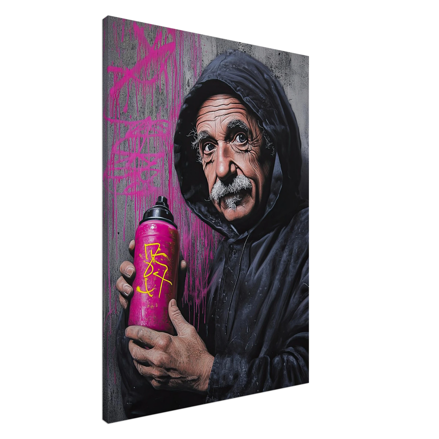 Et humoristisk og urbant portrett som setter geniet Albert Einstein i en helt ny kontekst – som gatekunstner med sprayboks i hånden. Kontrasten mellom den seriøse figuren og de fargerike graffitidetaljene skaper en leken miks av vitenskap og street culture. Perfekt for deg som vil kombinere intelligens med attitude i interiøret.