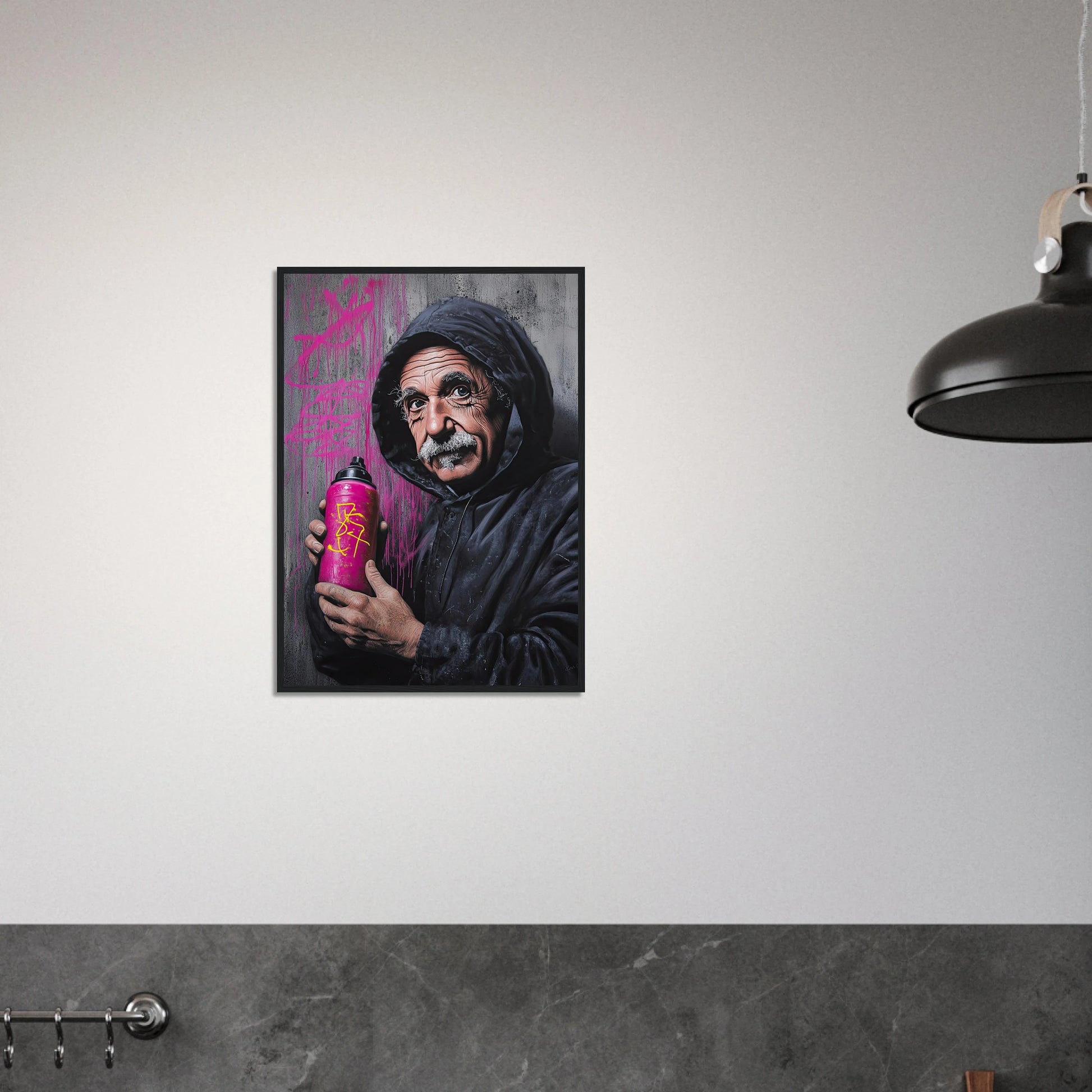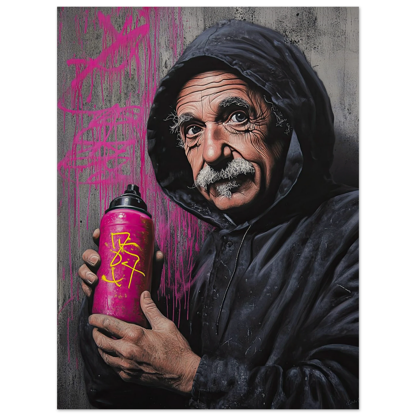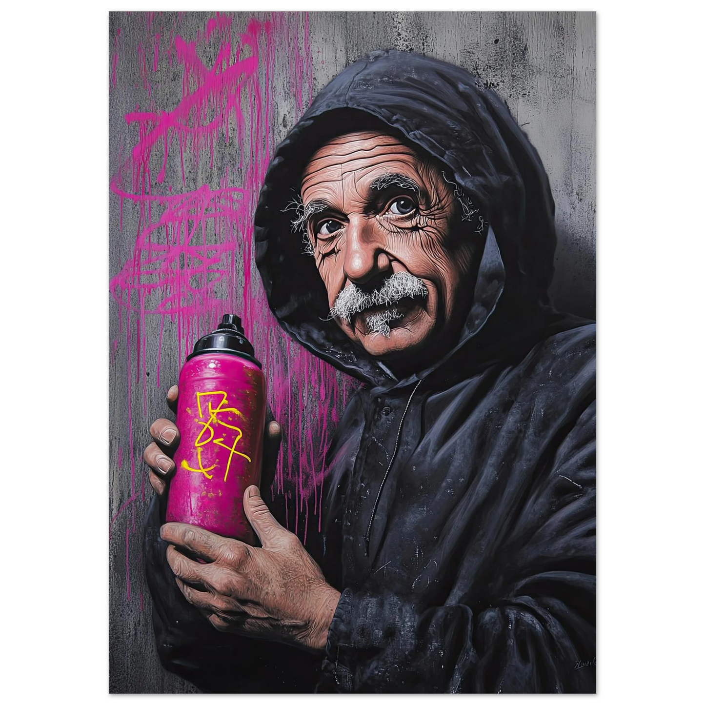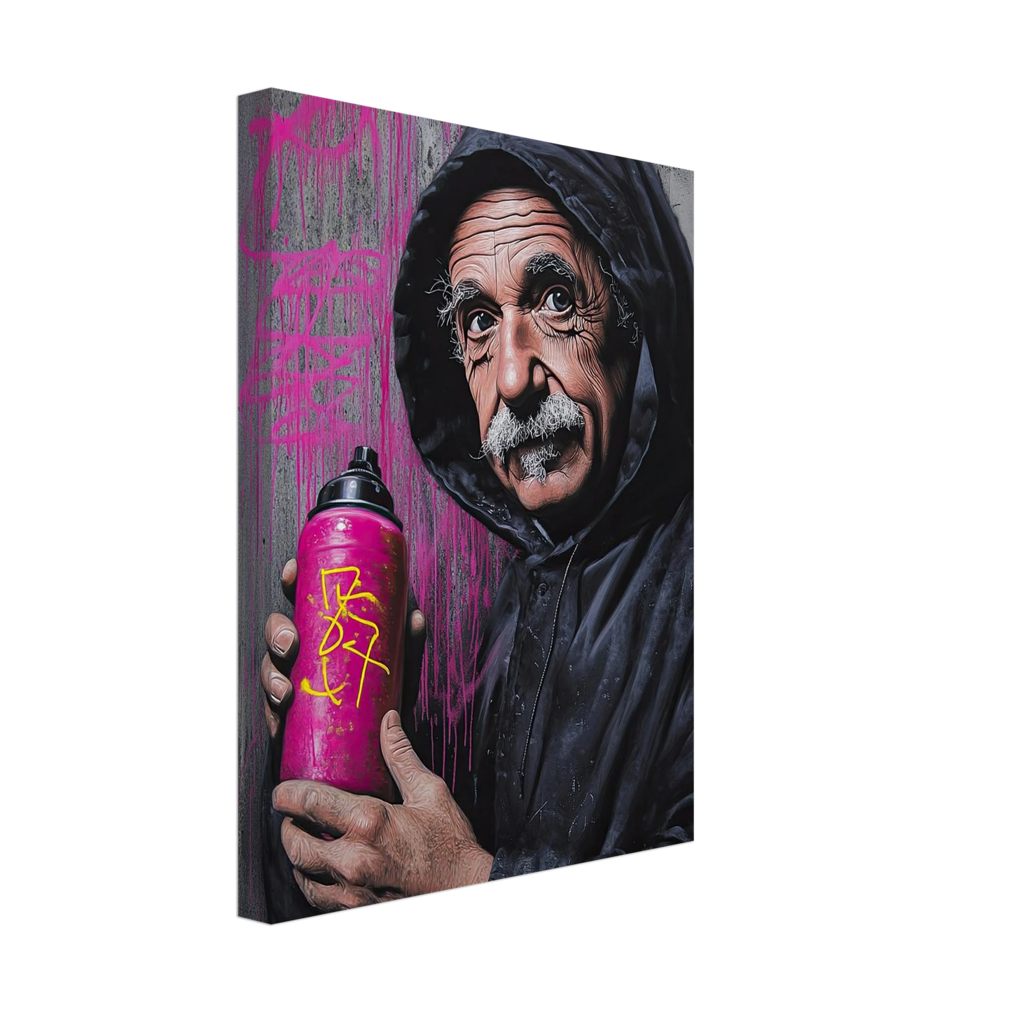 Et humoristisk og urbant portrett som setter geniet Albert Einstein i en helt ny kontekst – som gatekunstner med sprayboks i hånden. Kontrasten mellom den seriøse figuren og de fargerike graffitidetaljene skaper en leken miks av vitenskap og street culture. Perfekt for deg som vil kombinere intelligens med attitude i interiøret.