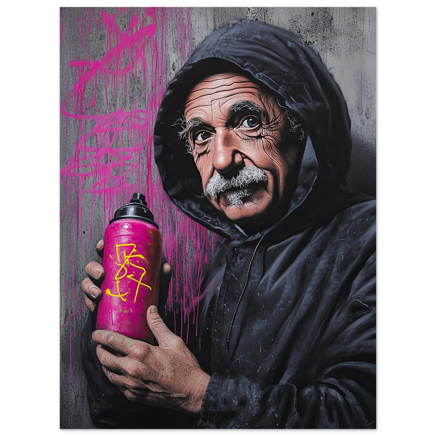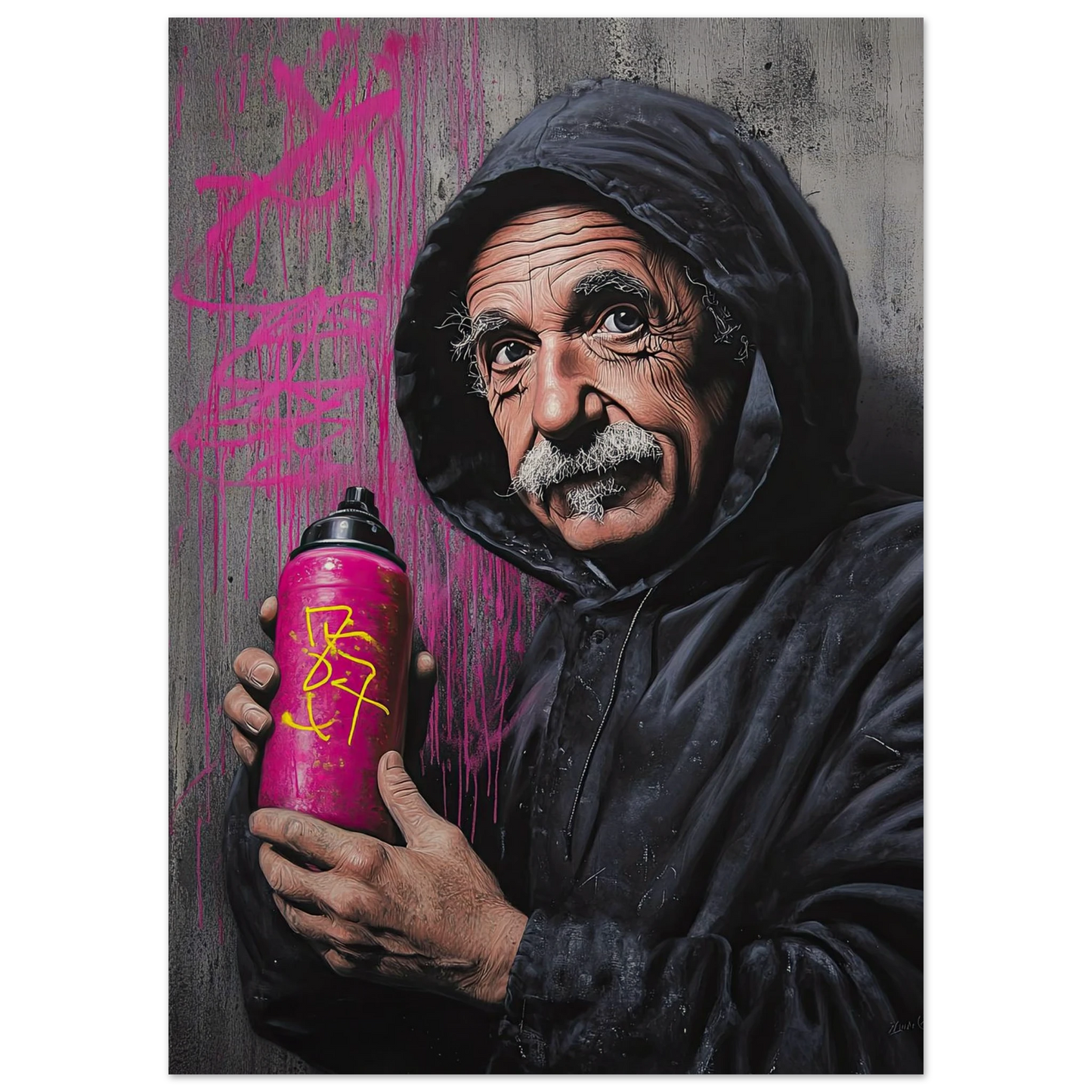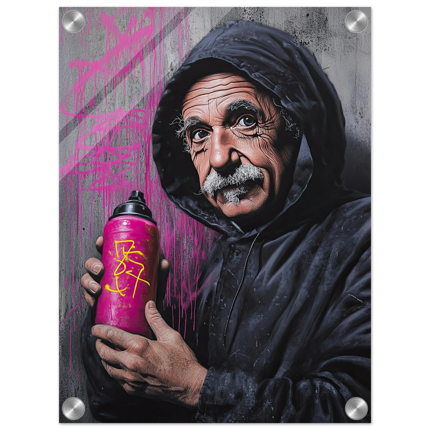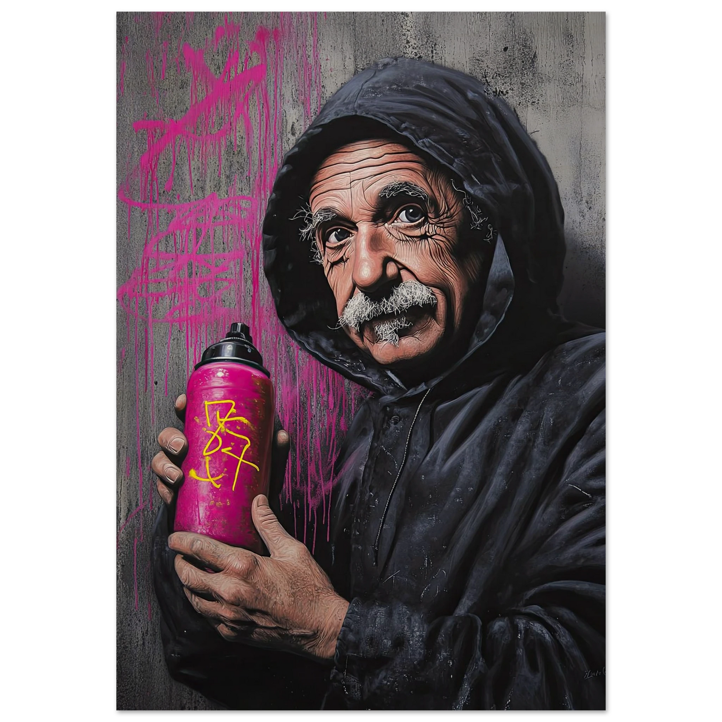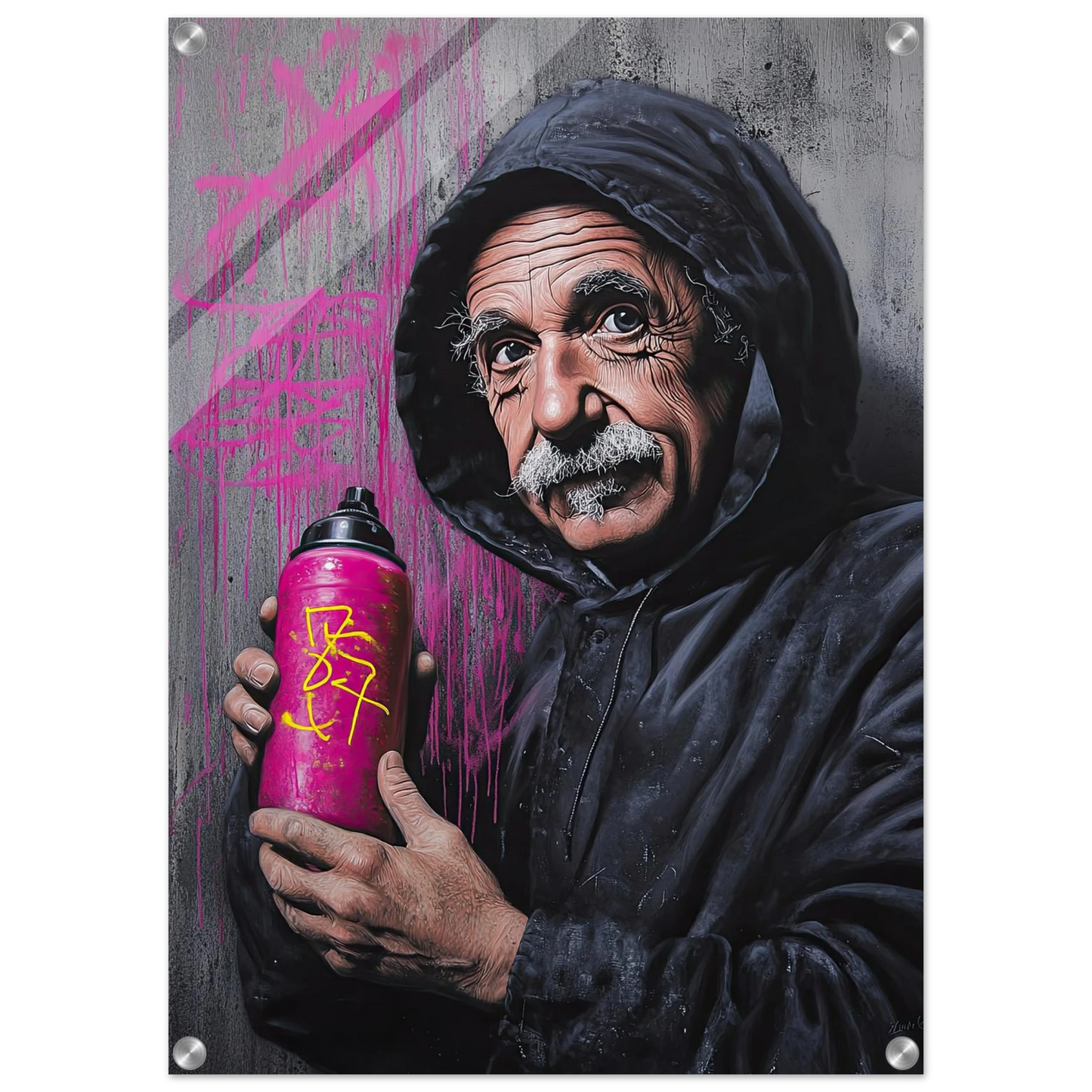 Et humoristisk og urbant portrett som setter geniet Albert Einstein i en helt ny kontekst – som gatekunstner med sprayboks i hånden. Kontrasten mellom den seriøse figuren og de fargerike graffitidetaljene skaper en leken miks av vitenskap og street culture. Perfekt for deg som vil kombinere intelligens med attitude i interiøret.