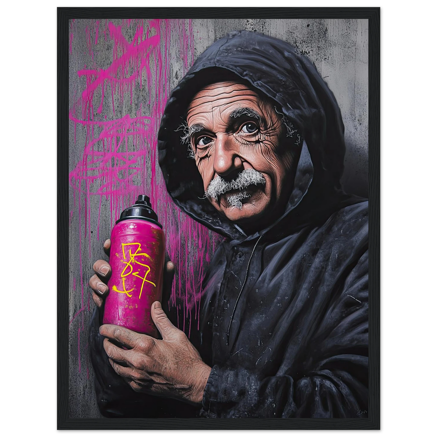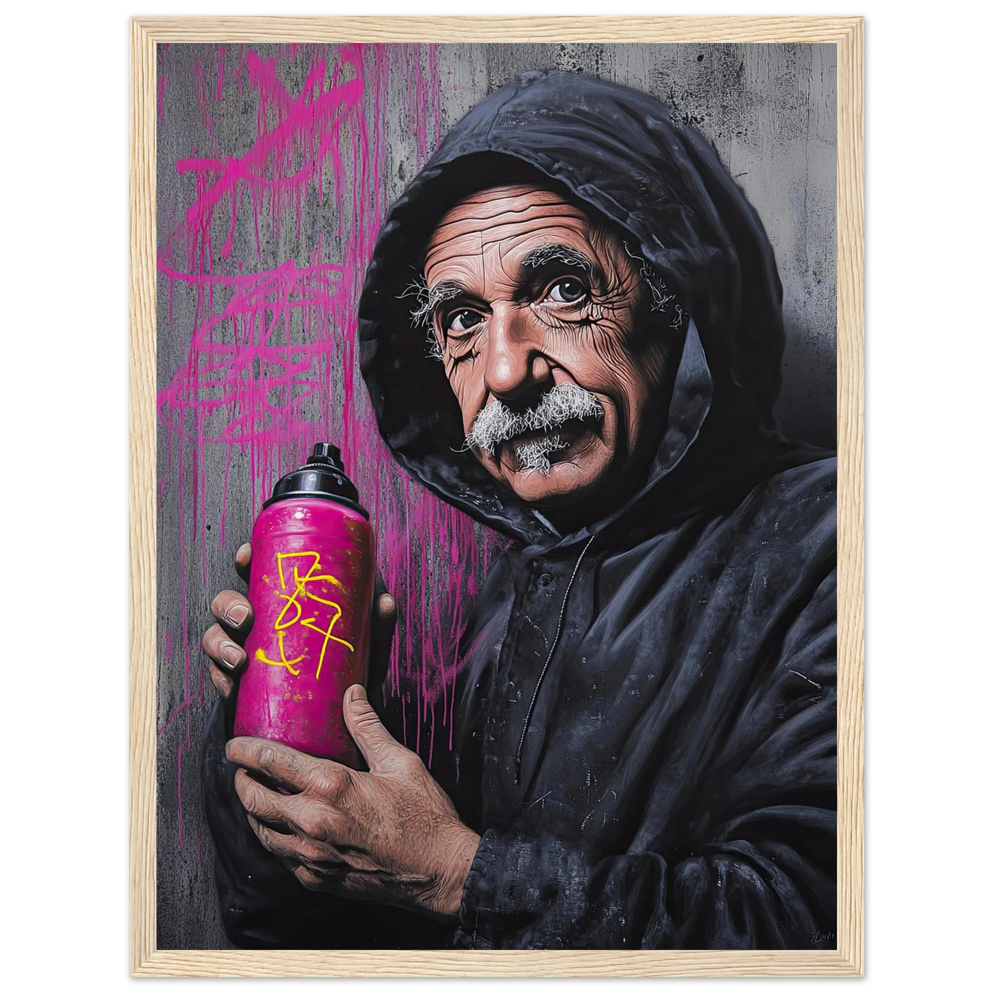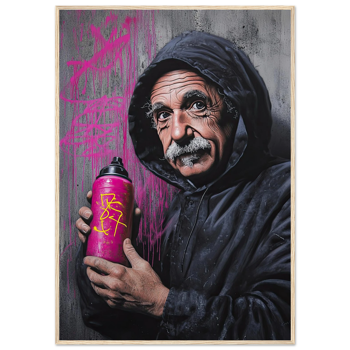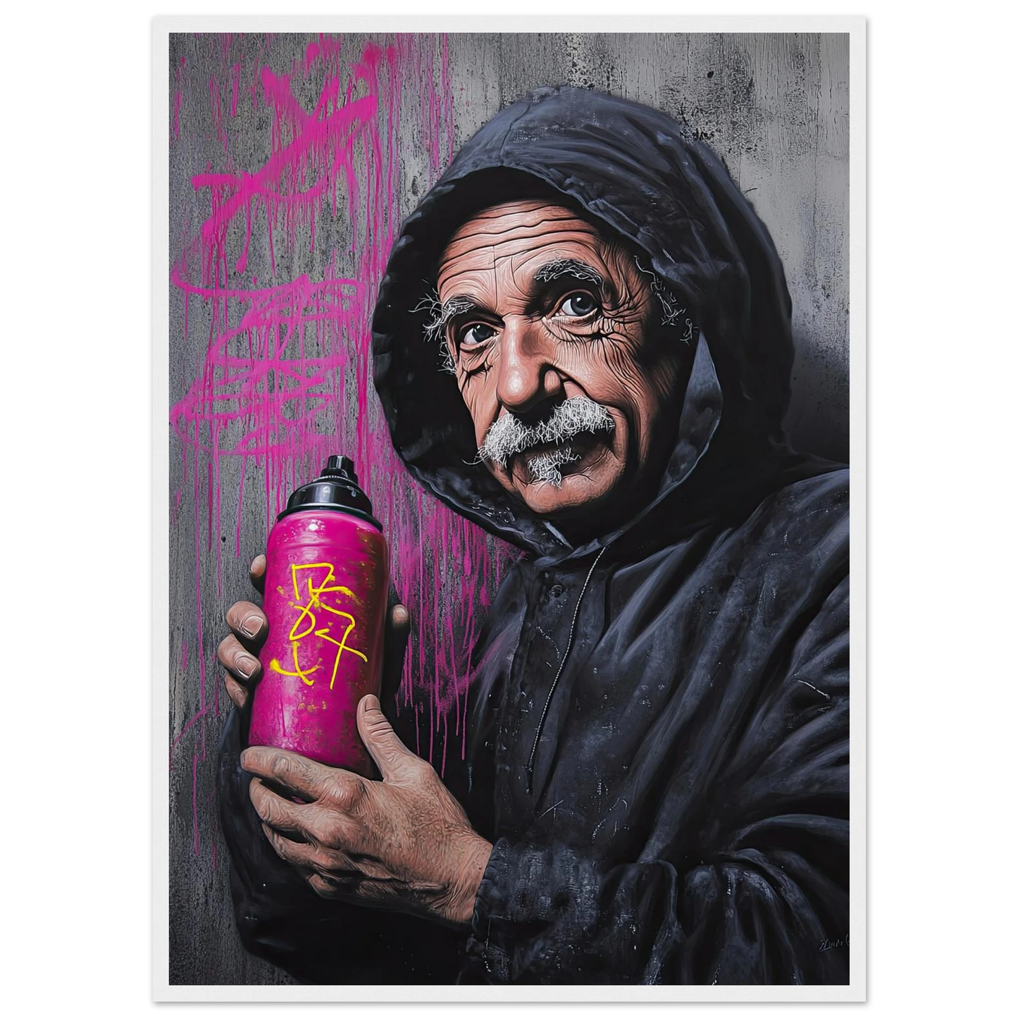 Et humoristisk og urbant portrett som setter geniet Albert Einstein i en helt ny kontekst – som gatekunstner med sprayboks i hånden. Kontrasten mellom den seriøse figuren og de fargerike graffitidetaljene skaper en leken miks av vitenskap og street culture. Perfekt for deg som vil kombinere intelligens med attitude i interiøret.