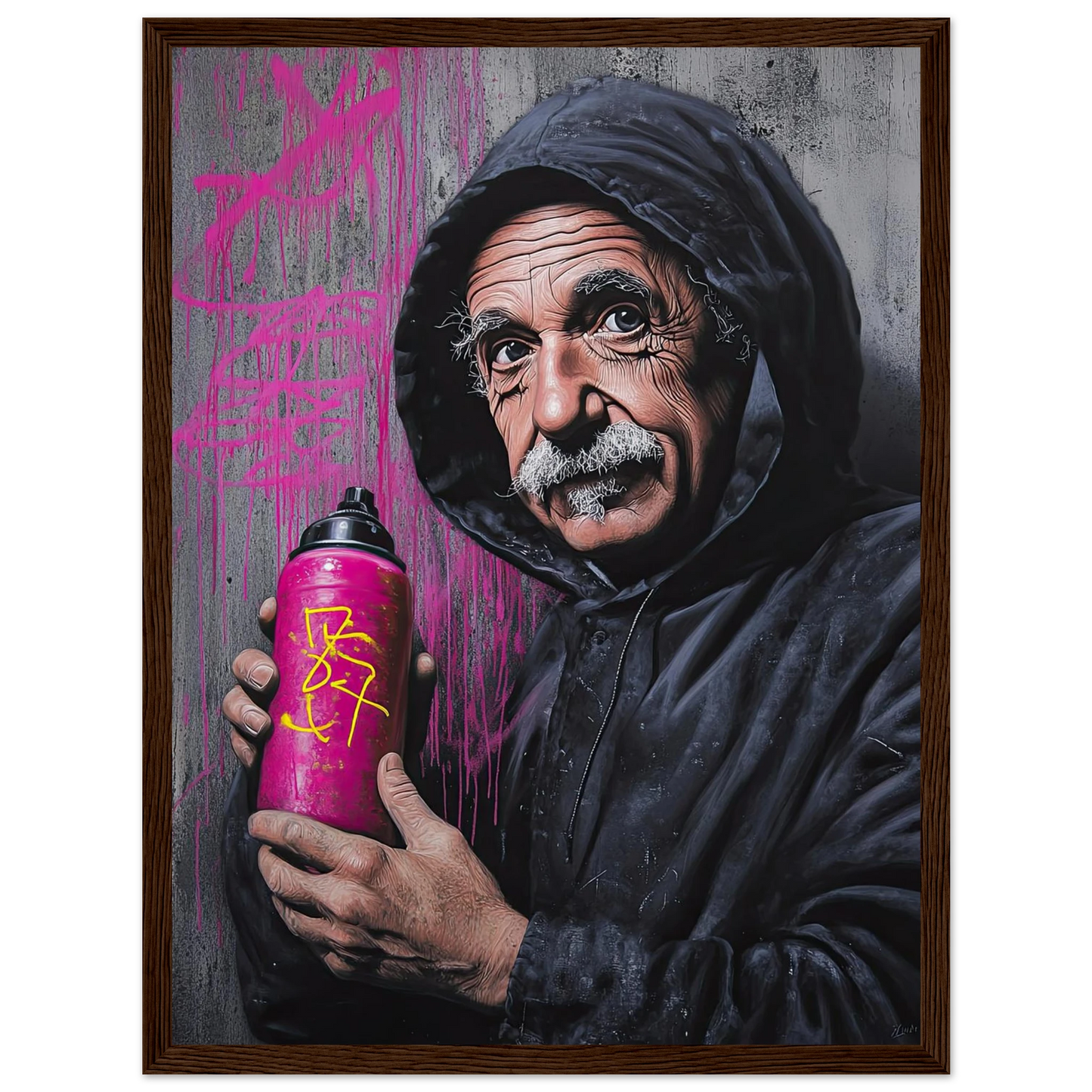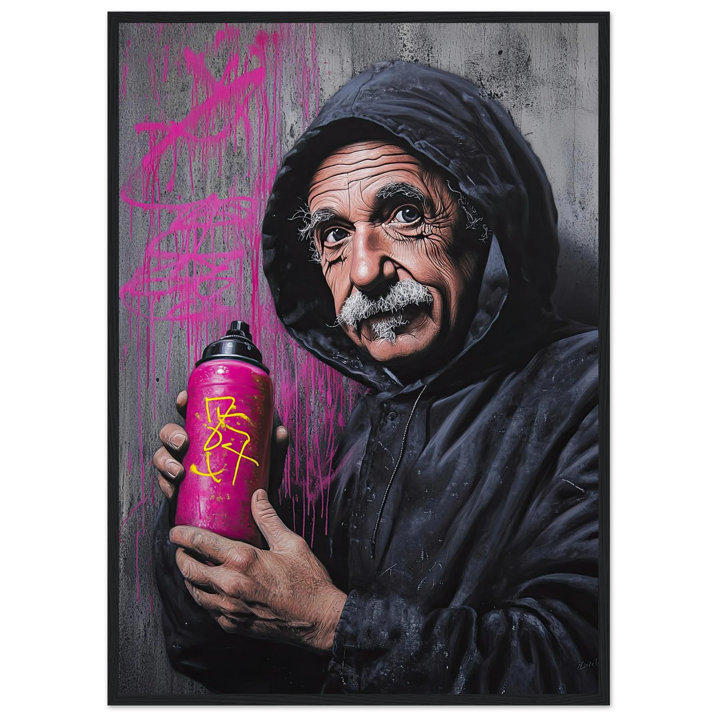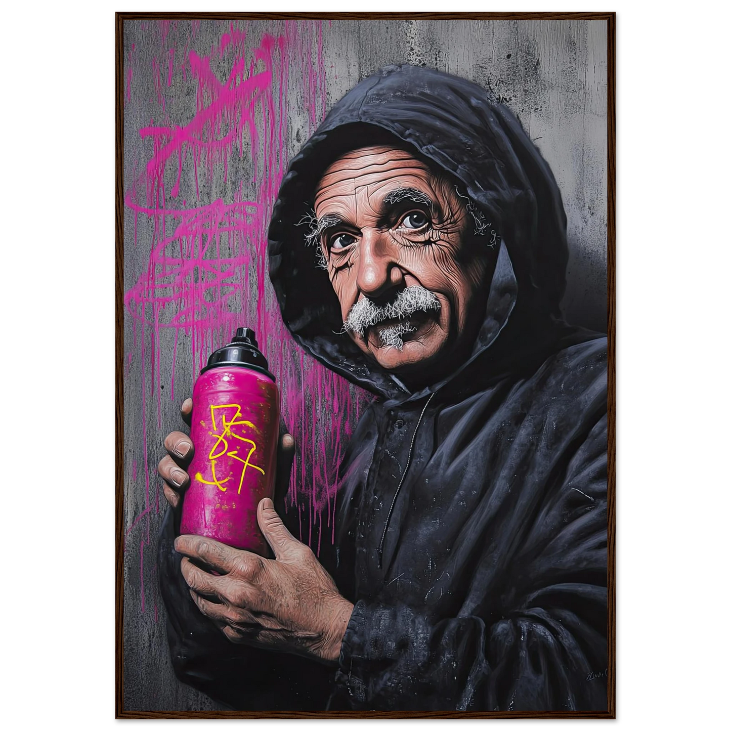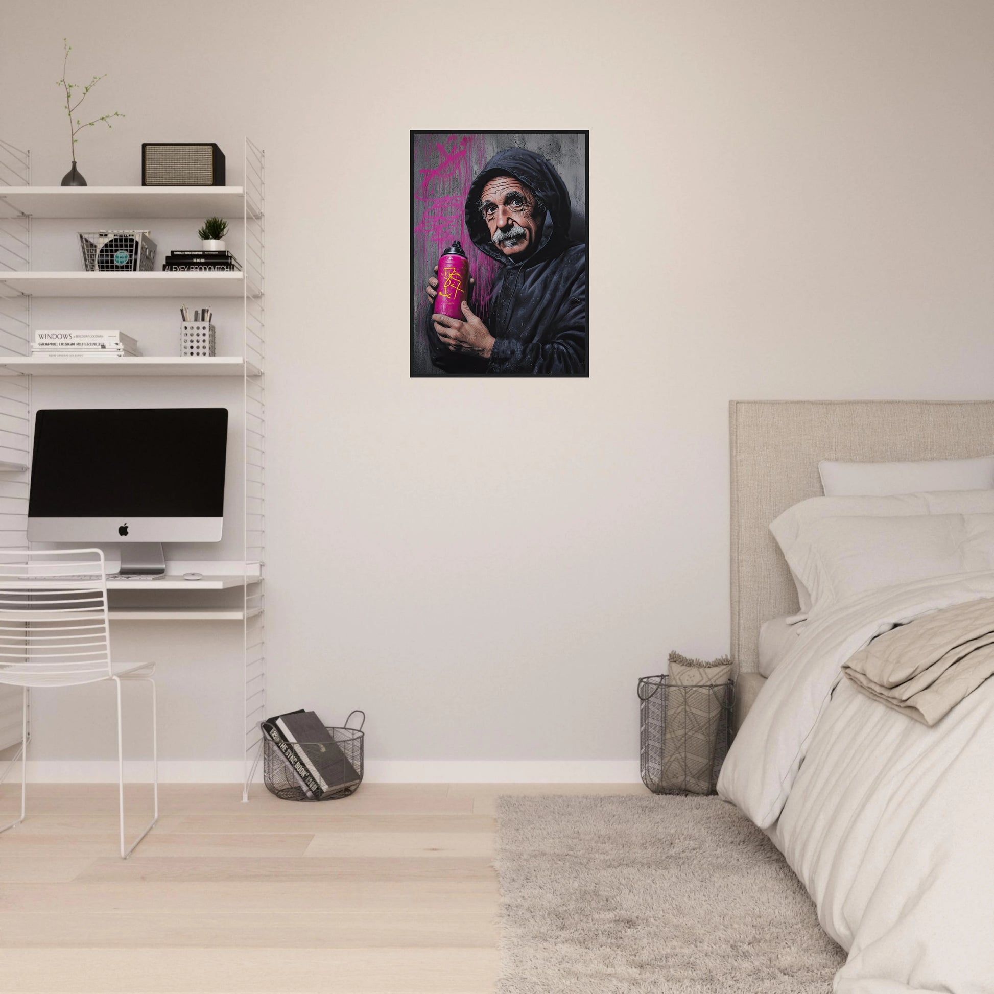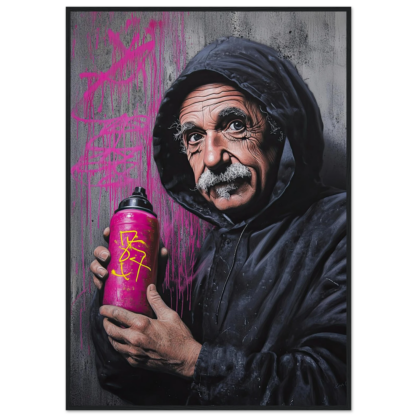Et humoristisk og urbant portrett som setter geniet Albert Einstein i en helt ny kontekst – som gatekunstner med sprayboks i hånden. Kontrasten mellom den seriøse figuren og de fargerike graffitidetaljene skaper en leken miks av vitenskap og street culture. Perfekt for deg som vil kombinere intelligens med attitude i interiøret.