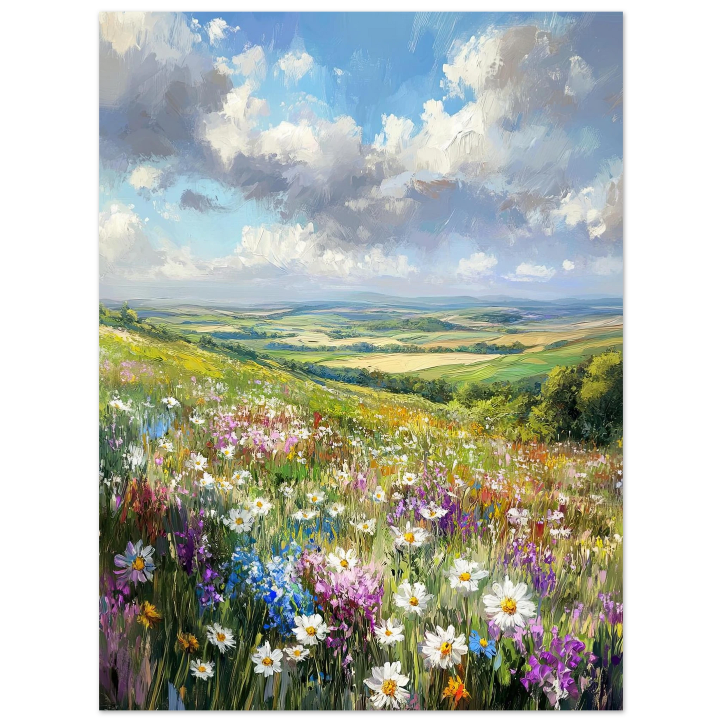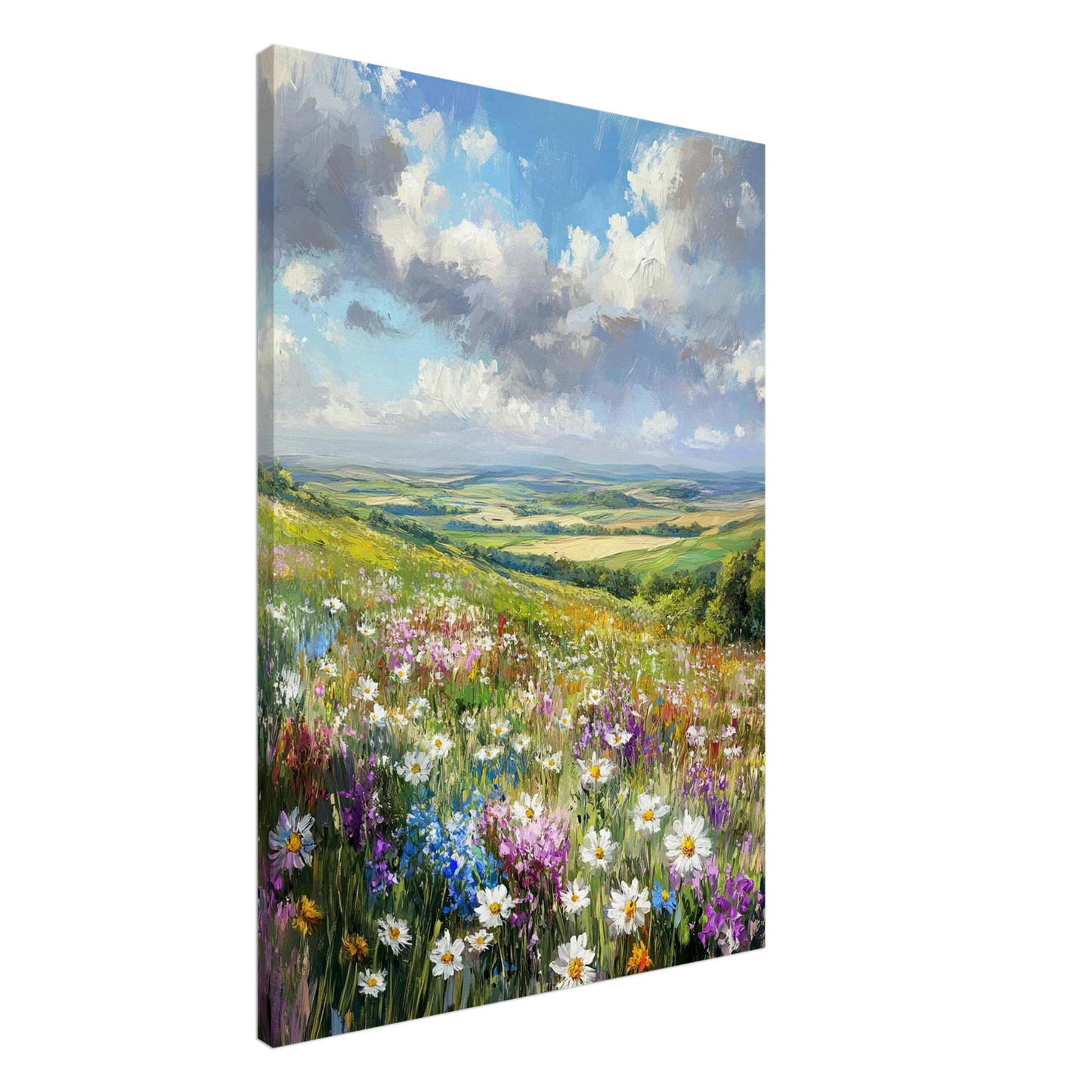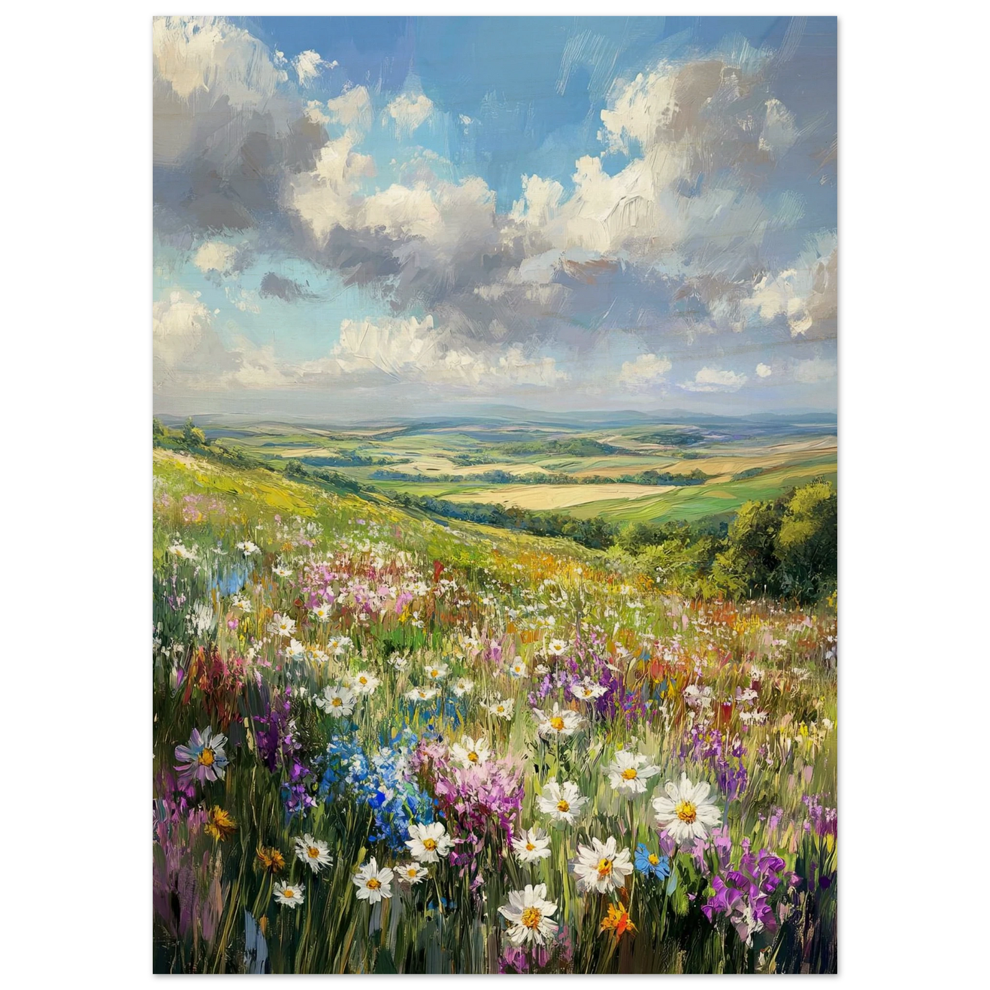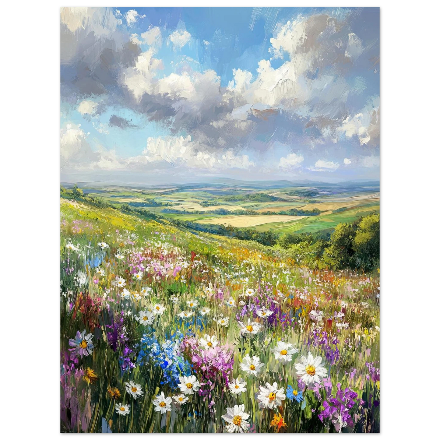 Et levende og fargerikt landskap der markblomster i alle nyanser sprer seg utover en ås med utsikt mot daler og fjell i det fjerne. Skyene danser over himmelen og gir bildet en dynamisk og frisk stemning. Et kunstverk som fyller rommet med energi, glede og naturens uendelige skjønnhet.