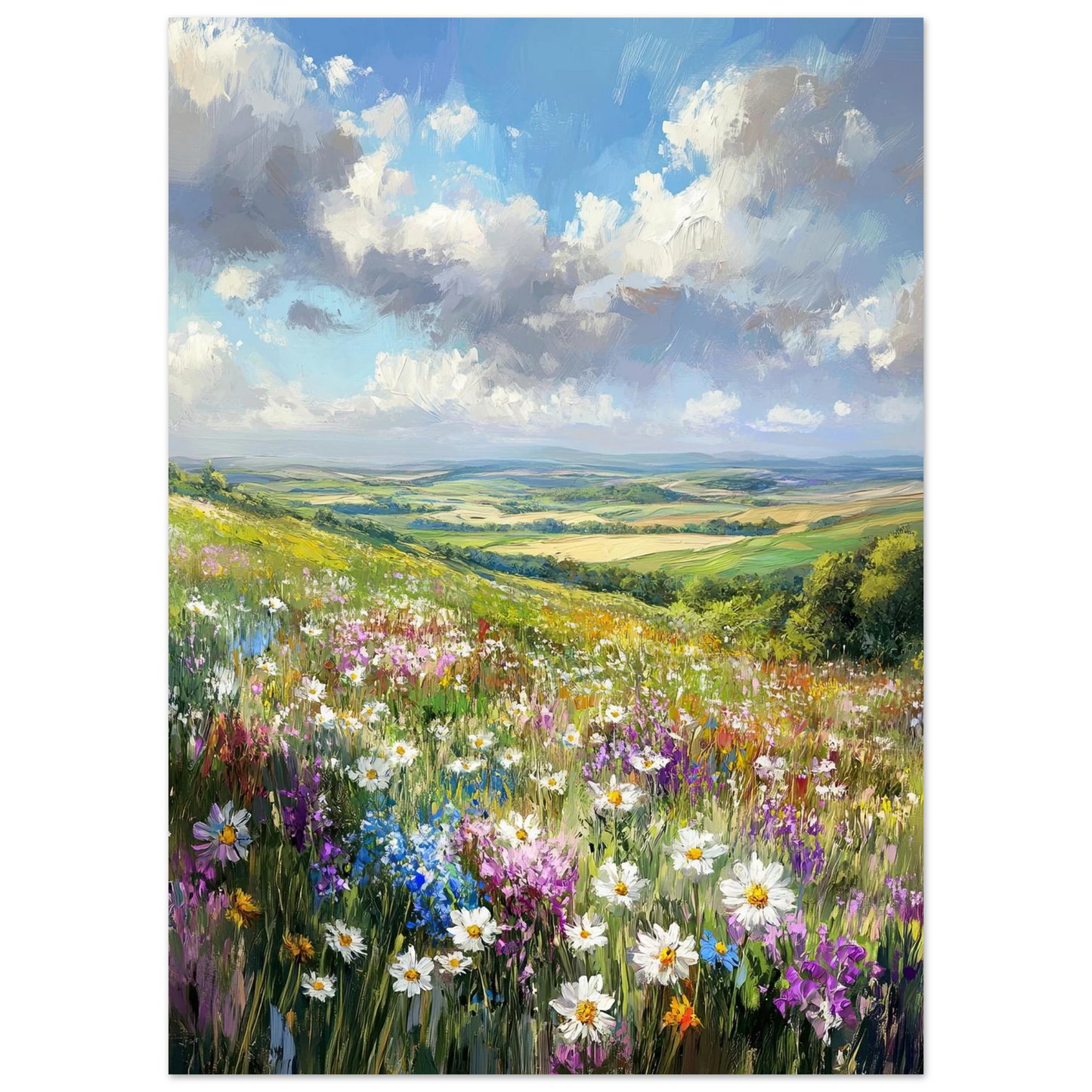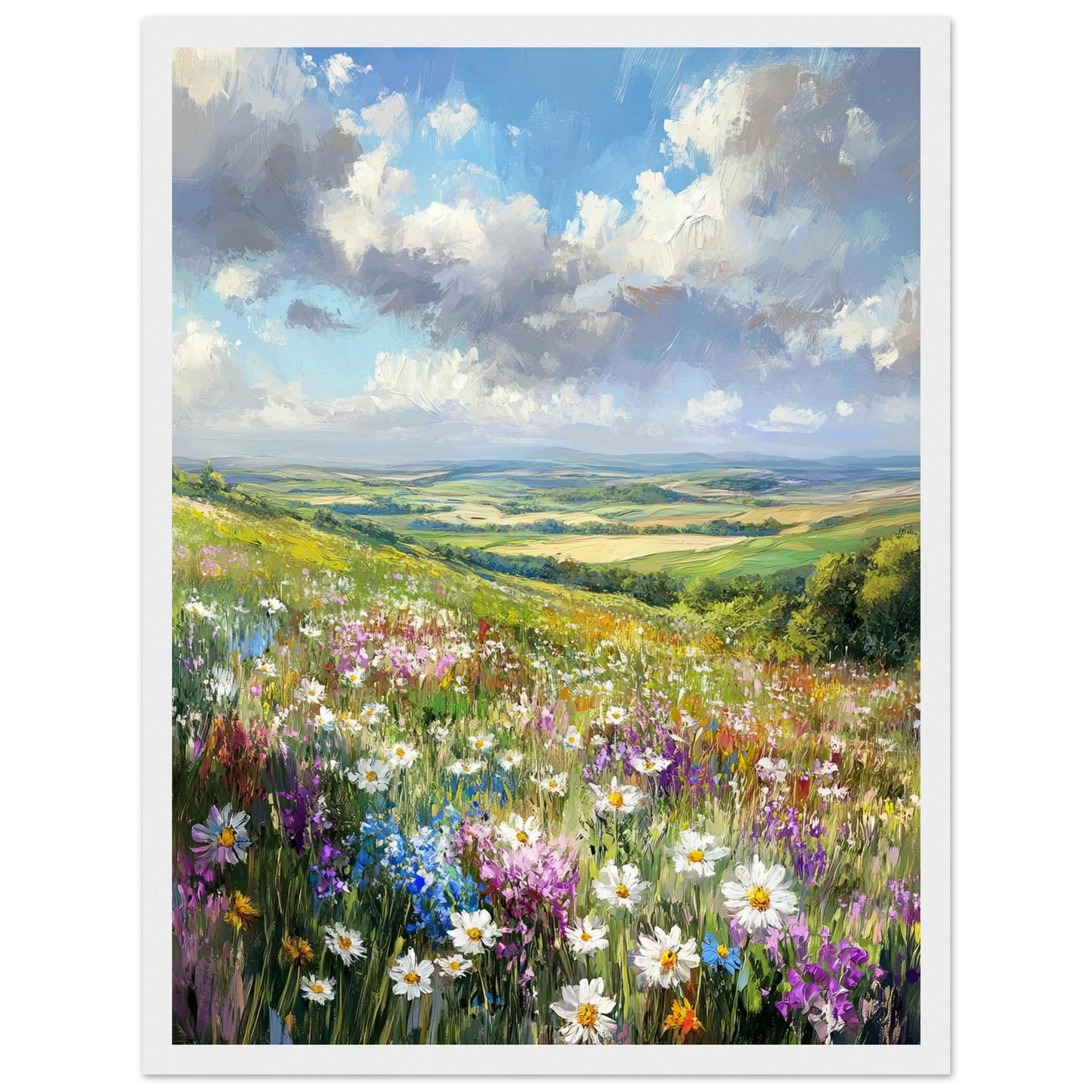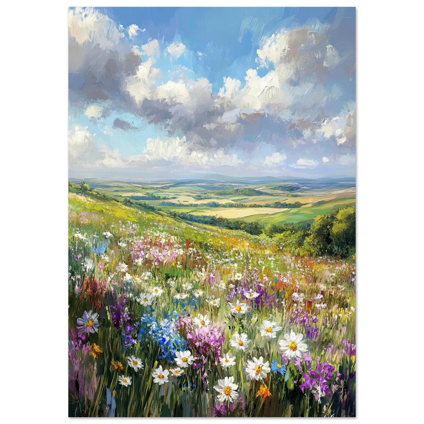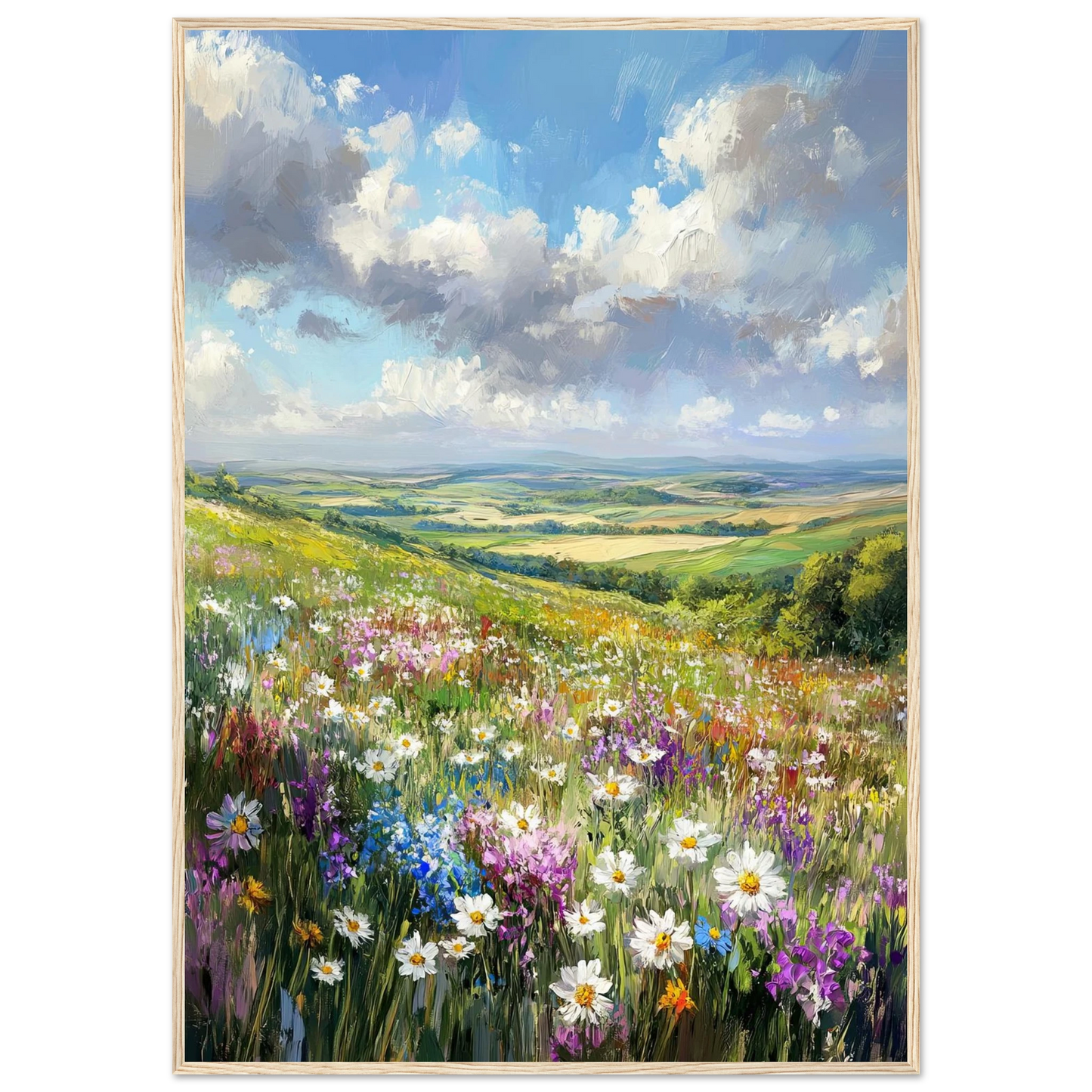 Et levende og fargerikt landskap der markblomster i alle nyanser sprer seg utover en ås med utsikt mot daler og fjell i det fjerne. Skyene danser over himmelen og gir bildet en dynamisk og frisk stemning. Et kunstverk som fyller rommet med energi, glede og naturens uendelige skjønnhet.