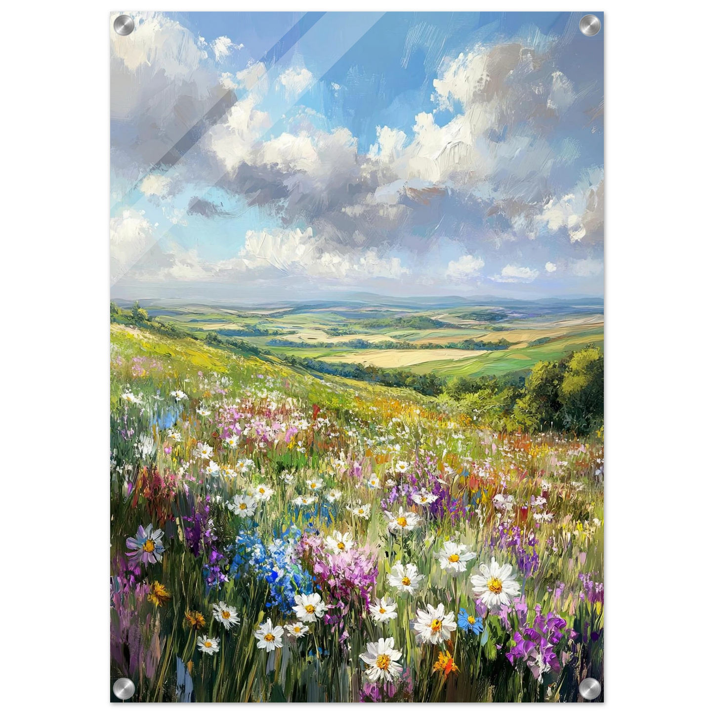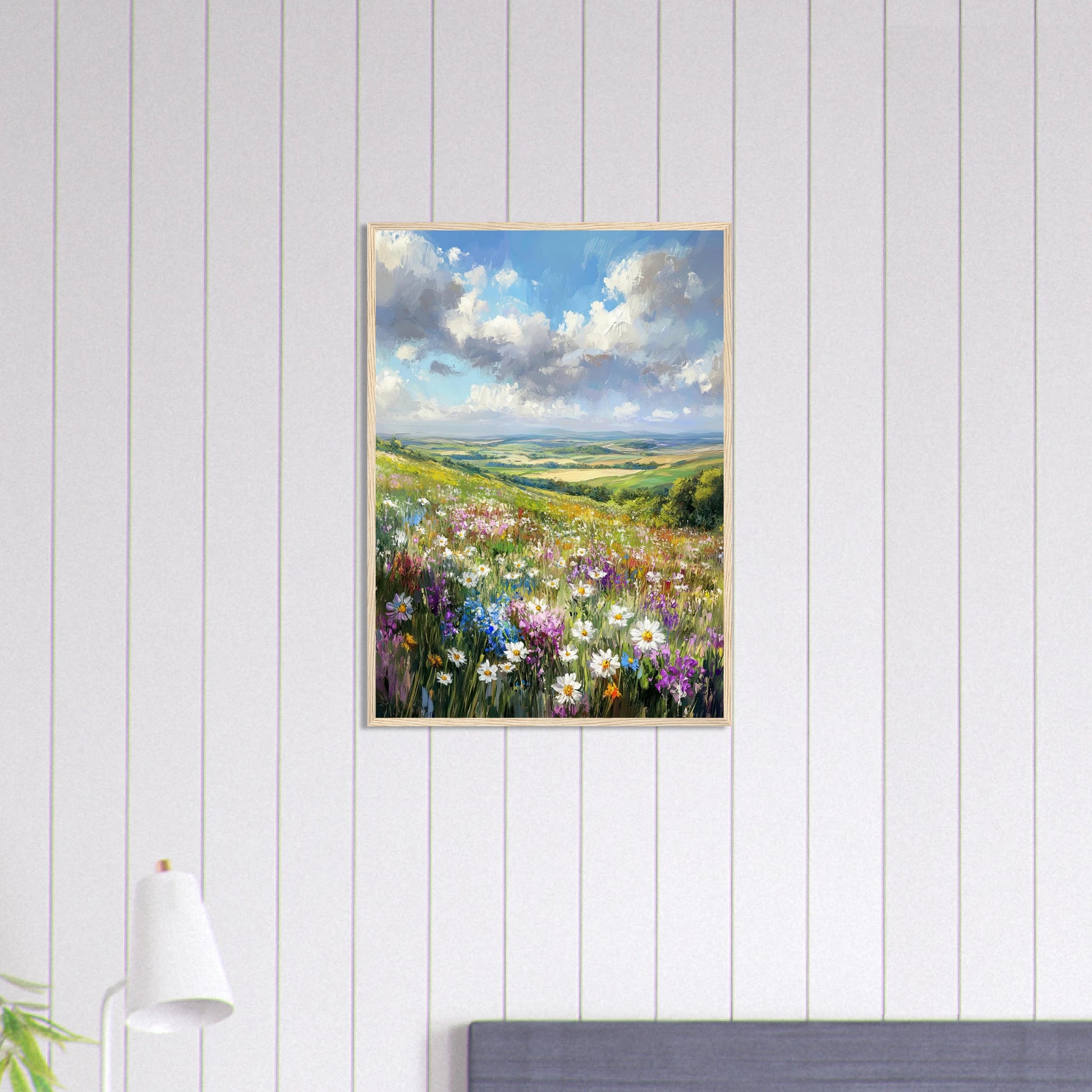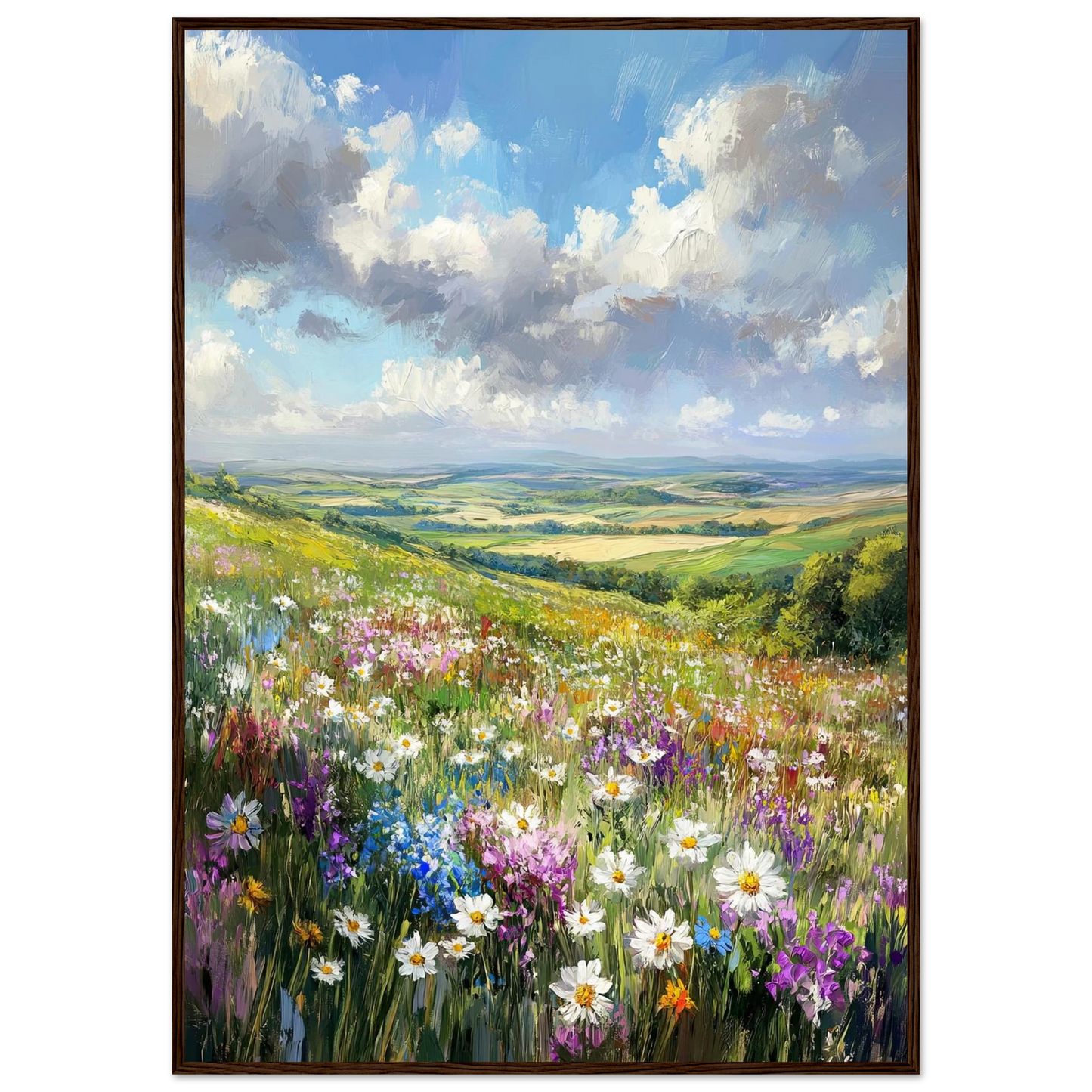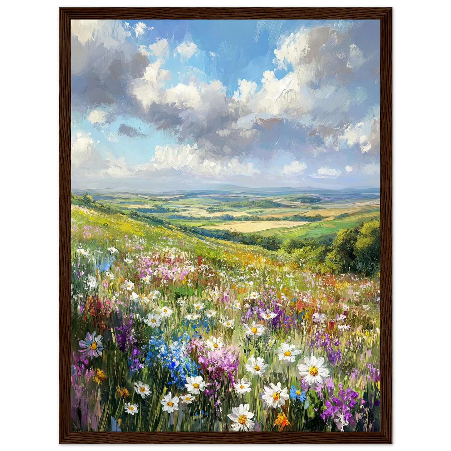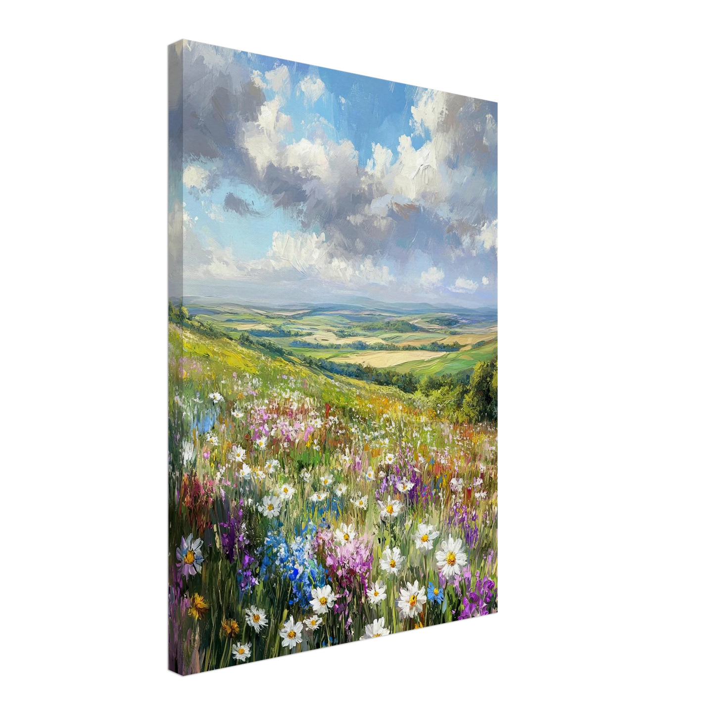 Et levende og fargerikt landskap der markblomster i alle nyanser sprer seg utover en ås med utsikt mot daler og fjell i det fjerne. Skyene danser over himmelen og gir bildet en dynamisk og frisk stemning. Et kunstverk som fyller rommet med energi, glede og naturens uendelige skjønnhet.