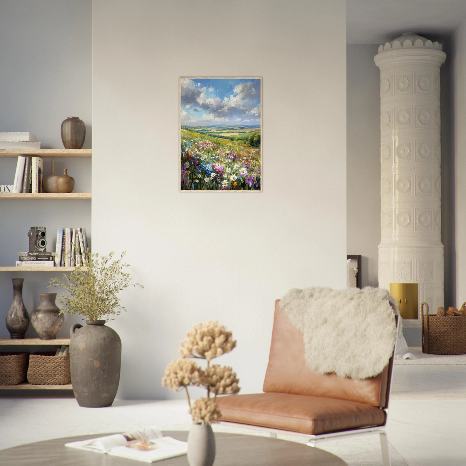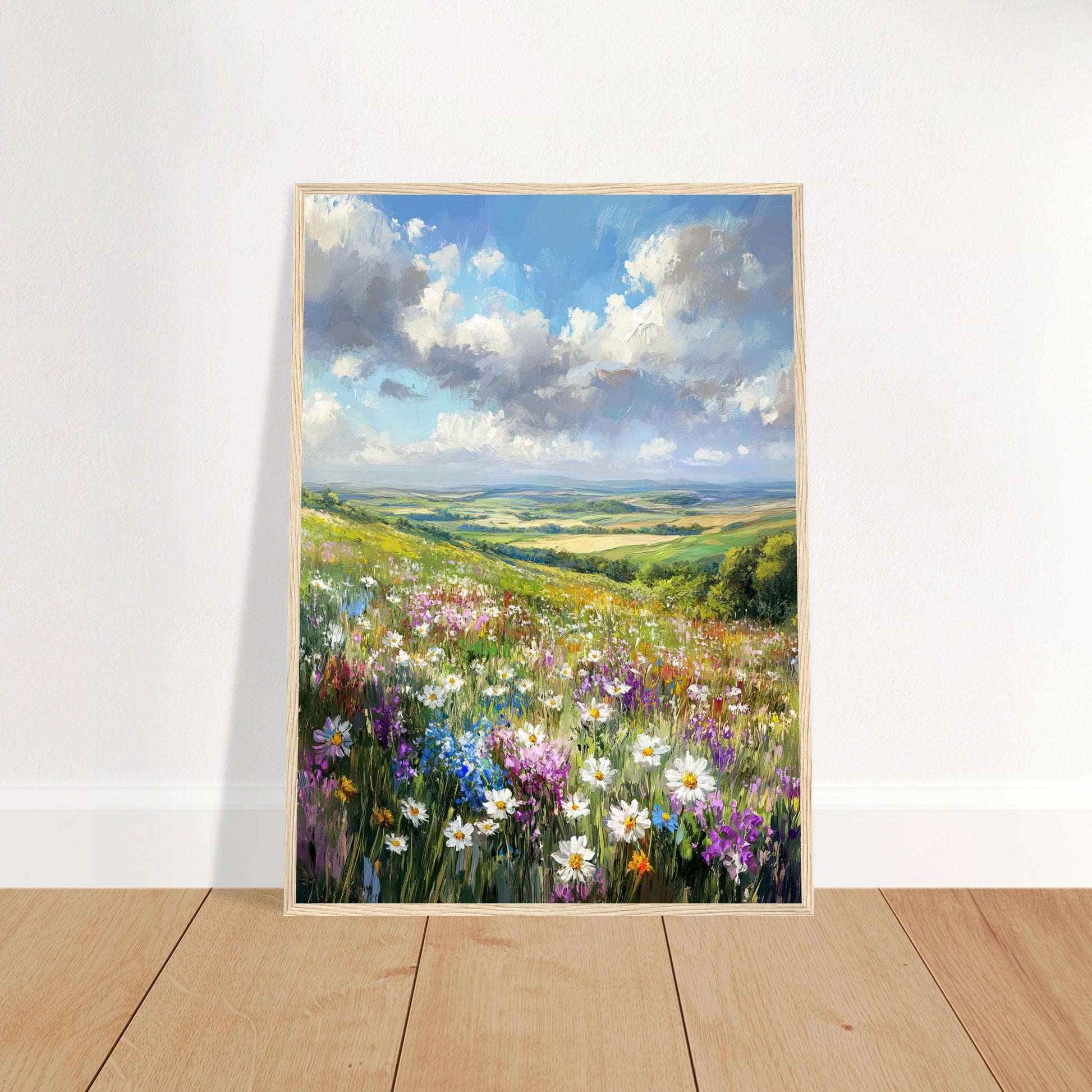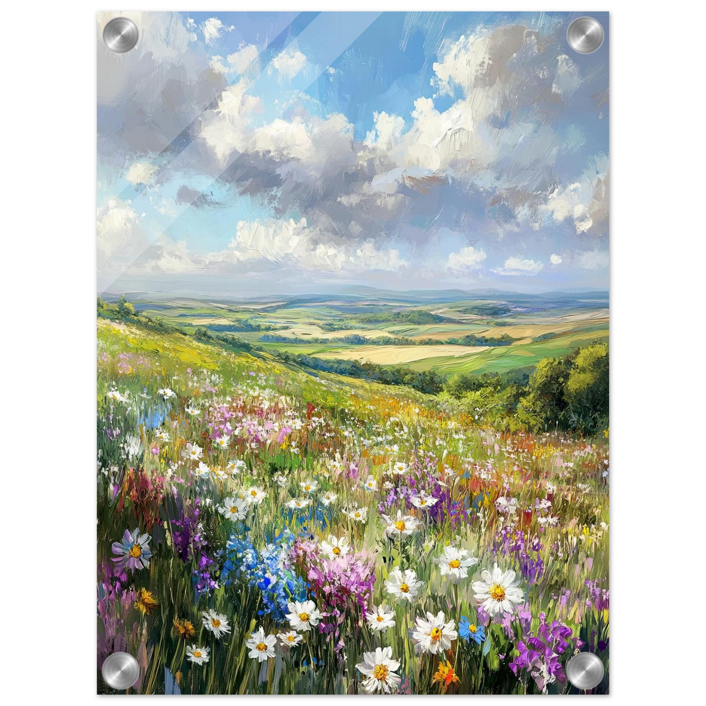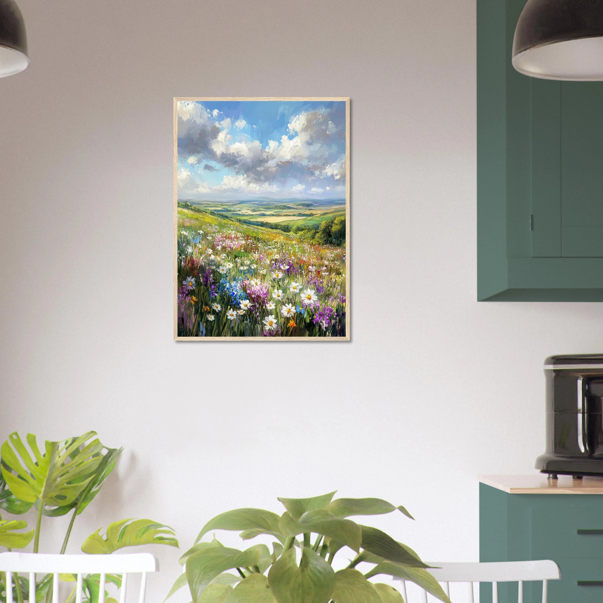 Et levende og fargerikt landskap der markblomster i alle nyanser sprer seg utover en ås med utsikt mot daler og fjell i det fjerne. Skyene danser over himmelen og gir bildet en dynamisk og frisk stemning. Et kunstverk som fyller rommet med energi, glede og naturens uendelige skjønnhet.