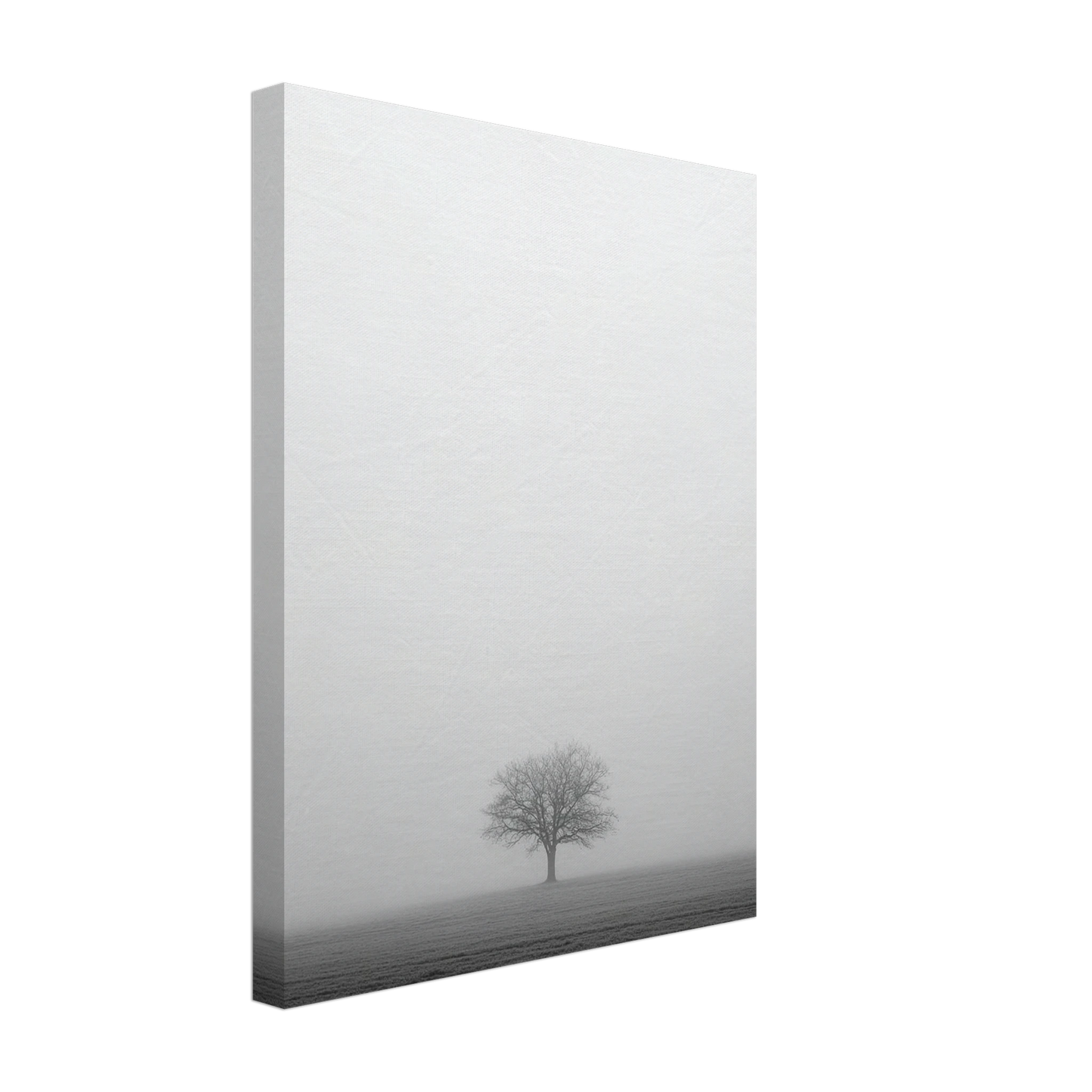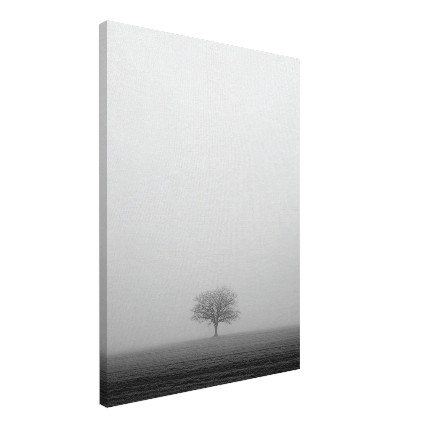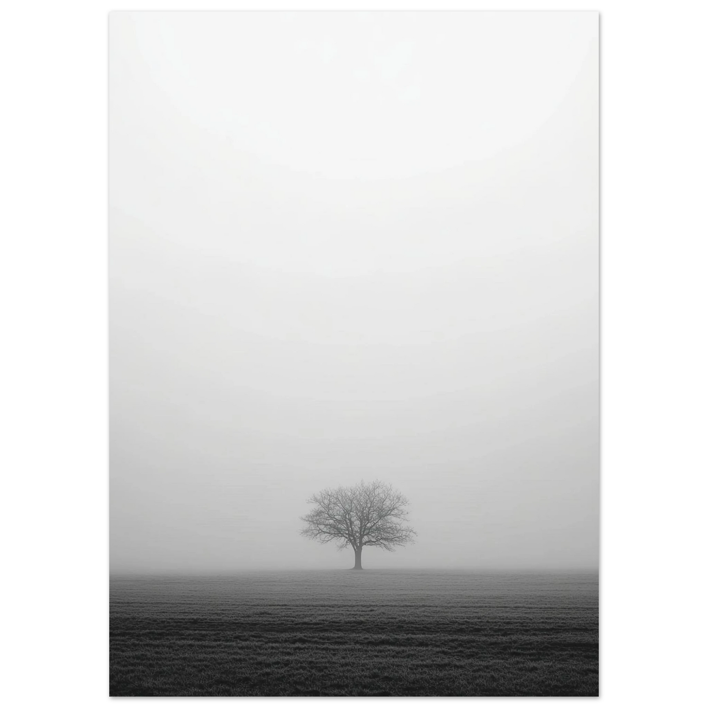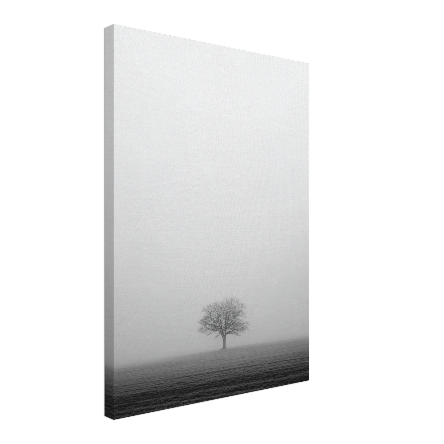 Et minimalistisk fotografisk kunstverk som viser et ensomt tre omgitt av tåke. Det enkle motivet fremhever kontrasten mellom naturens styrke og stillhet, og gir rommet en meditativ og tidløs stemning. Perfekt for deg som ønsker et rolig og poetisk uttrykk på veggen.