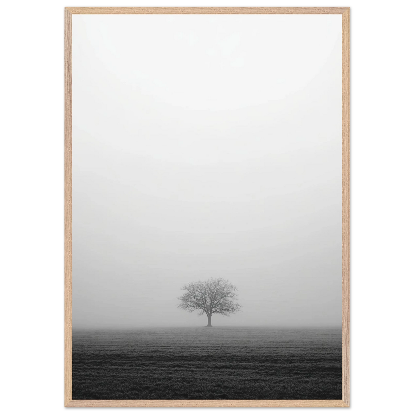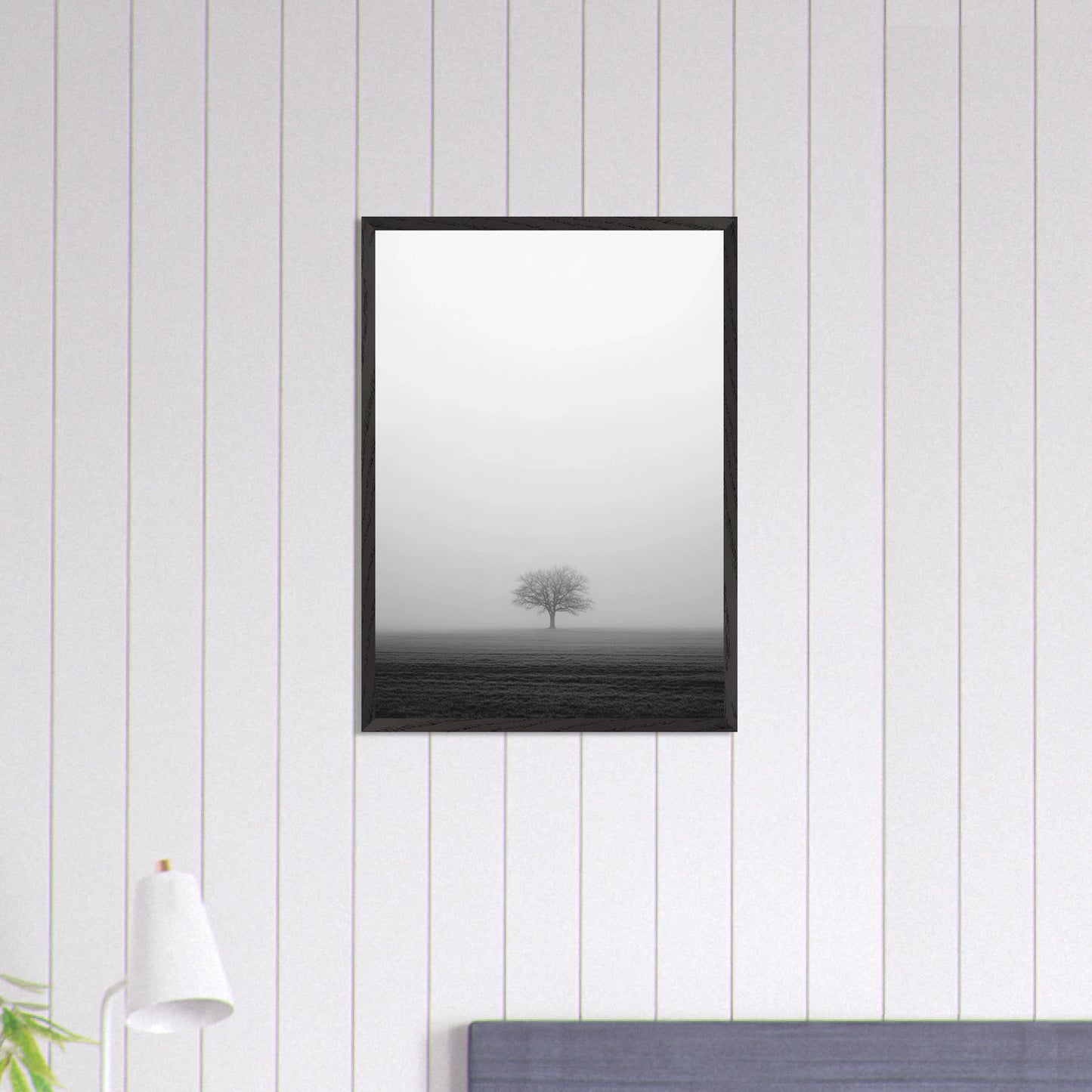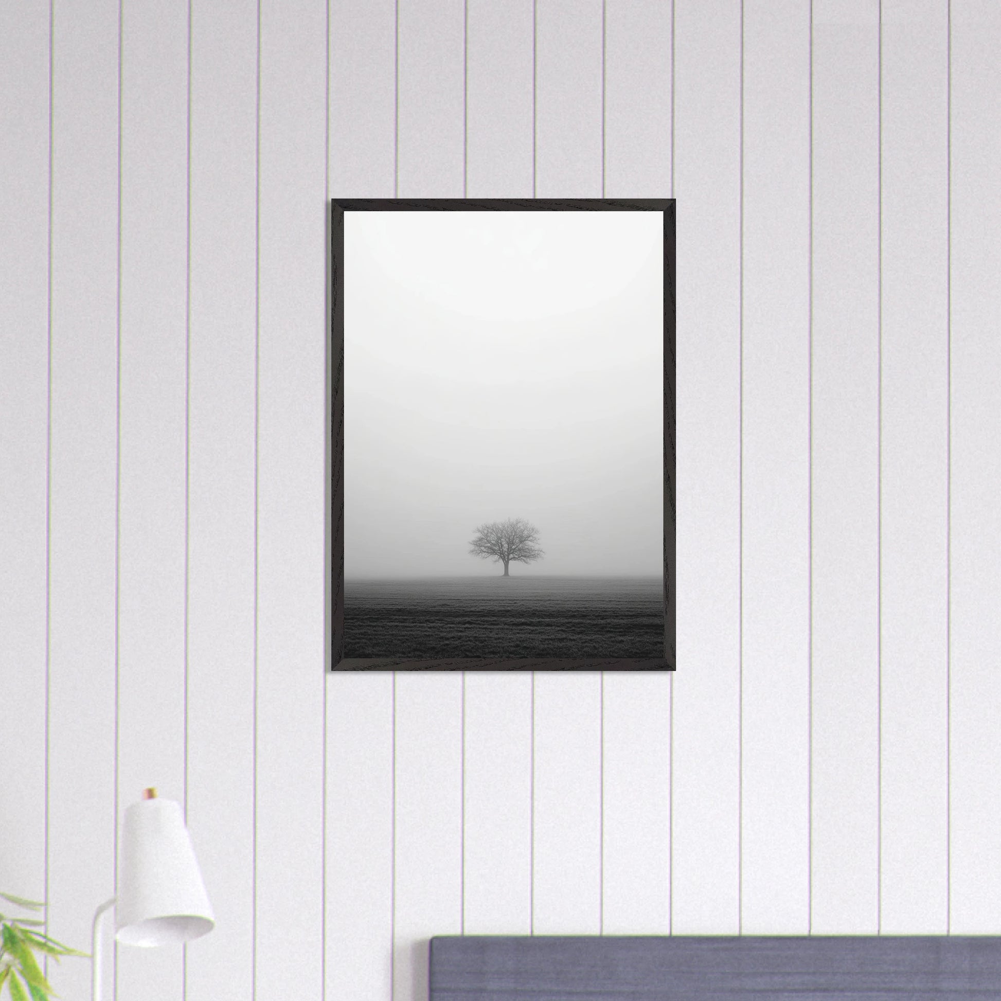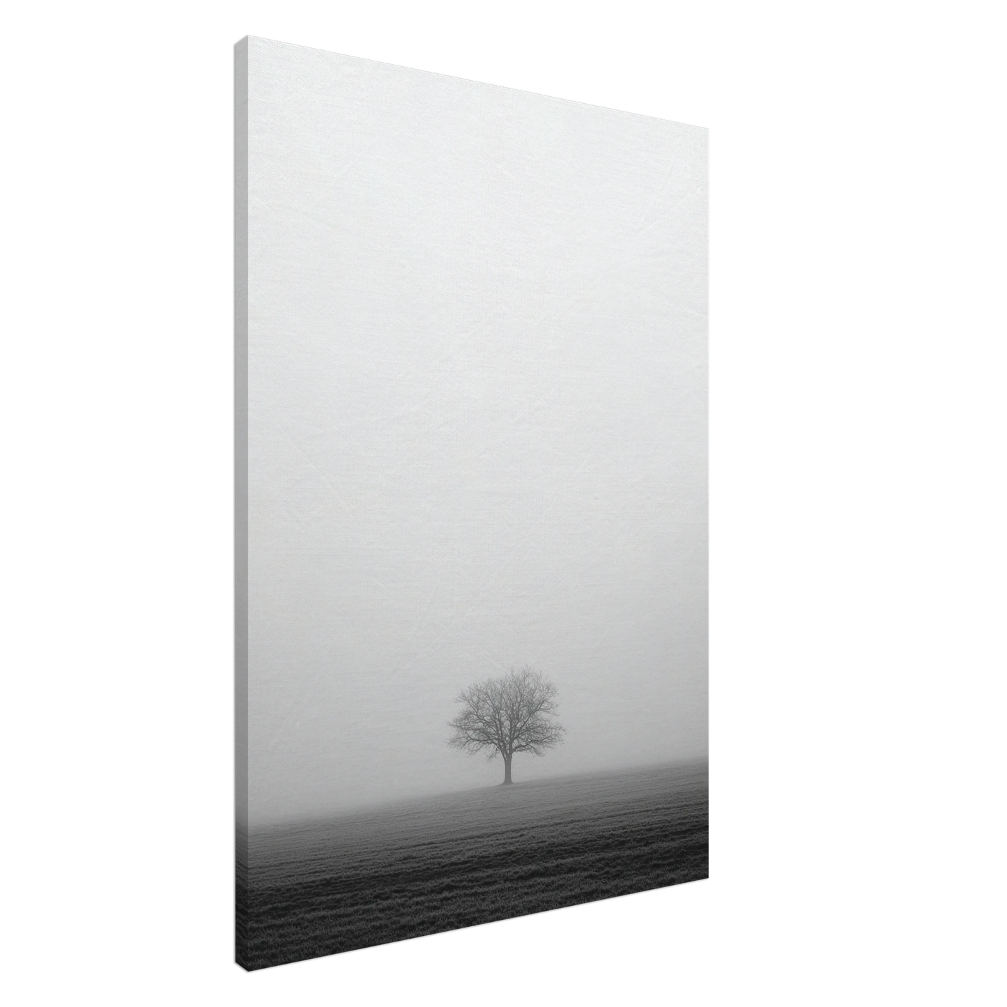 Et minimalistisk fotografisk kunstverk som viser et ensomt tre omgitt av tåke. Det enkle motivet fremhever kontrasten mellom naturens styrke og stillhet, og gir rommet en meditativ og tidløs stemning. Perfekt for deg som ønsker et rolig og poetisk uttrykk på veggen.